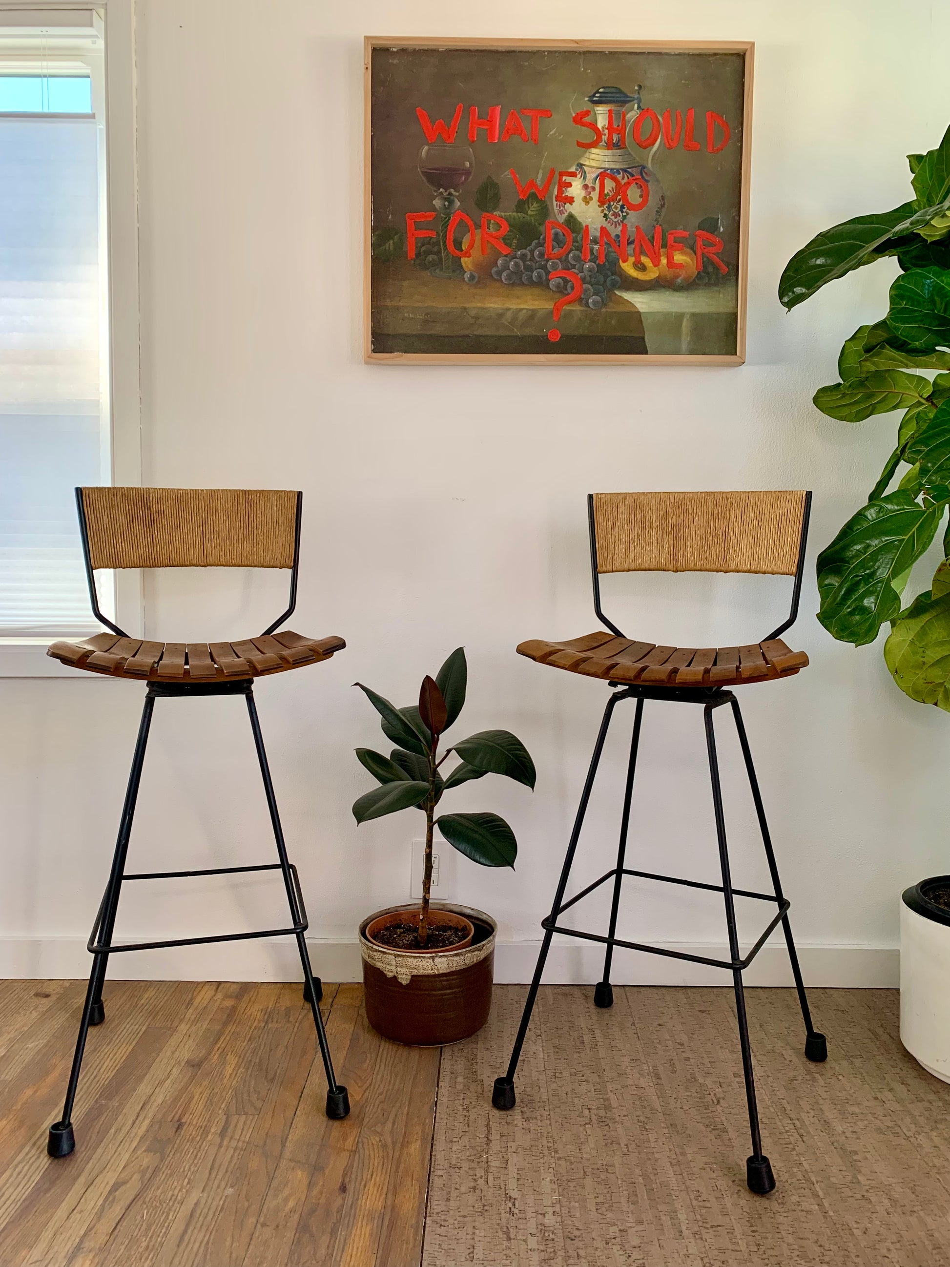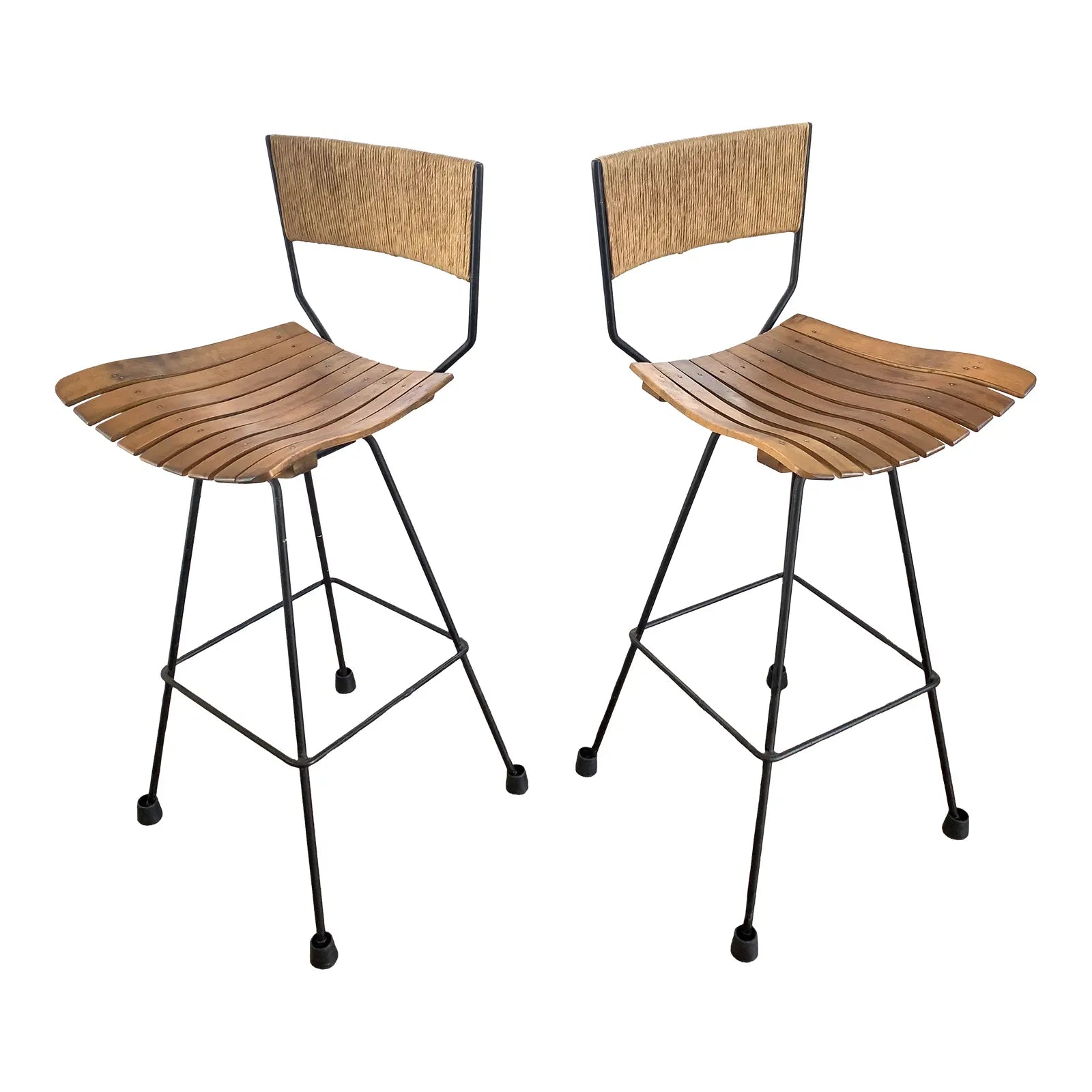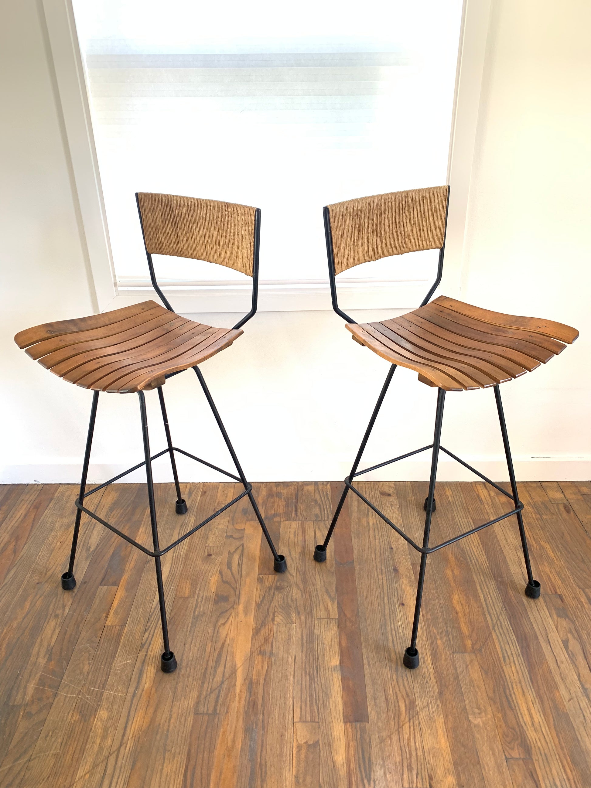 Mid-century modern Arthur Umanoff swivel bar stools featuring wood slat seats, iron frames and Danish rush cord wrapped backs. Minimalist rustic design. These barstools add natural stylish seating into a multitude of spaces and design concepts. Feet are covered with rubber cups that can be removed. One of the original rotating foot caps is missing.