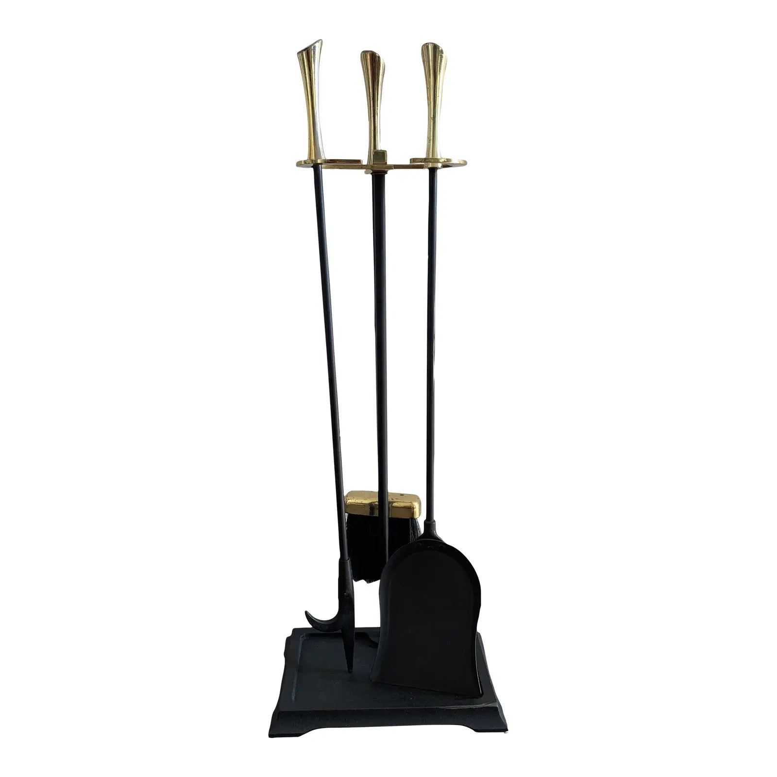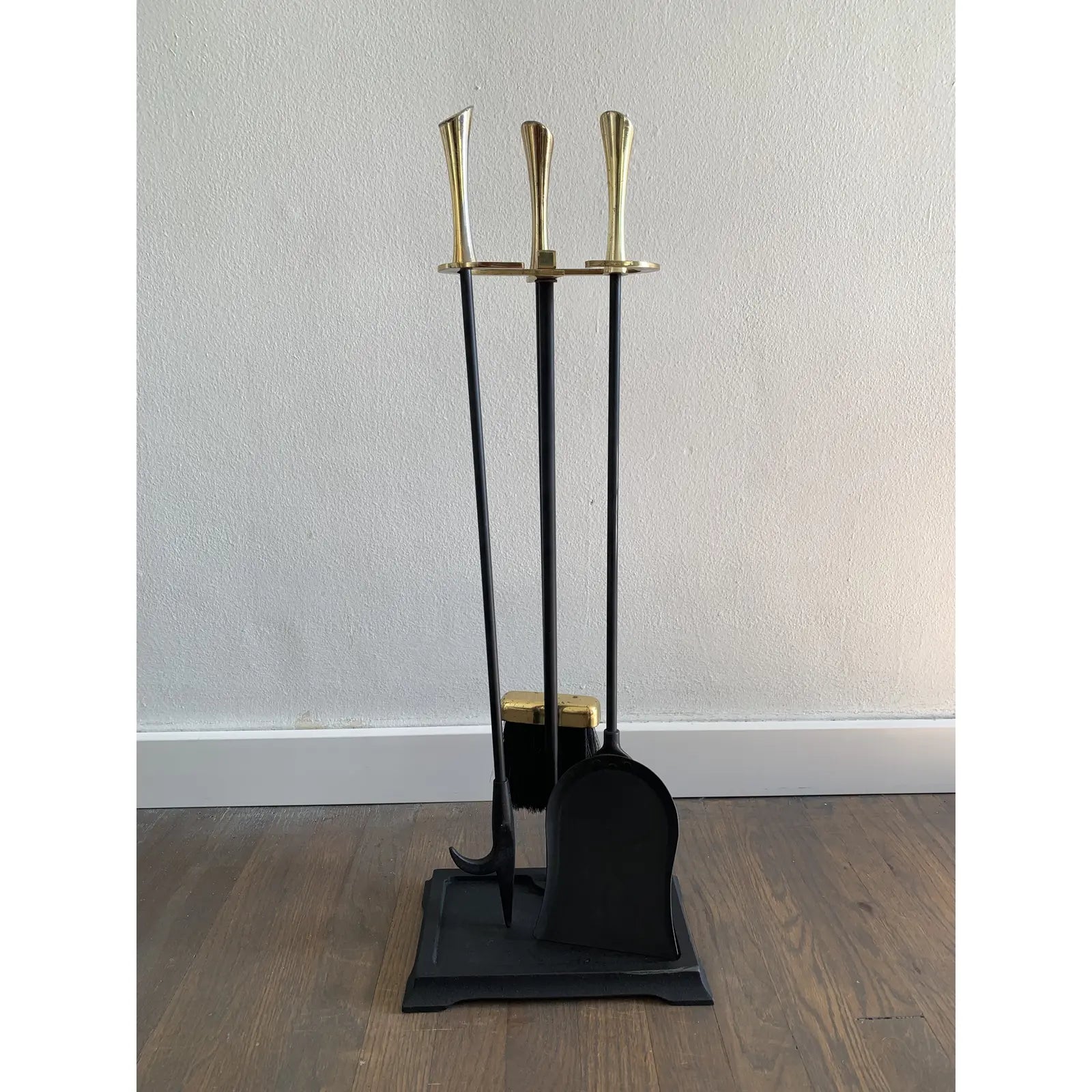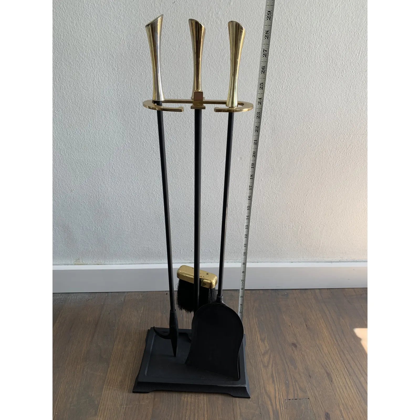Mid Century Modern Brass and Black Fireplace Tool Set