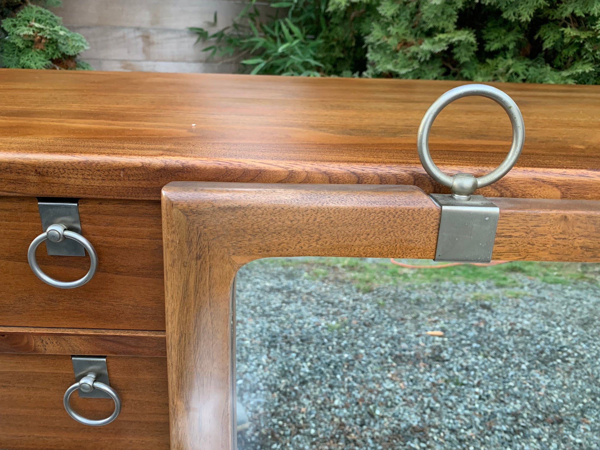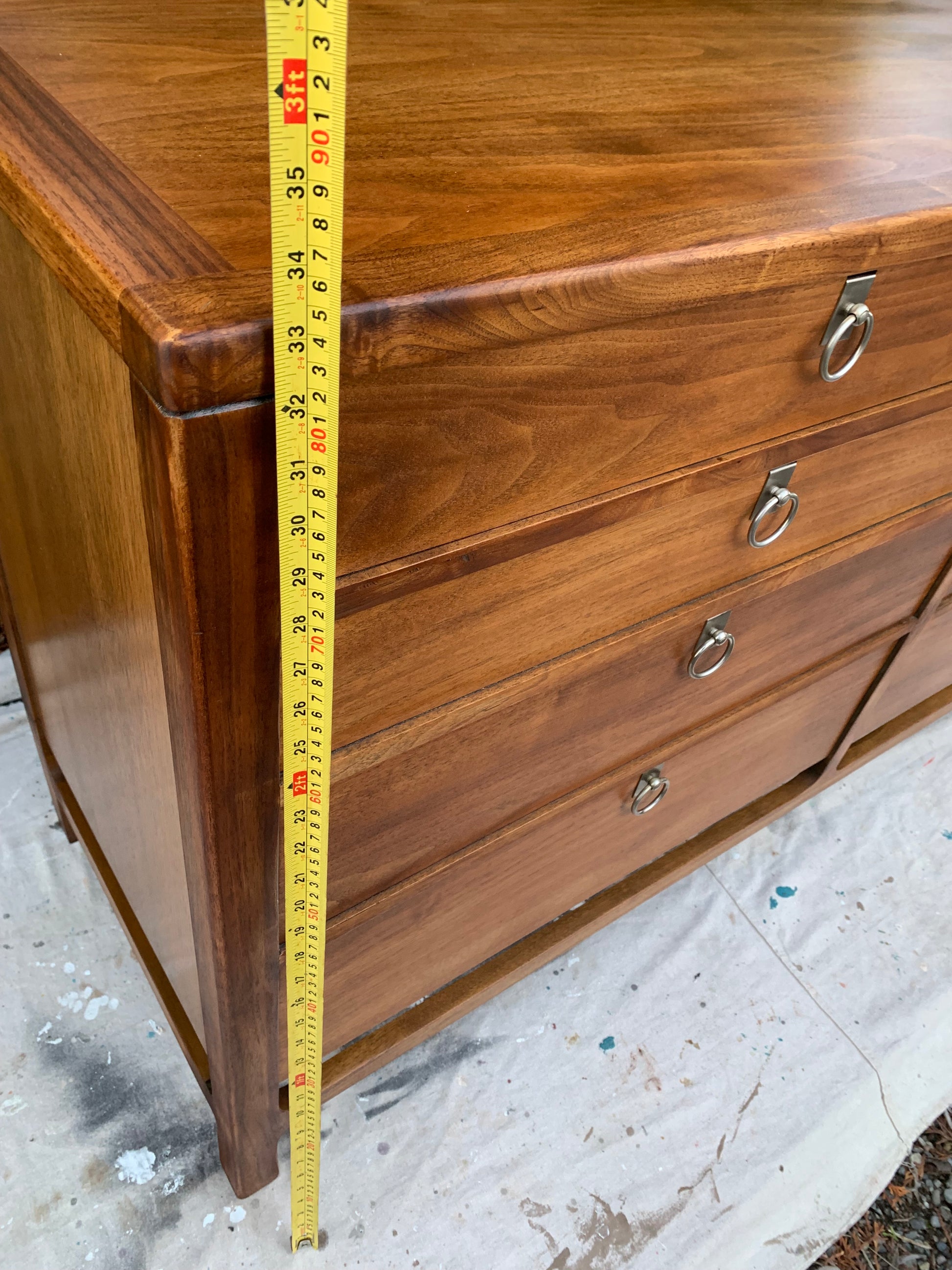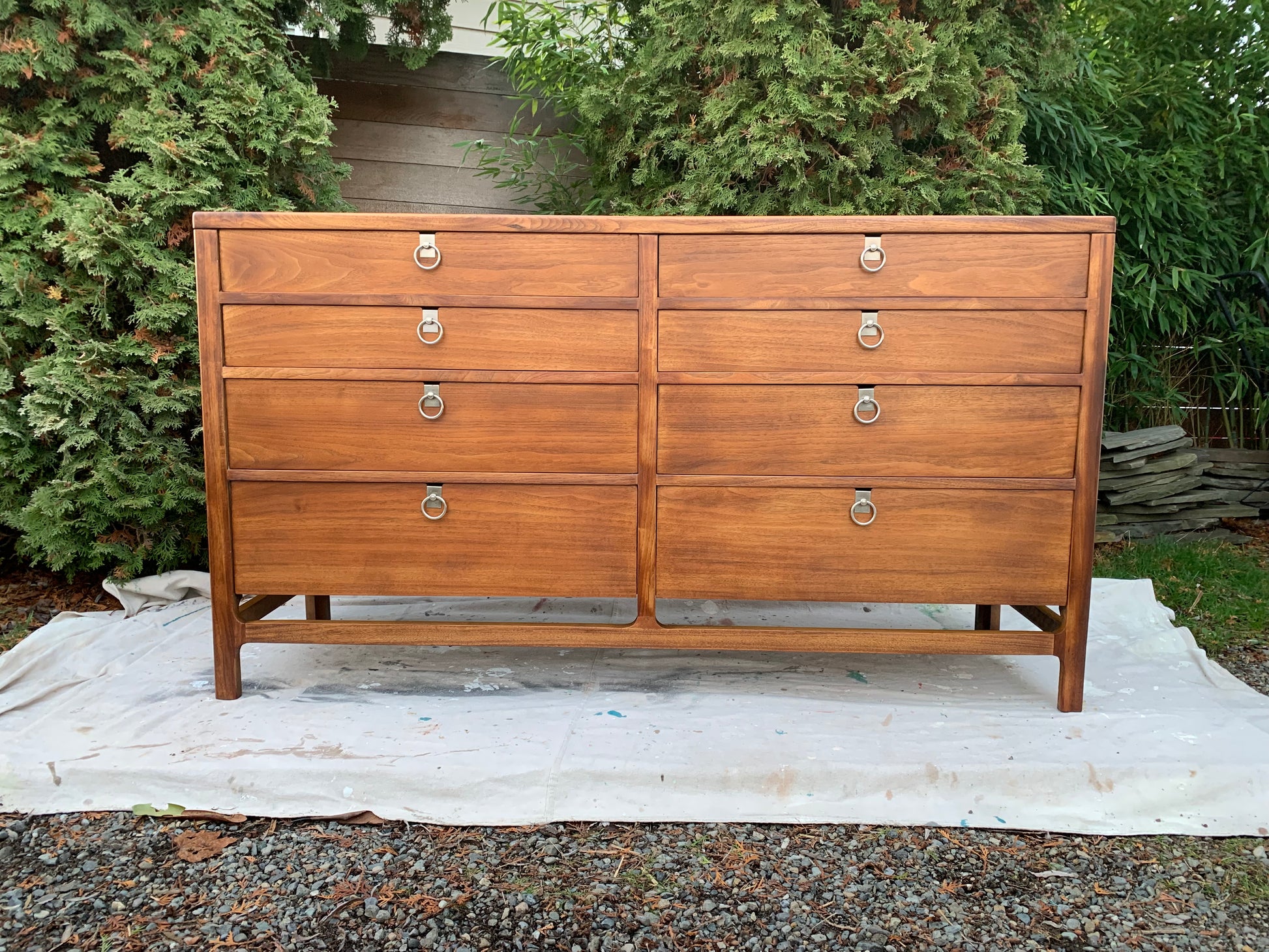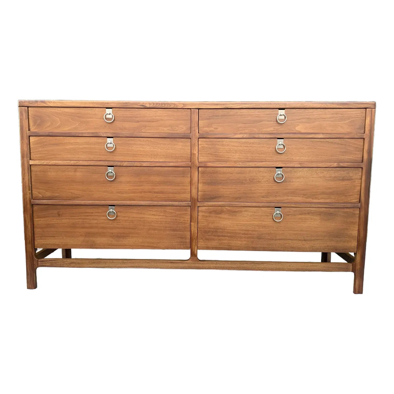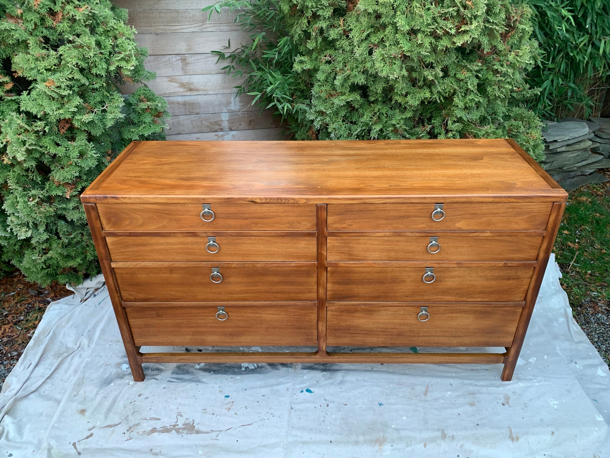 Stunning medium walnut mid-century dresser with metal circle pulls and sleek modern design. Classic dresser with minimalist lines offers solid wood storage within eight dovetailed drawers. Quality craftsmanship with elegant medium walnut wood grain throughout. A sturdy base with legs connected by curved crossbar adds to the allure. This stunning mid-century case piece makes the perfect addition to any modern interior. Matching mirror is included.