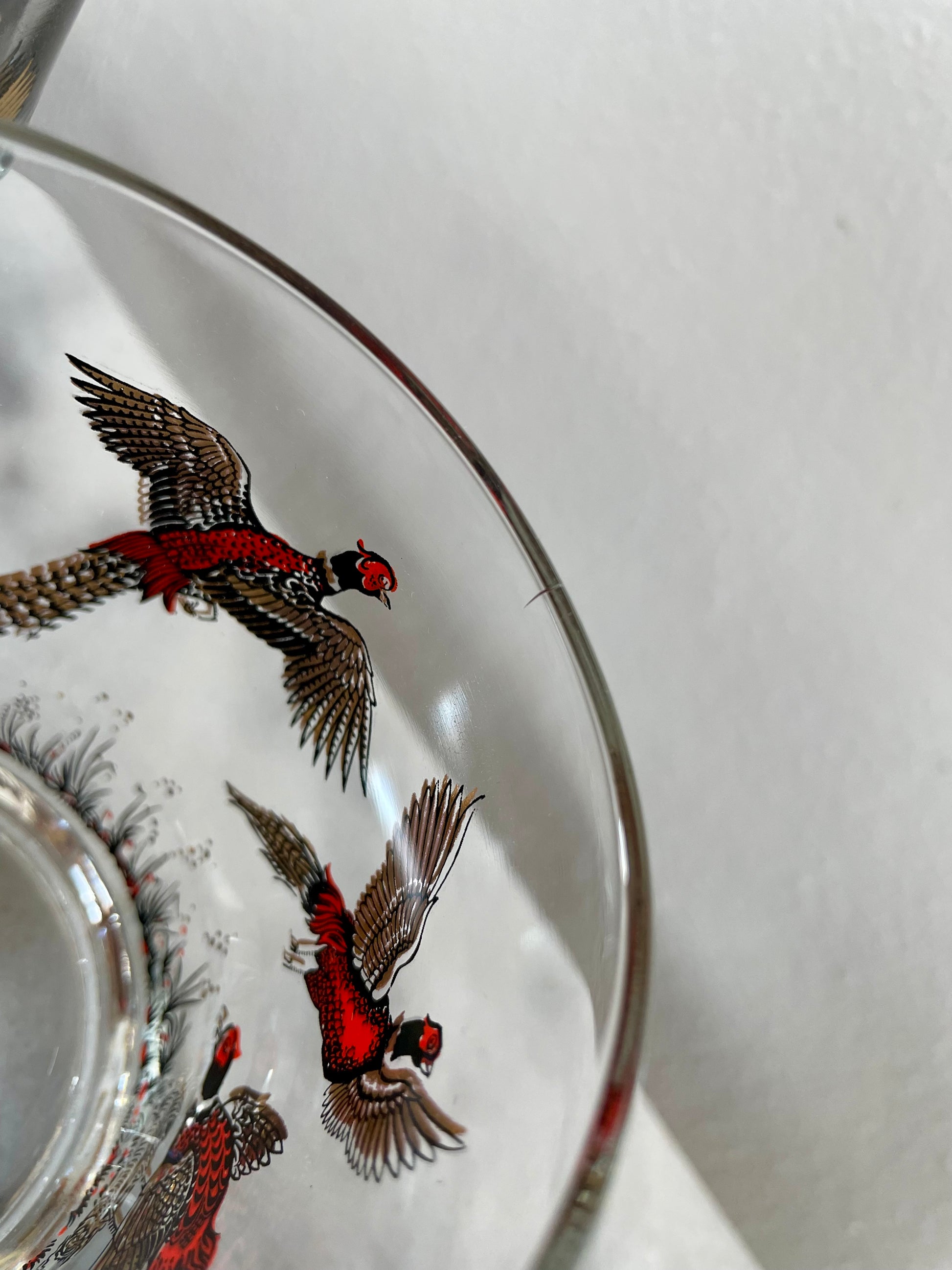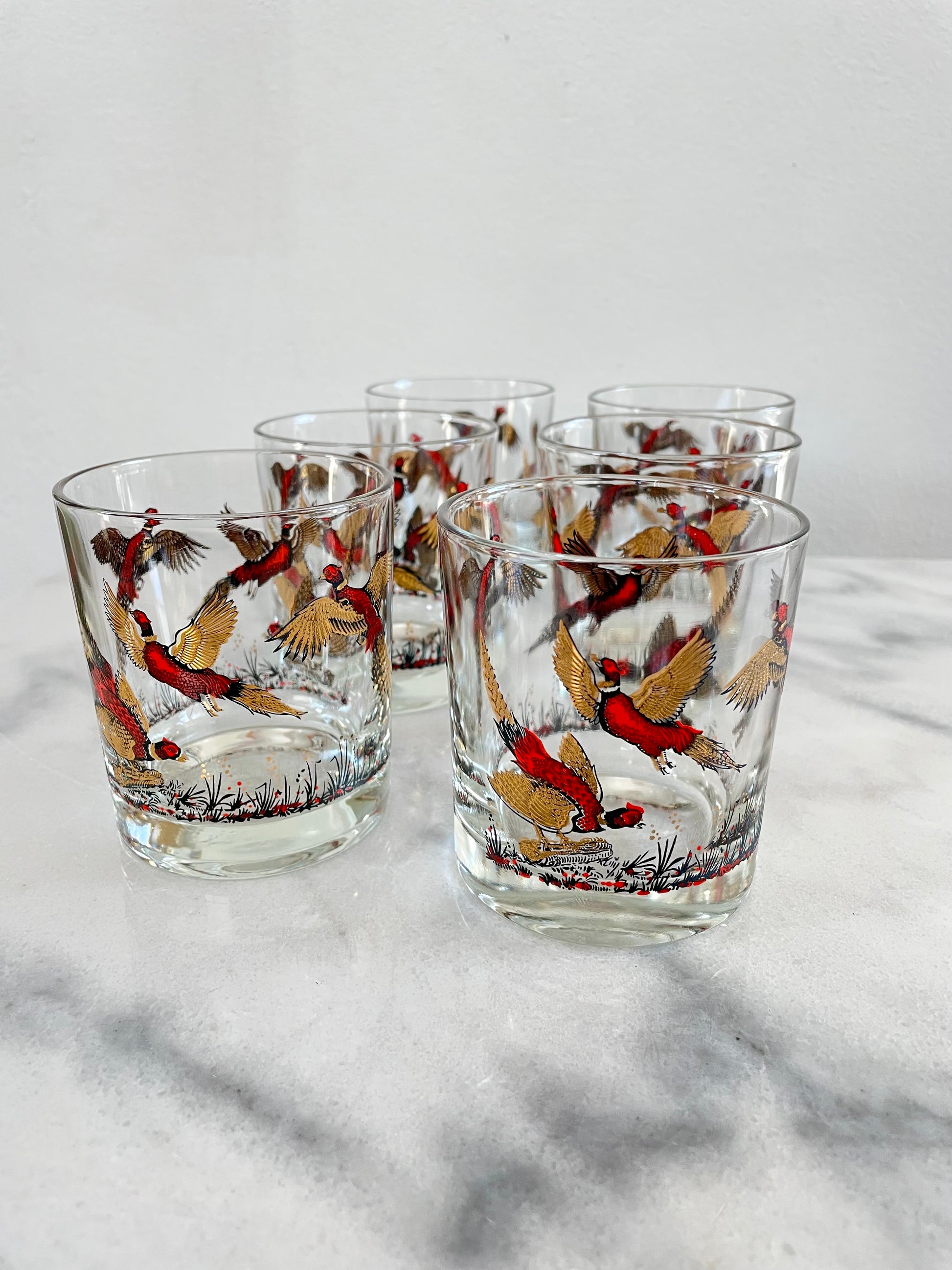 A set of vintage Hazel Atlas glass tumblers featuring a hunting scene with red and gold pheasants. This type of glass was popular in the mid-20th century.
