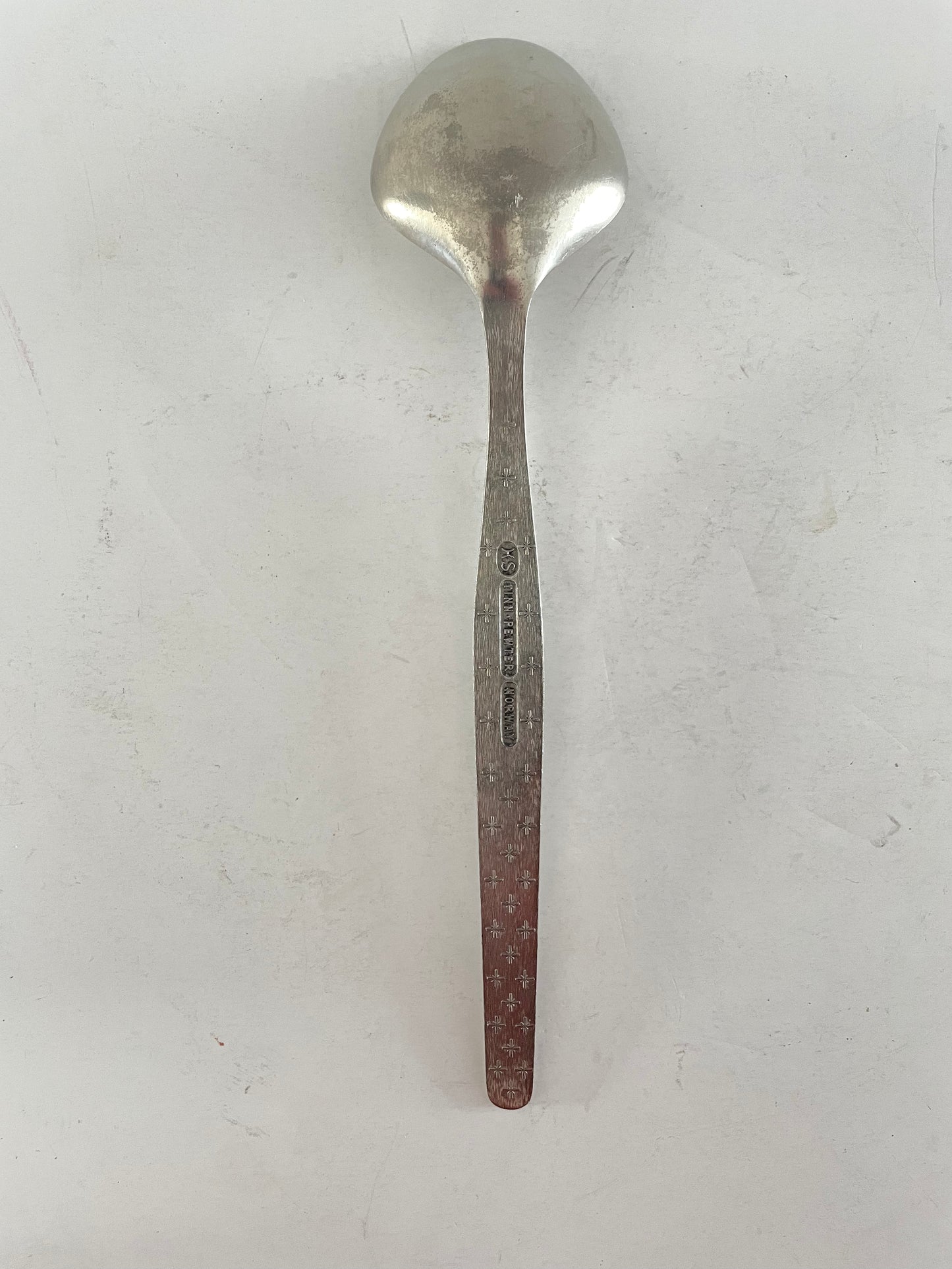 Vintage serving spoon made of high-quality pewter, ensuring durability and longevity. Perfect for those who appreciate the beauty of craftsmanship and mid-century modern design. A must have for collectors of modern metal designs.