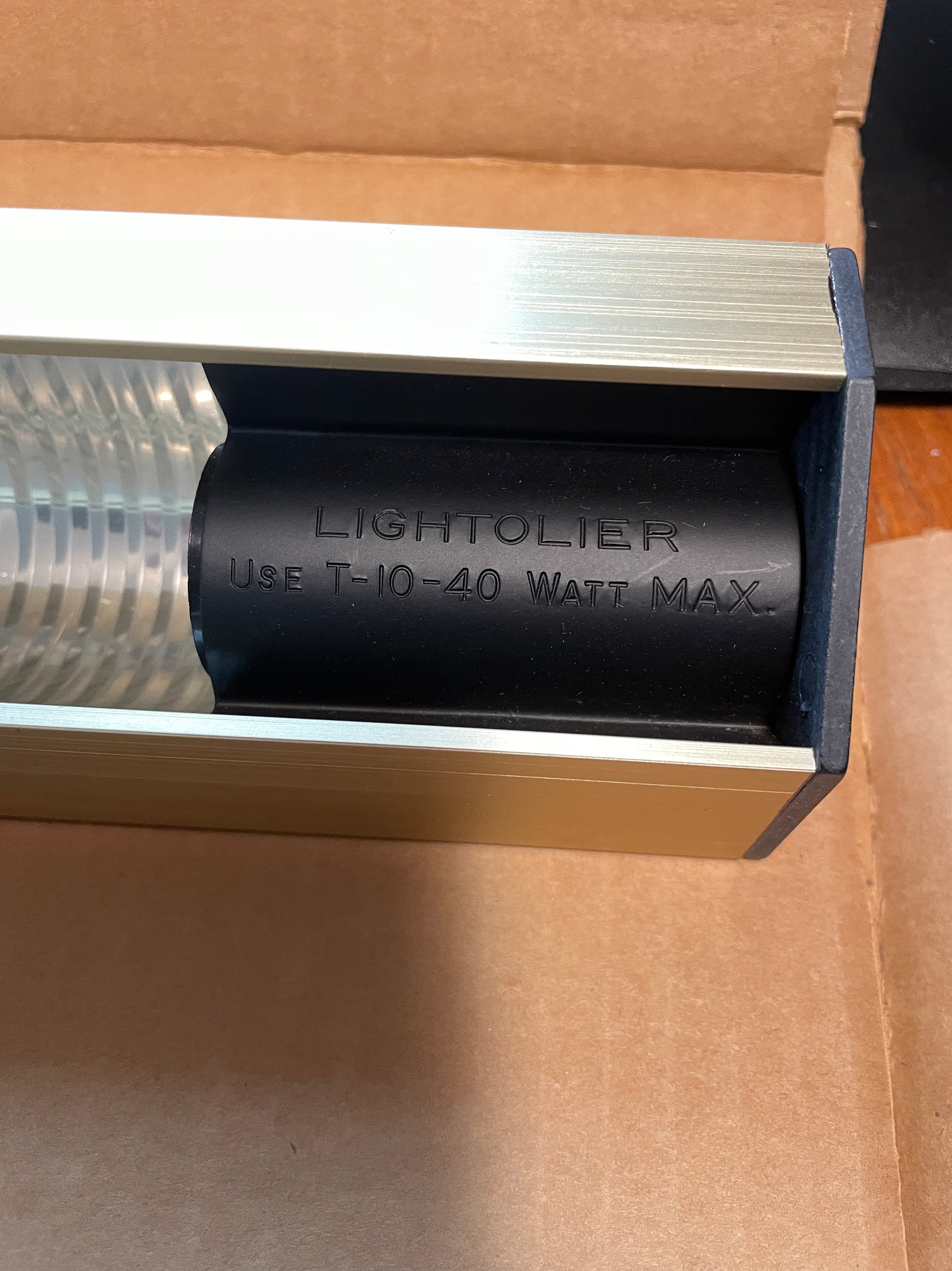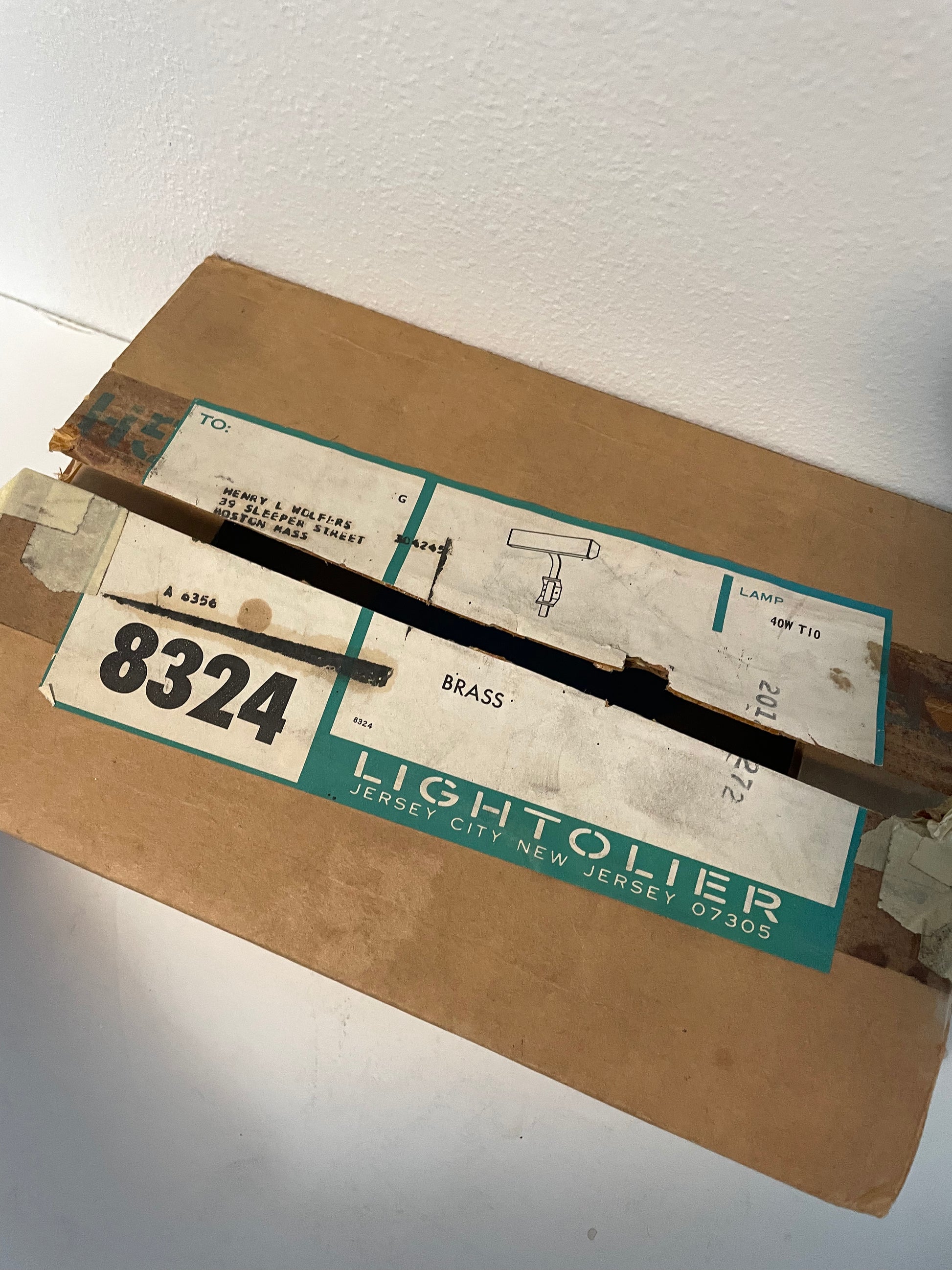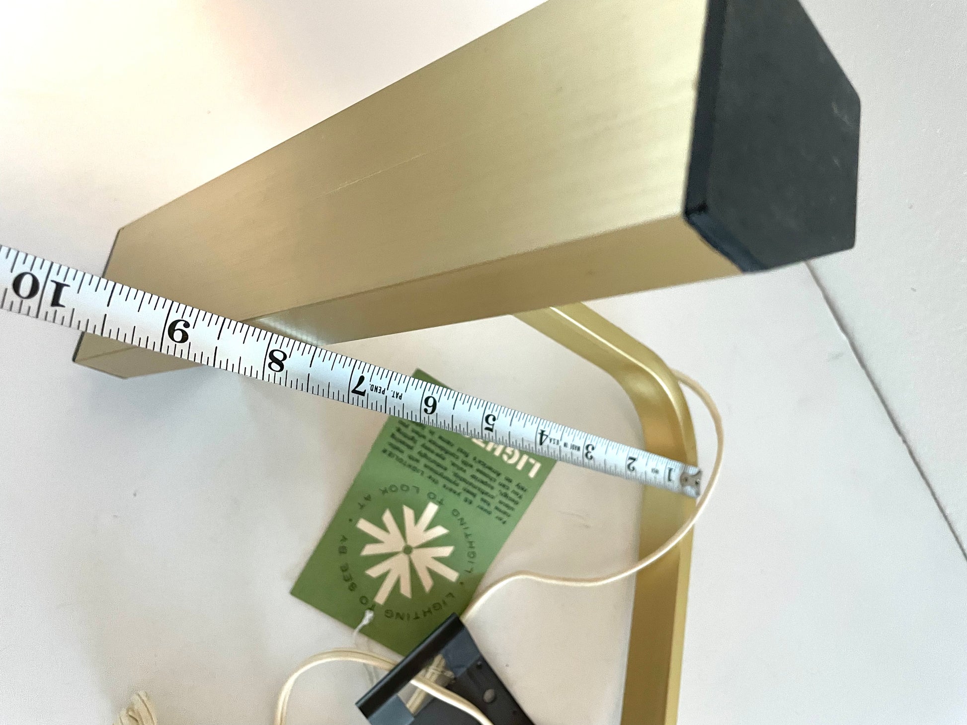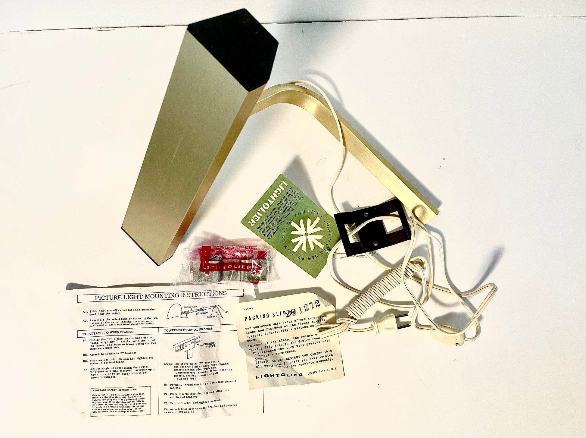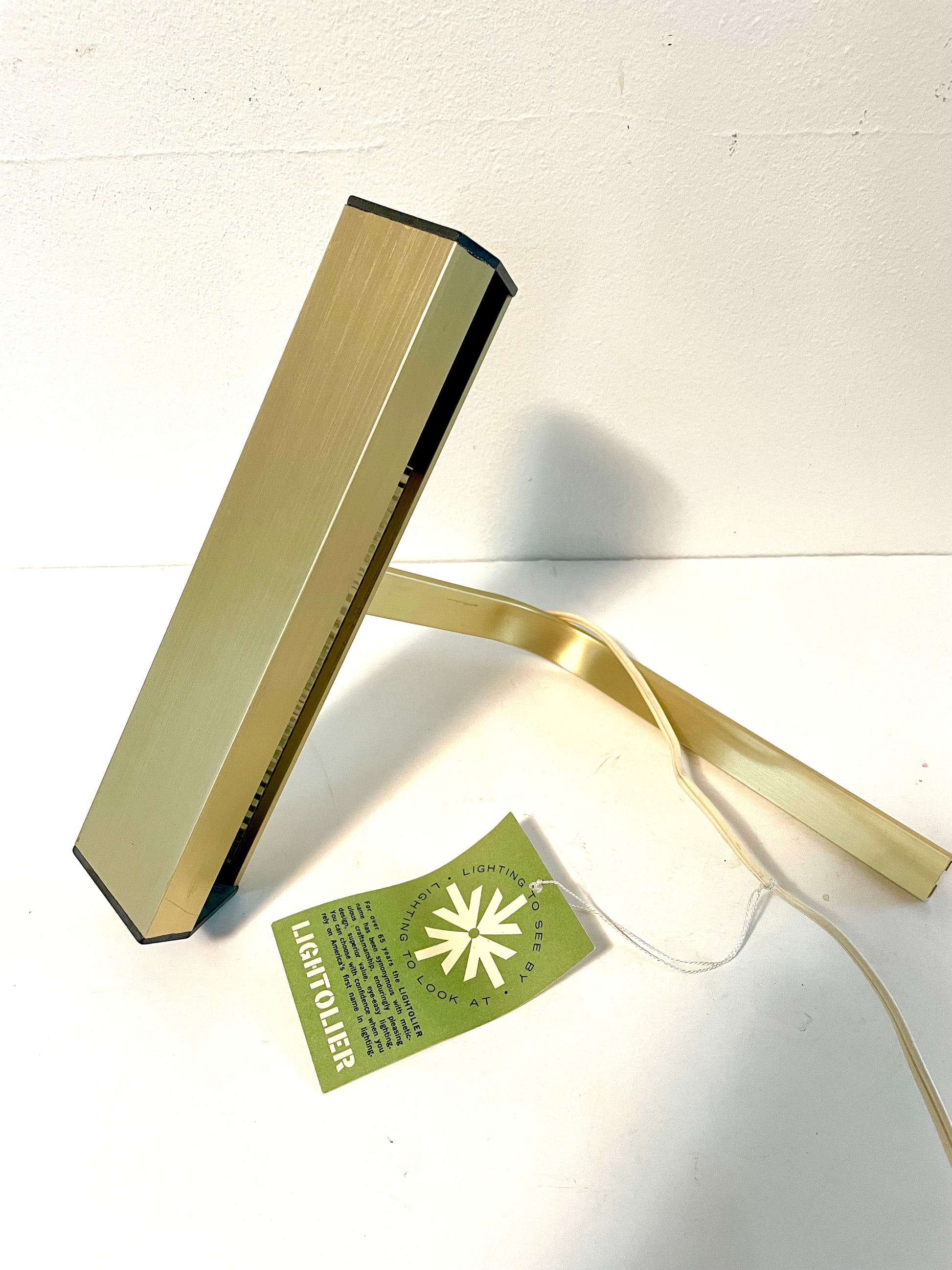 This vintage mid-century modern Lightolier picture lamp features a brass-tone finish and is in like-new condition, complete with its original box and labels attached. The cord has an inline switch. Elevate a nook or artwork with this stylish lighting solution.