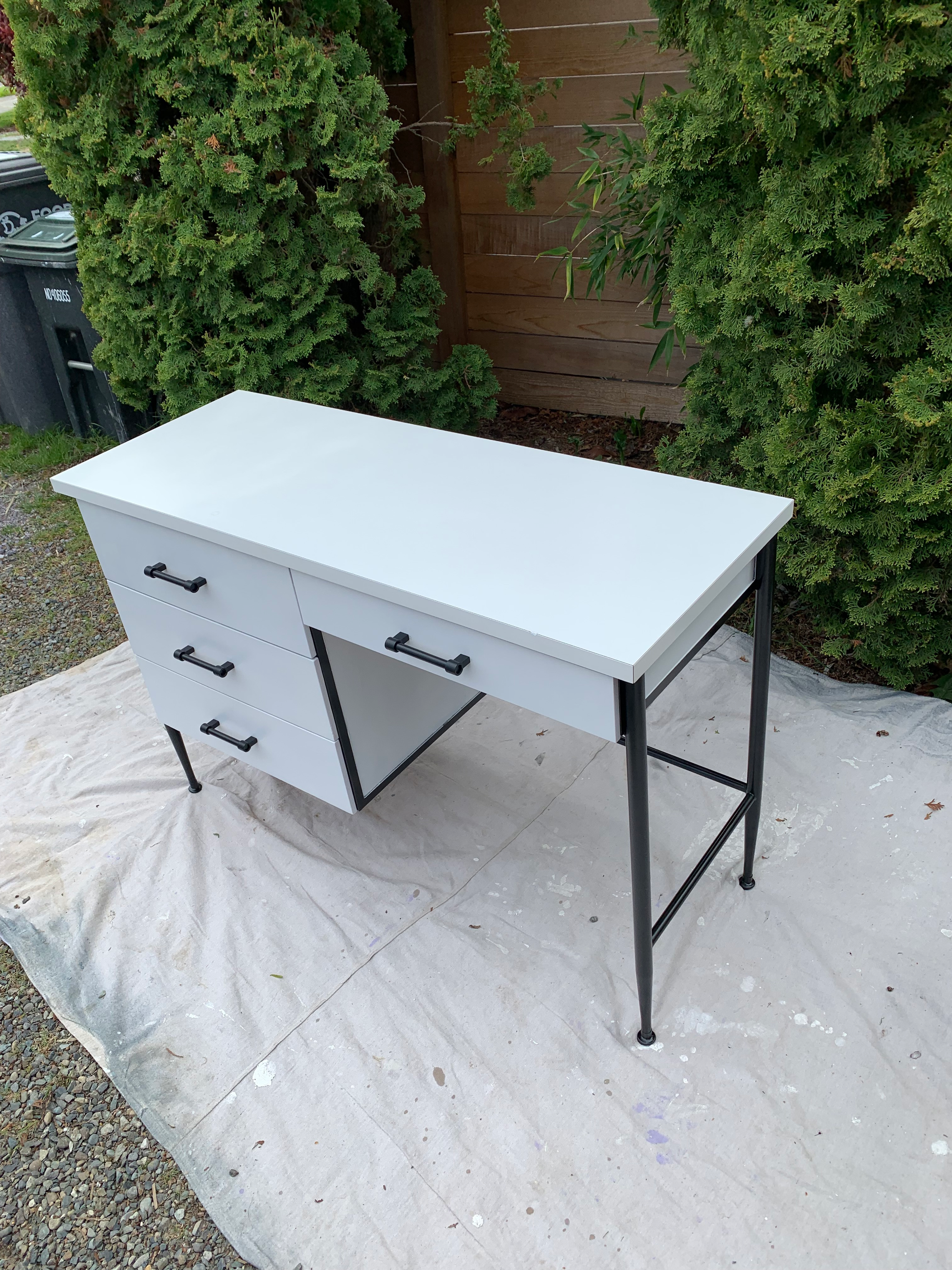 Vista of California desk, perfect for a student or home office. White laminate top and black painted steel frame are all in good condition. The entire desk has been refinished and is in good condition showing minor signs of wear from age. The white laminate top is incredibly durable and smooth, perfect for a writing surface and crafts. Drawers are clean and function smoothly. The back of the desk is finished as seen in photos.