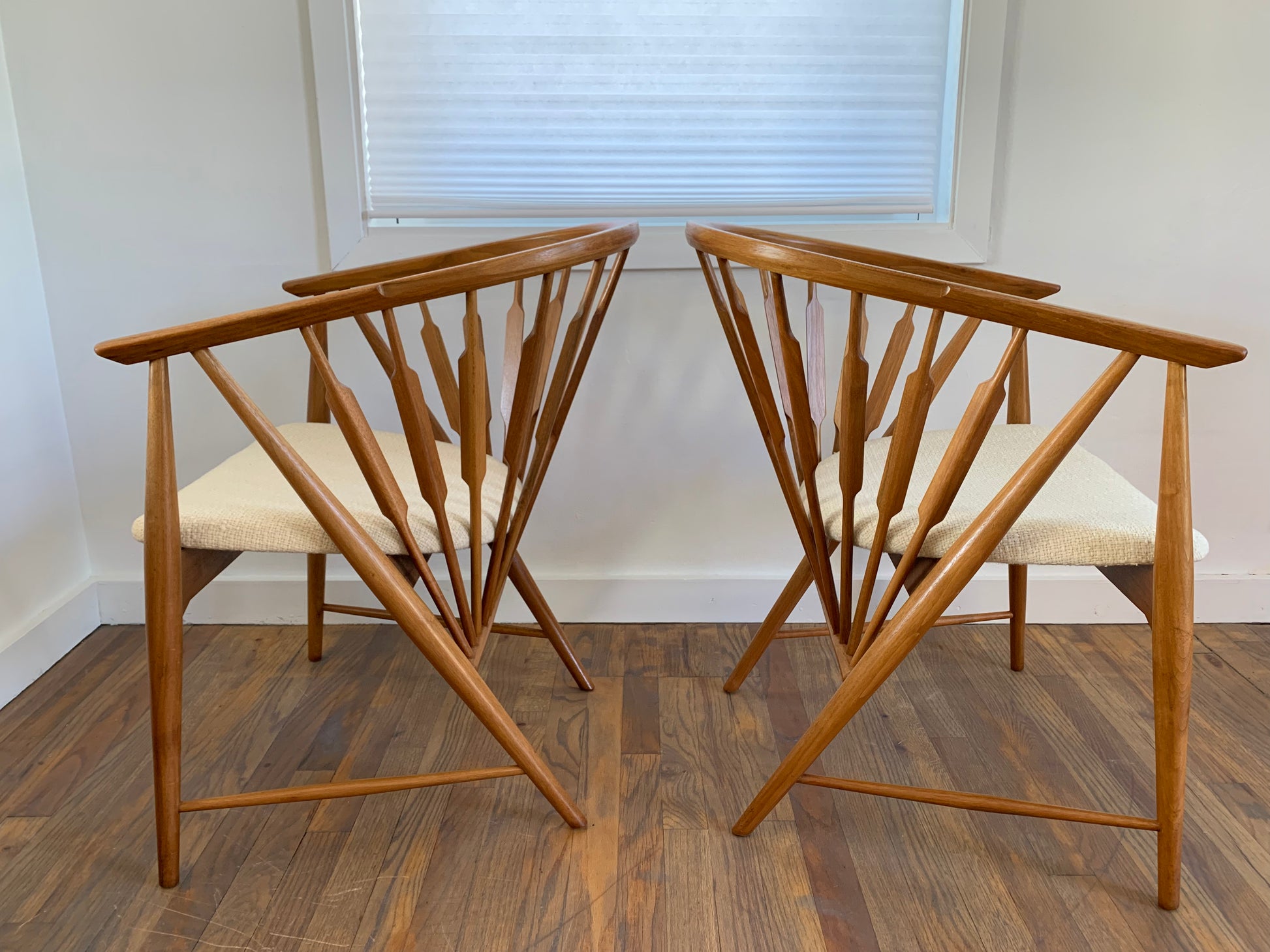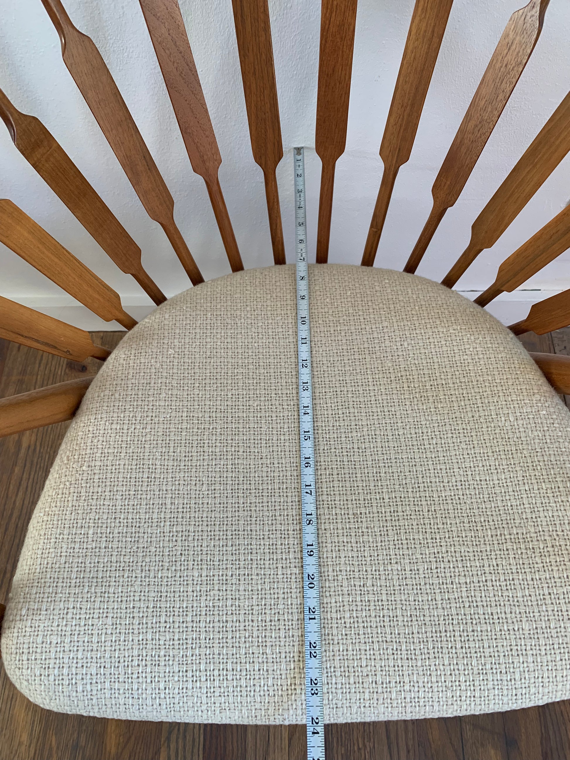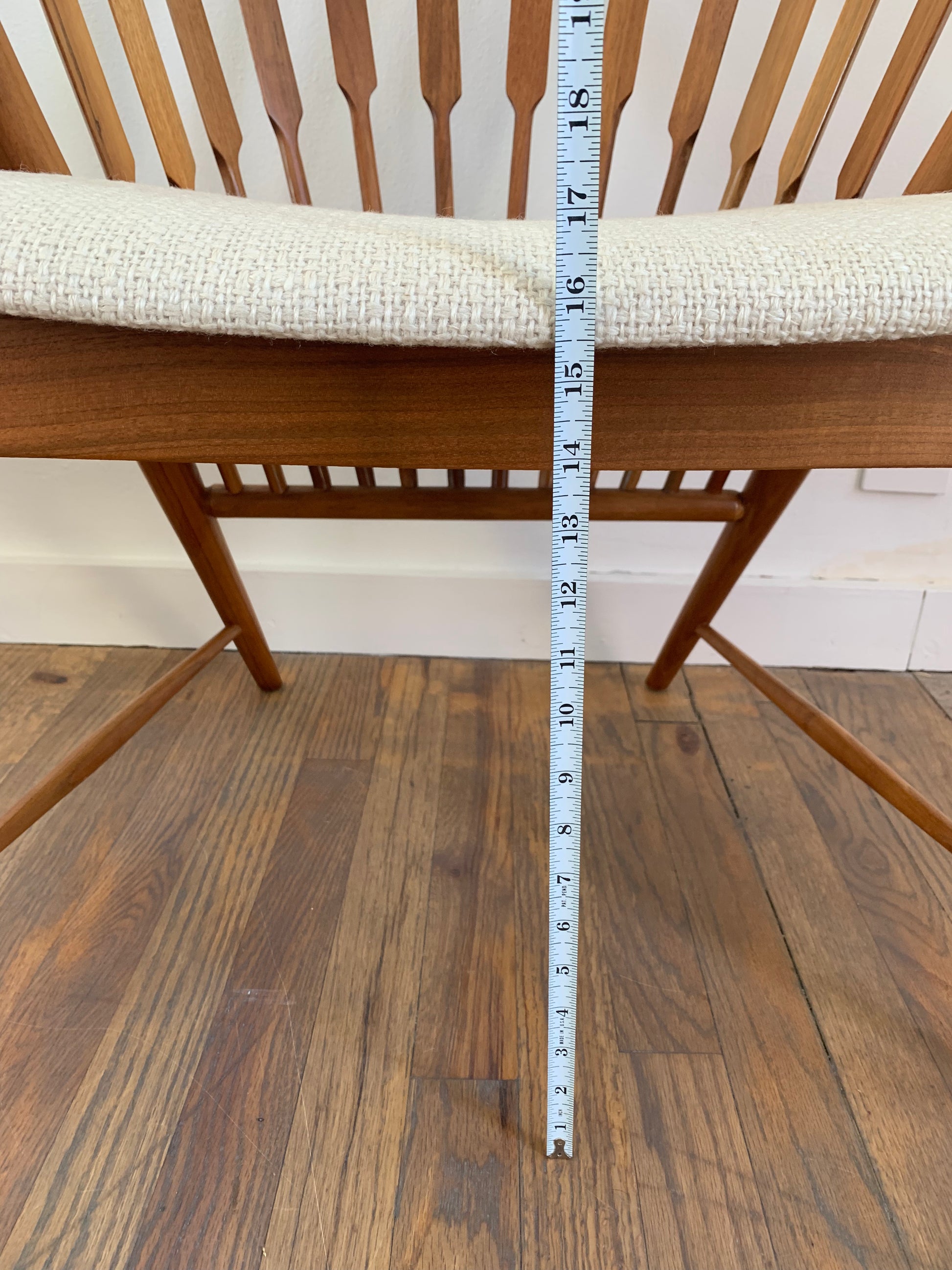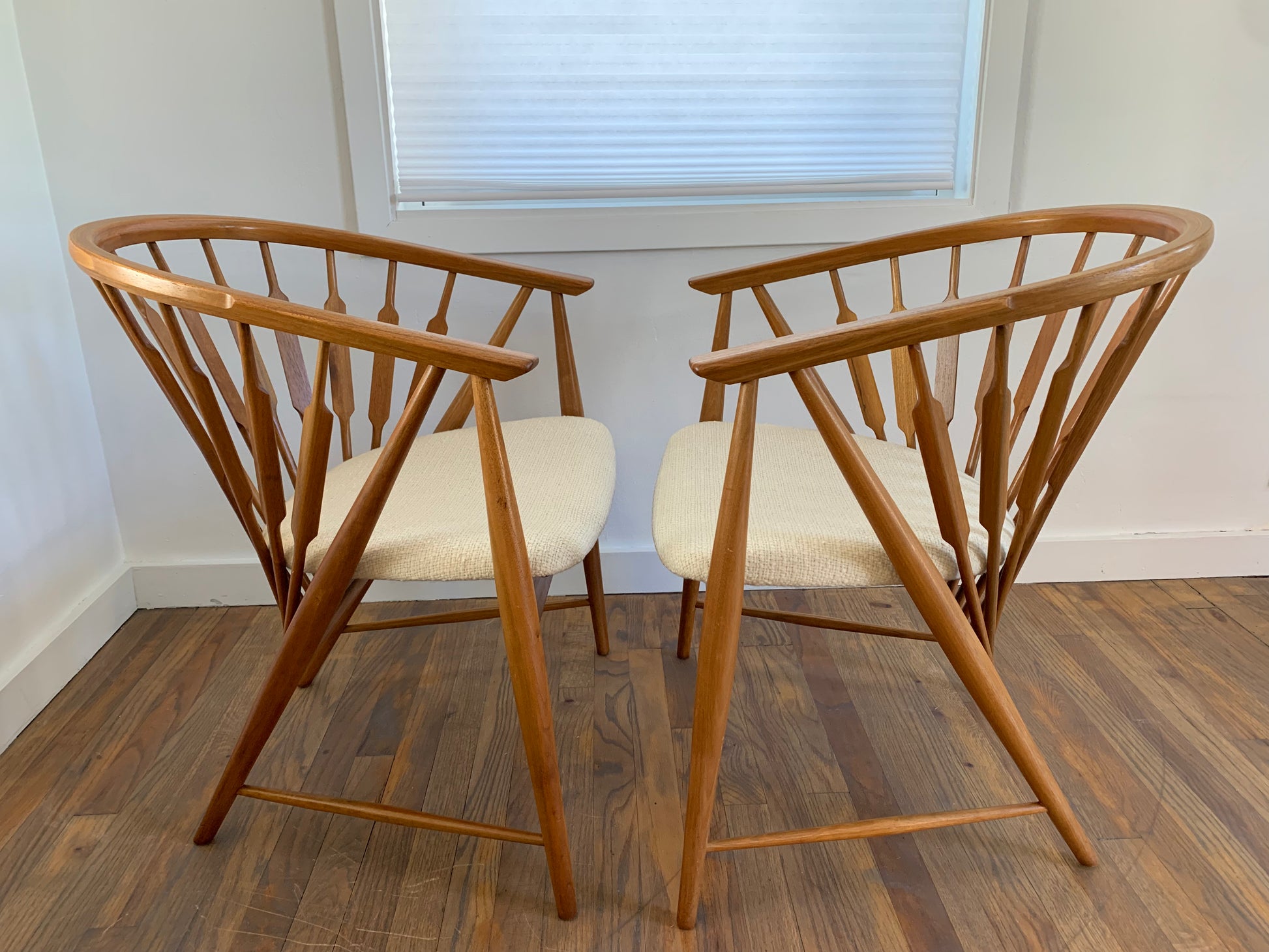 Mid-Century Modern armchair designed by Kipp Stewart and Stewart McDougall for Drexel Declaration. This piece is made of sculpted solid walnut and showcases and from all angles. The feather like spindles and slim legs display a fascinating study in design is light without compromising comfort. Functions as a captain's dining chair or lounge armchair. Original white tweed fabric in immaculate condition. A rare pair.