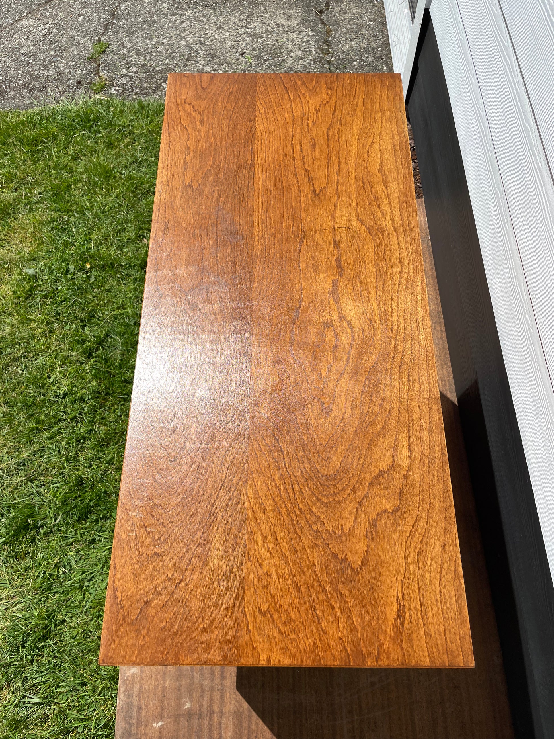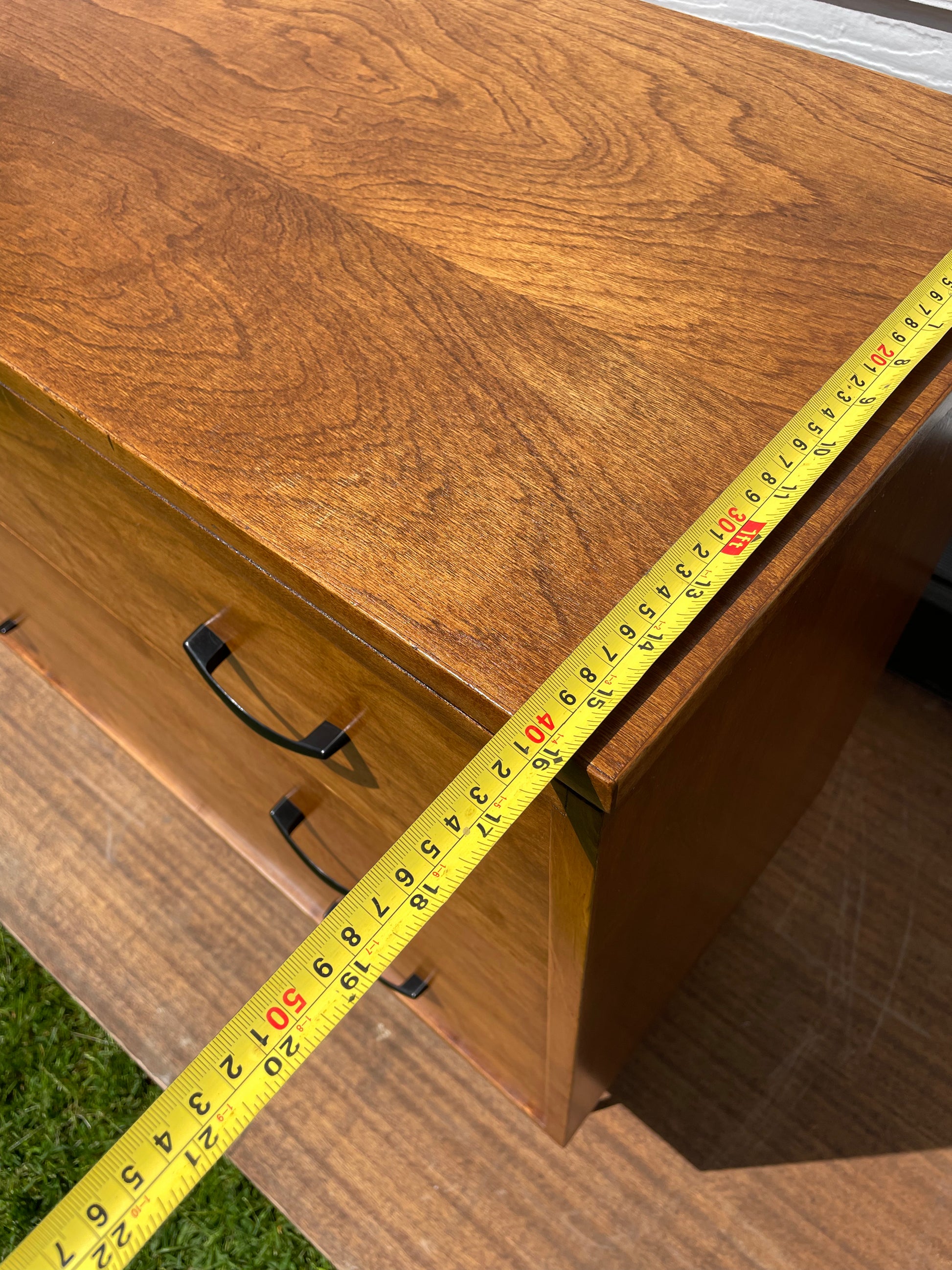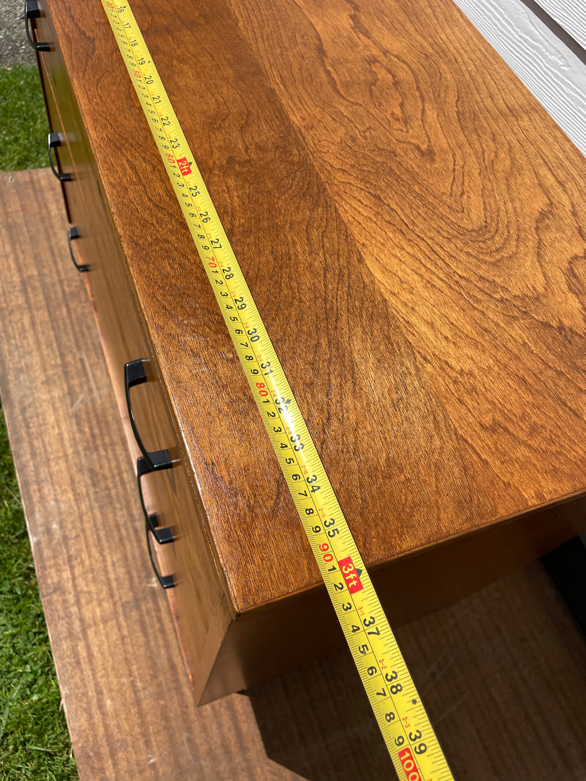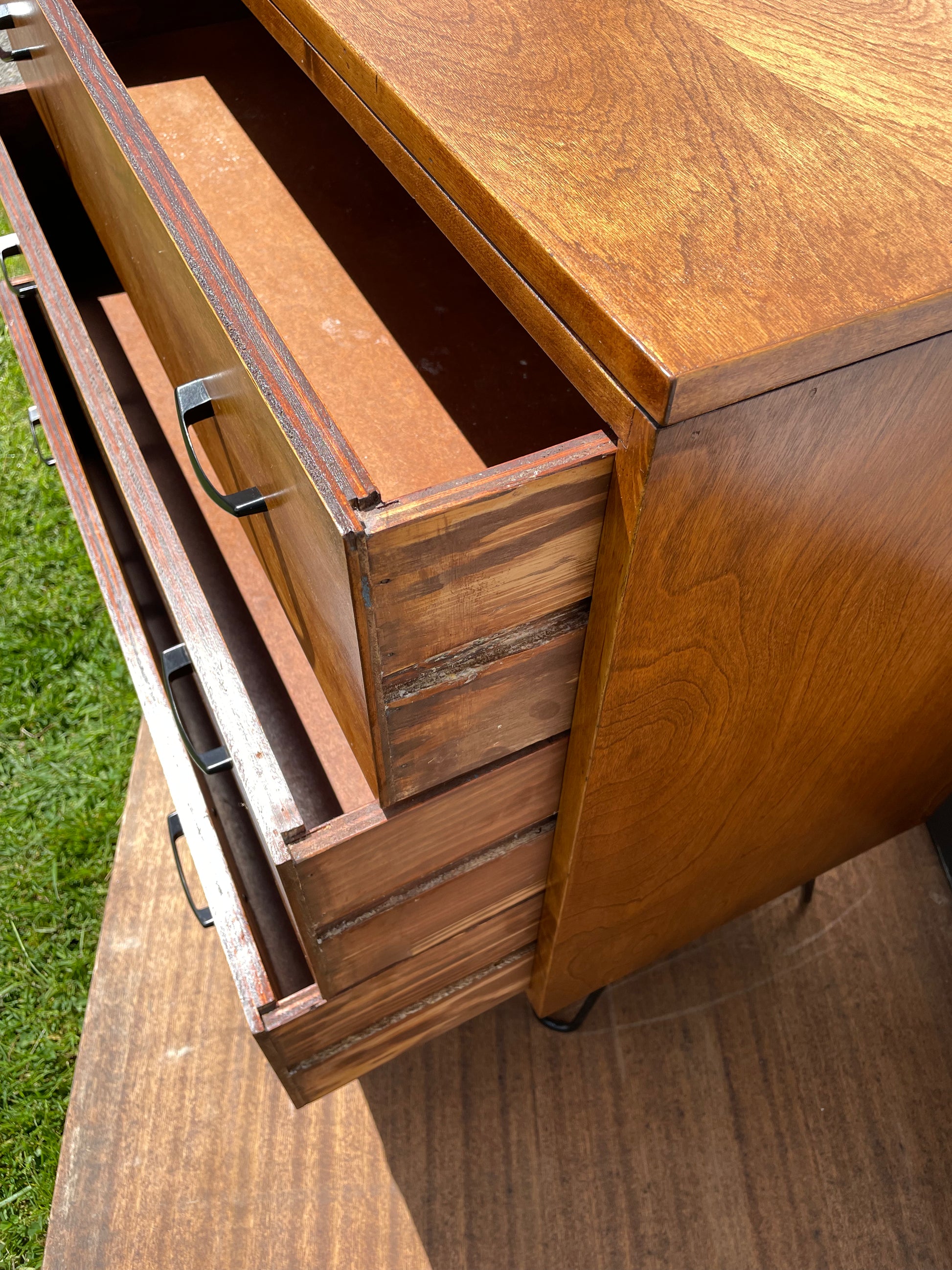 Atomic style modern deep drawer solid wood dresser on hairpin legs. Sturdy long lasting build. Joints are overlapping and secure. Aged Birch wood with a walnut finish. Recently waxed inside and out making it silky smooth to touch and smooth opening. Bigger than average lowboy makes for stylish storage in most any space. Visually sleek and modern.