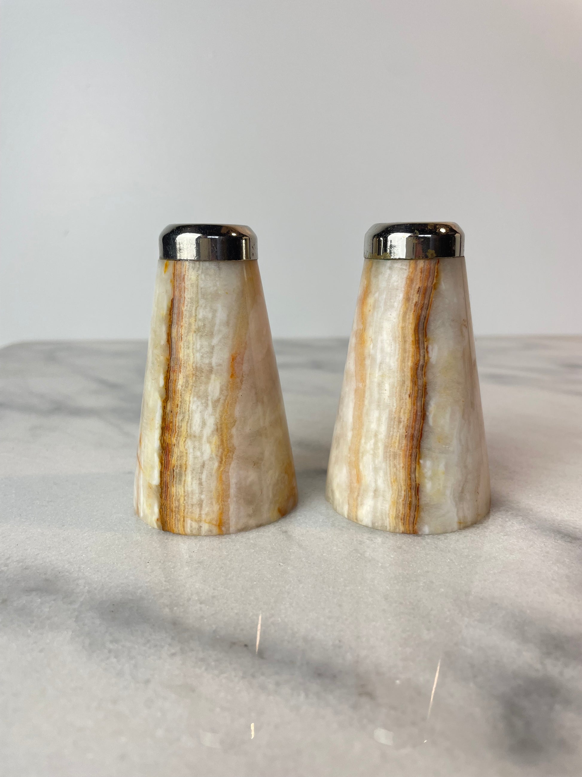 Add a touch of mid-century elegance and natural beauty to your table with these onyx salt and pepper shakers featuring polished chrome tops. Crafted from genuine onyx, each piece showcases unique color variations and organic patterns, making every set one of a kind. A perfect accent for vintage barware collections, retro dining settings, or timeless kitchen decor.