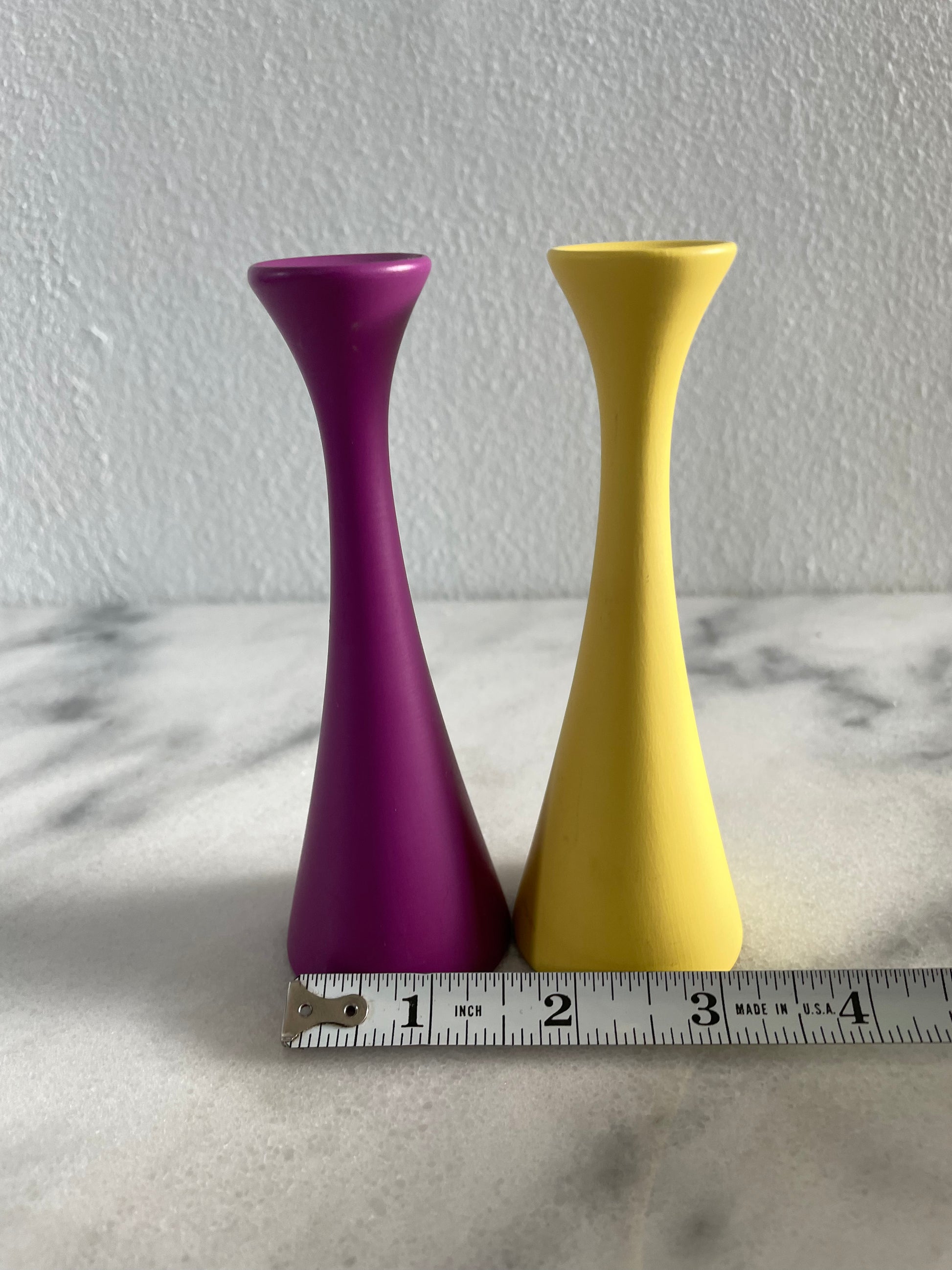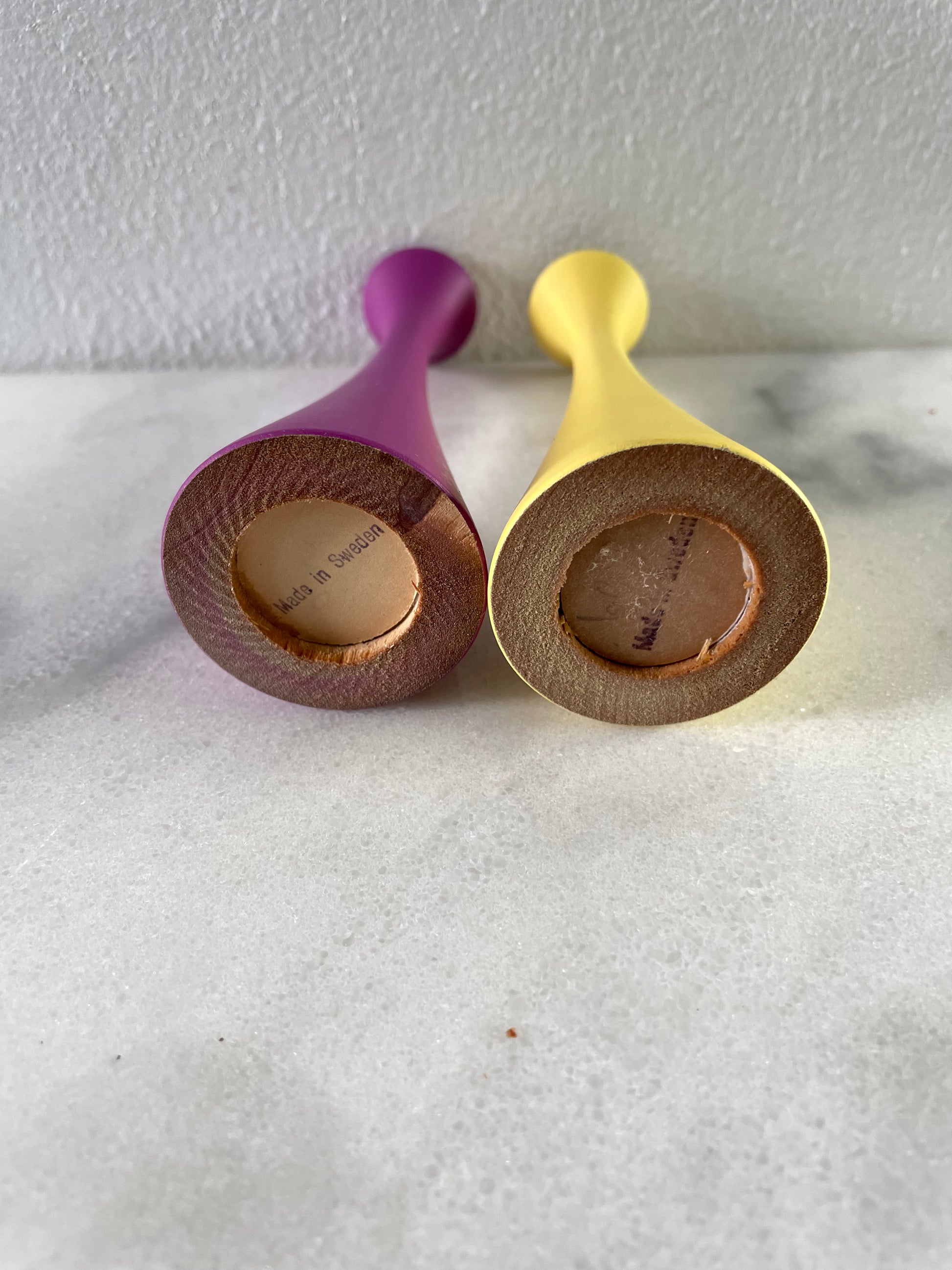 A pair of vintage mid-century Swedish candle holders. The candle holders have a tapering tulip style design crafted from wood,
