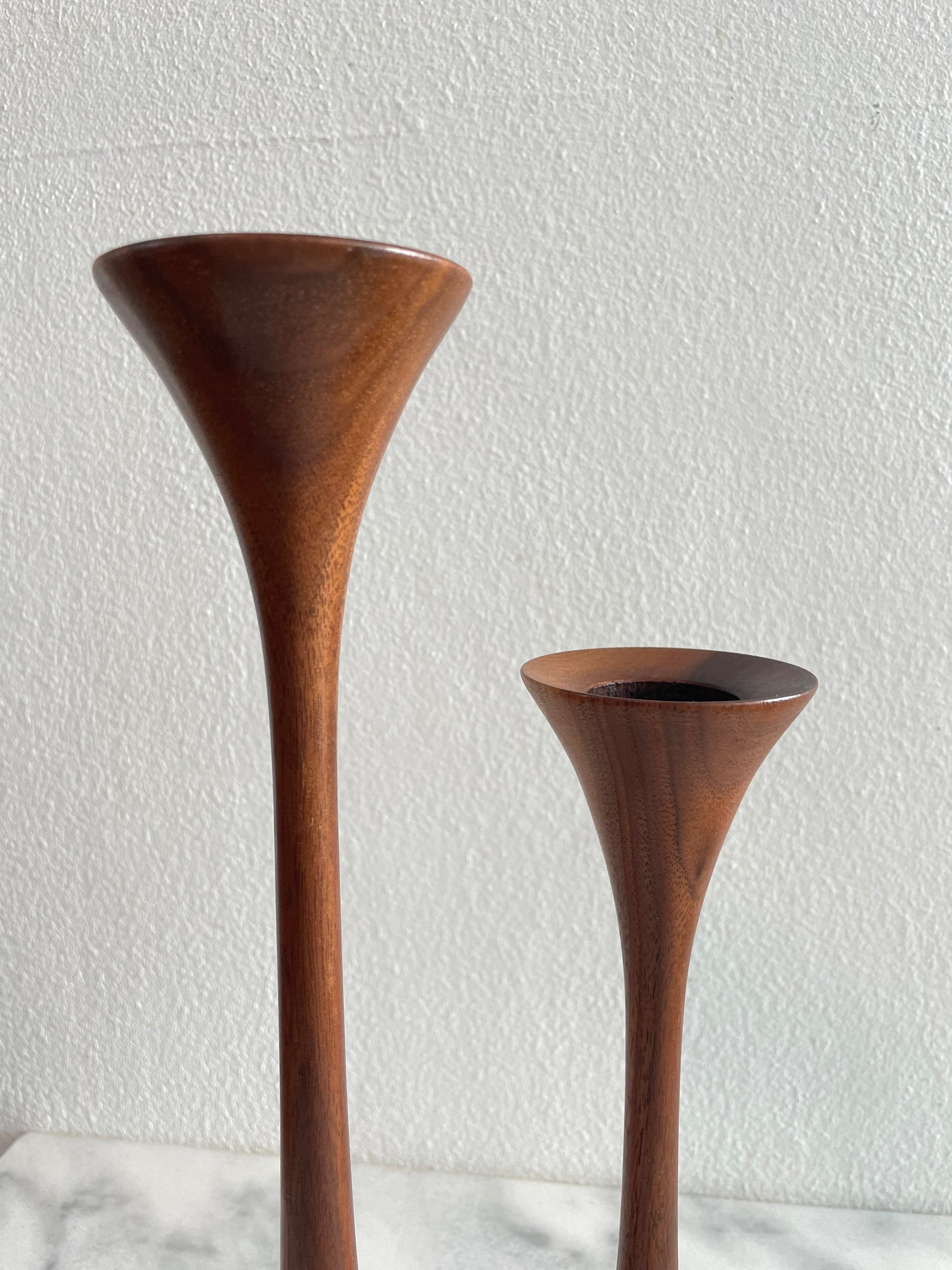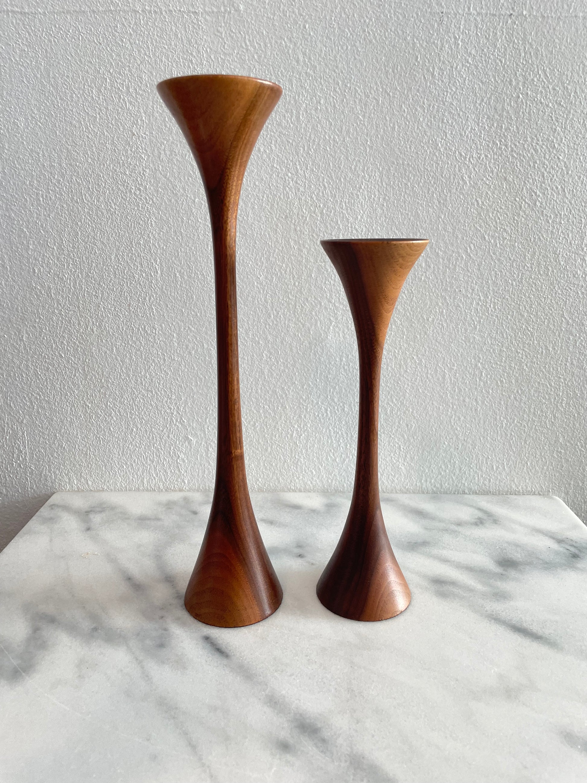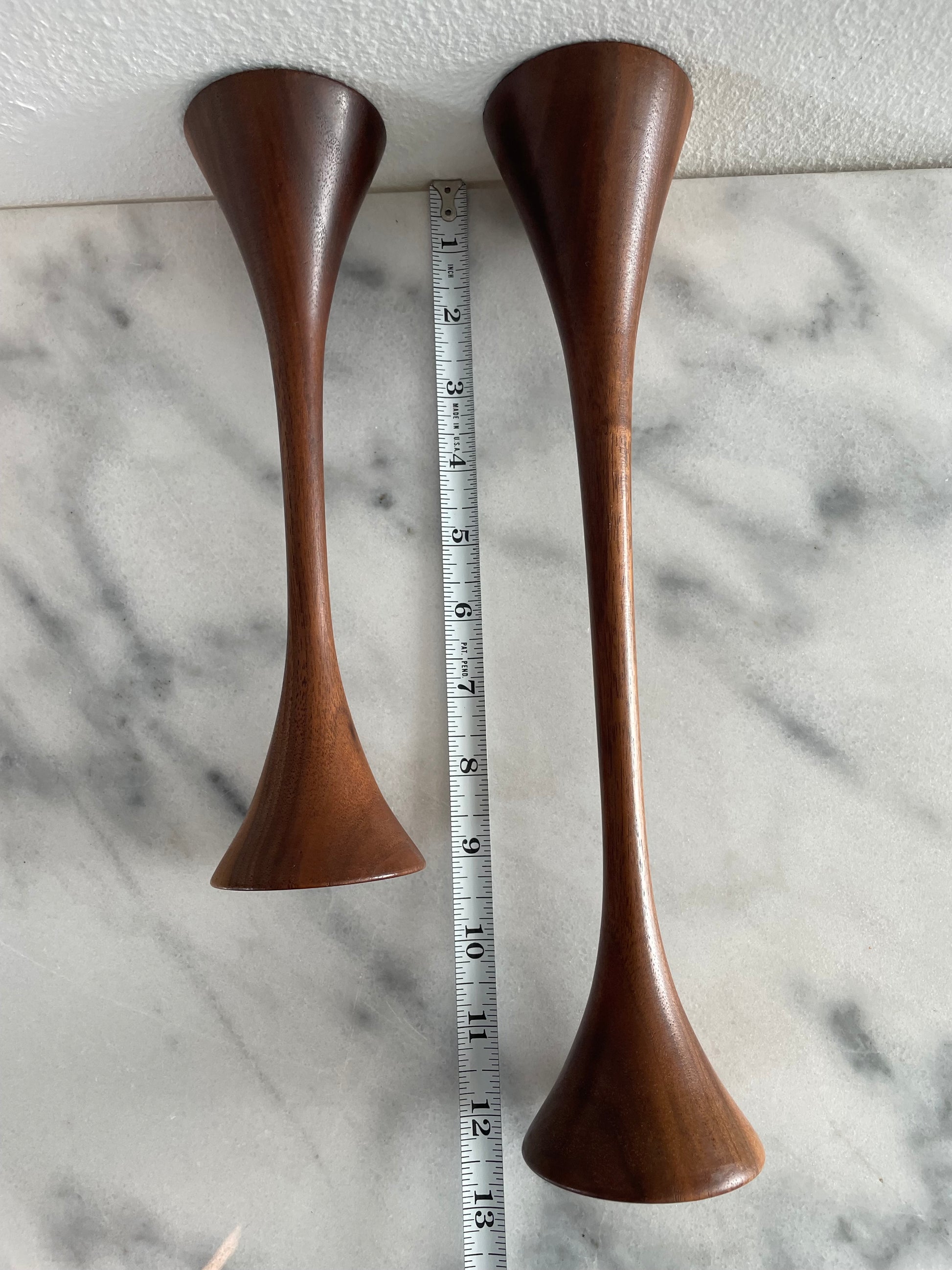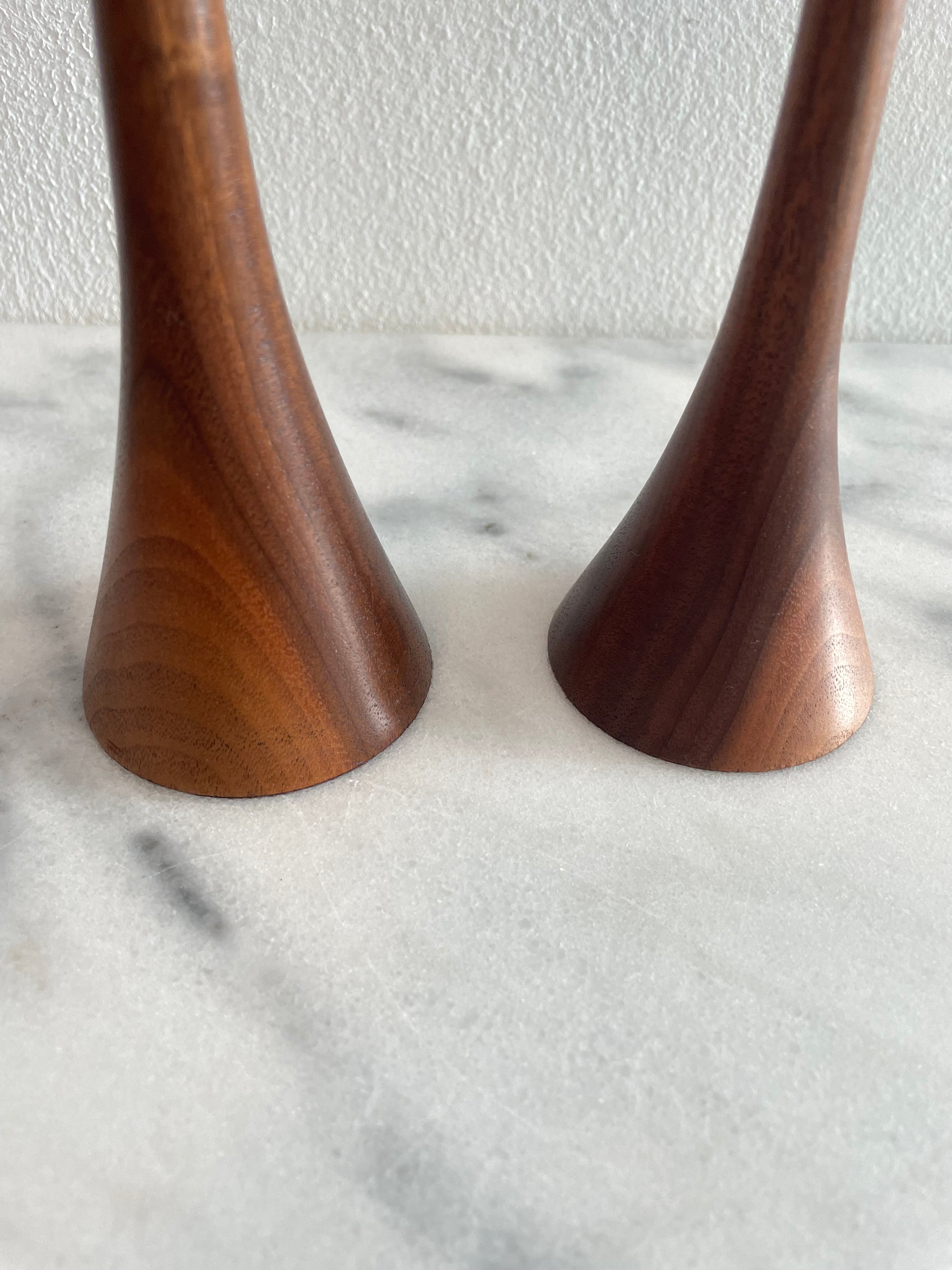 Mid-Century Walnut Tapered Tulip Candlesticks - Pair