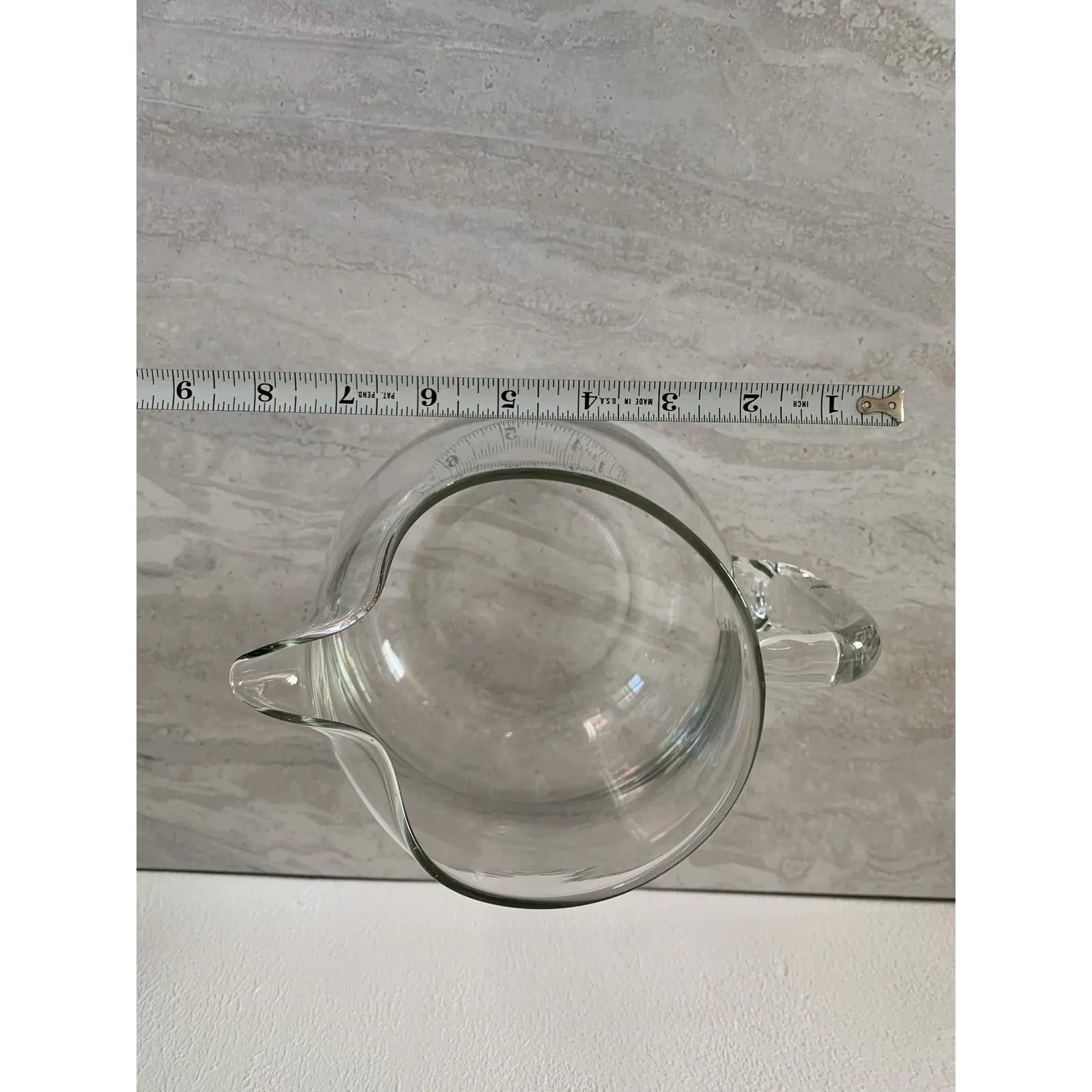 An elegantly minimal glass pitcher. The pitcher appears to be mouth blown. This pitcher is a simple and stylish tabletop accent.