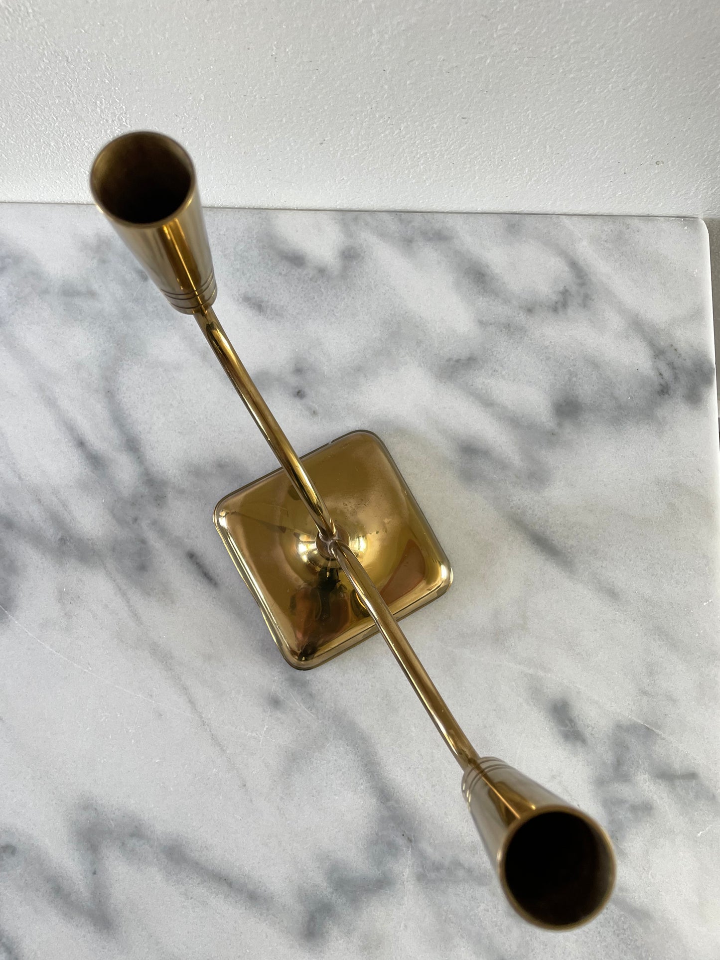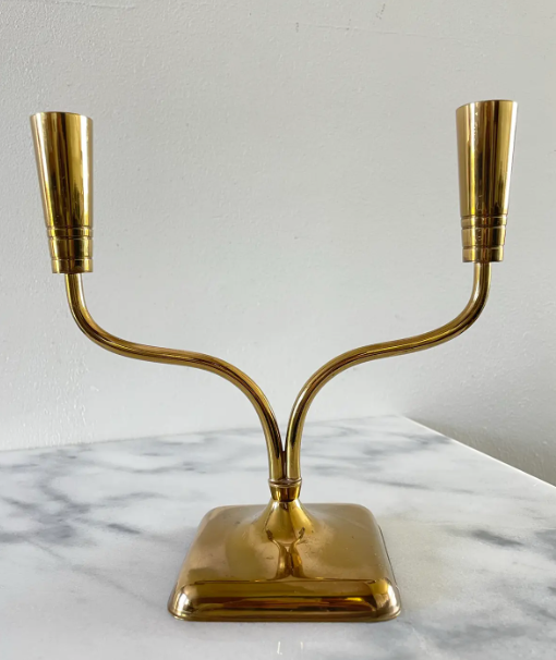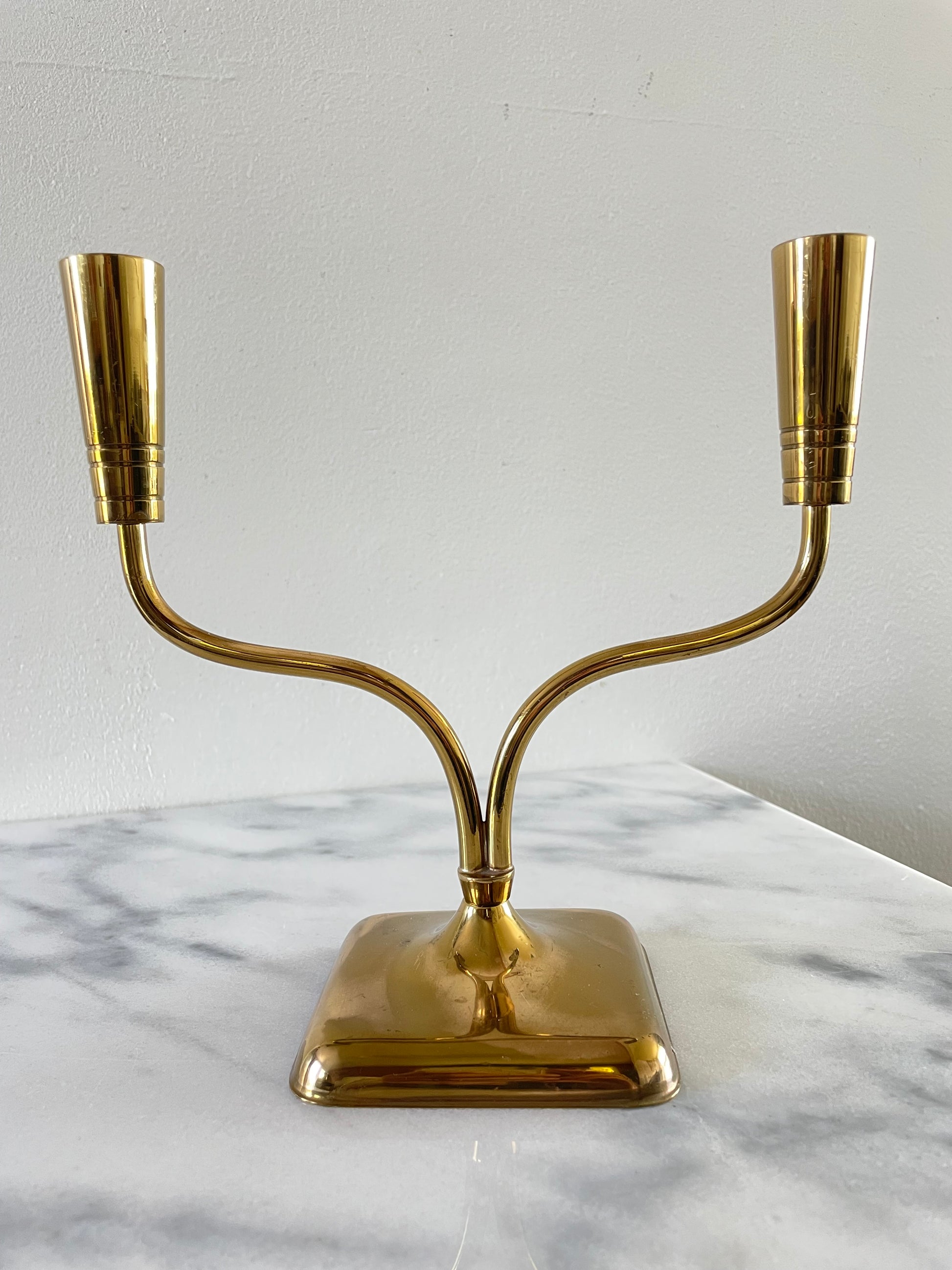 An elegant two-candle holder by Continental Collection By Poole. The holder features two thin but sturdy brass arms with tapered tops.