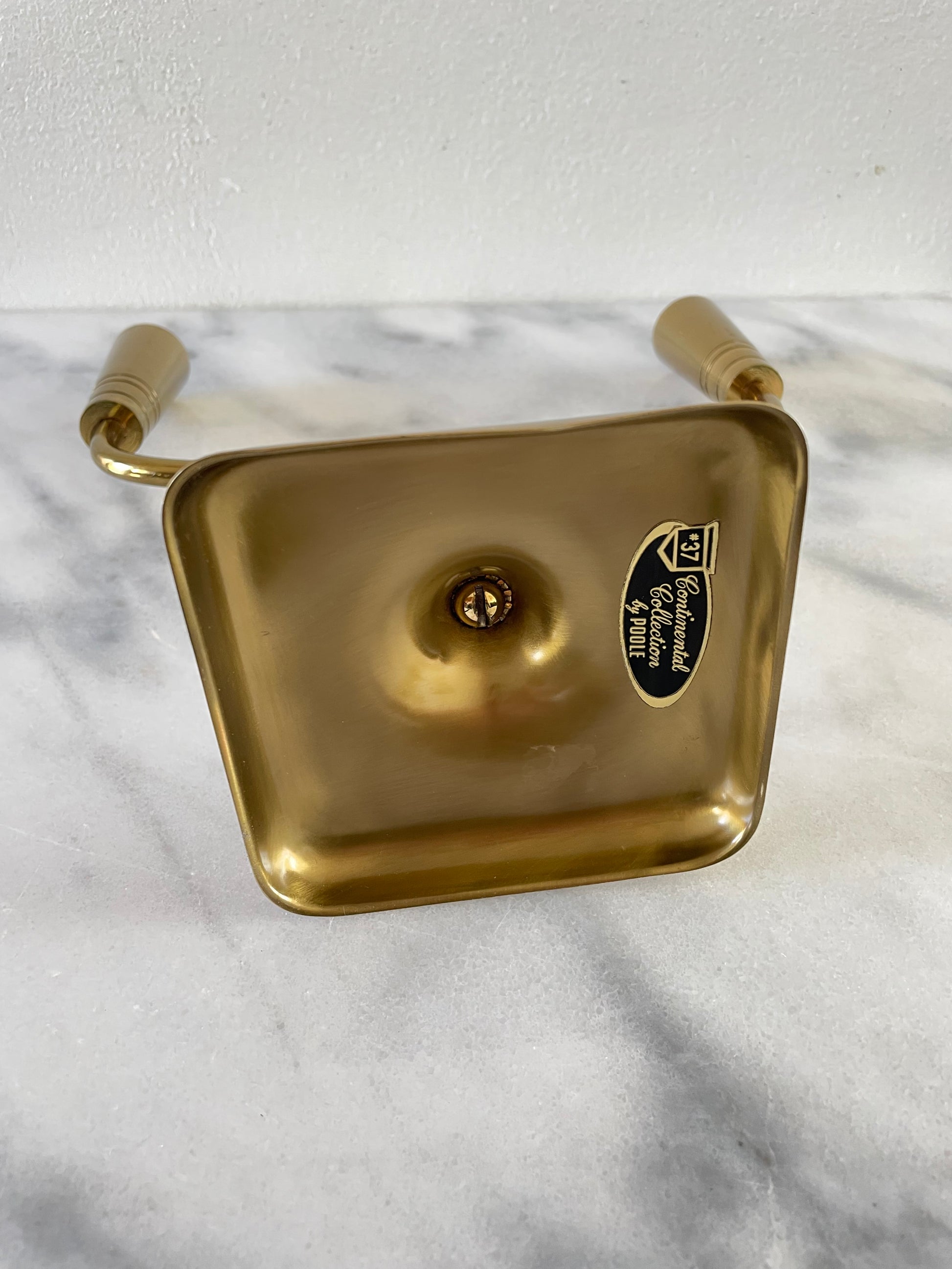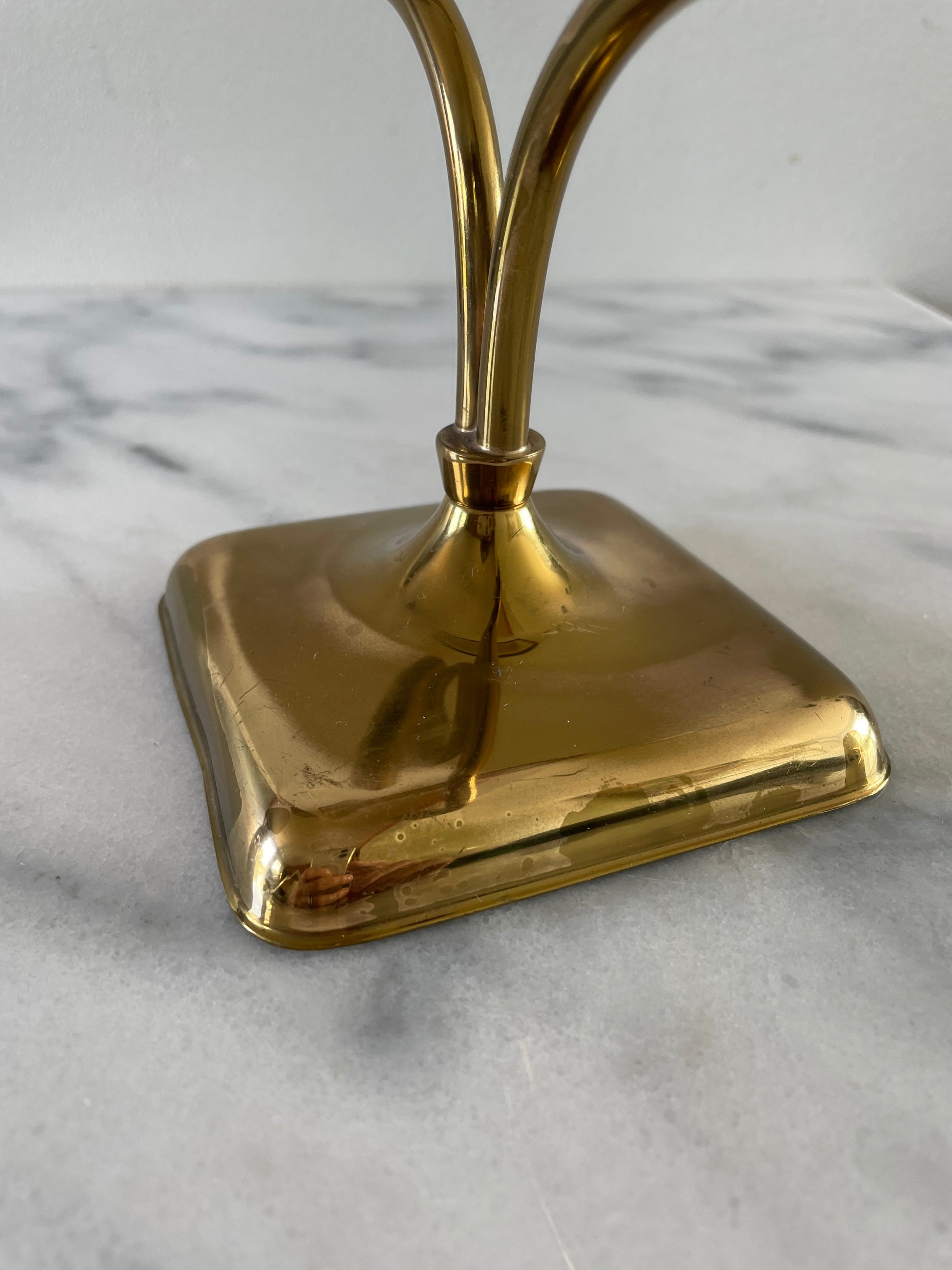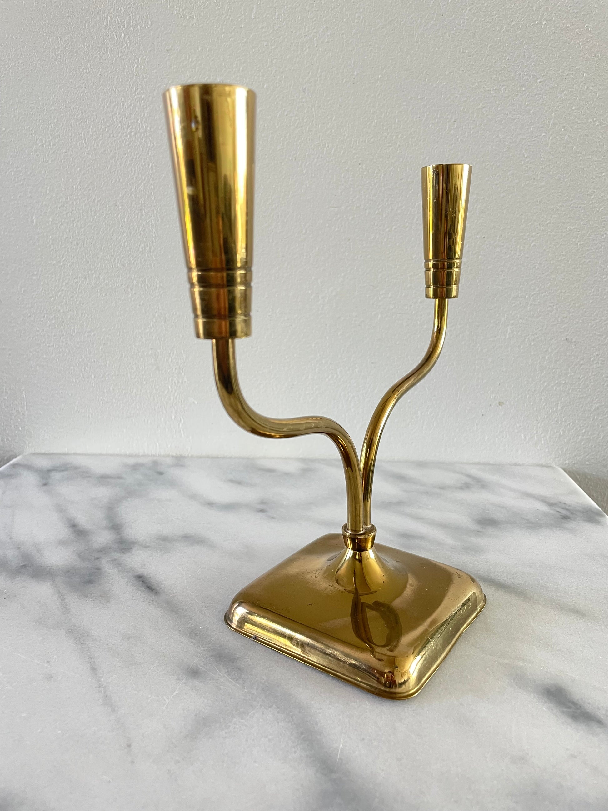 An elegant two-candle holder by Continental Collection By Poole. The holder features two thin but sturdy brass arms with tapered tops.