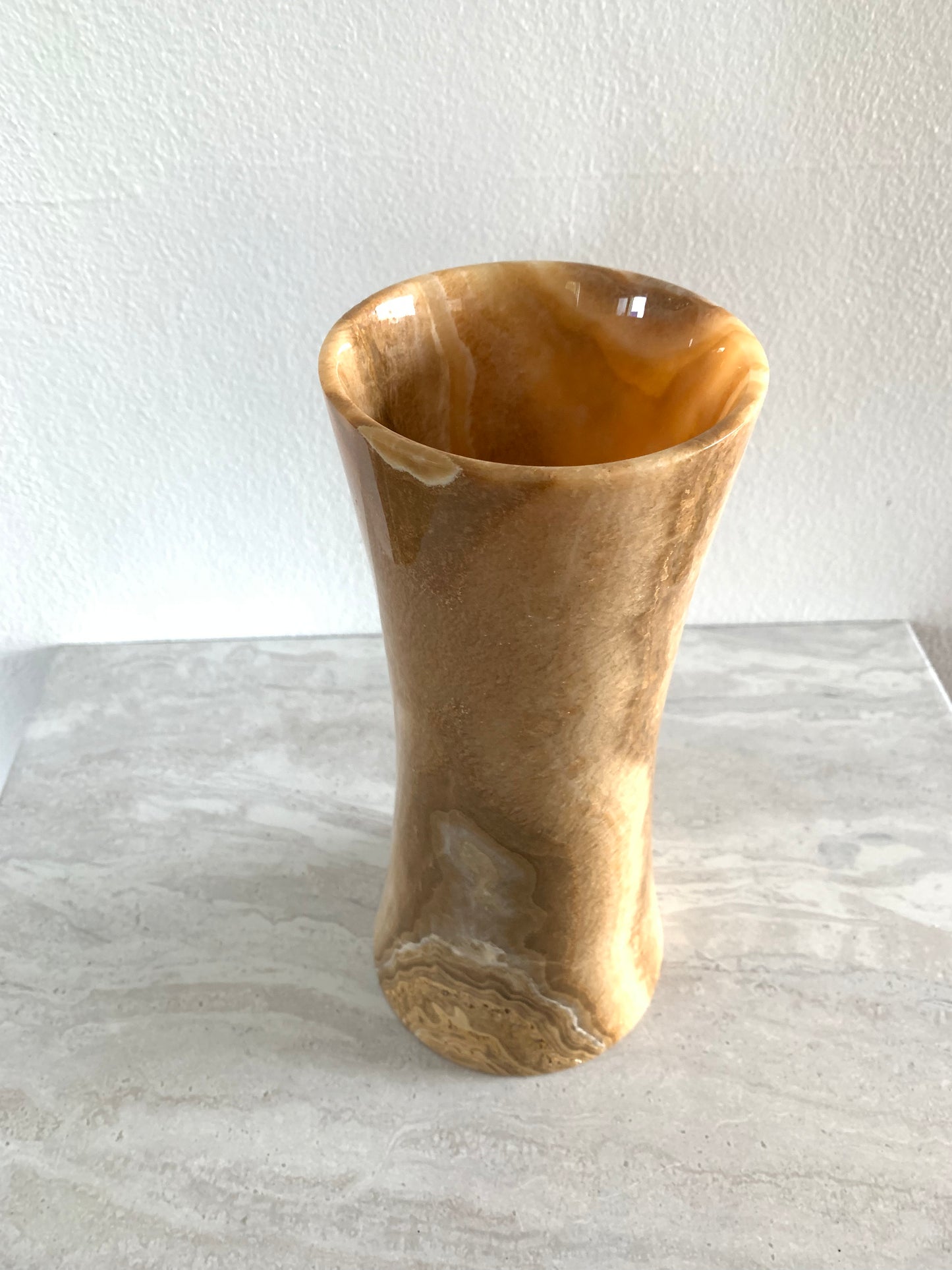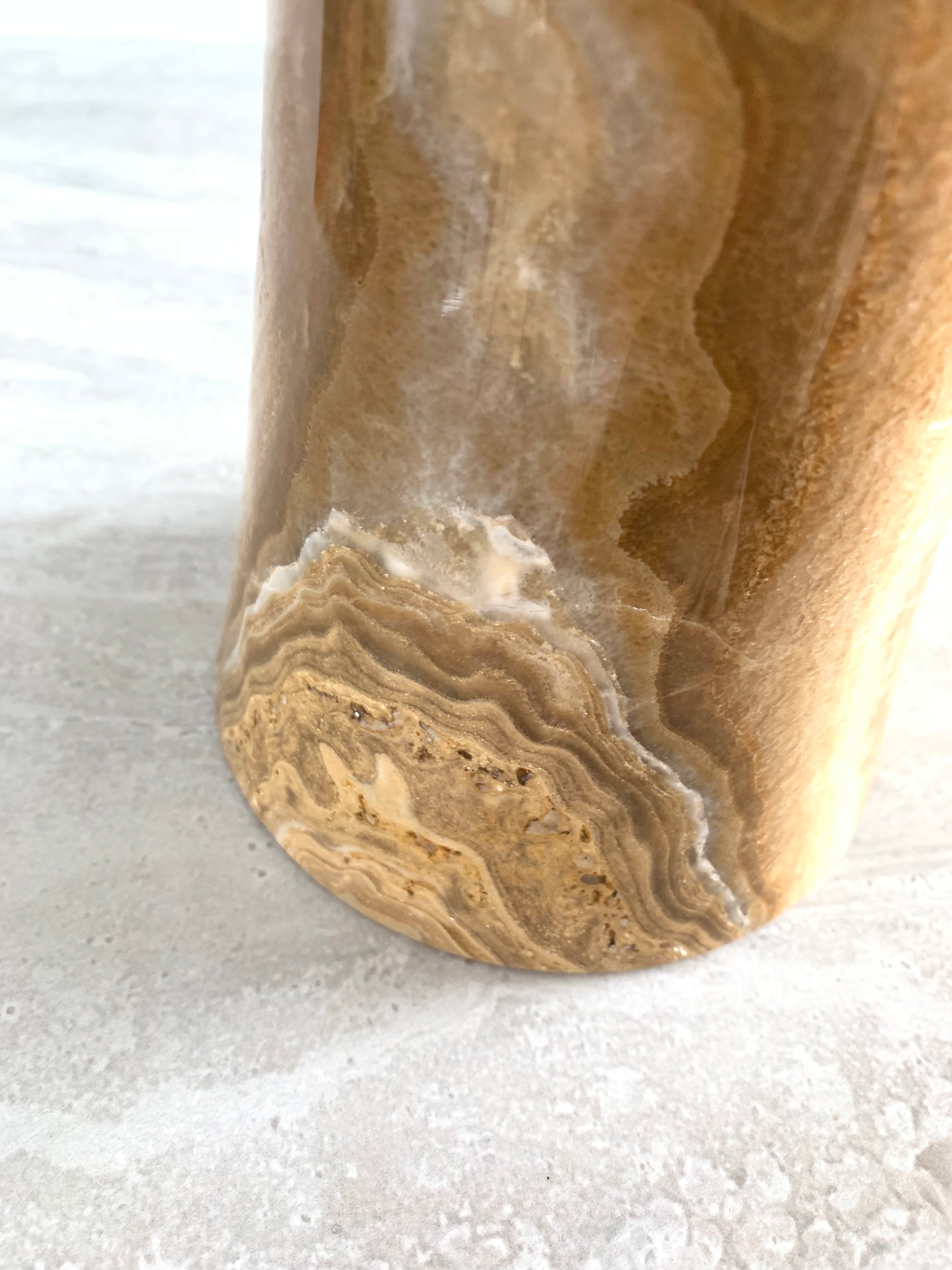 An exceptional tall and heavy onyx marble vase featuring neutral cream, brown, and tan concentric figuring and a streamlined shape. The stone has a translucent glow against the light.