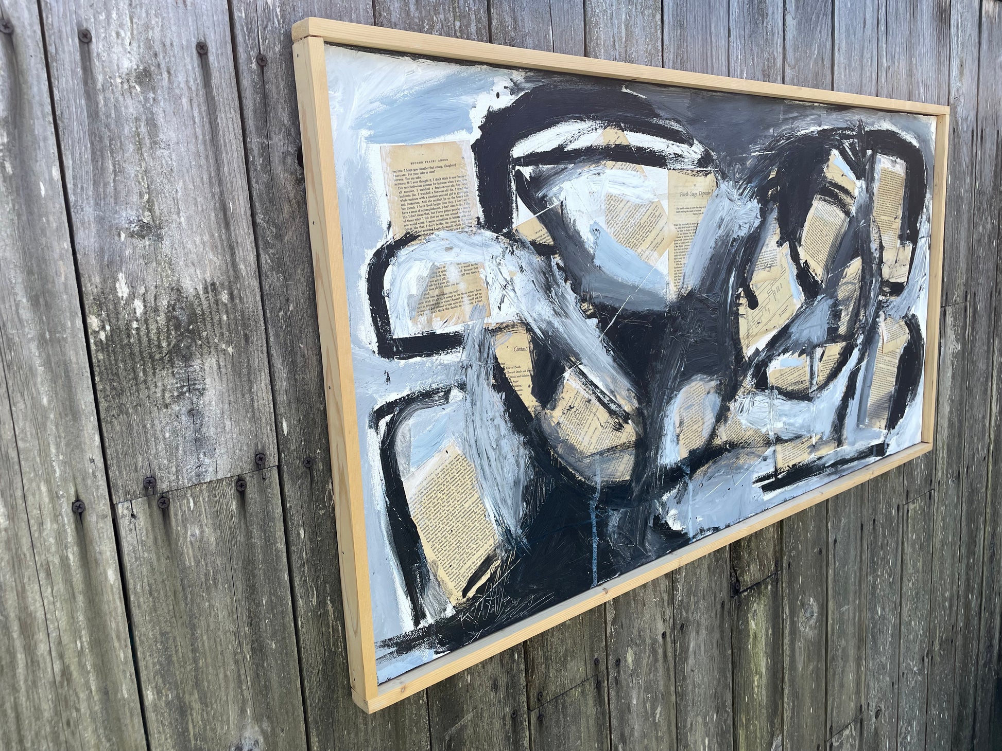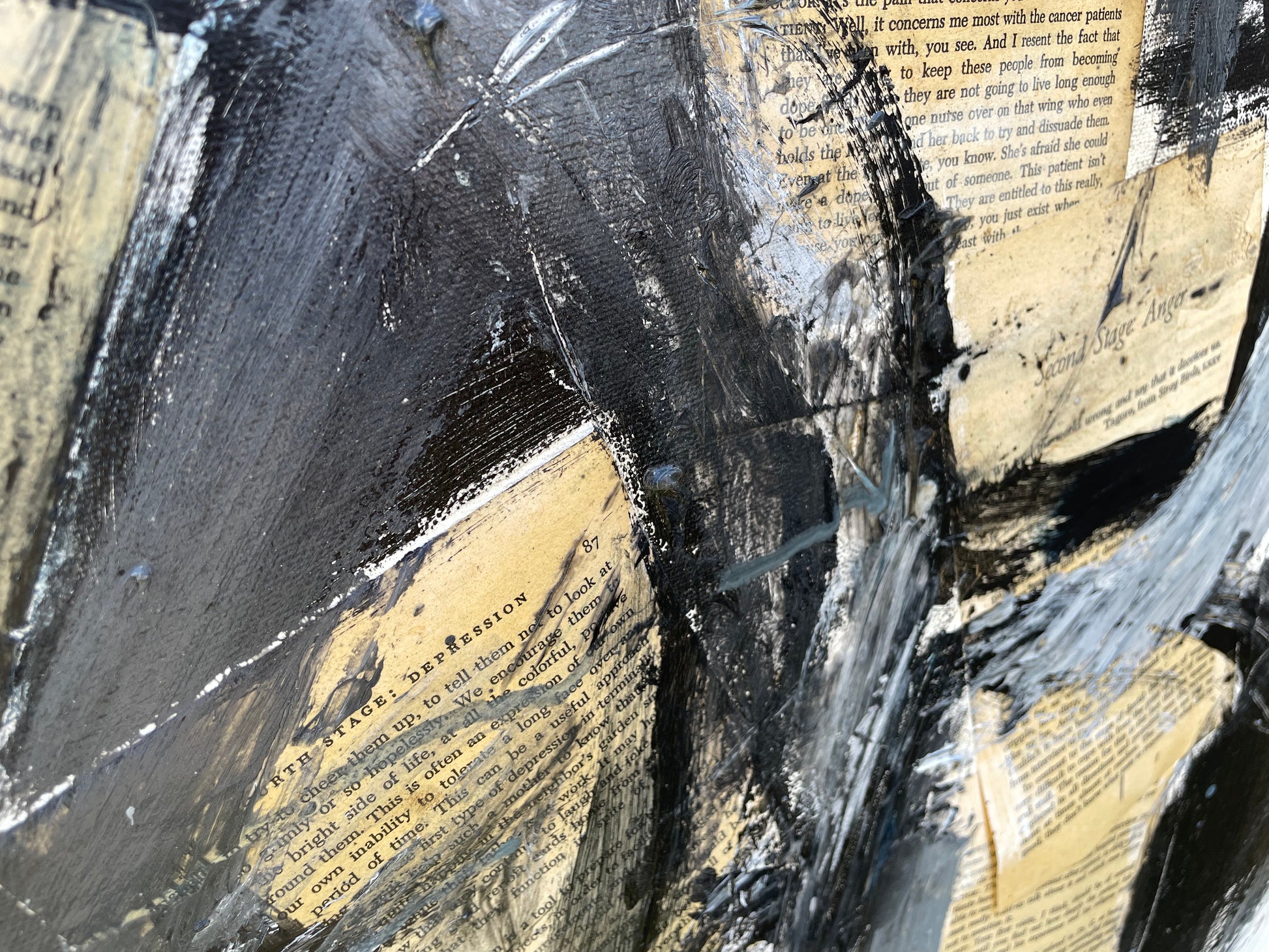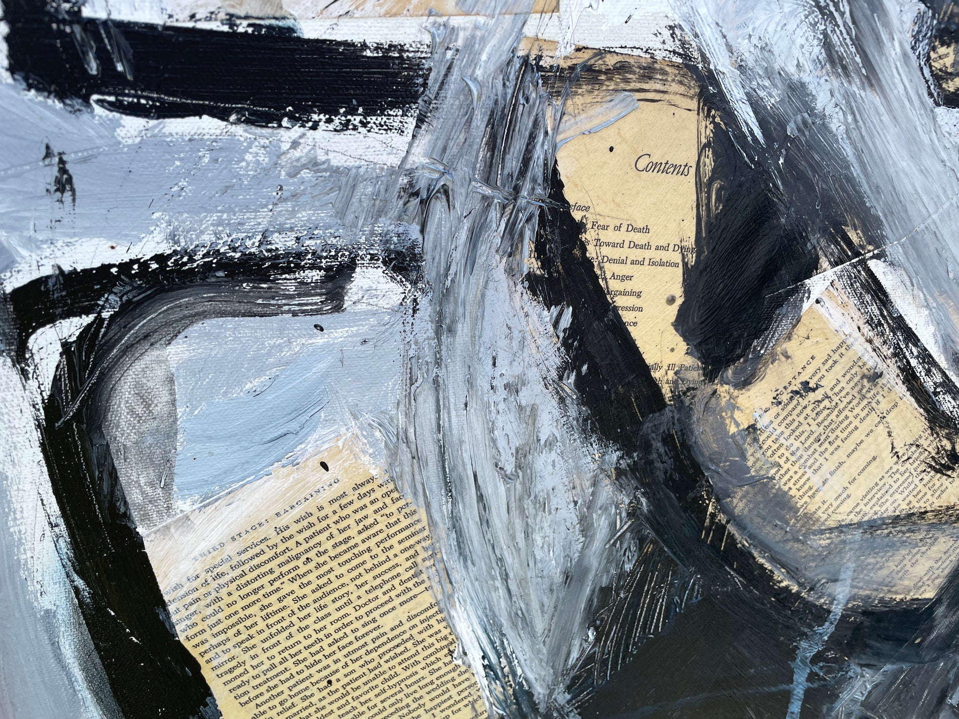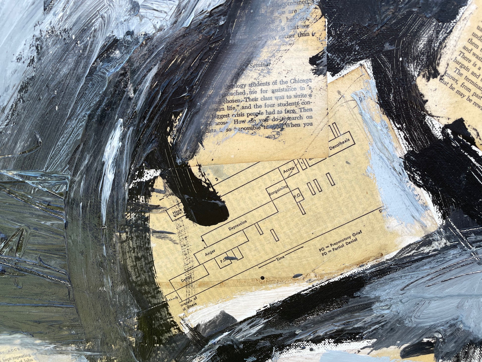 Mixed media composition by Francisco Peña, composed of a destroyed copy of On Death & Dying, Elisabeth Kübler-Ross's famous seminar on death, life, and transition that the artist found on the side of the road while walking in West Oakland. The book pages come through the thick, broad strokes of white, gray, and black paint. Framed by the artist in a simple reclaimed wood frame.