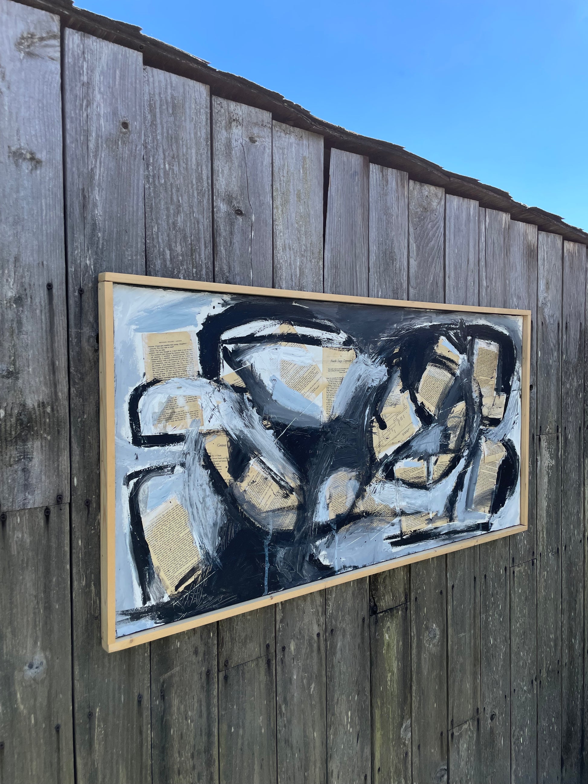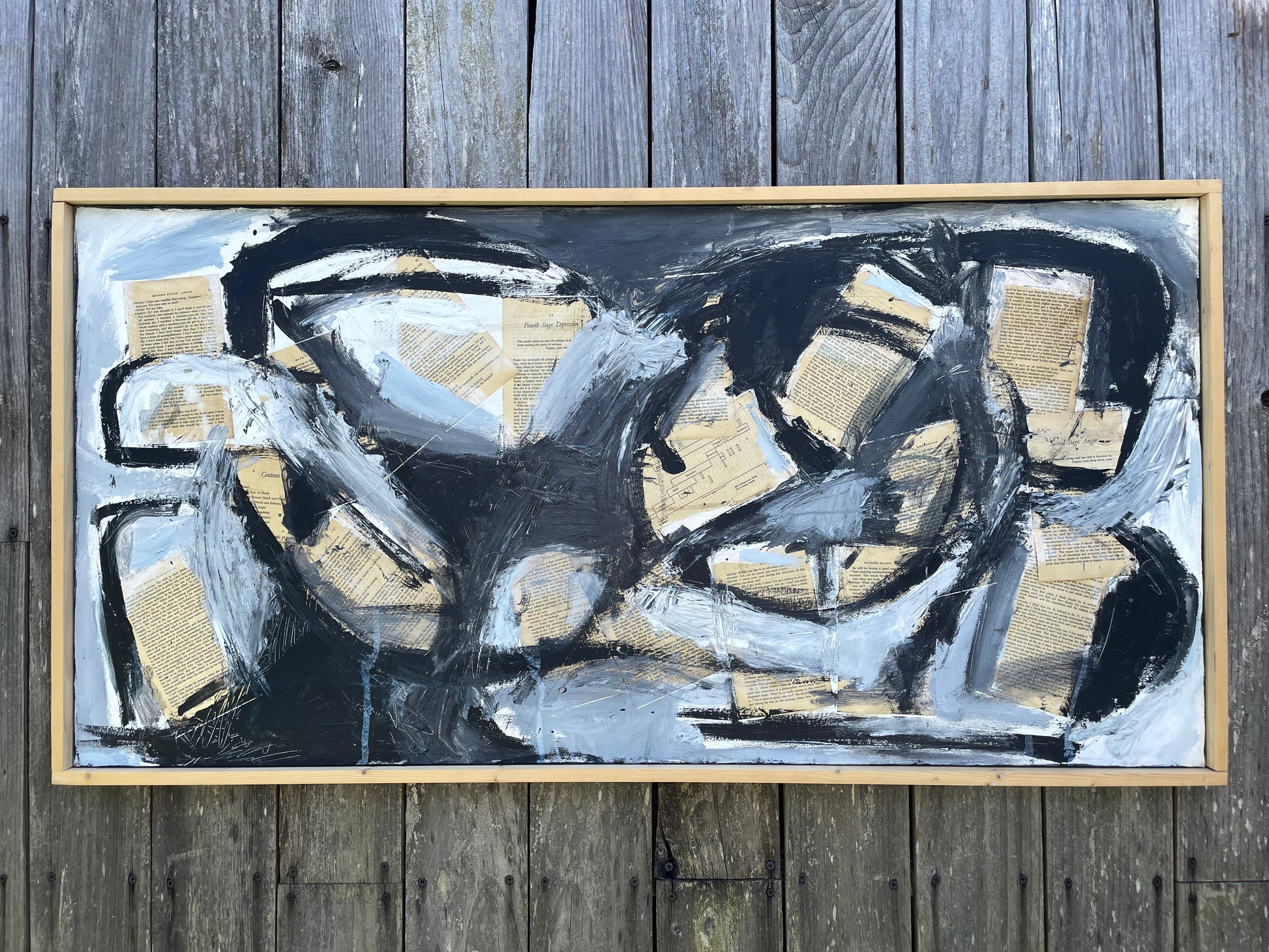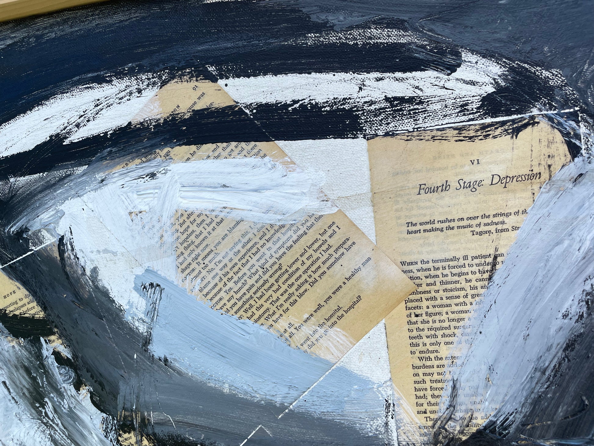 Mixed media composition by Francisco Peña, composed of a destroyed copy of On Death & Dying, Elisabeth Kübler-Ross's famous seminar on death, life, and transition that the artist found on the side of the road while walking in West Oakland. The book pages come through the thick, broad strokes of white, gray, and black paint. Framed by the artist in a simple reclaimed wood frame.