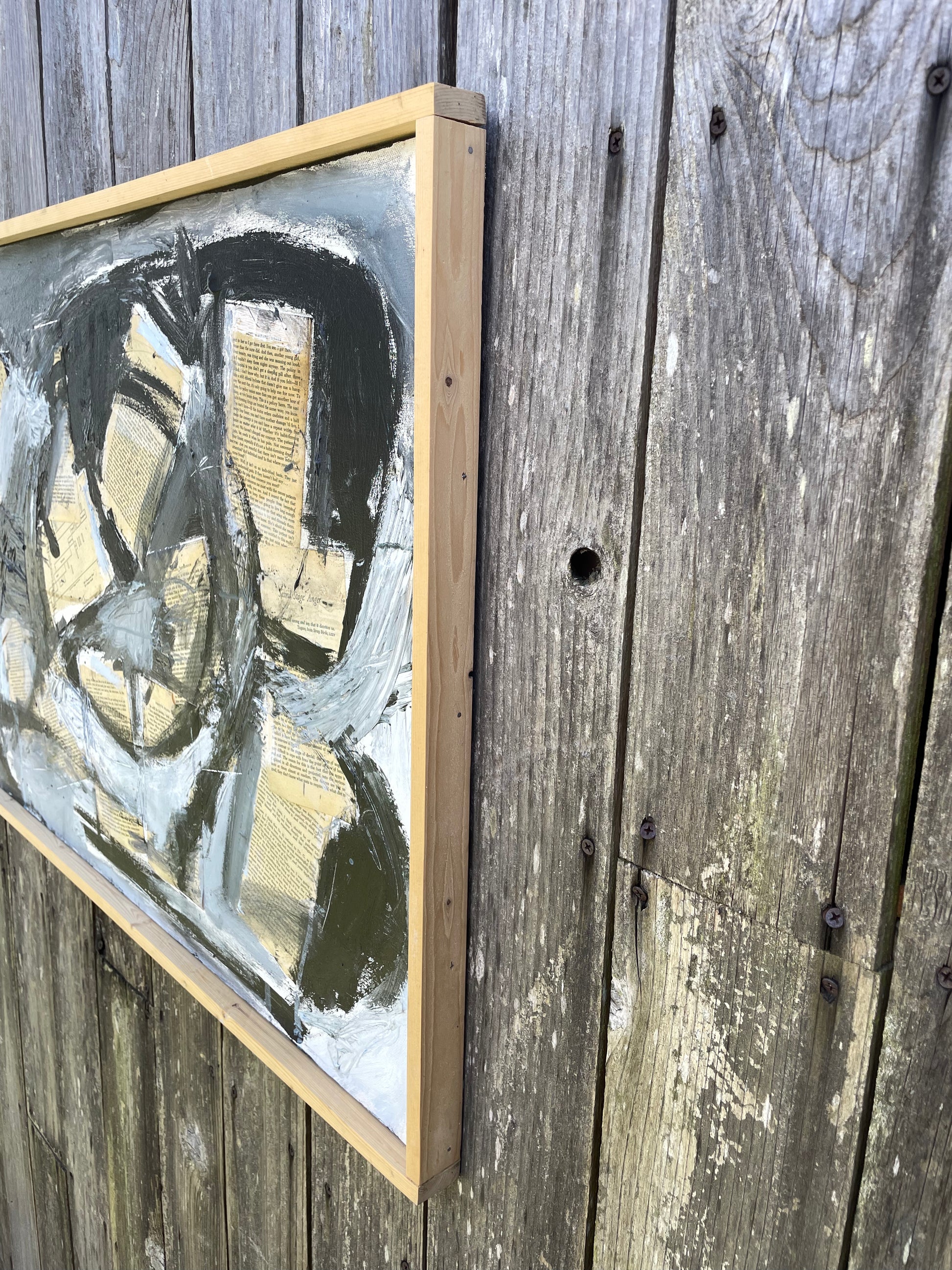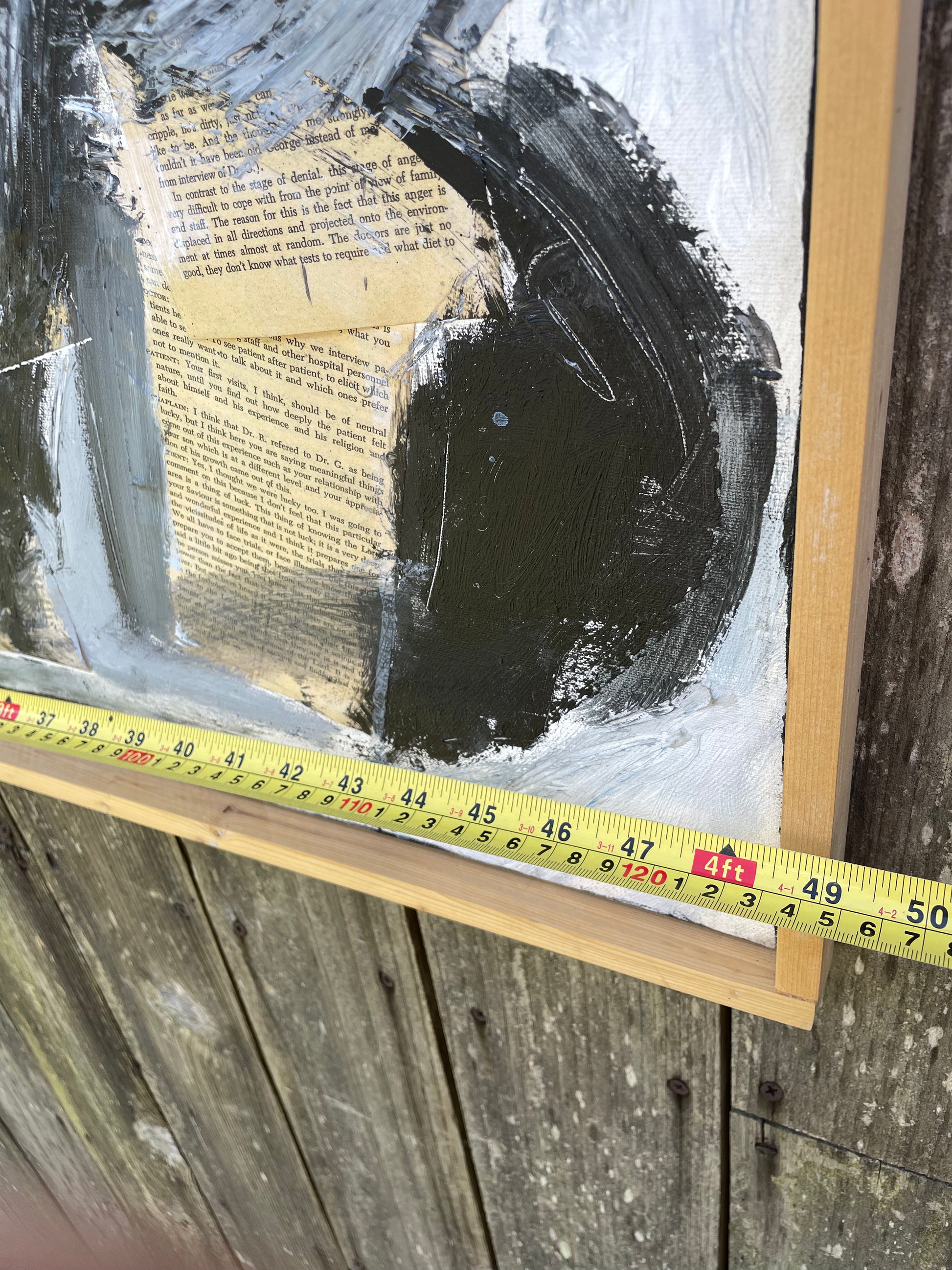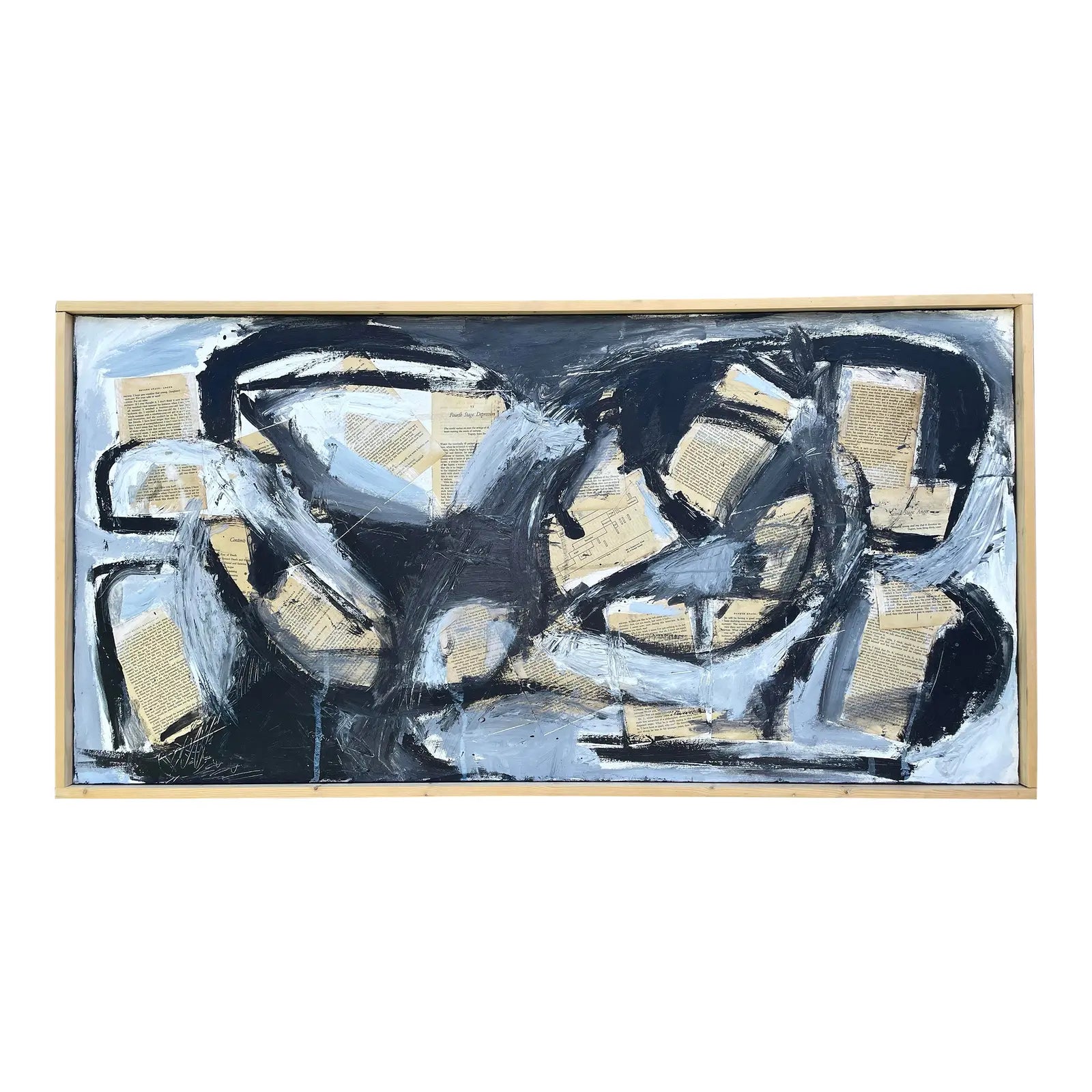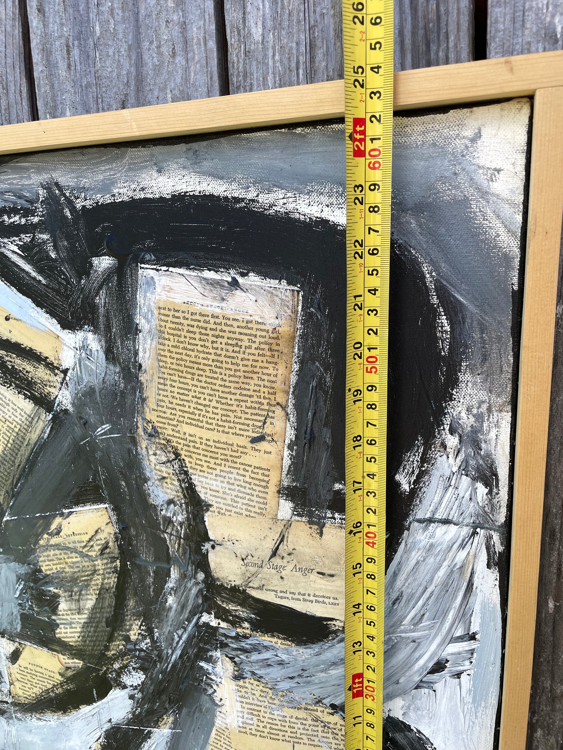Mixed media composition by Francisco Peña, composed of a destroyed copy of On Death & Dying, Elisabeth Kübler-Ross's famous seminar on death, life, and transition that the artist found on the side of the road while walking in West Oakland. The book pages come through the thick, broad strokes of white, gray, and black paint. Framed by the artist in a simple reclaimed wood frame.
