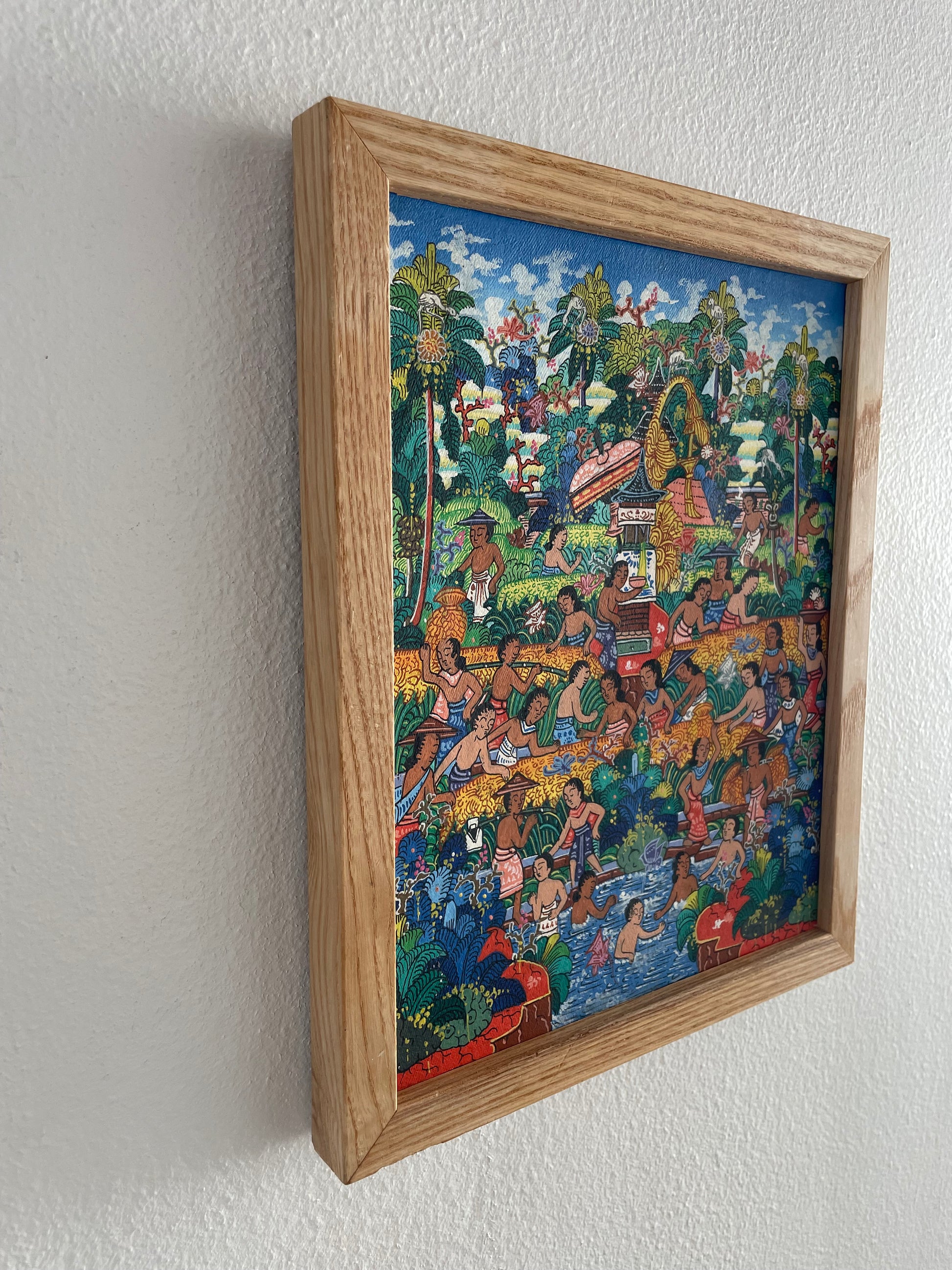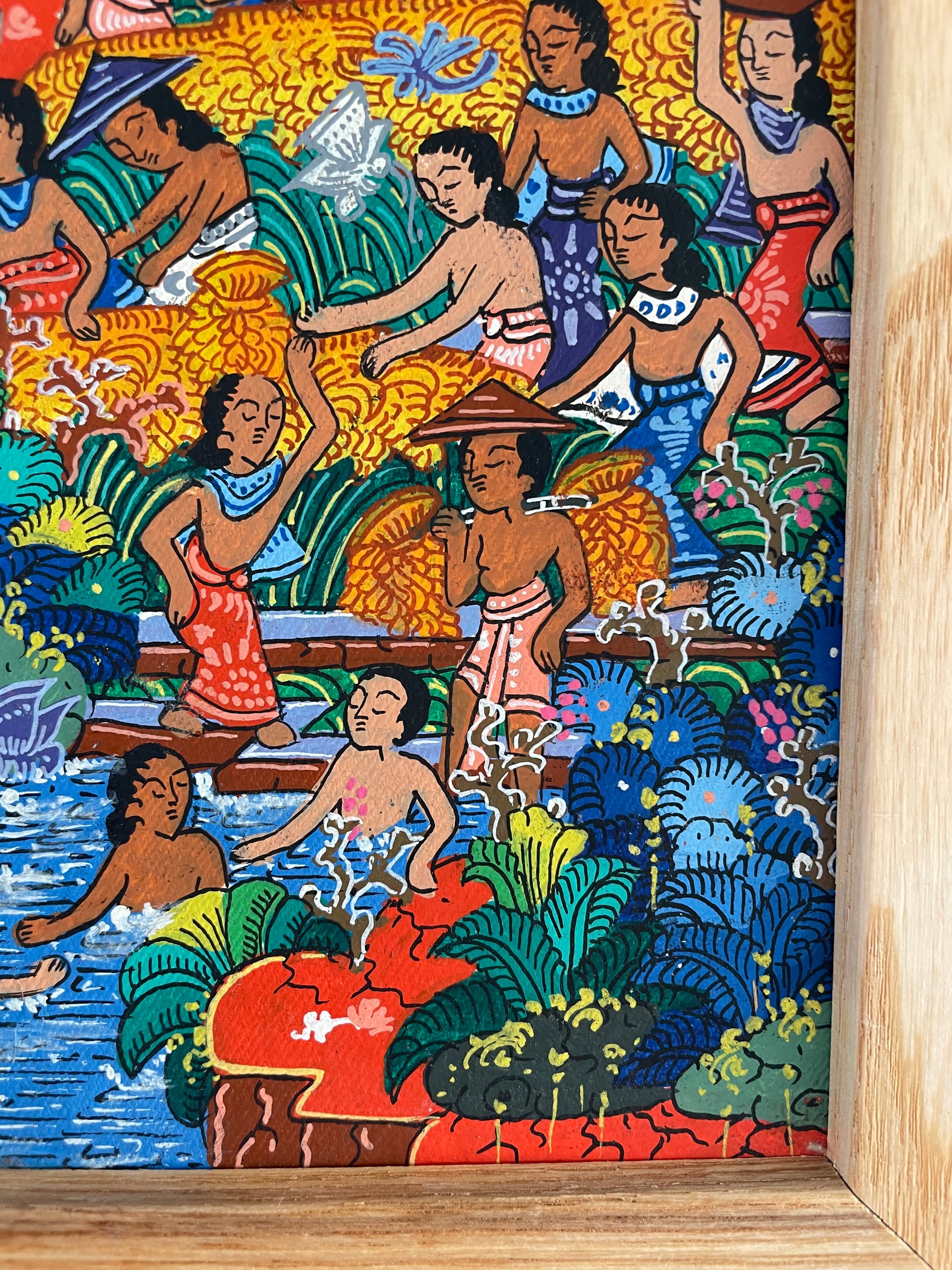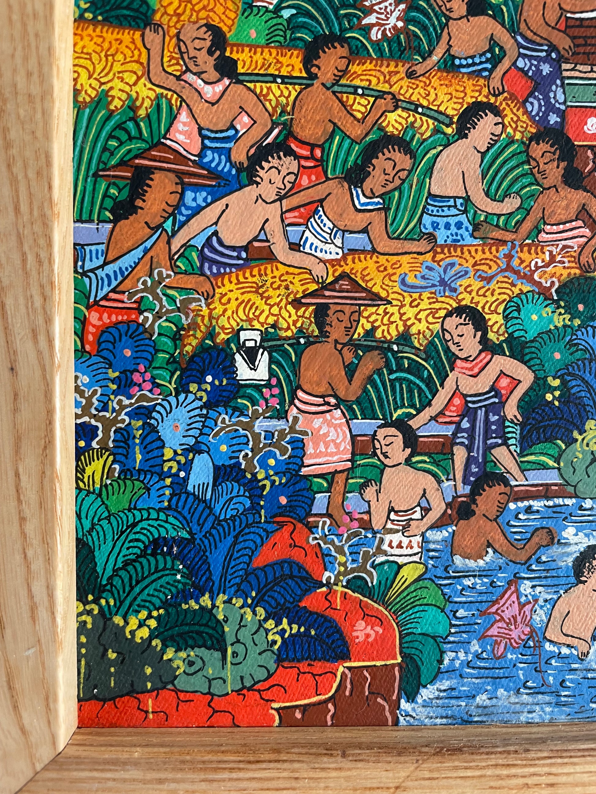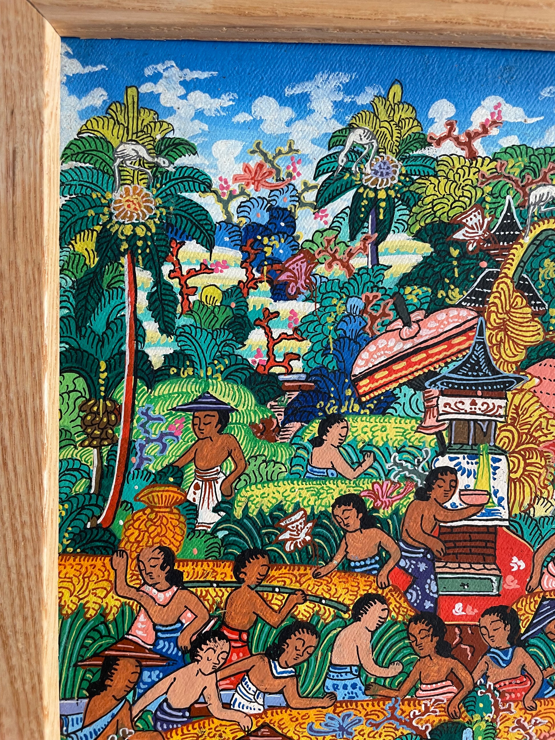 A framed energetic traditional folk art painting on canvas from Bali depicting scenes from everyday life in vibrant colors.