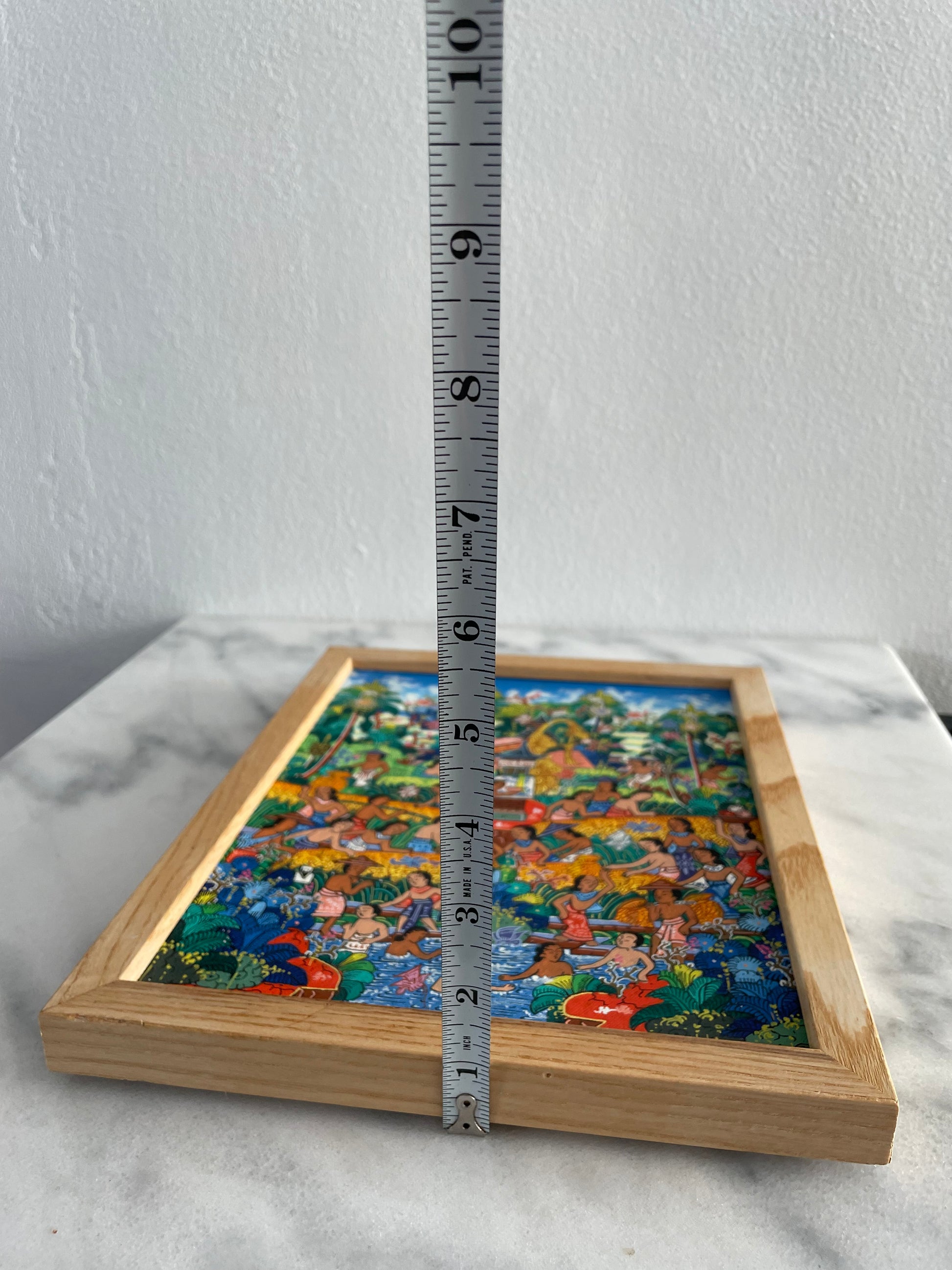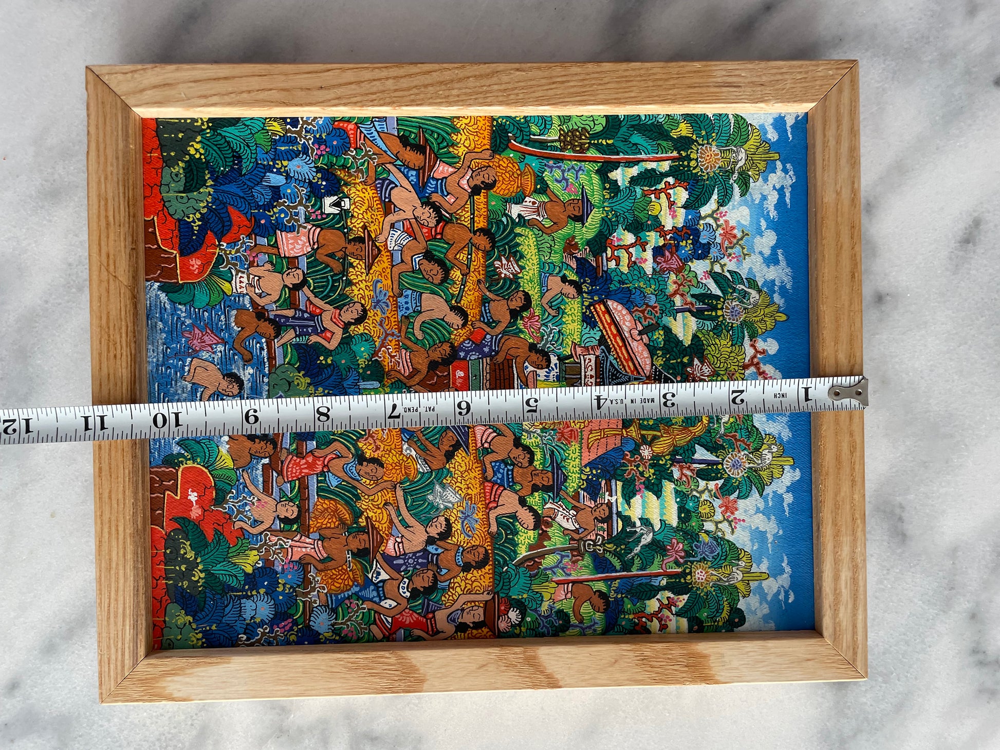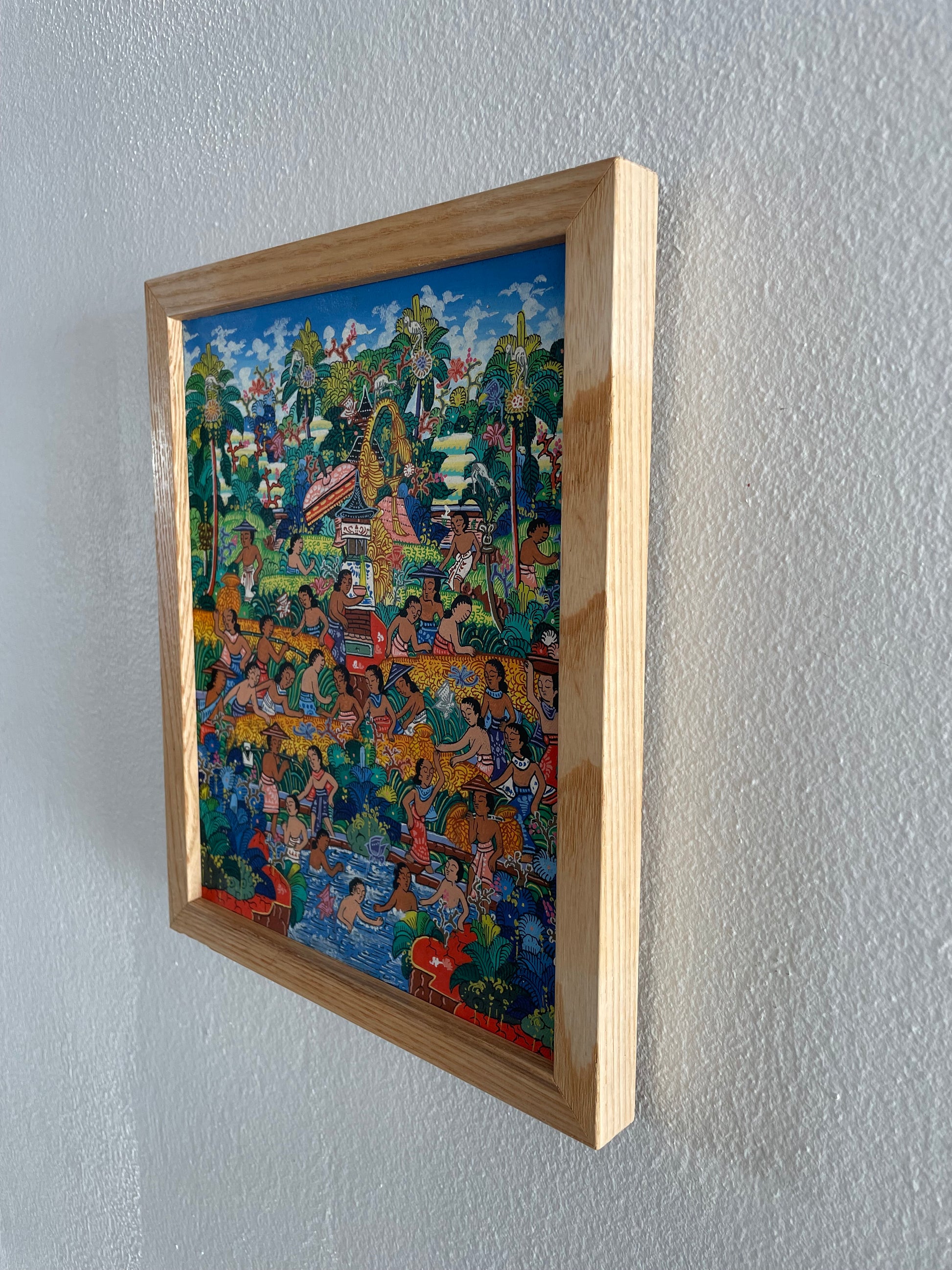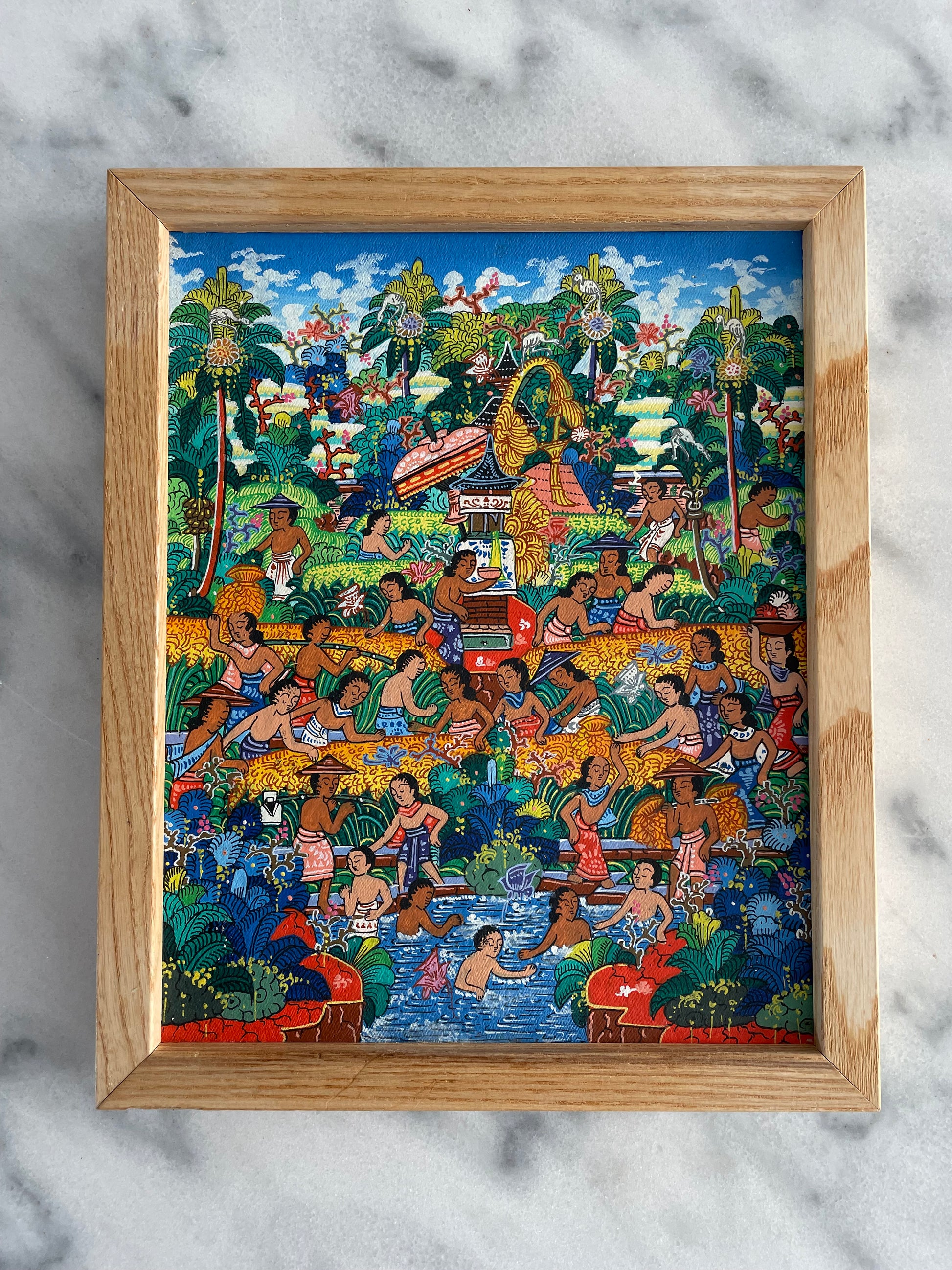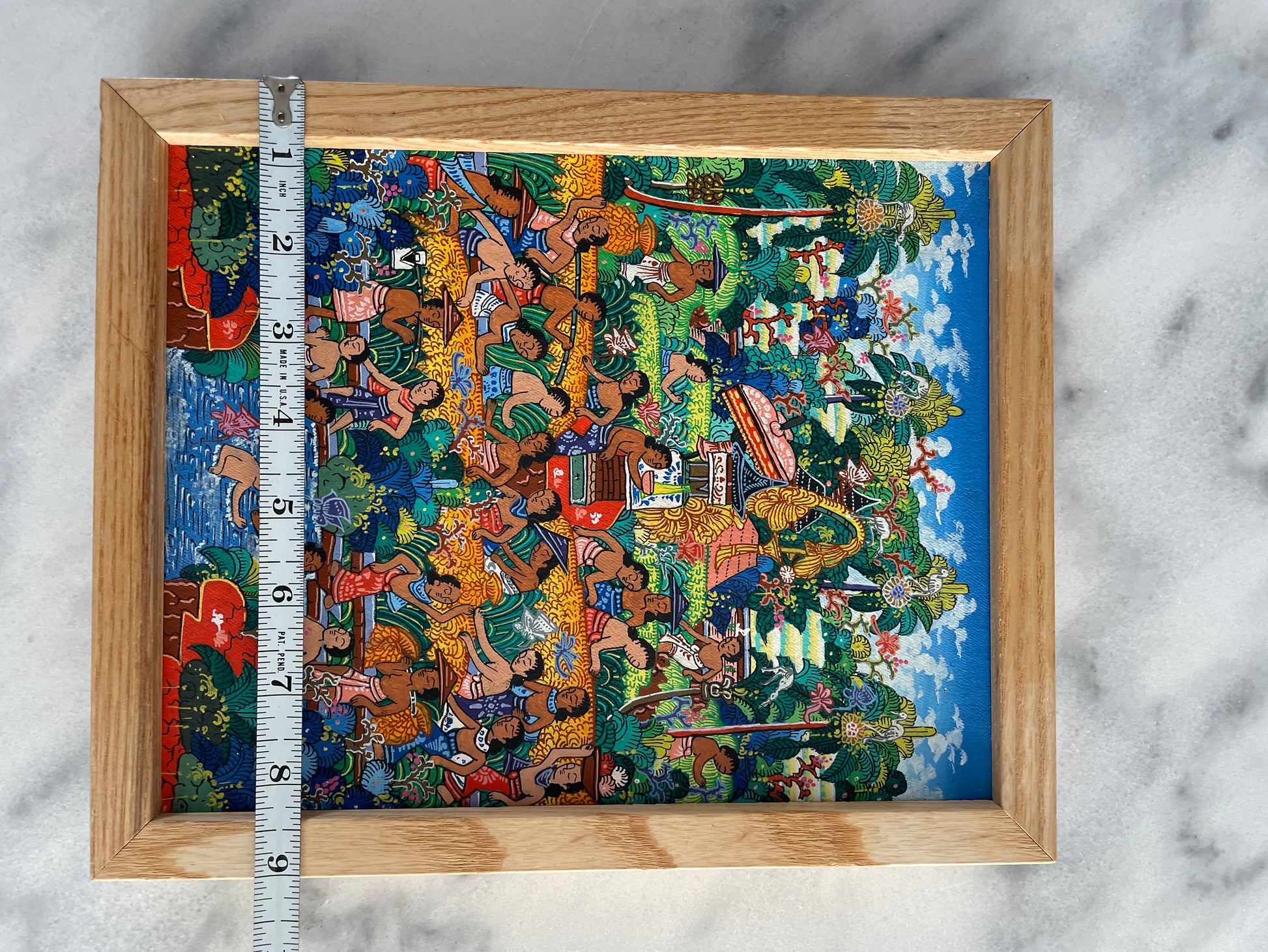 A framed energetic traditional folk art painting on canvas from Bali depicting scenes from everyday life in vibrant colors.