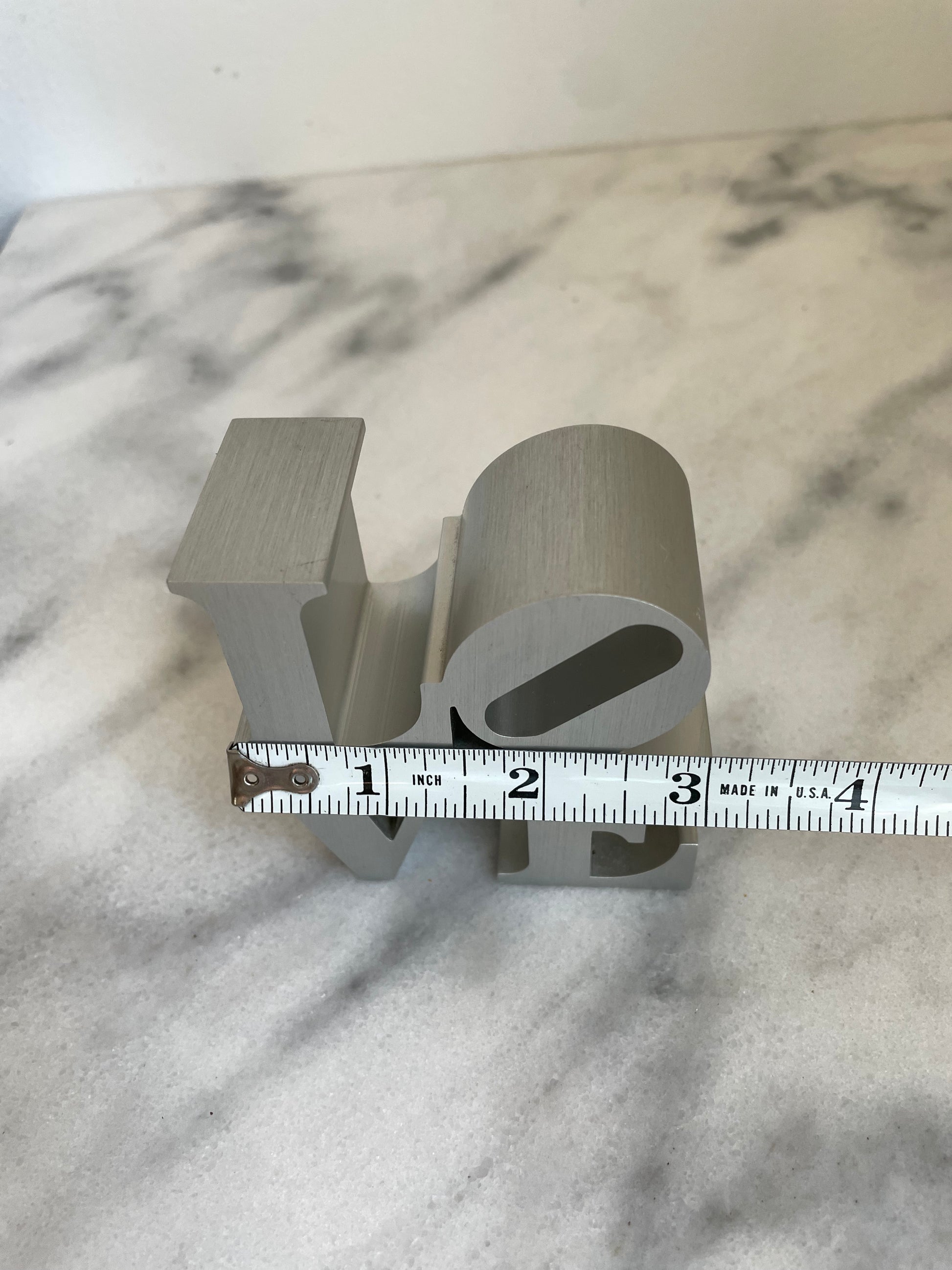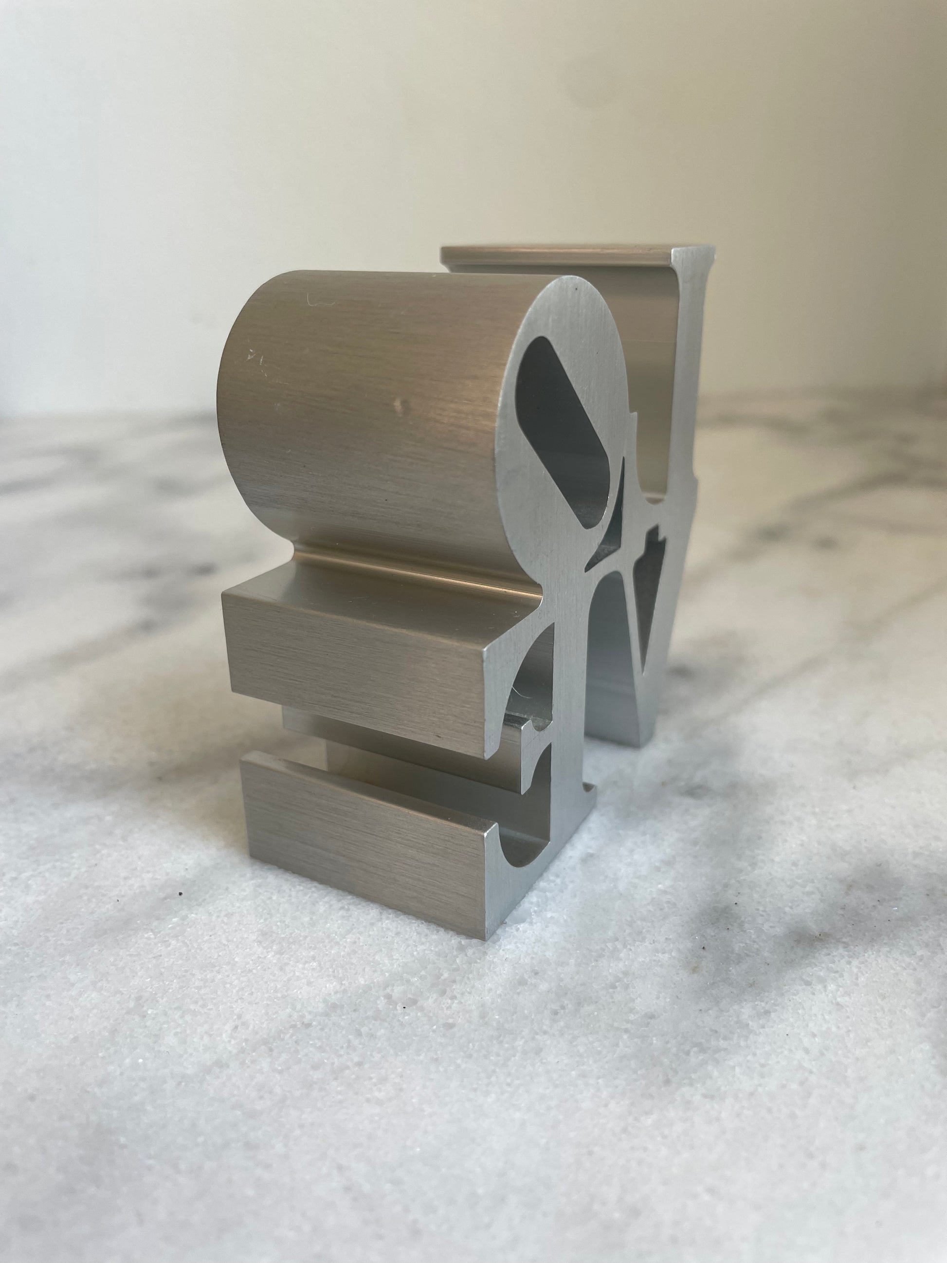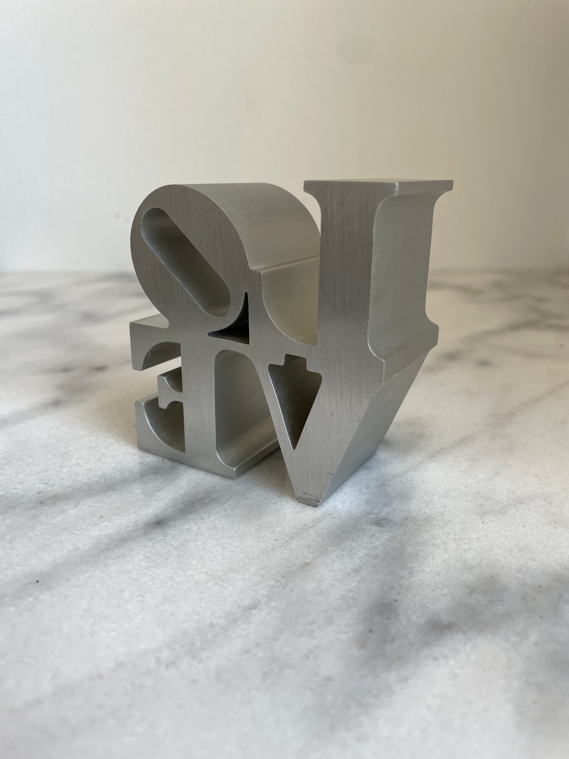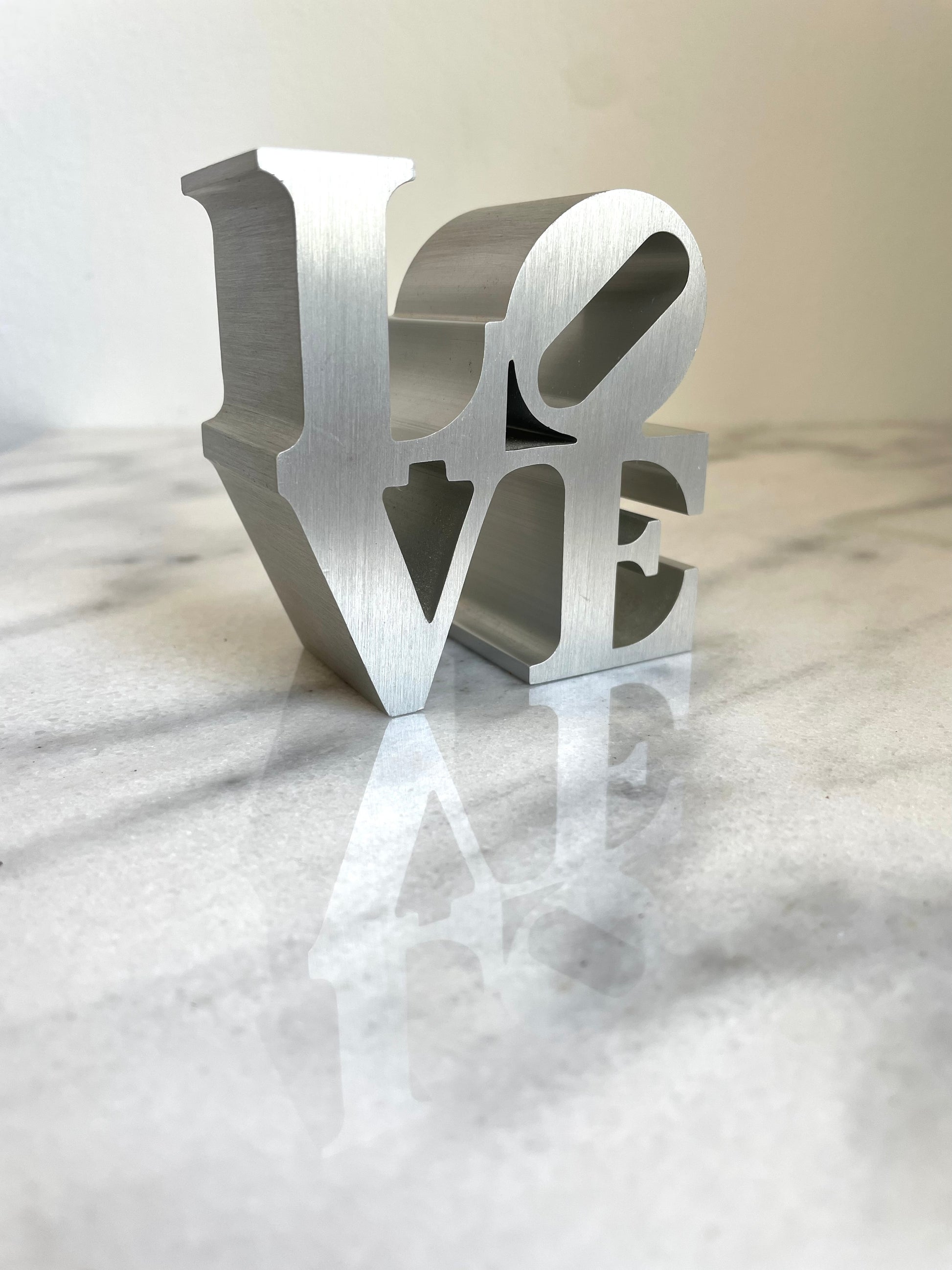 Iconic LOVE desk sculpture in machined aluminum - originally created by Robert Indiana (1928-2018) and sent to his friends in 1964 as cards…the following year, he submitted oil on canvas versions to the Museum of Modern Art where they became the museum’s most popular holiday card…sculpture versions began the year after, 1966.