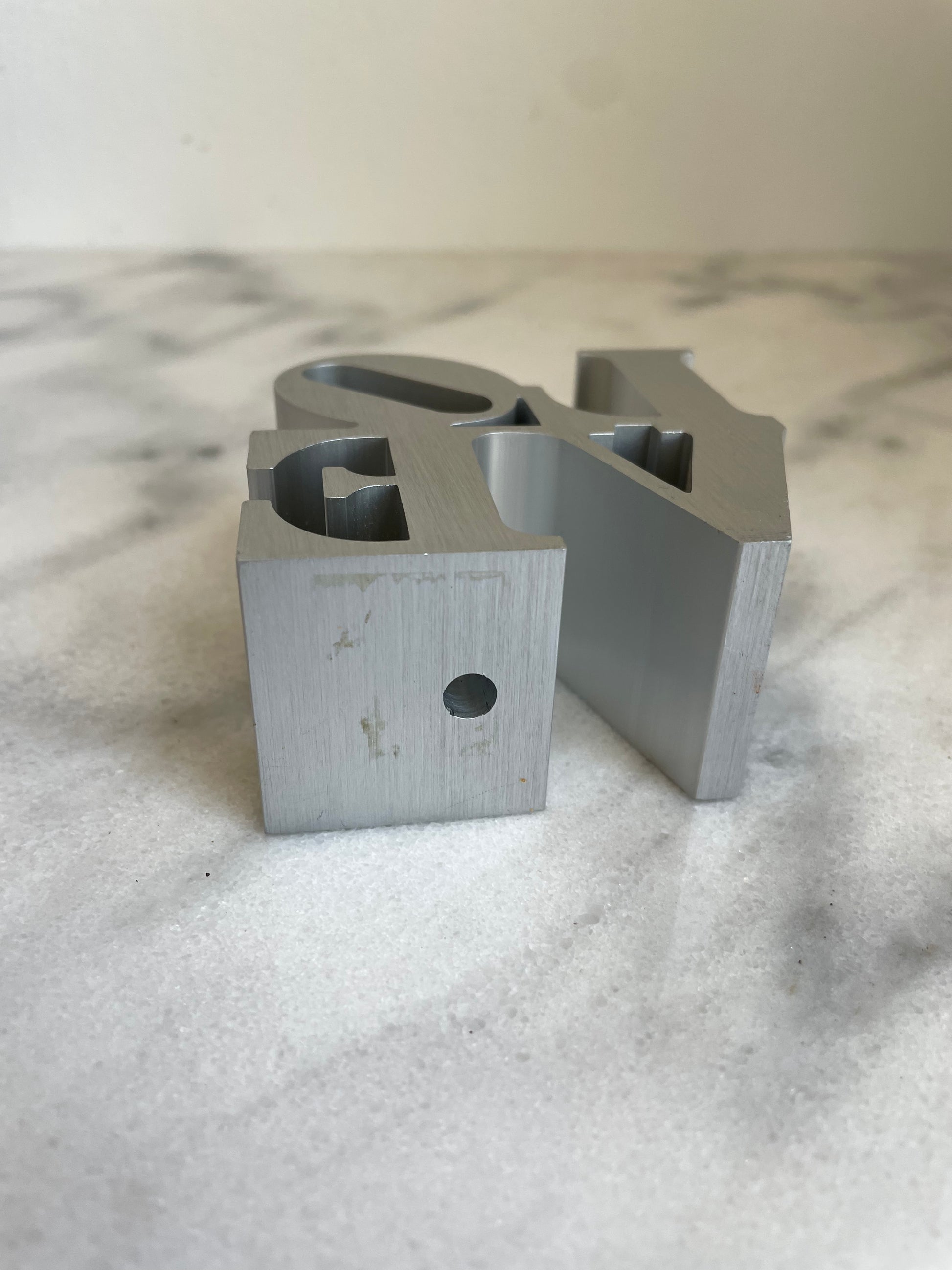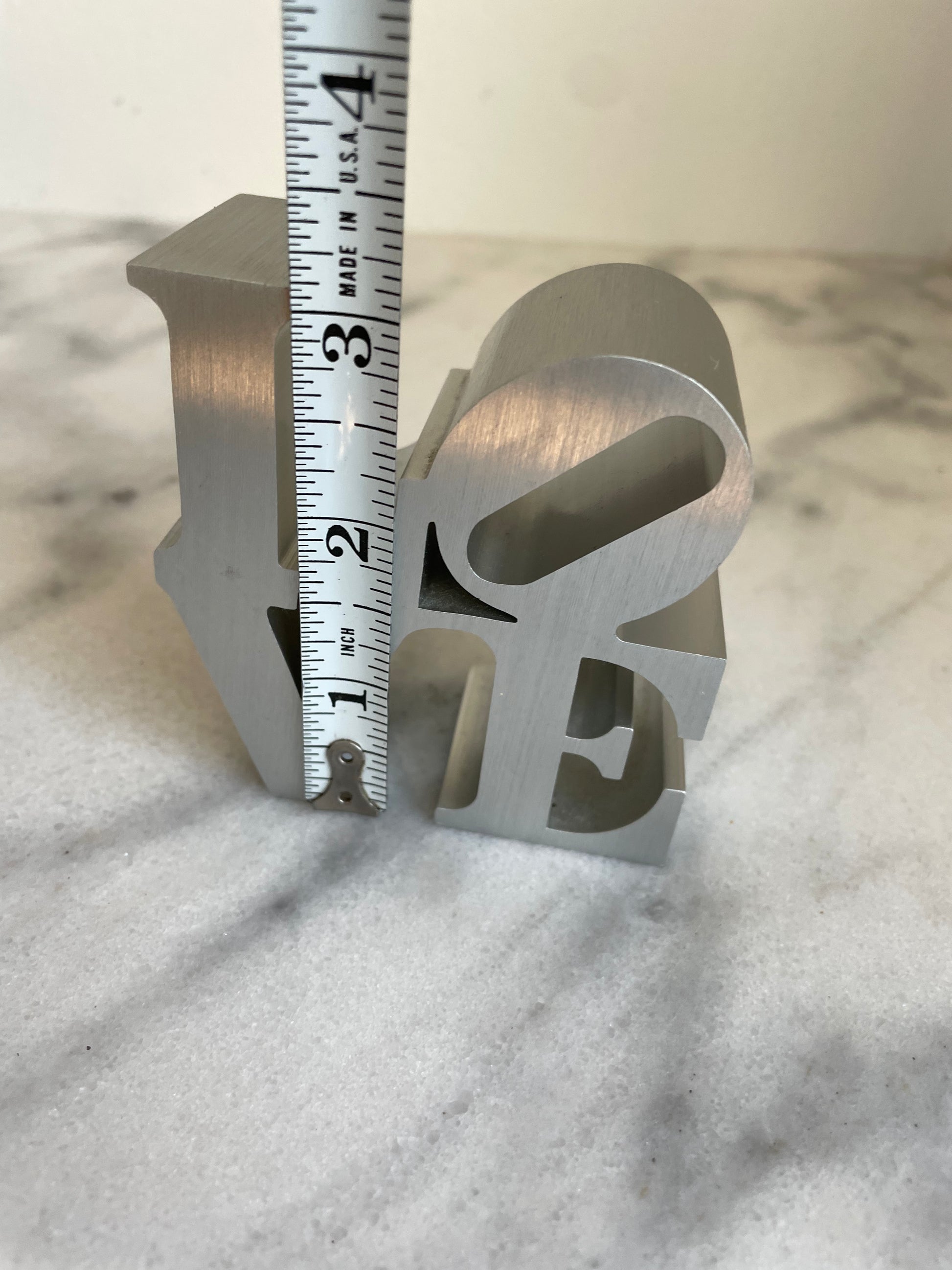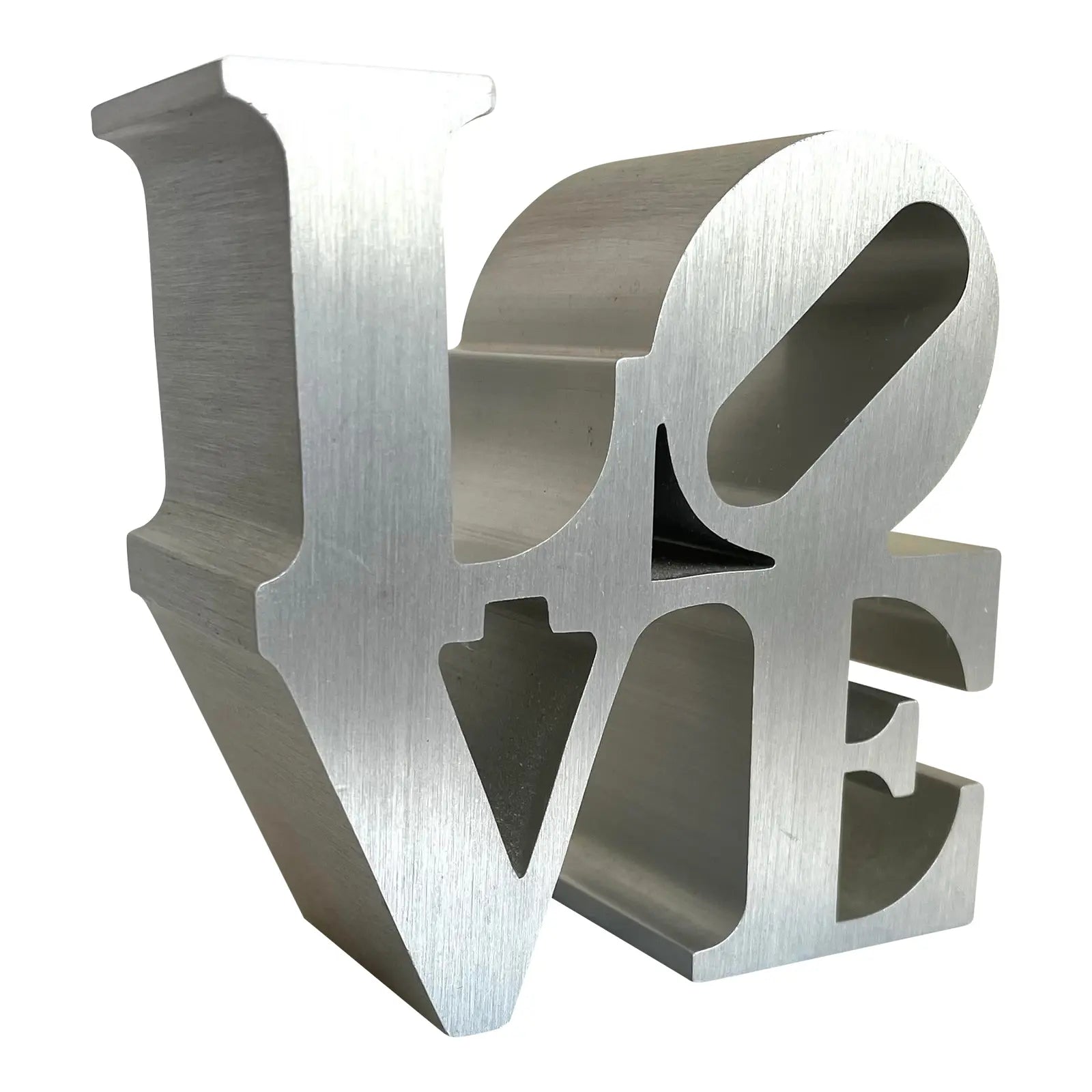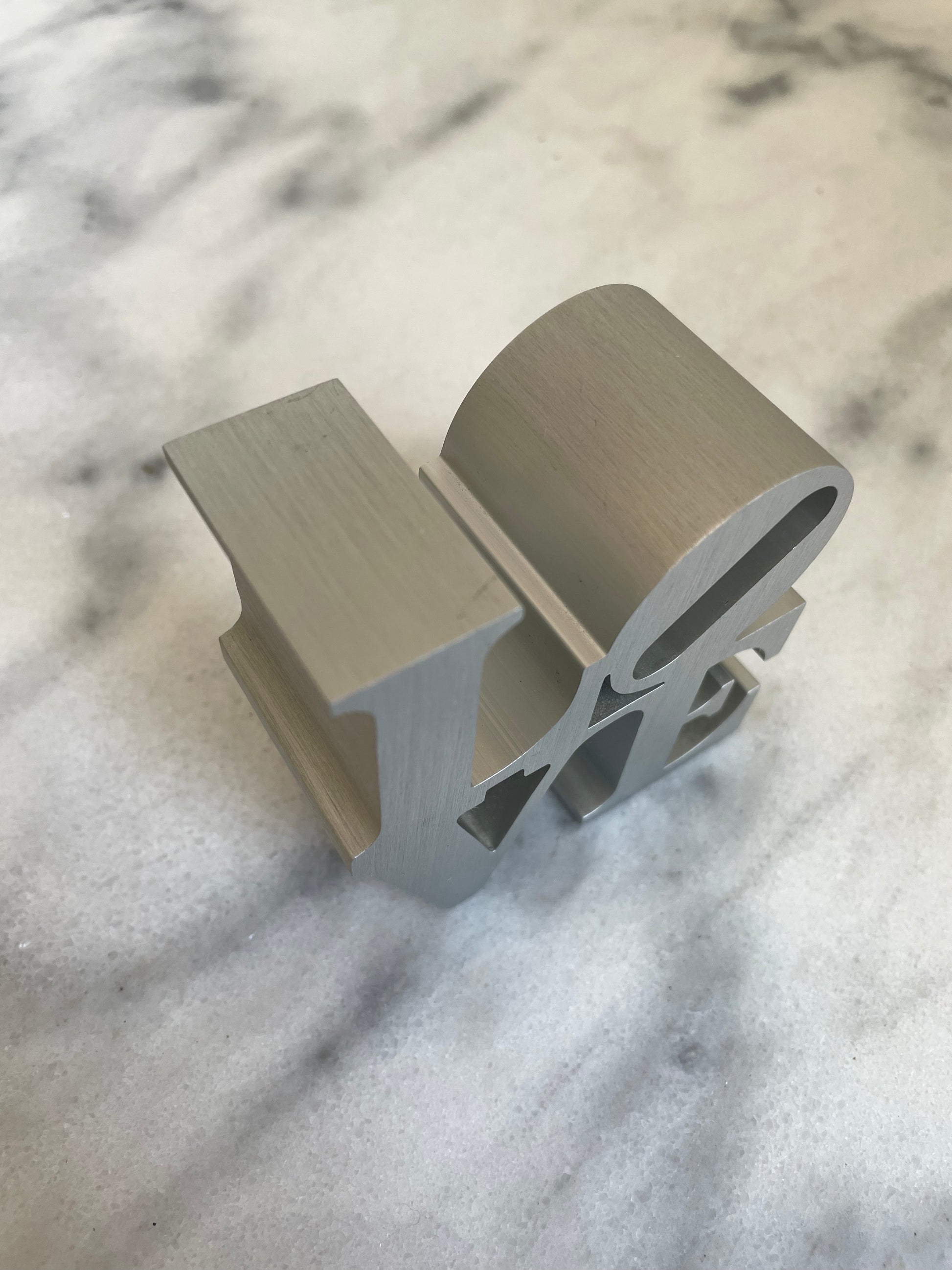 Iconic LOVE desk sculpture in machined aluminum - originally created by Robert Indiana (1928-2018) and sent to his friends in 1964 as cards…the following year, he submitted oil on canvas versions to the Museum of Modern Art where they became the museum’s most popular holiday card…sculpture versions began the year after, 1966.