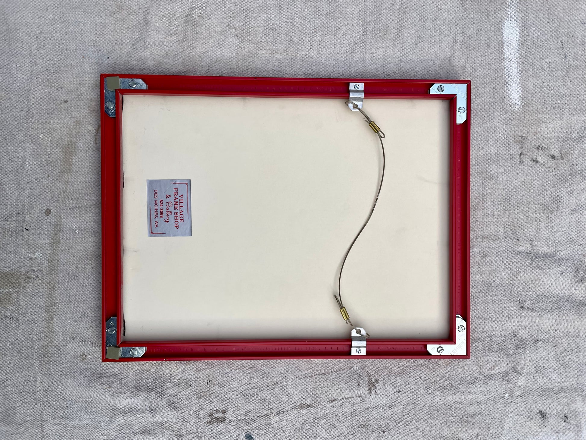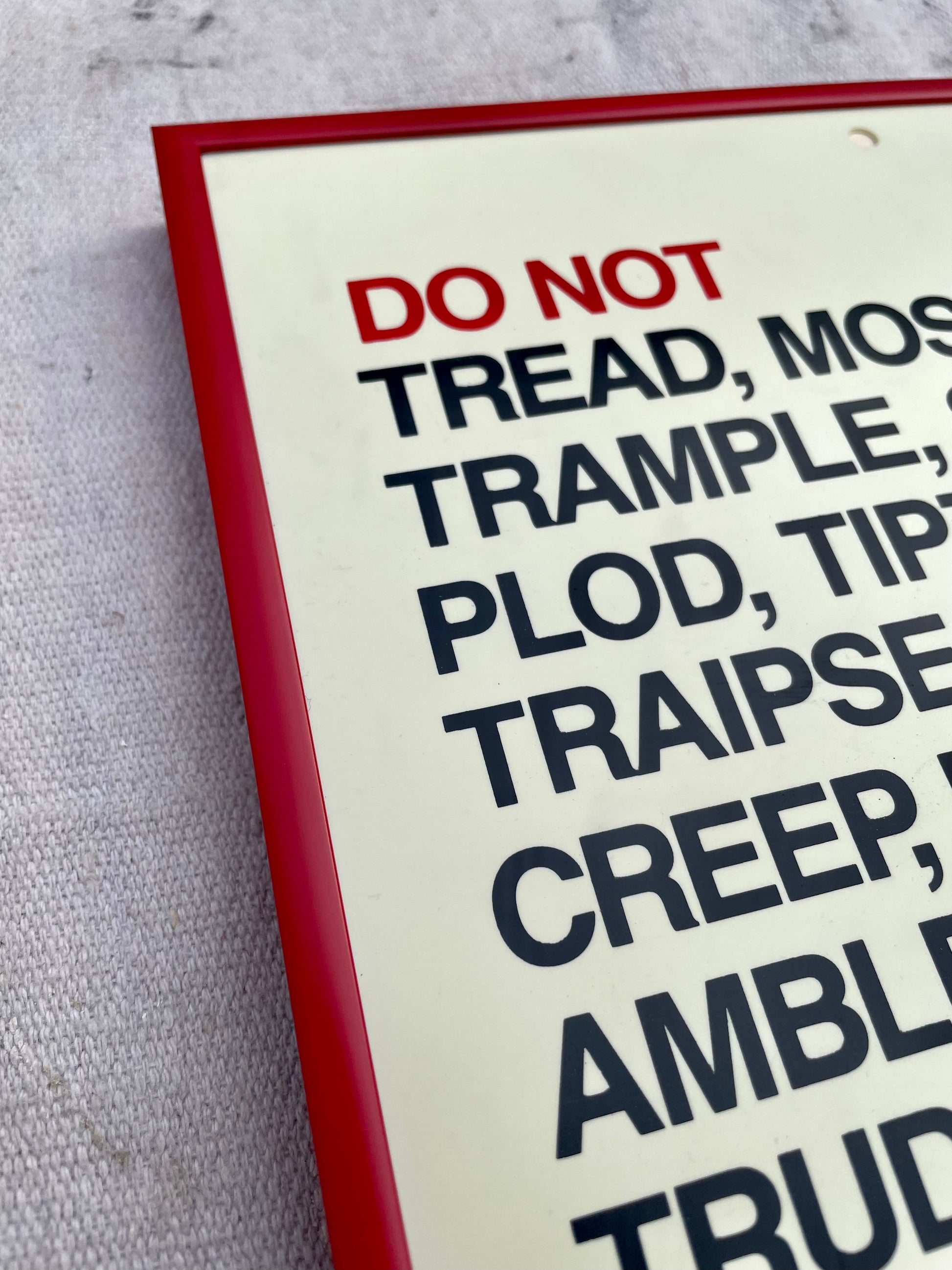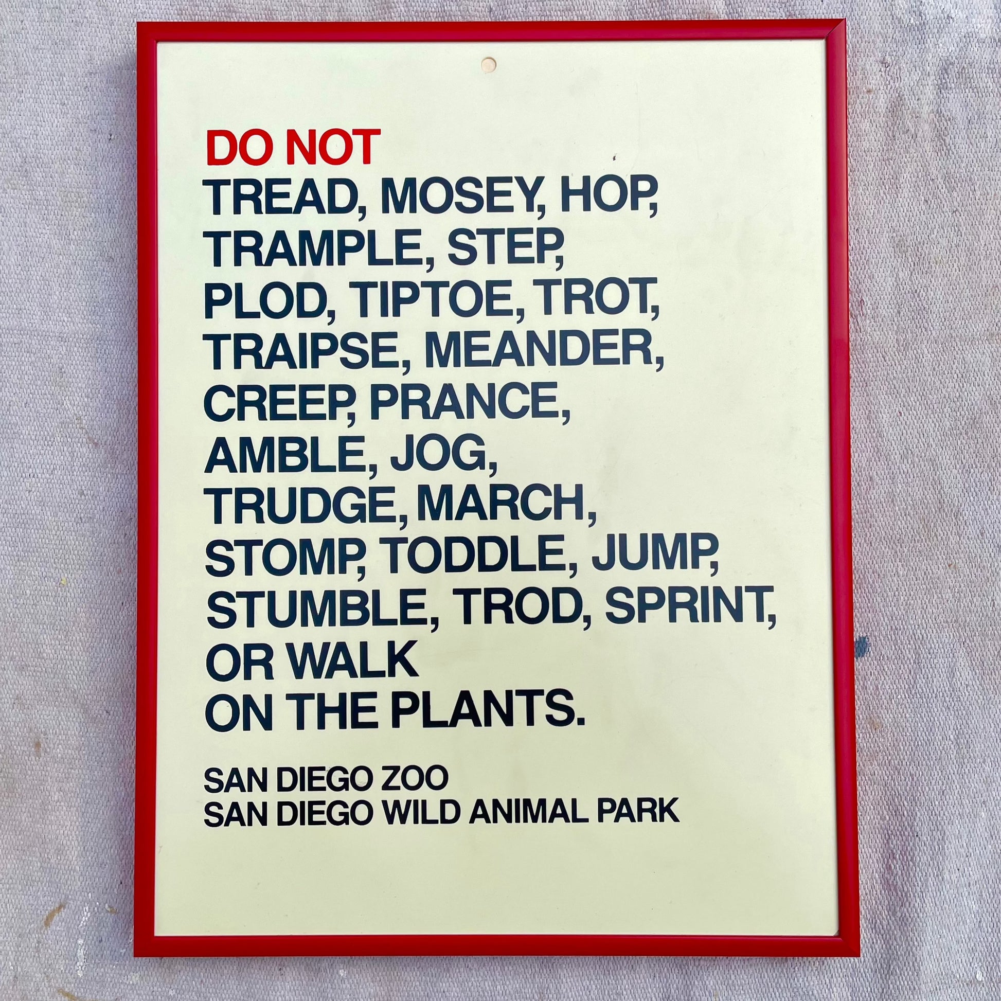 A fun vintage graphic San Diego Zoo & Wild Animal Park plant protection sign framed in a bright red metal frame that coordinates with the bold typography in the sign design.