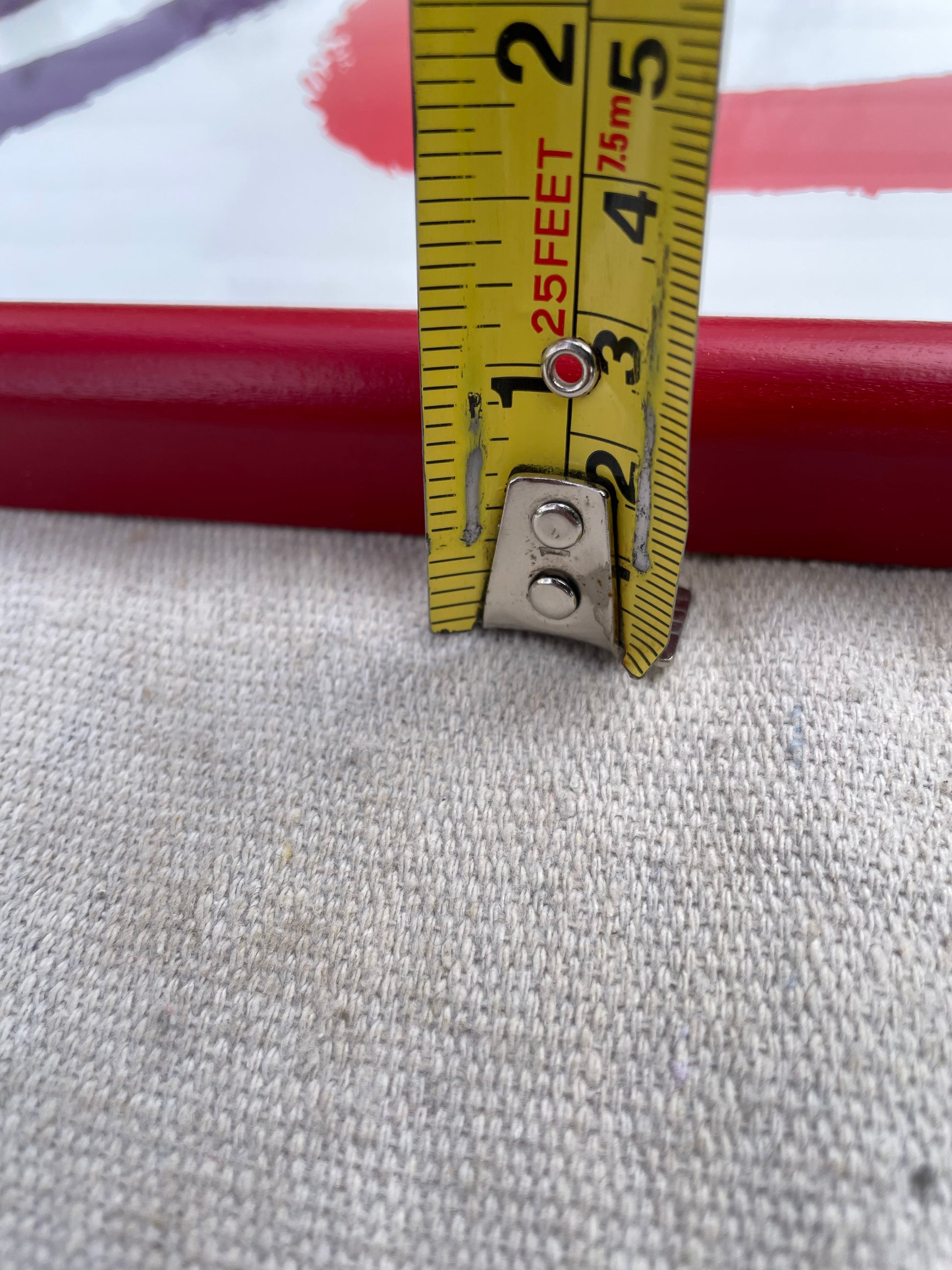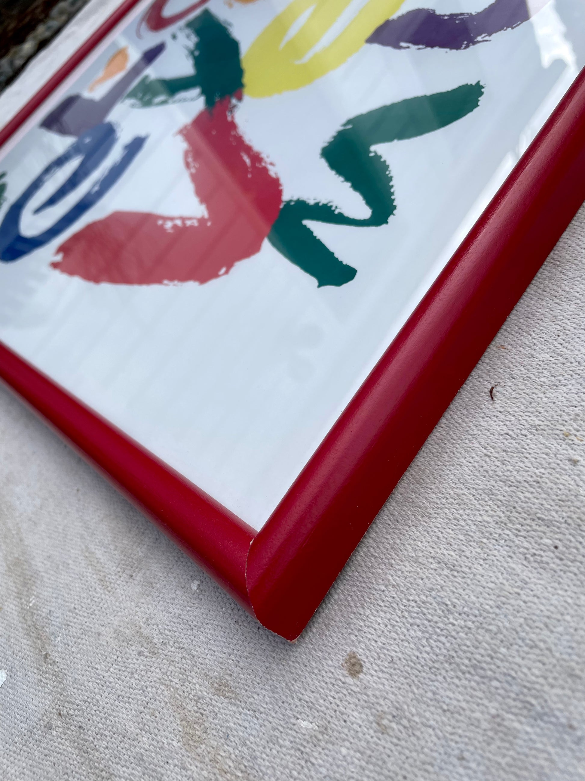 The condition of print and frame appears to be excellent. It has not been examined outside of the frame. No visible damage or discoloration. The frame is a bright red.