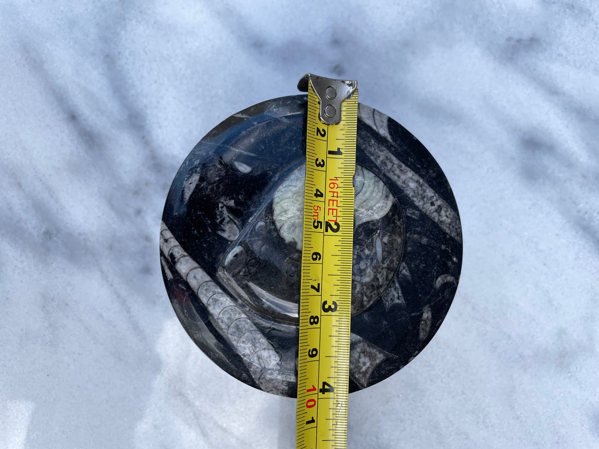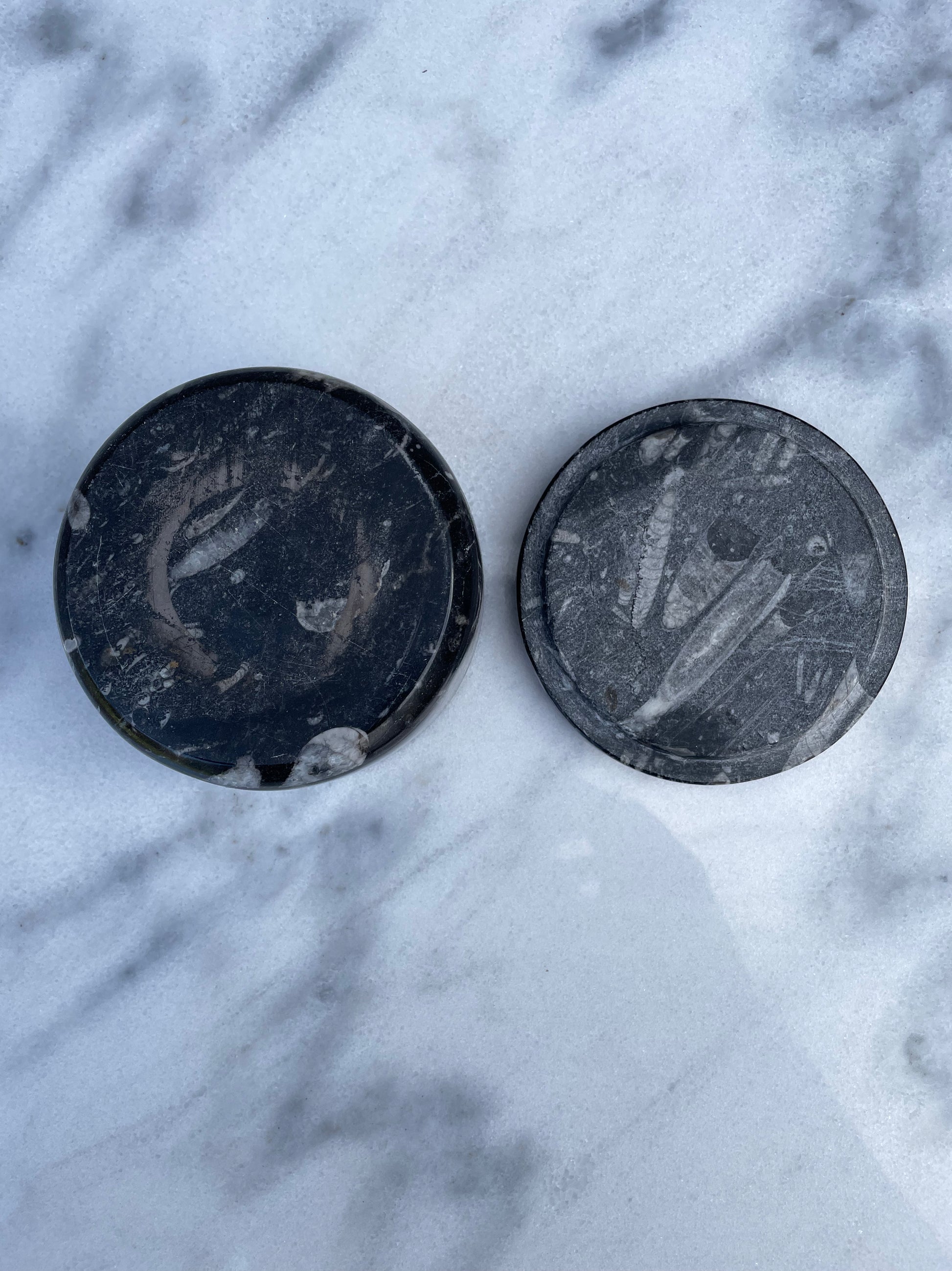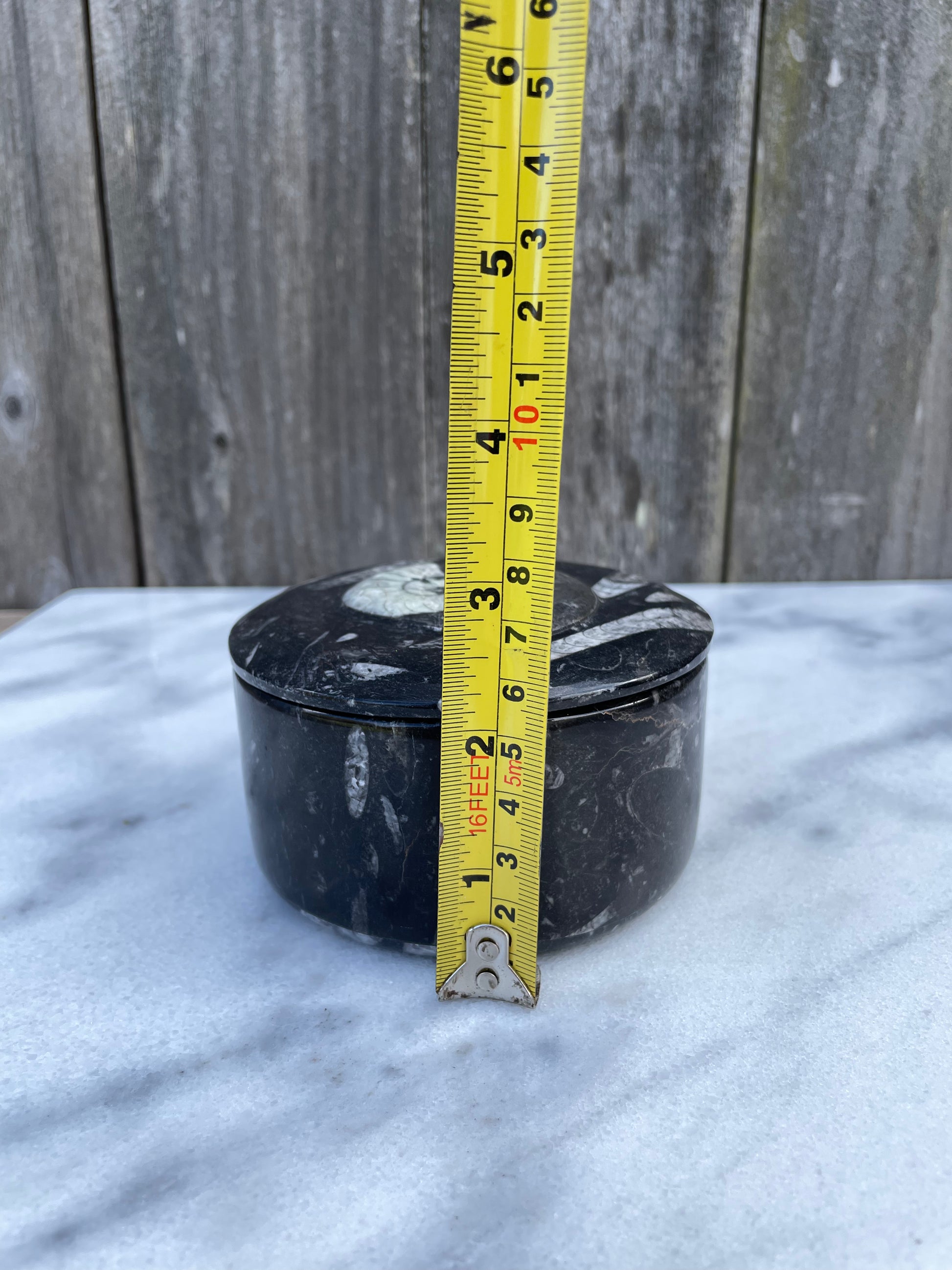 Beautifully crafted round box made of Fossil stone with three dimensional Ammonite (with Orthocerus in the stone) polished out on the lid.