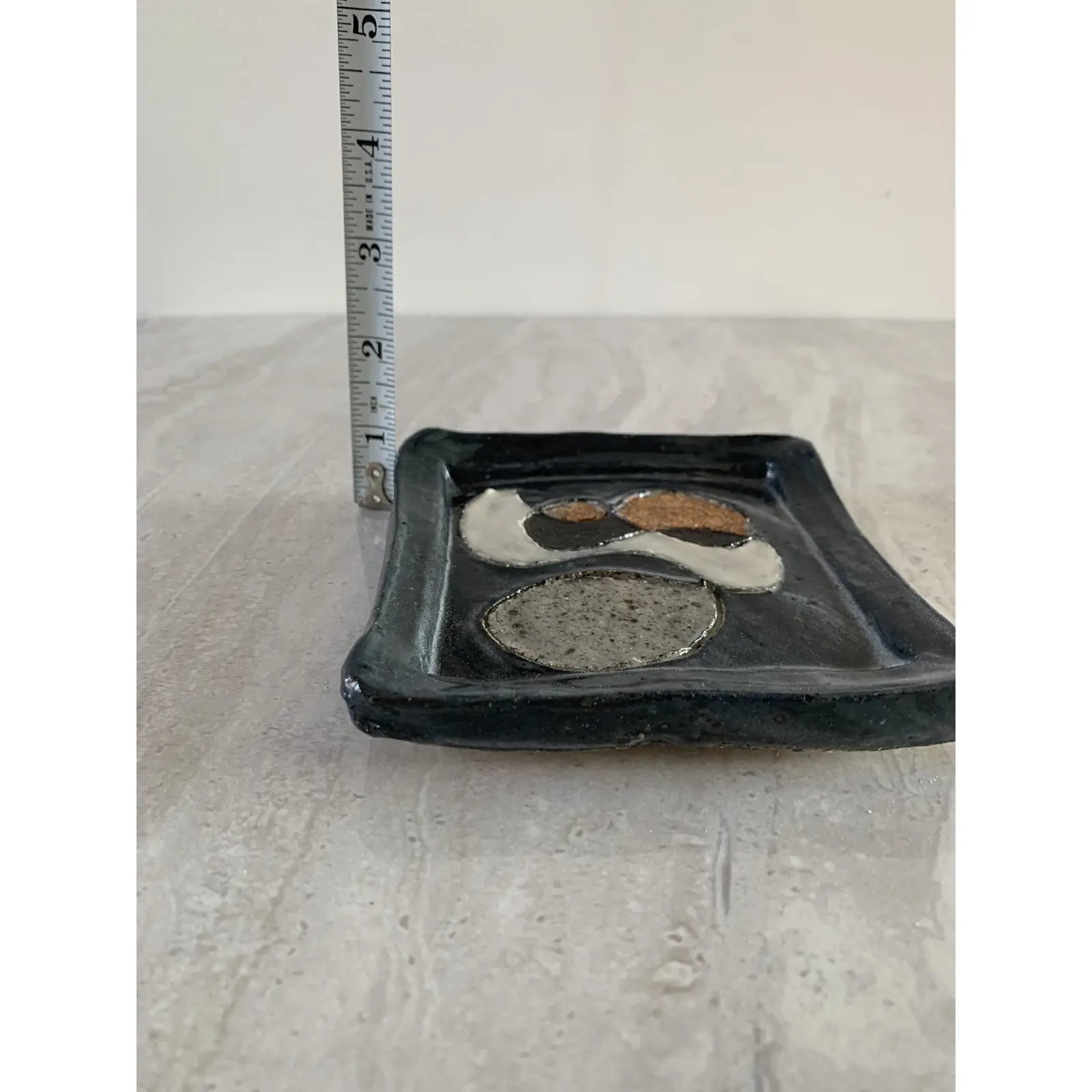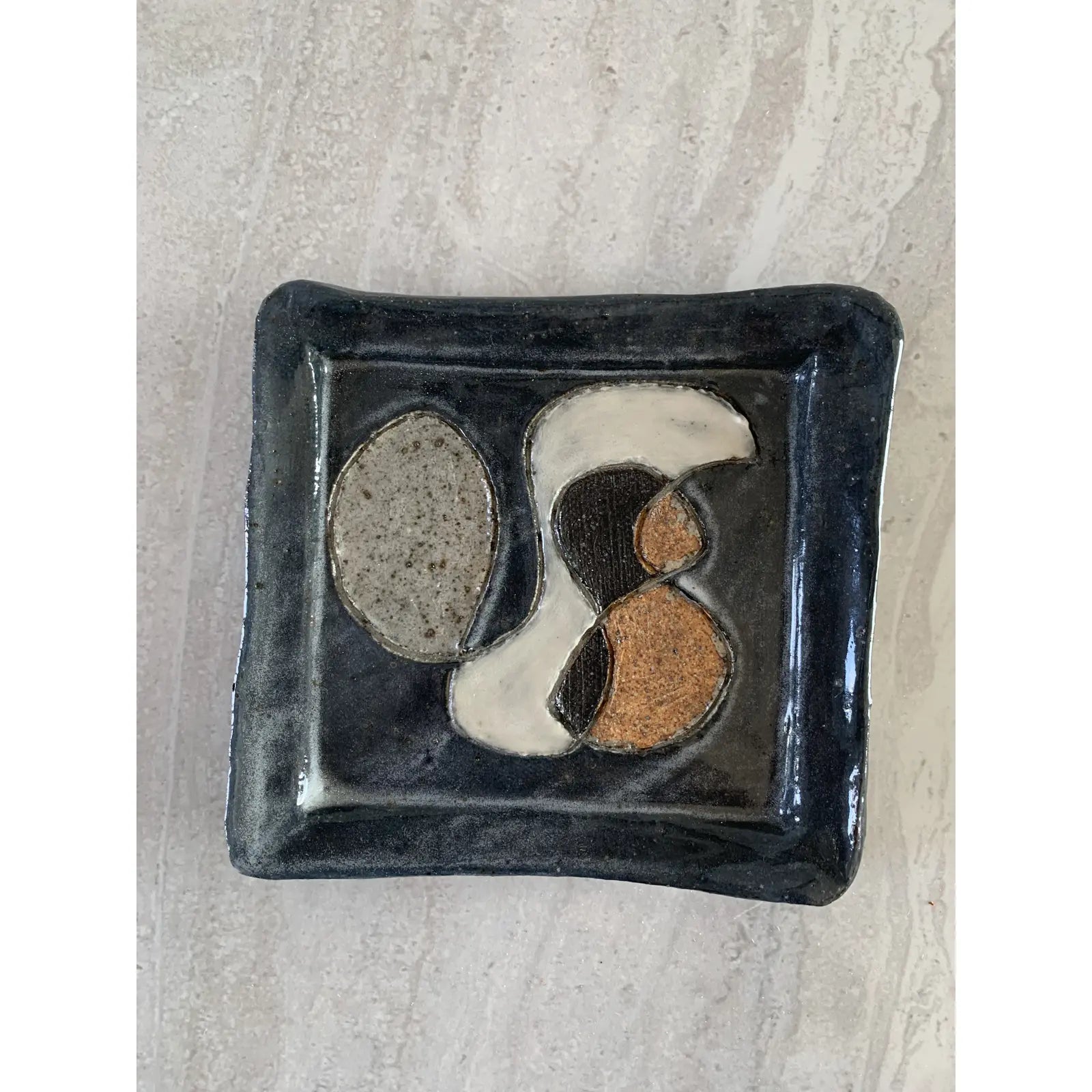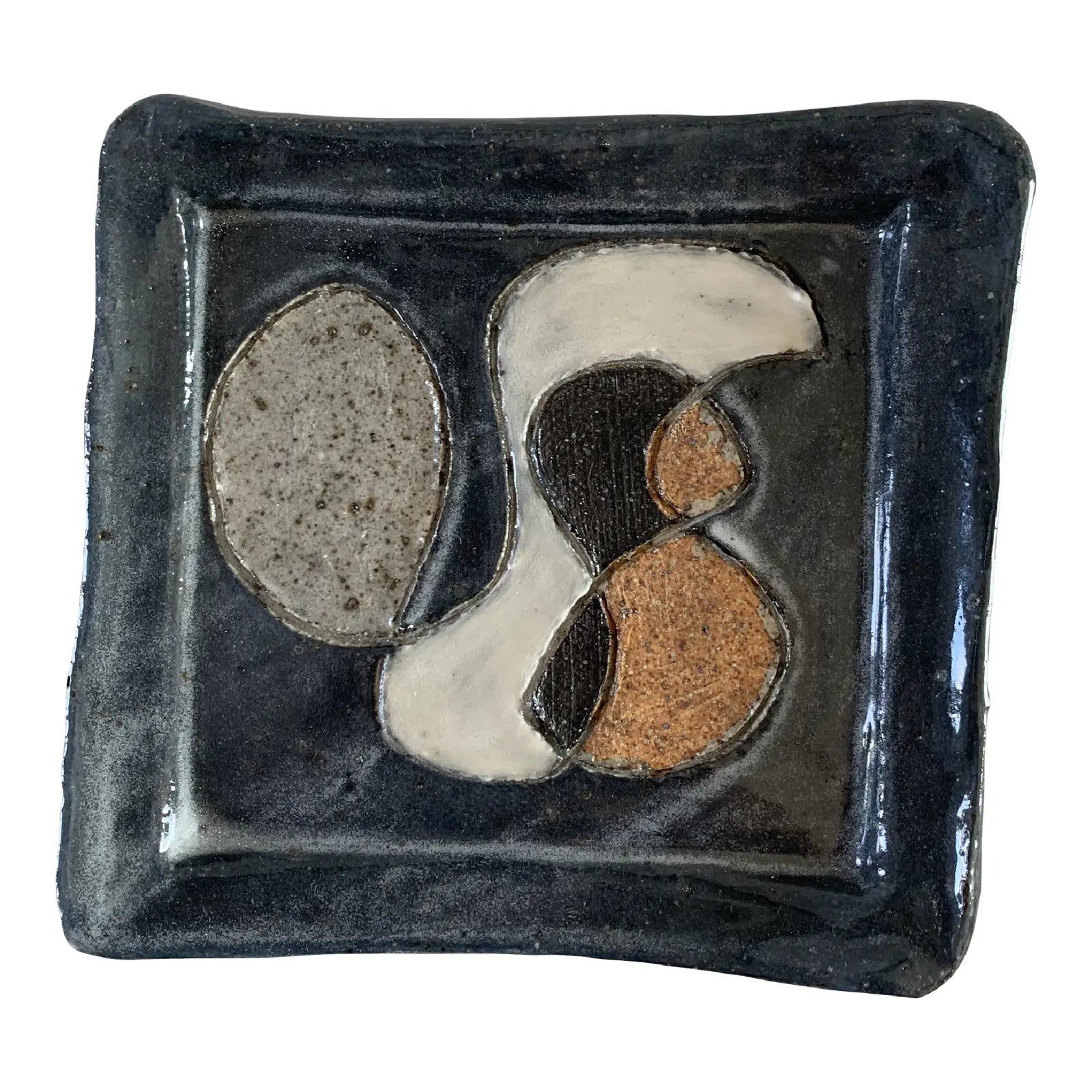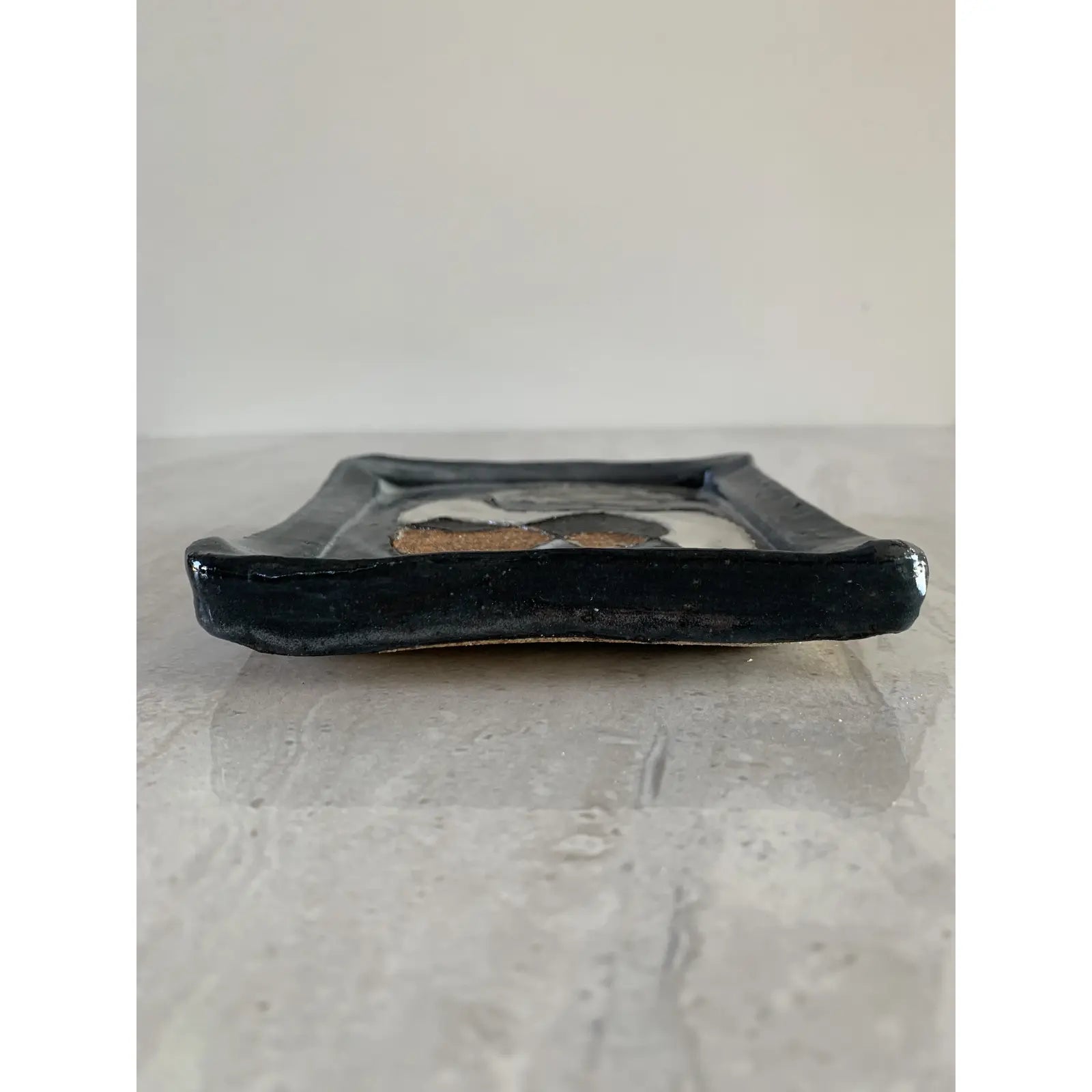 Stoneware ceramic tray dish with a monochromatic abstract flowing decoration with a mix of glazed and unglazed areas.