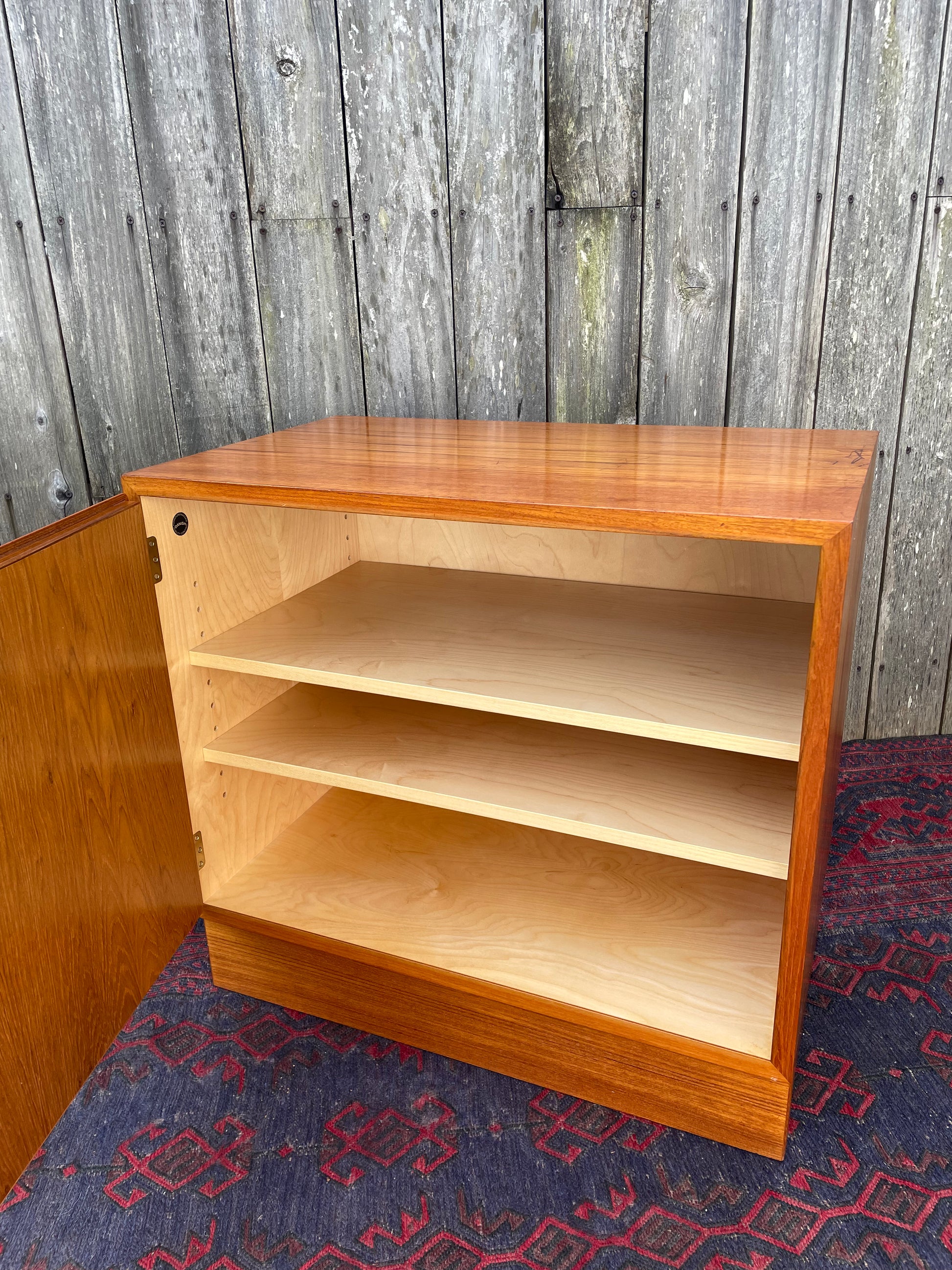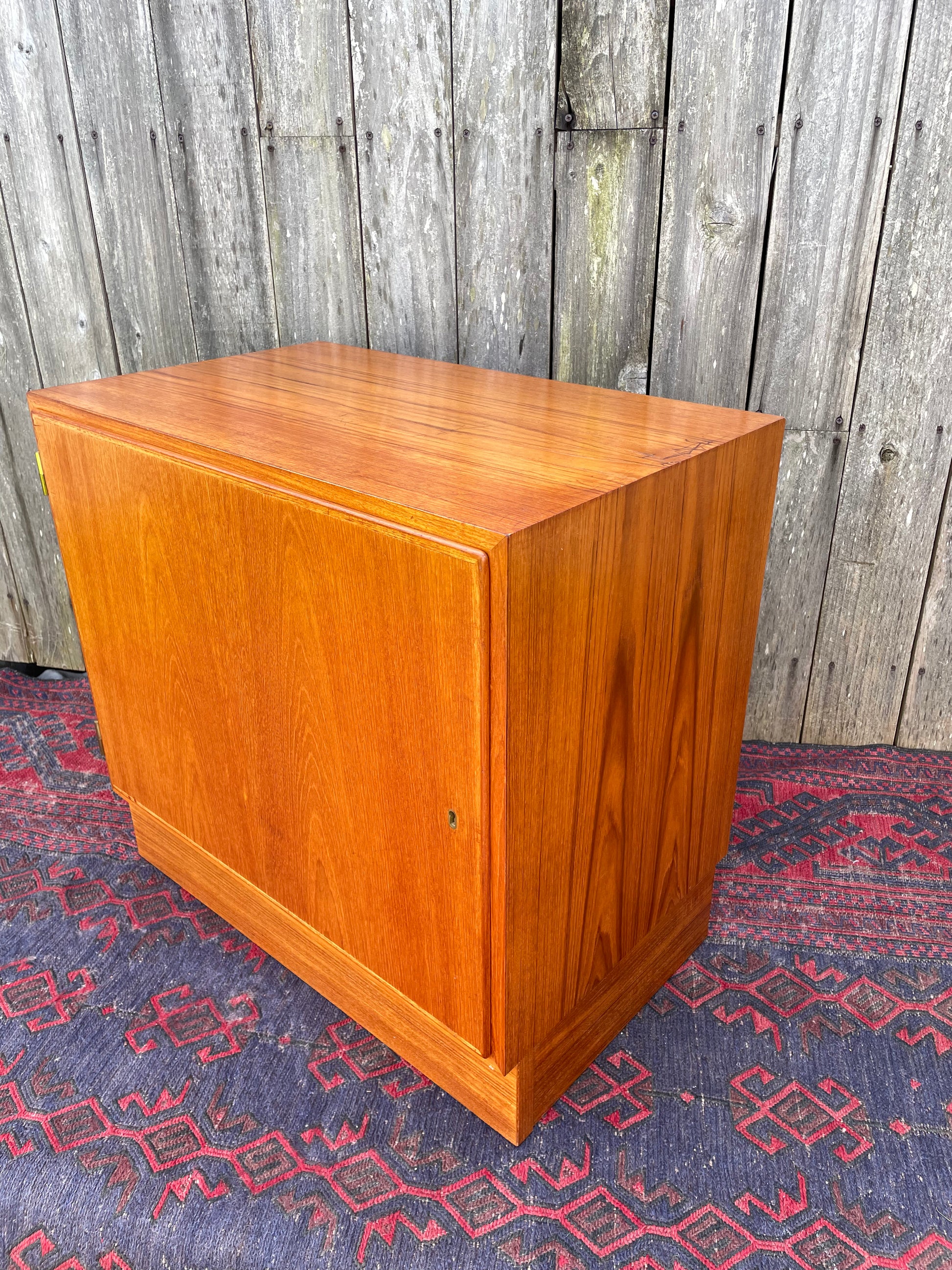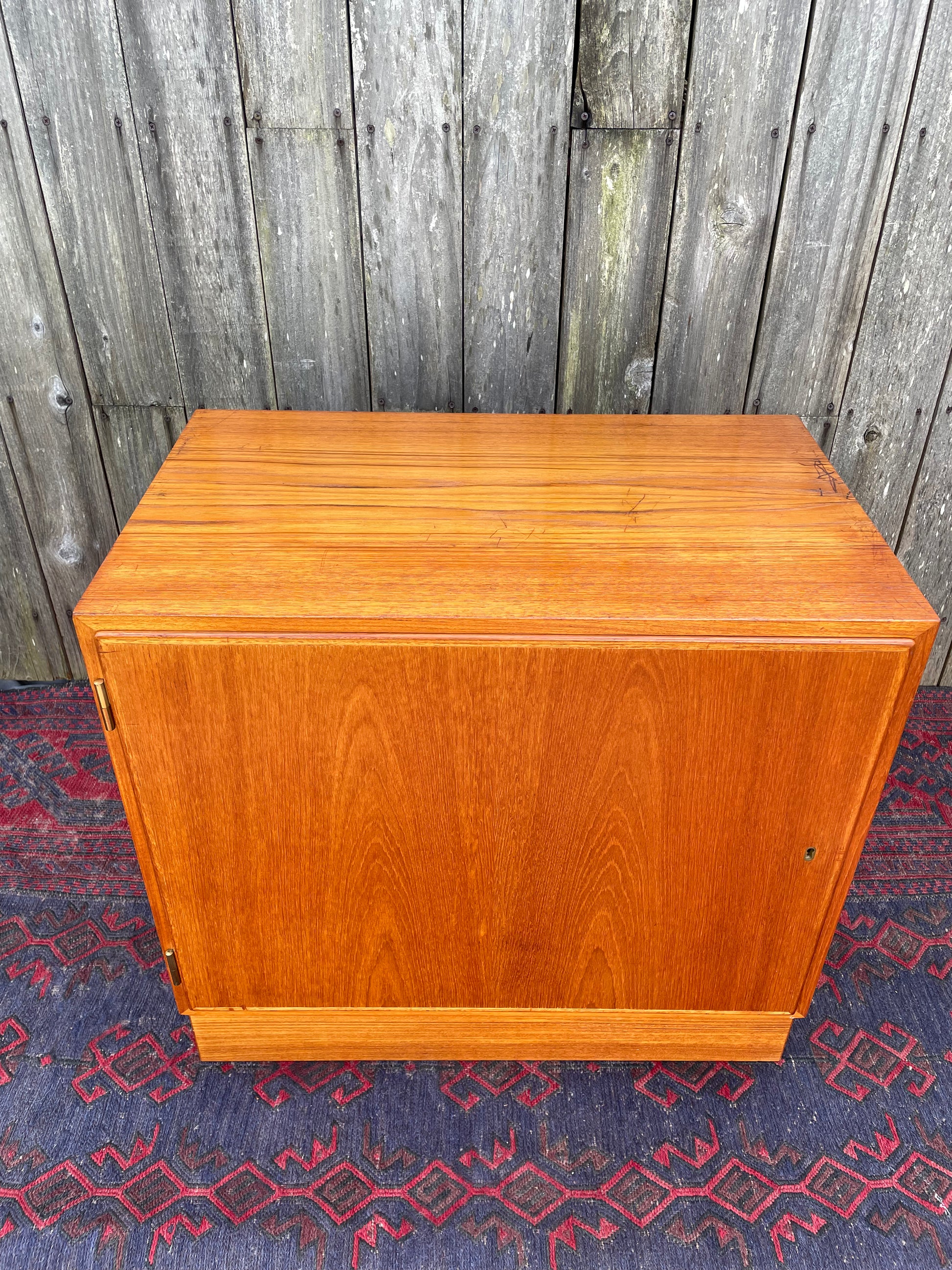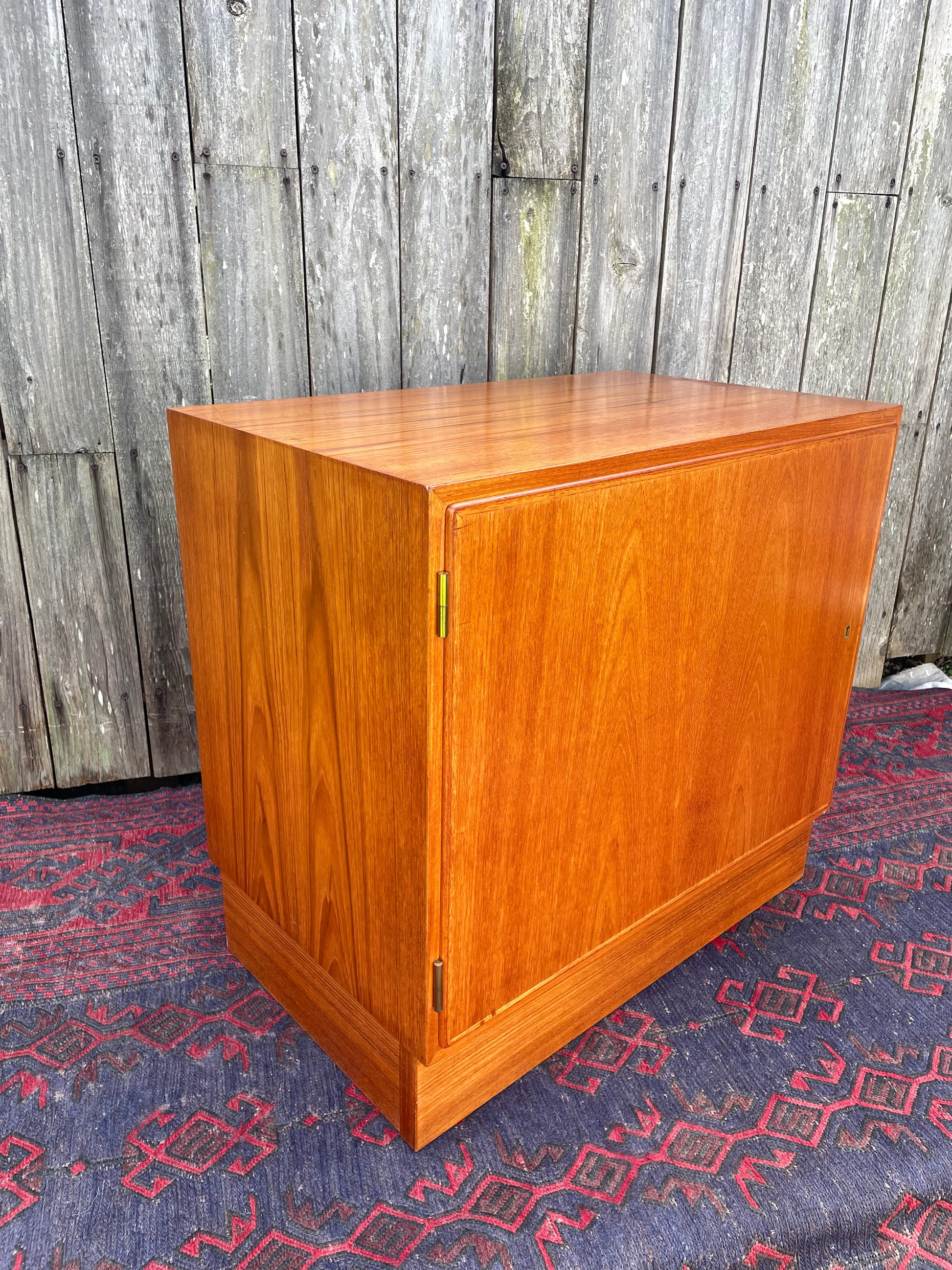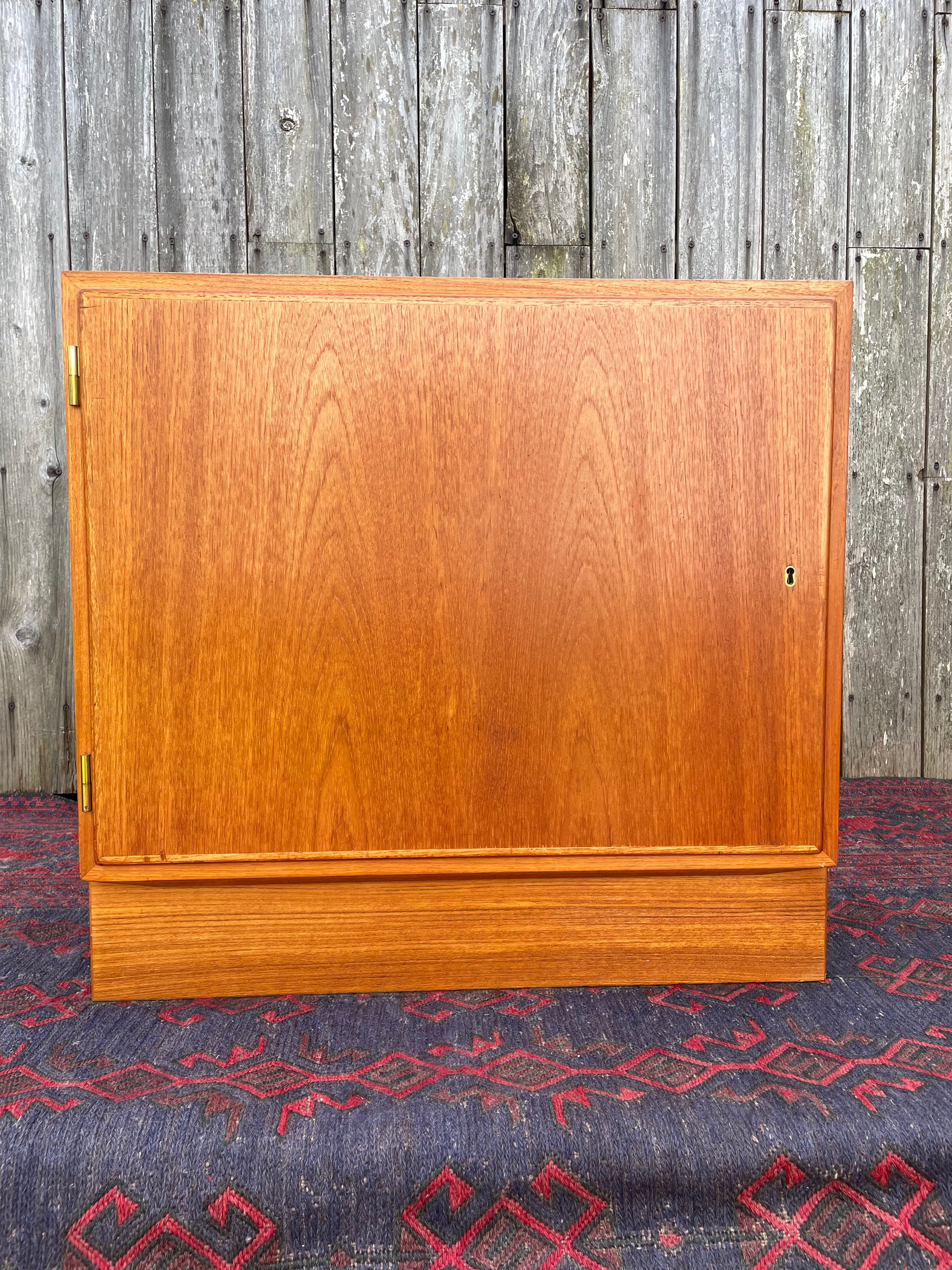 Vintage 1960's Carlo Jensen for Hundevad & Co teak square single door cabinet. Shelved adjustable interior all raised on a plinth base. Furniture Makers Quality Control sticker inside and applied stamp on the reverse of the cabinet.