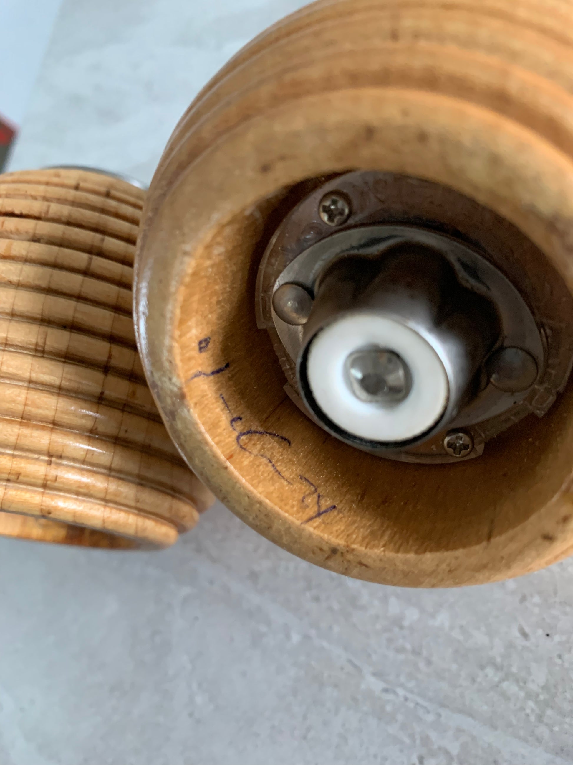A sweet handmade set, this vintage salt shaker and pepper grinder set features a ribbed beehive sphere design with a chrome detailing. The pieces are marked with the date on the bottom.
