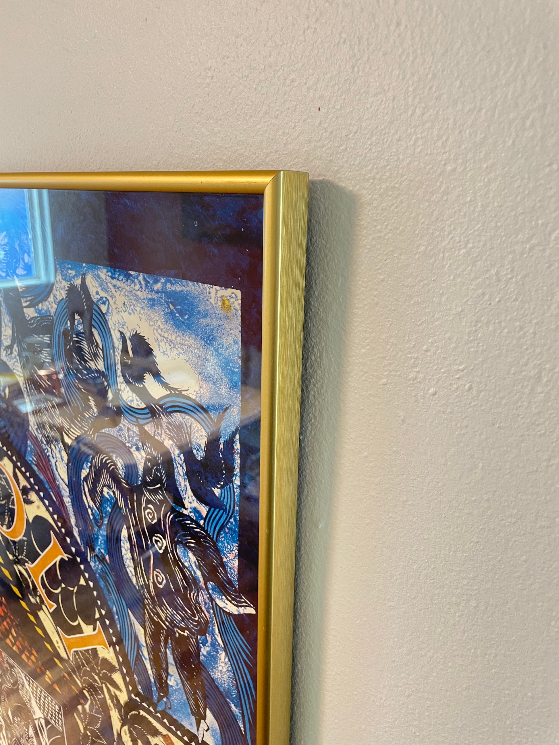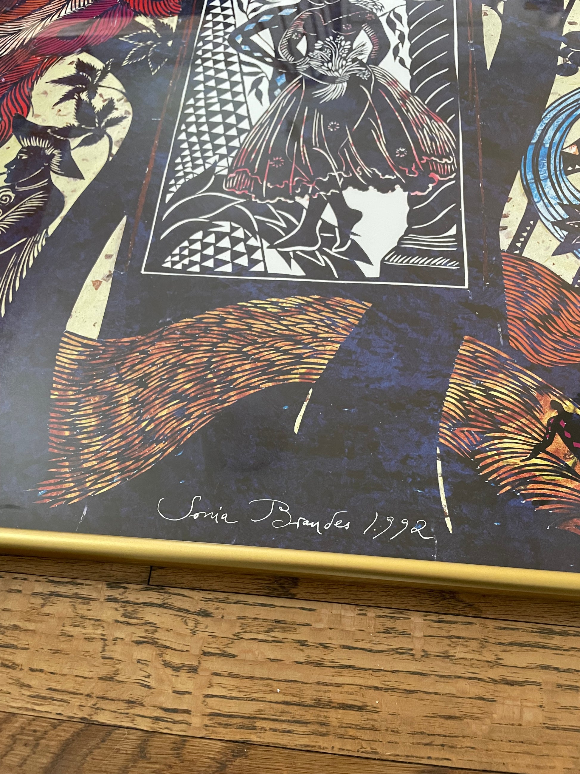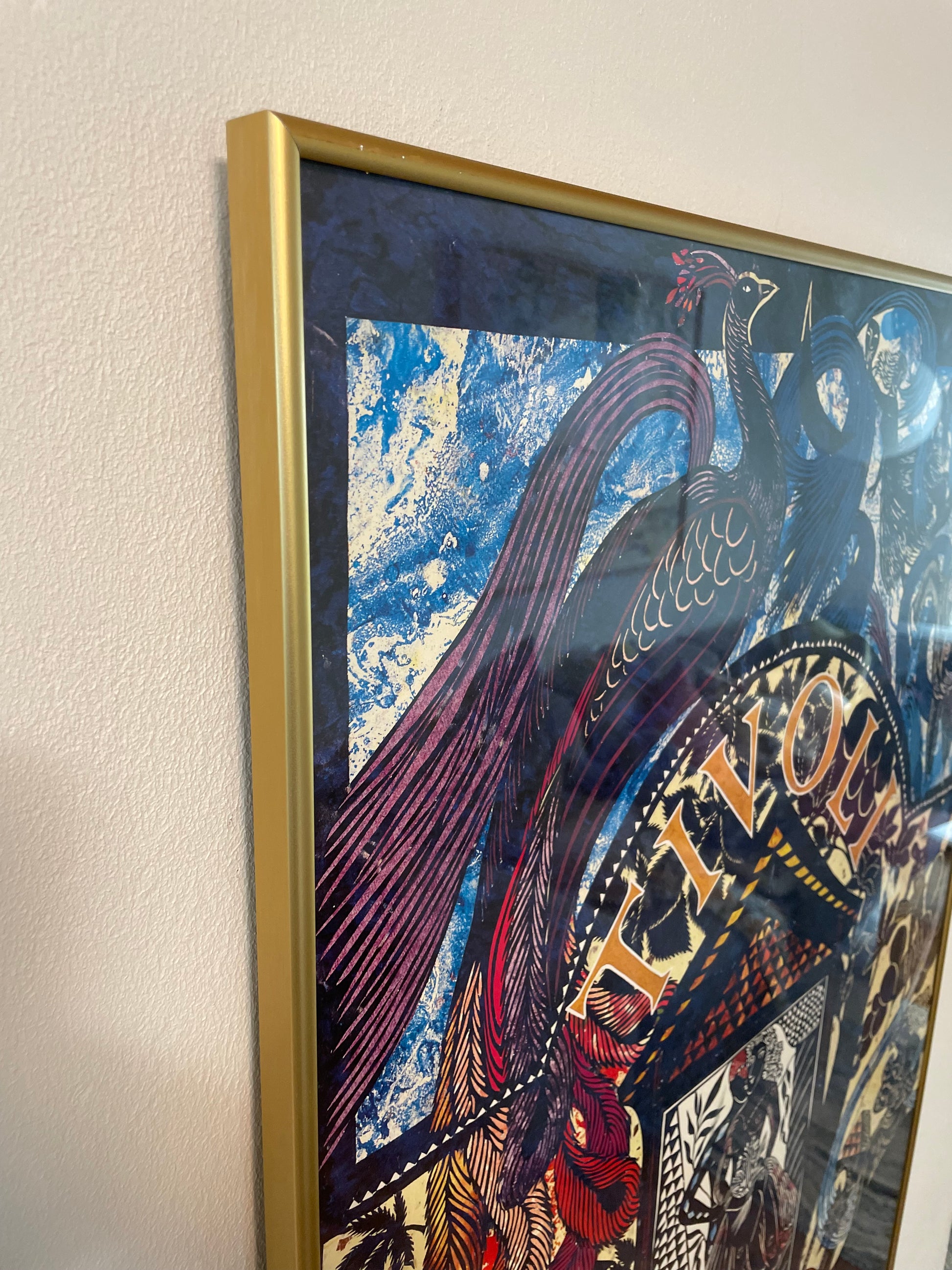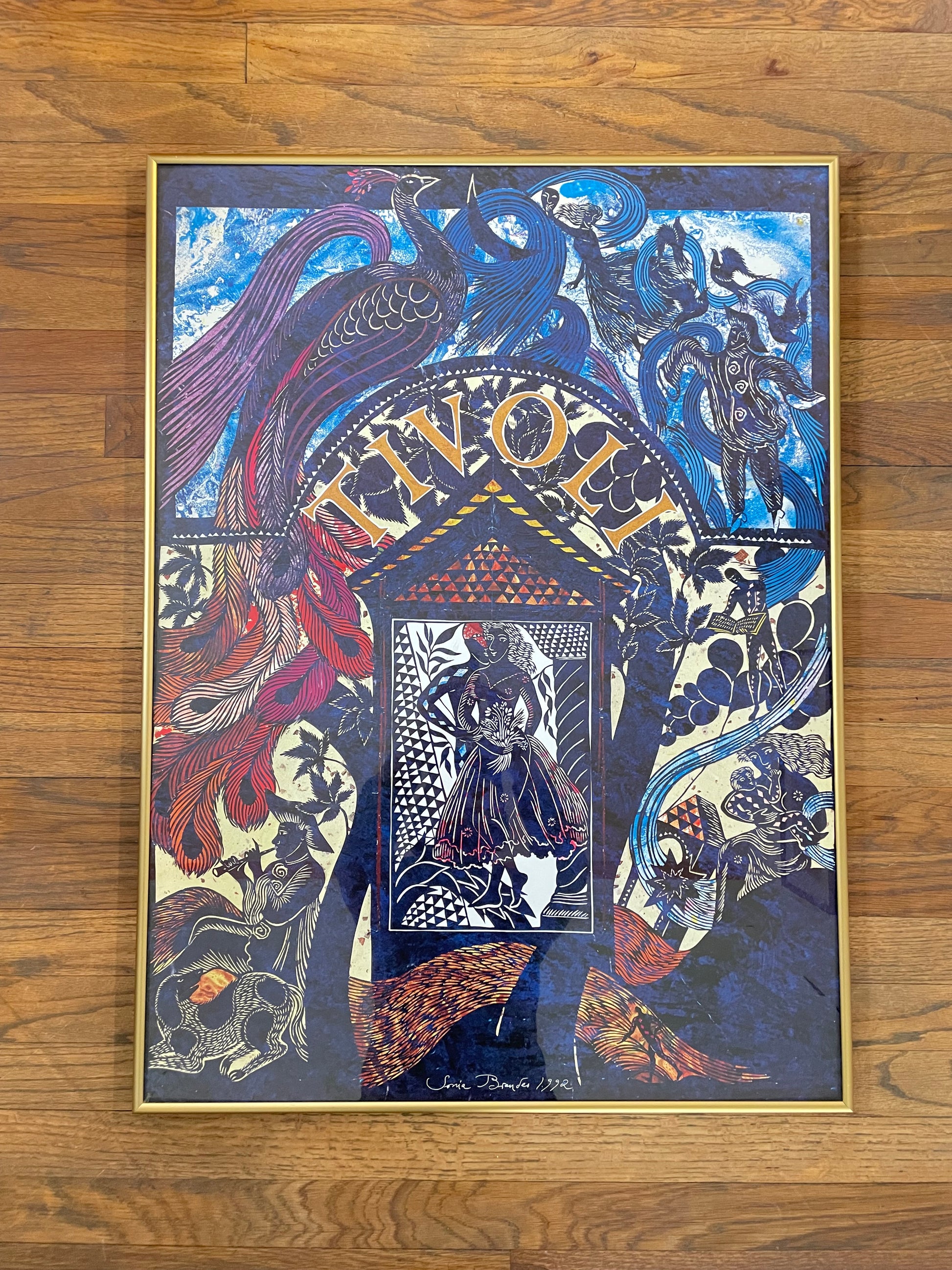 Rich mysterious and colorful representation of the Tivoli Gardens in Copenhagen, Old Town “pleasure garden”, Denmark. Opened almost 200 years ago this beautiful piece of artwork visualizes the fairy tales and magic of the Tivoli Park. You have the striking peacock and birds flying in on the top of the image and further down you find Pjerrot (the strange hat man) - a mysterious figure which dates back 4000 years. Every year Tivoli Gardens (or simply Tivoli) lets a Danish artist design the poster art for the coming season. The art for the poster of 1992 was created by Sonja Brandes. Colorful and compelling this brass framed poster is an excellent whimsical foray into the sensations of the gardens.