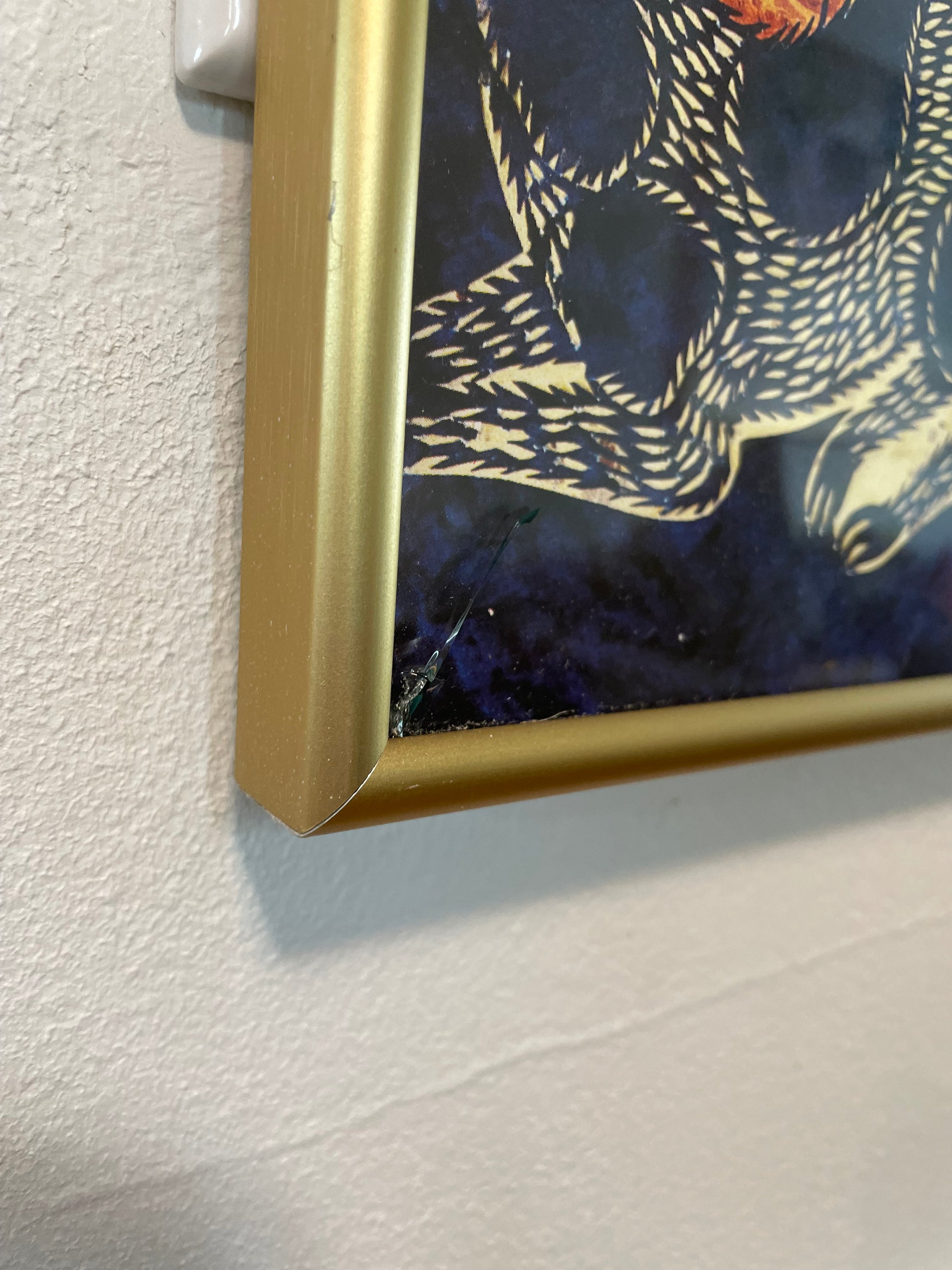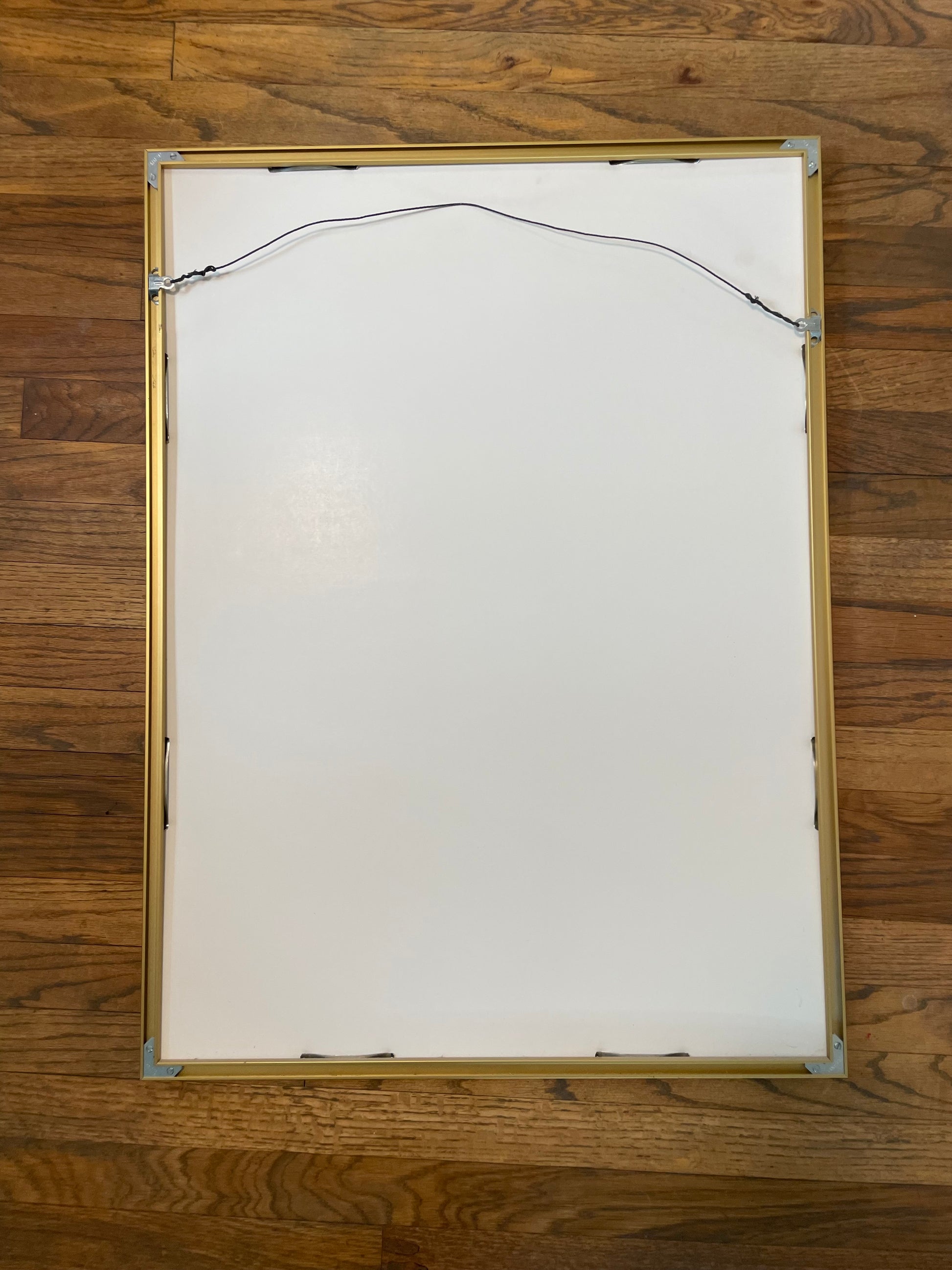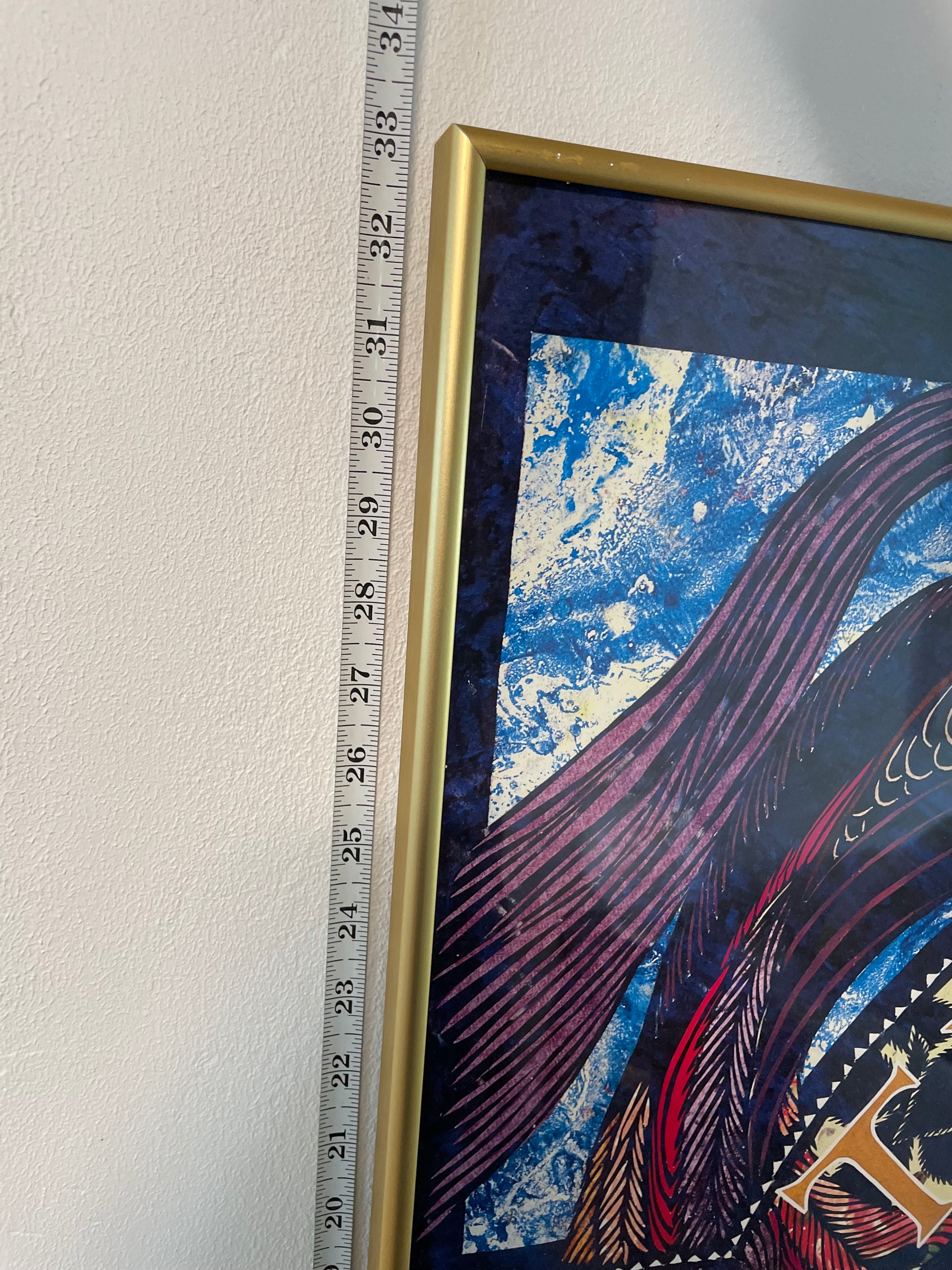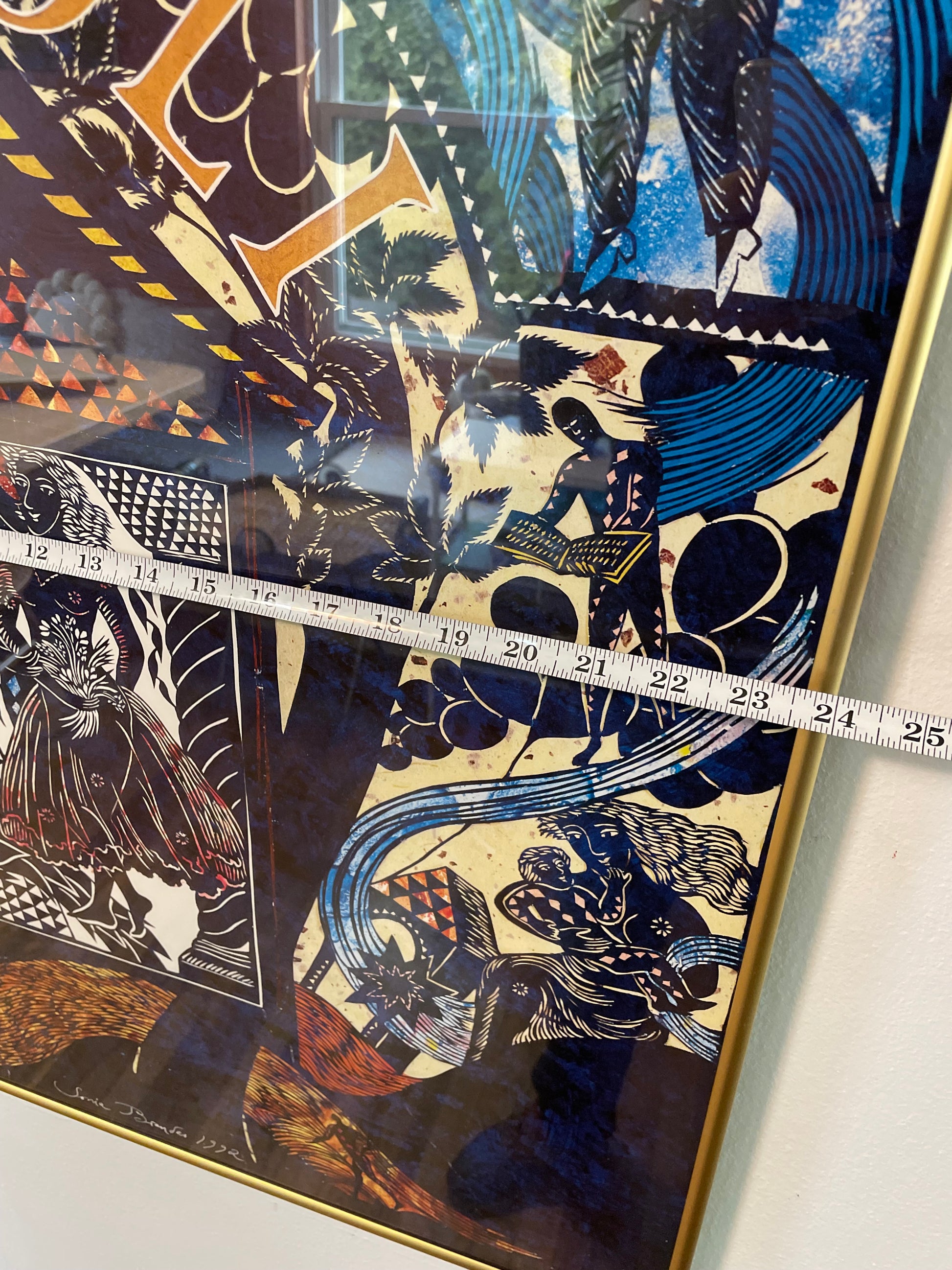 Rich mysterious and colorful representation of the Tivoli Gardens in Copenhagen, Old Town “pleasure garden”, Denmark. Opened almost 200 years ago this beautiful piece of artwork visualizes the fairy tales and magic of the Tivoli Park. You have the striking peacock and birds flying in on the top of the image and further down you find Pjerrot (the strange hat man) - a mysterious figure which dates back 4000 years. Every year Tivoli Gardens (or simply Tivoli) lets a Danish artist design the poster art for the coming season. The art for the poster of 1992 was created by Sonja Brandes. Colorful and compelling this brass framed poster is an excellent whimsical foray into the sensations of the gardens.