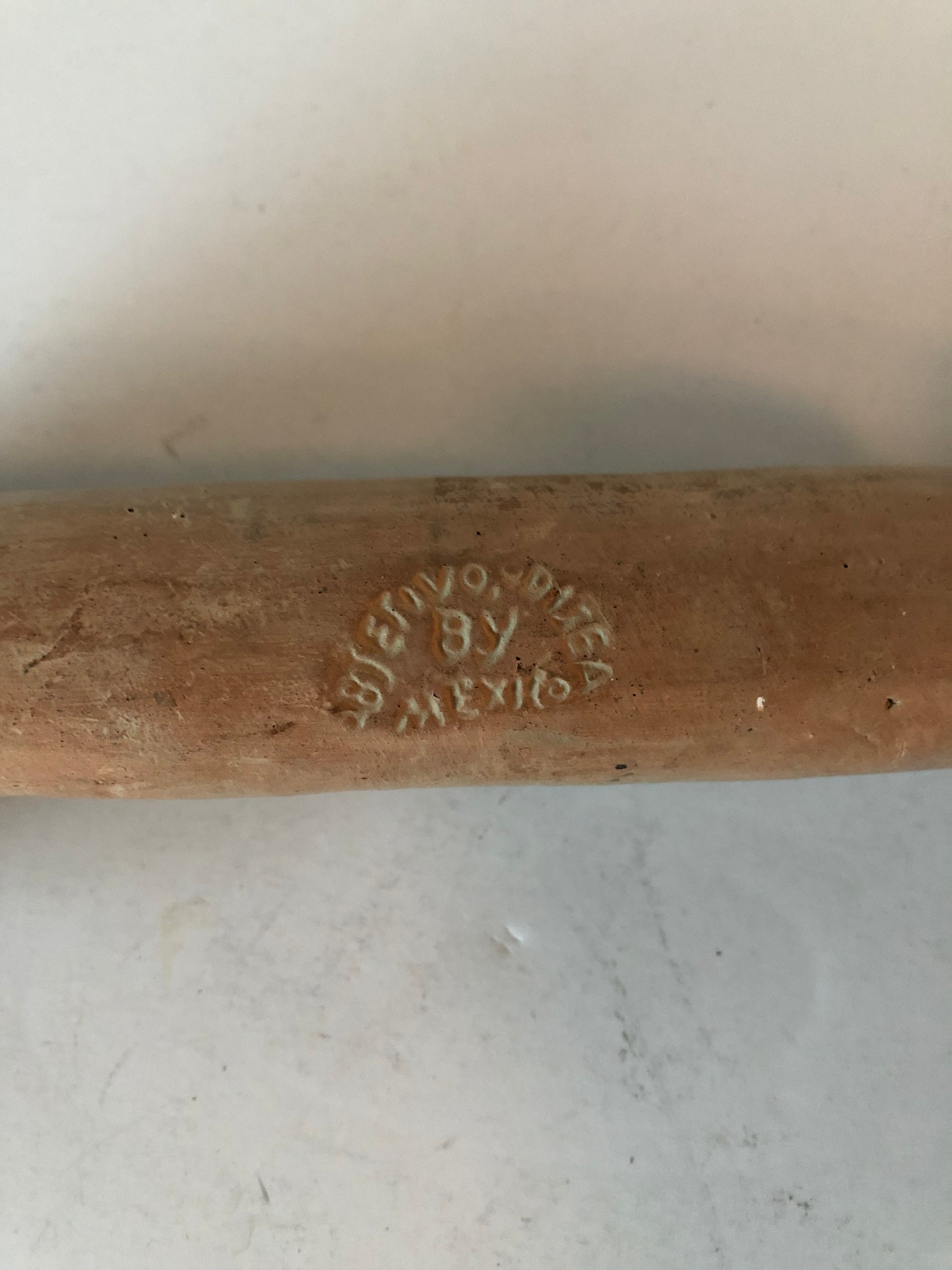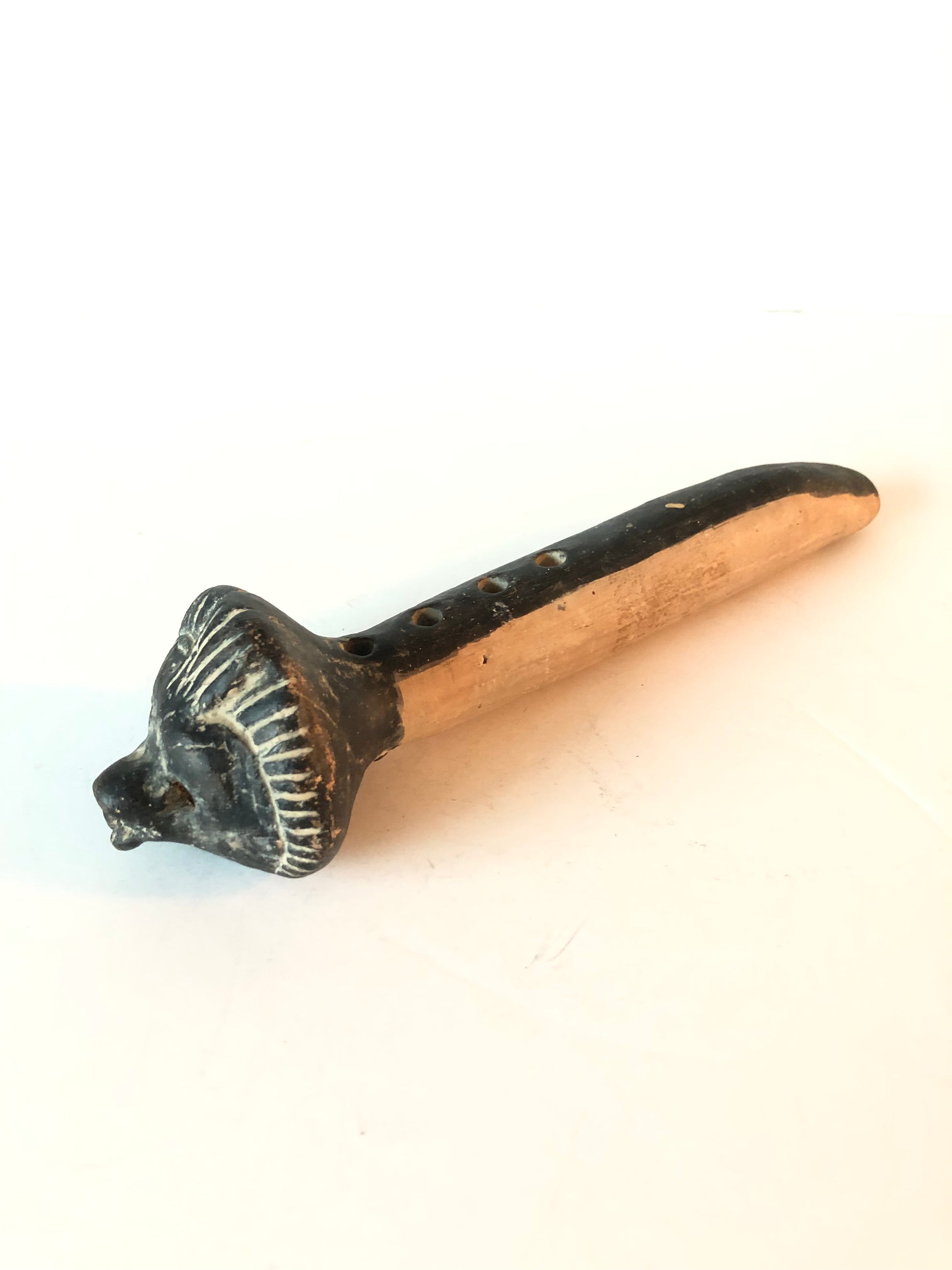 A vintage clay flute from Mexico. The flute features black and white colored clay with an animal face and headdress decoration at the front. Marked on the bottom.