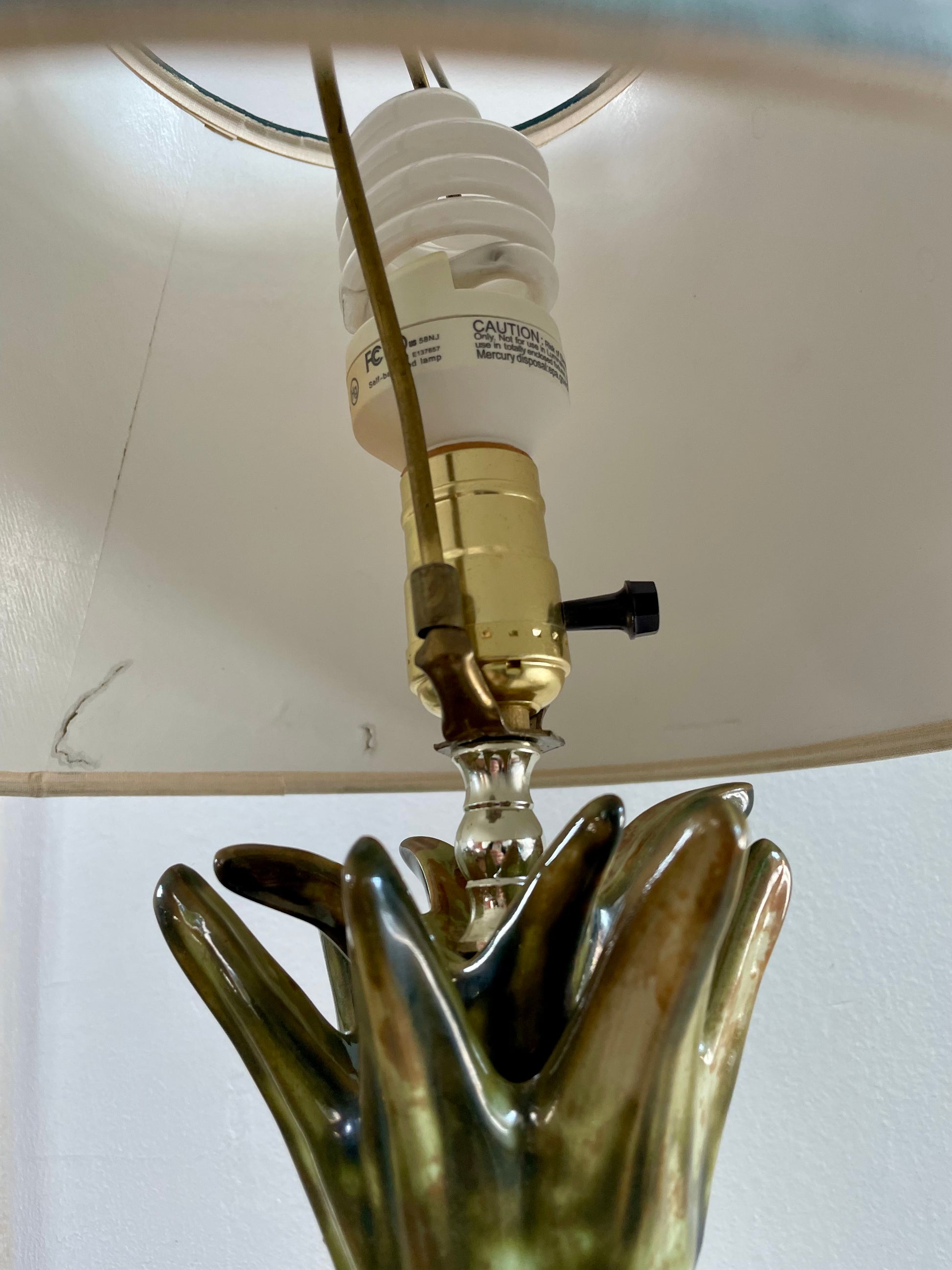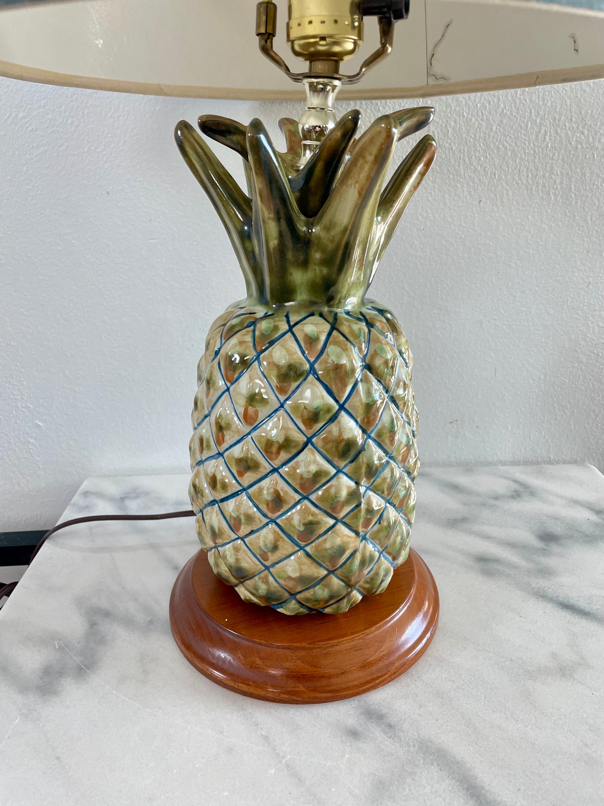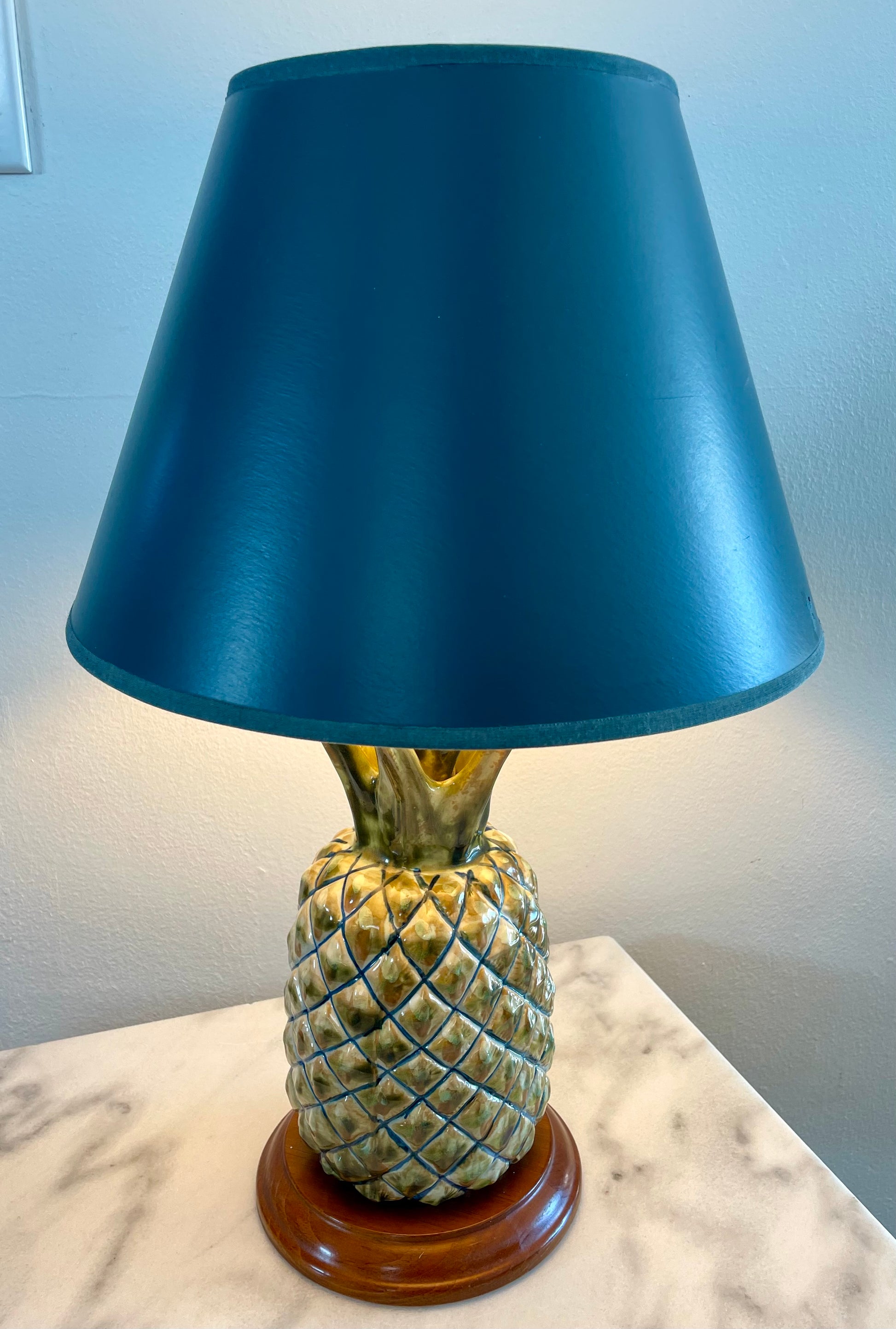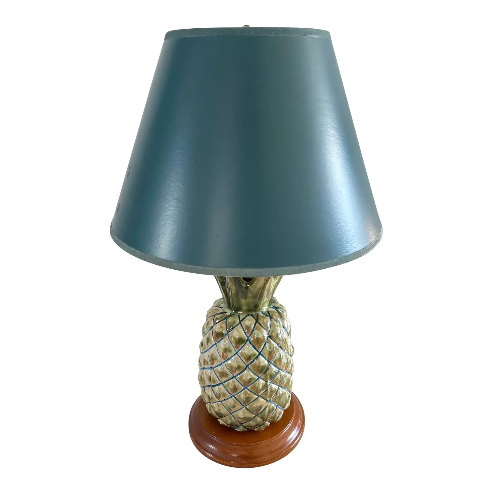 A vintage ceramic table lamp with blue-green accents on a wooden base, includes coordinating teal shade.