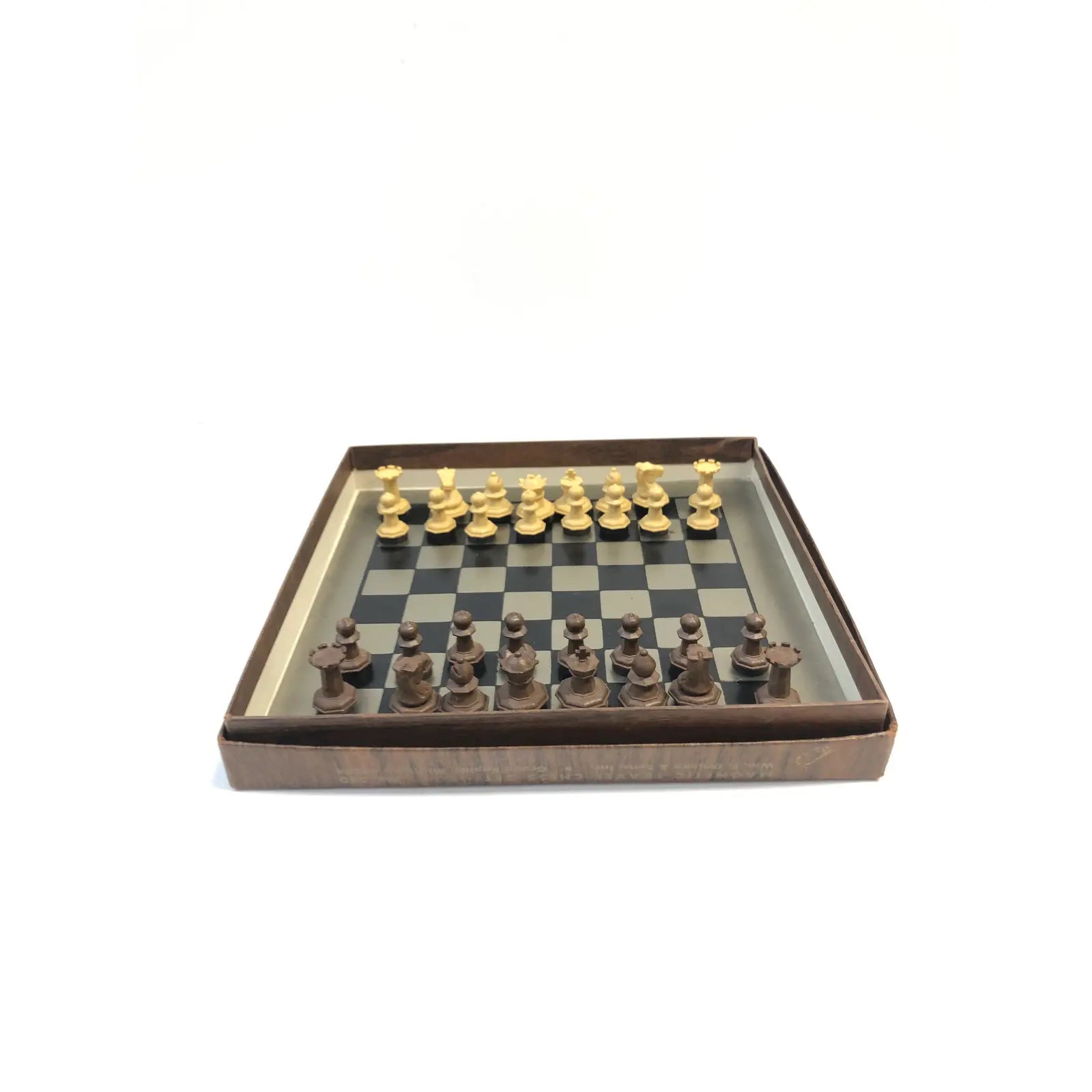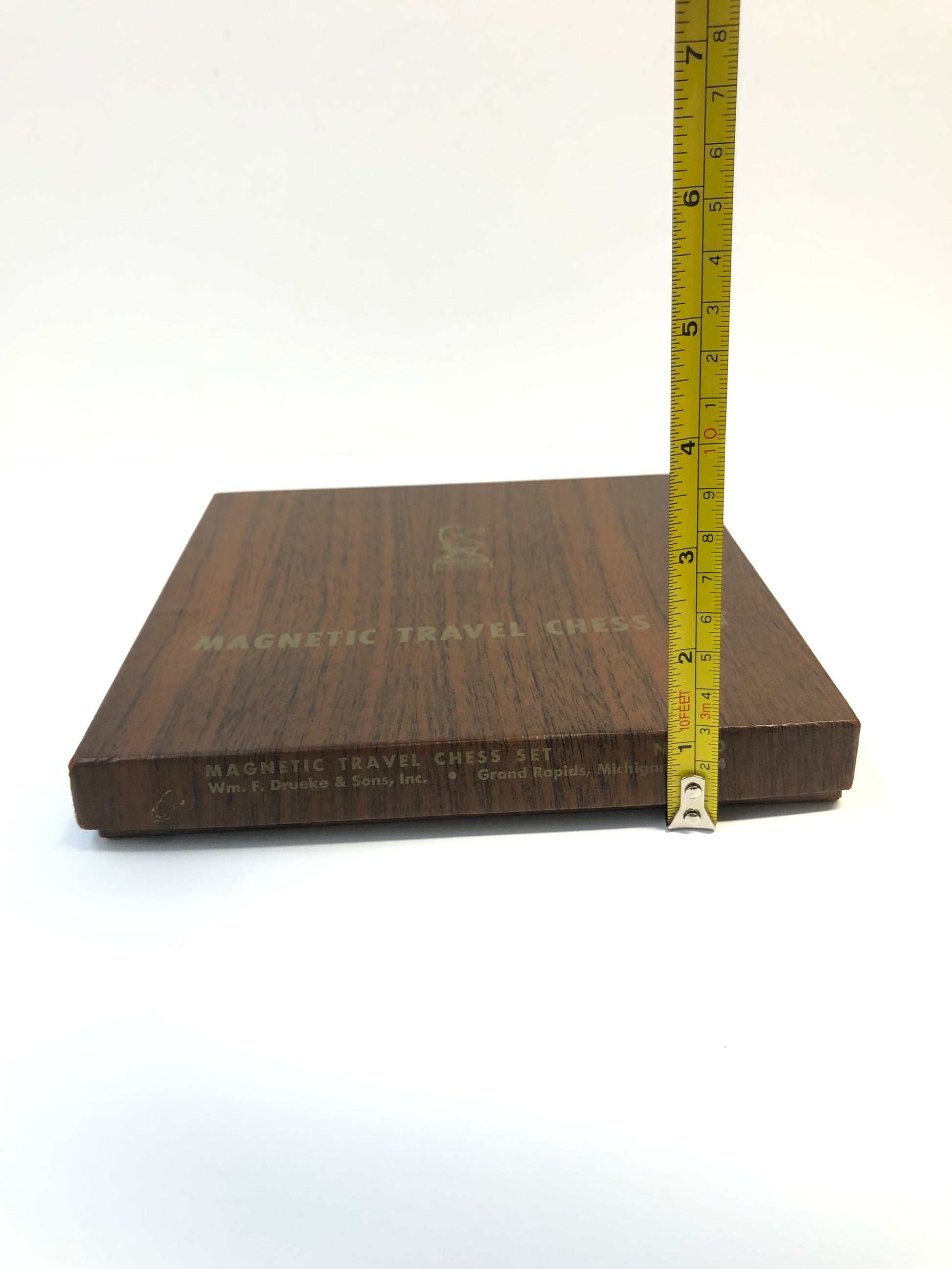 Vintage magnetic travel chess set by Drueke & Sons, circa 1970s. The board does not fold but sits inside a faux walnut cardboard box with Drueke emblem. Easily held and stabilized on various surfaces. Perfect for any chess enthusiast on the go.