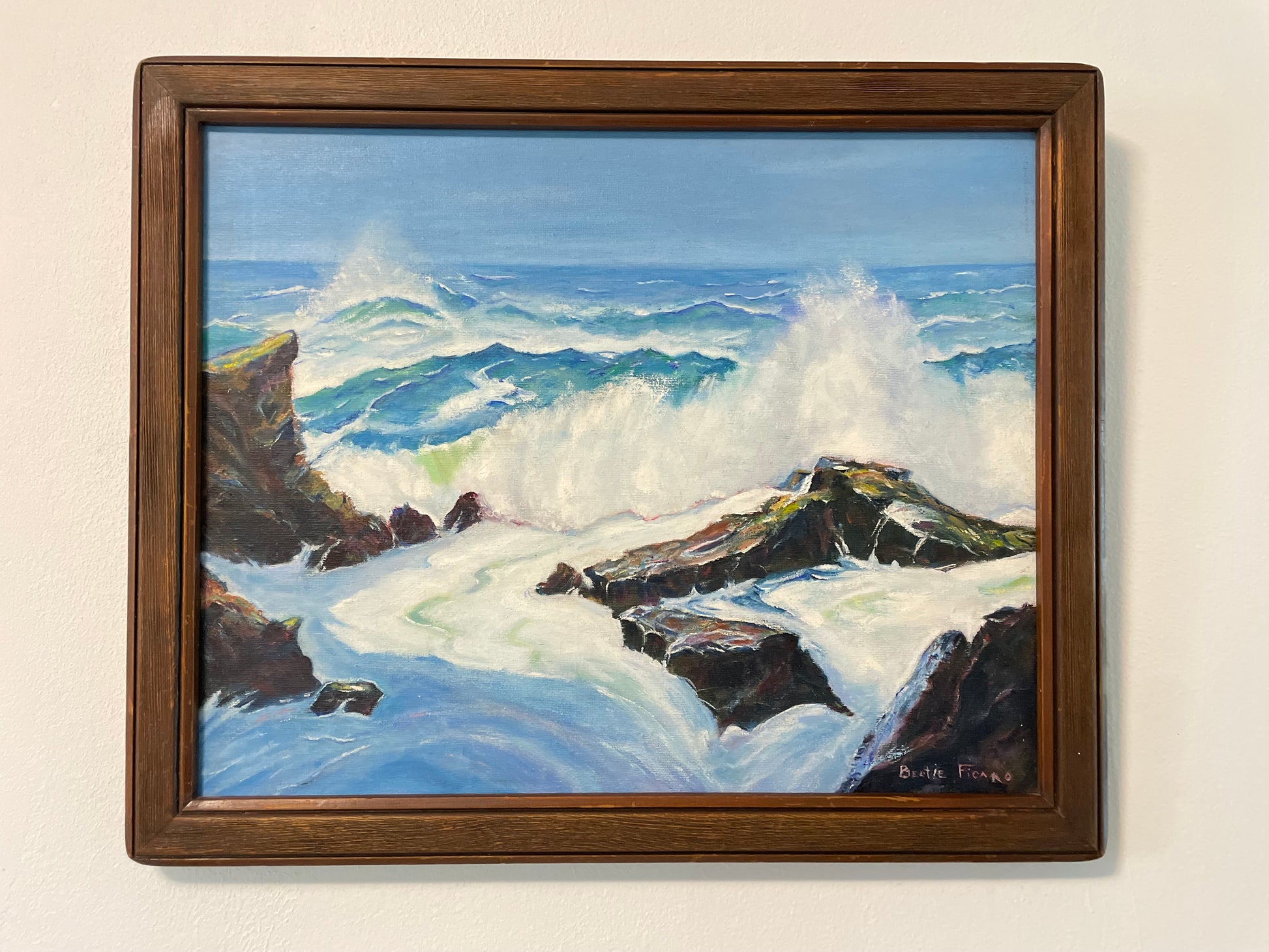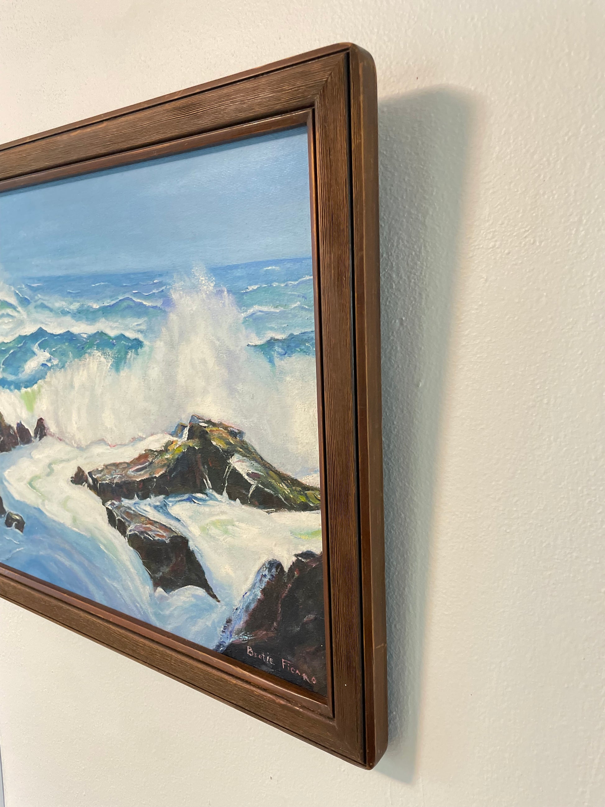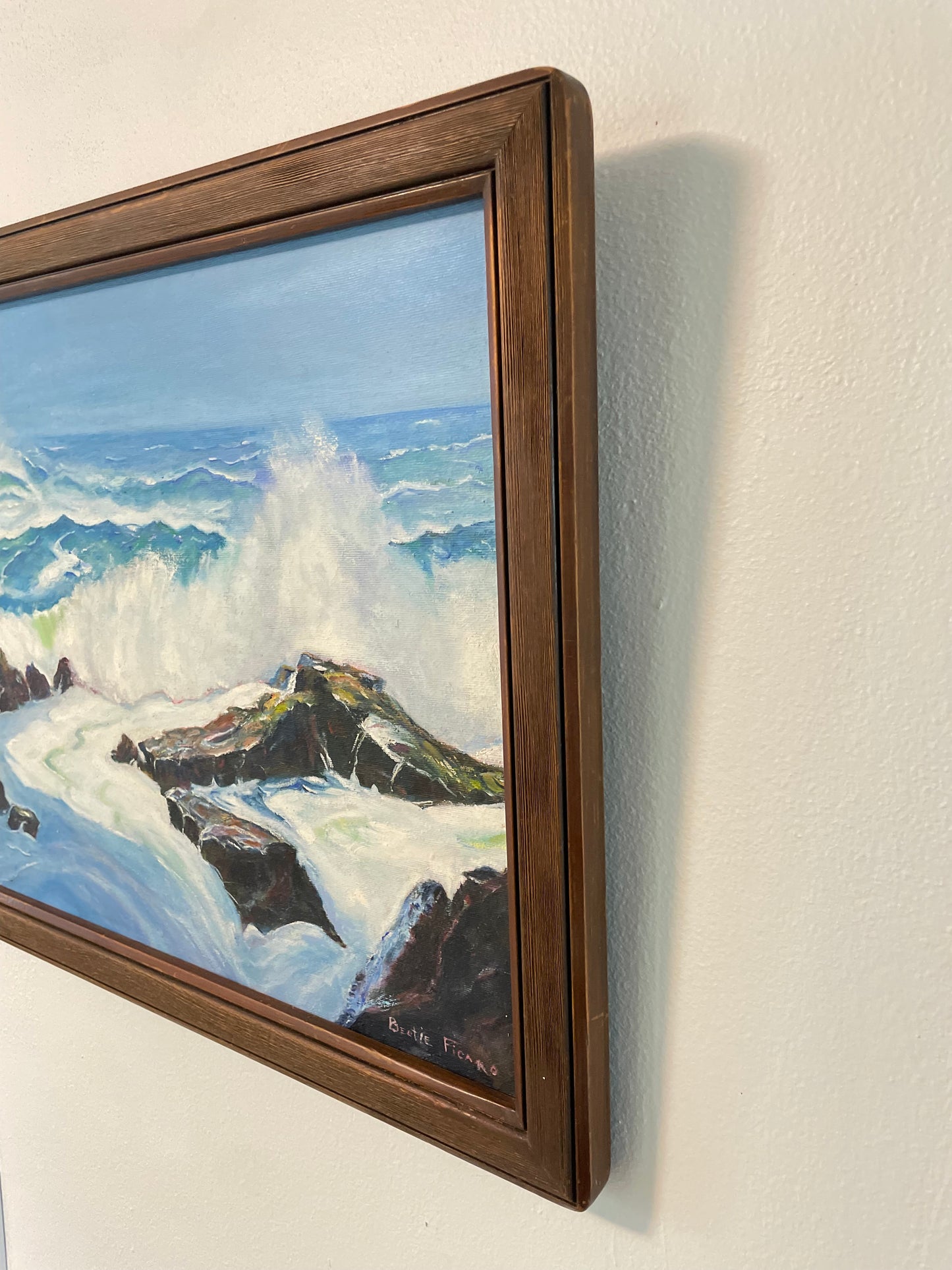 A vibrant vintage seascape oil on canvas framed in a dark wood frame. The painting is signed in the lower right, Bertie Ficaro.