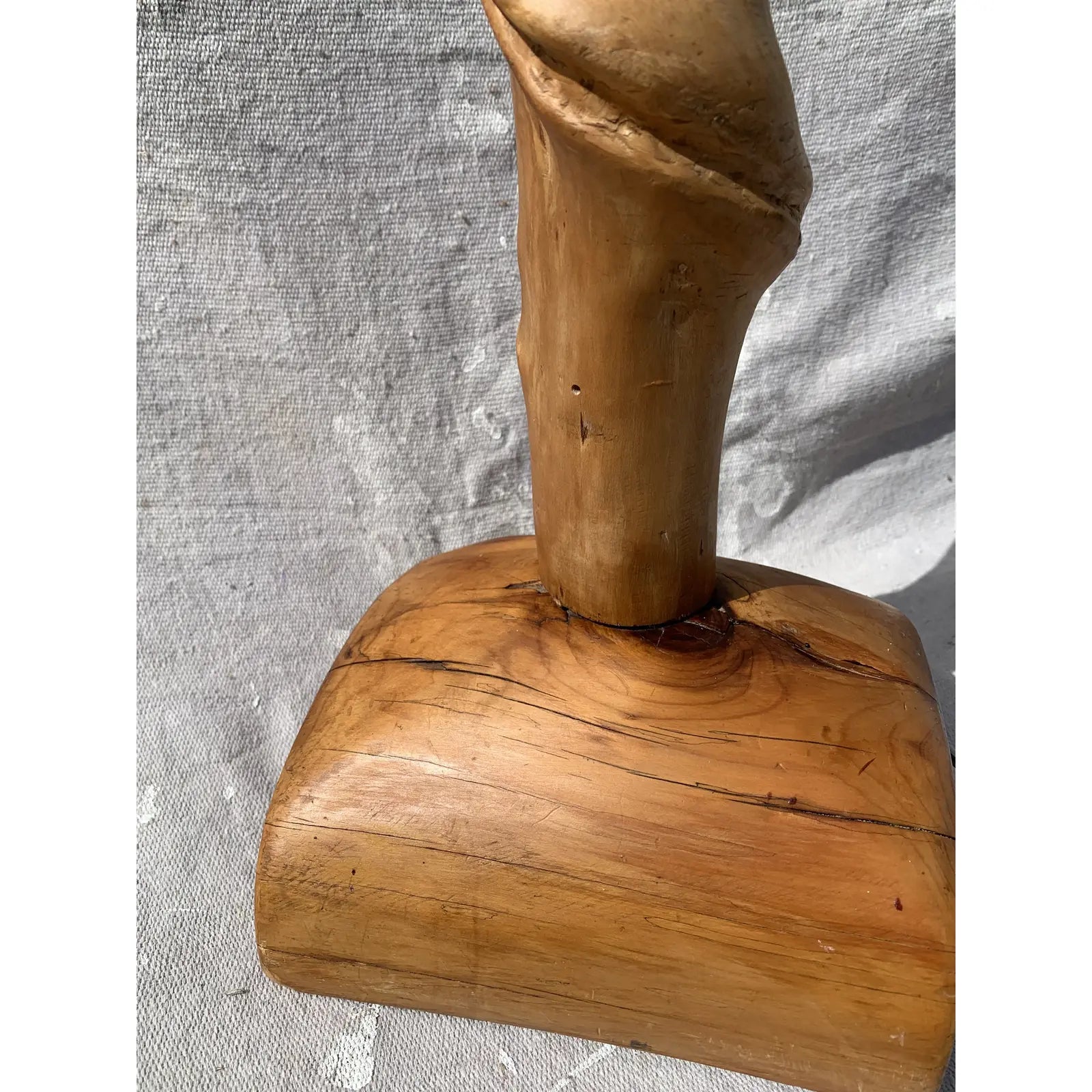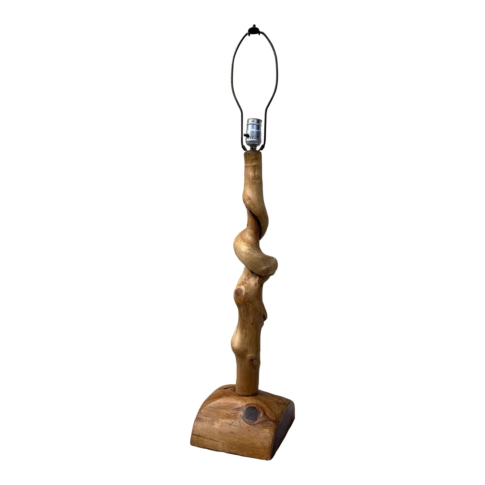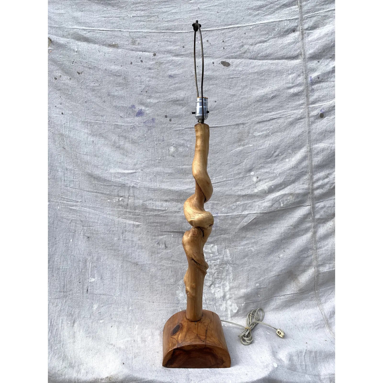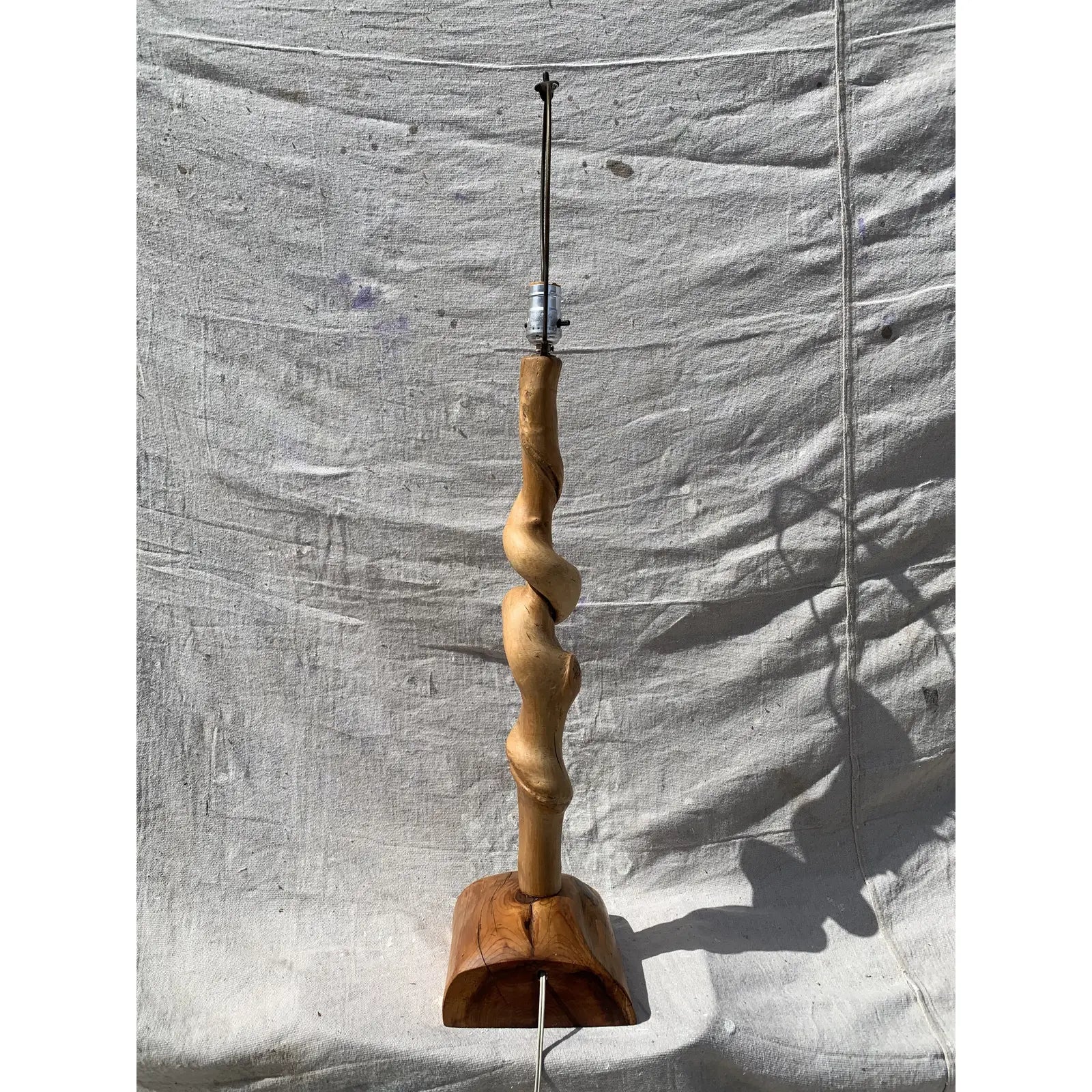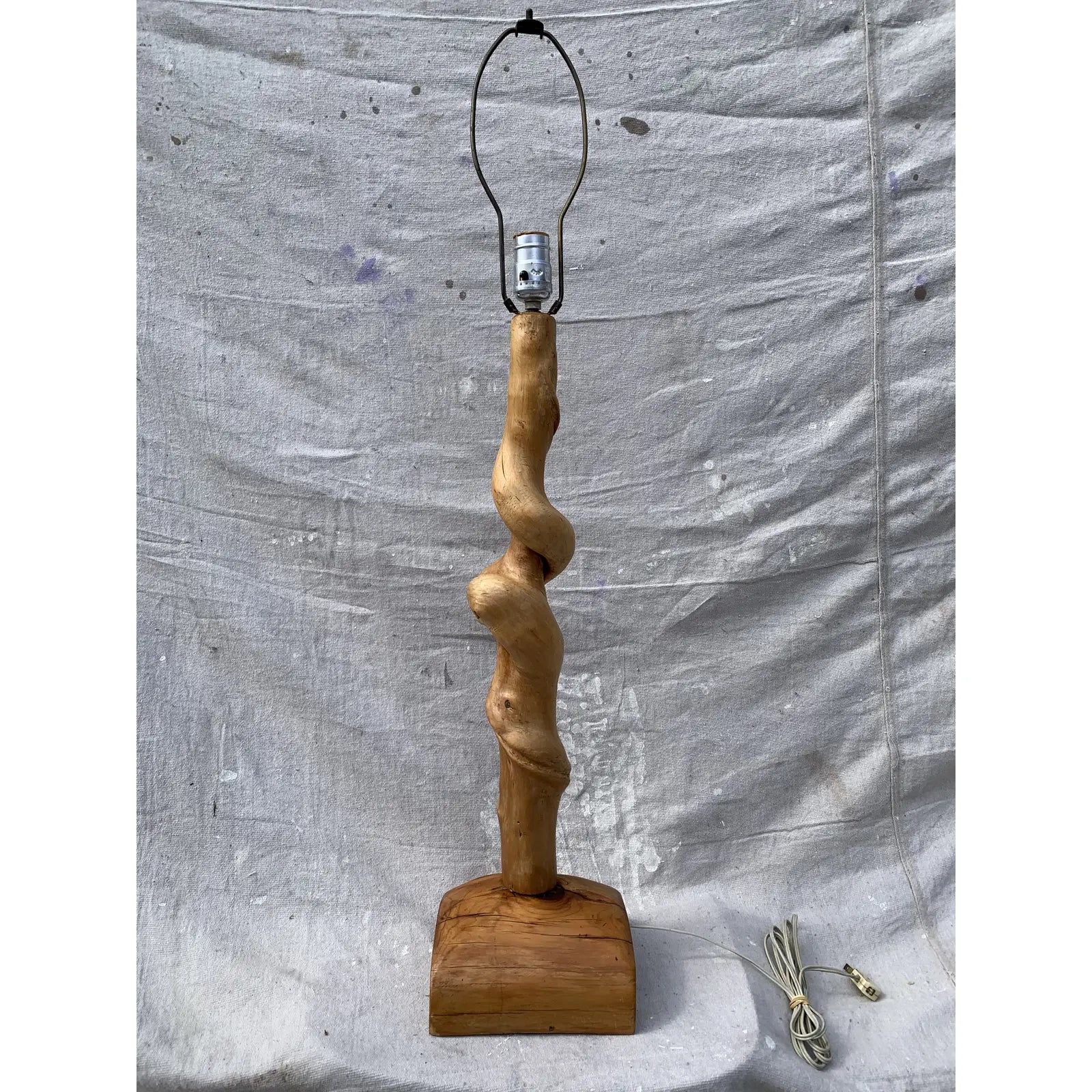 Vintage rustic handmade table lamp made from a sculptural twisted piece of wood on a solid wood base. The lamp has a natural oiled finish.