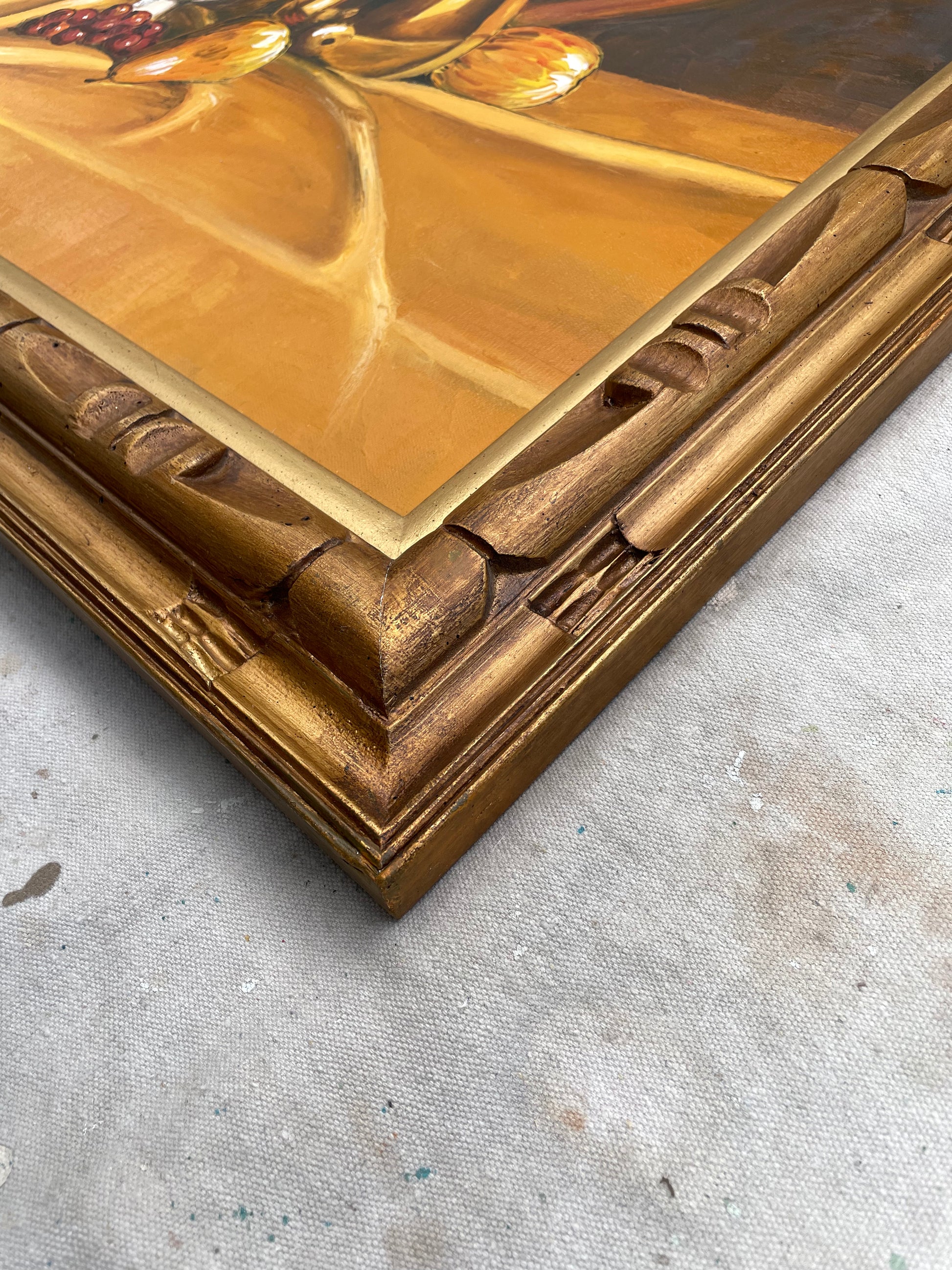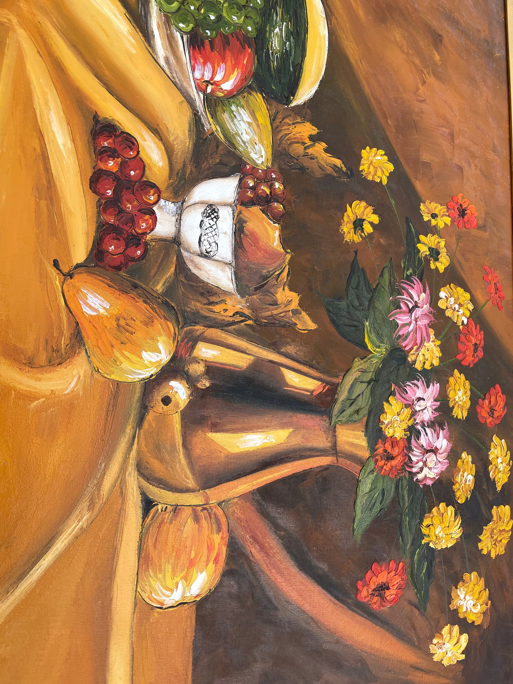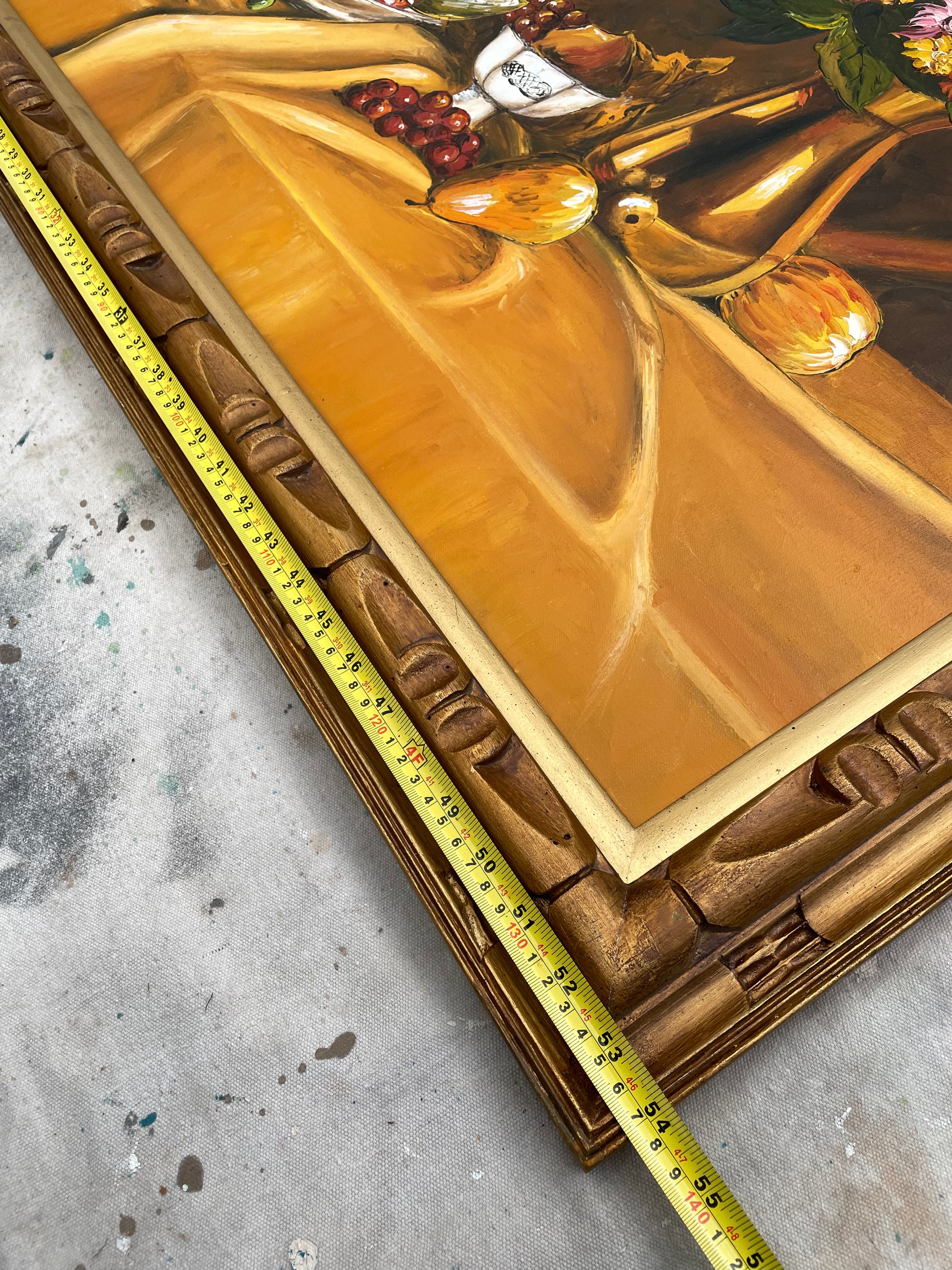 A large scale still life painting of a tablescape in rich colors featuring a vase of vibrant flowers and a flowing bowl of fruit. The painting is framed in a carved wood gilt frame.