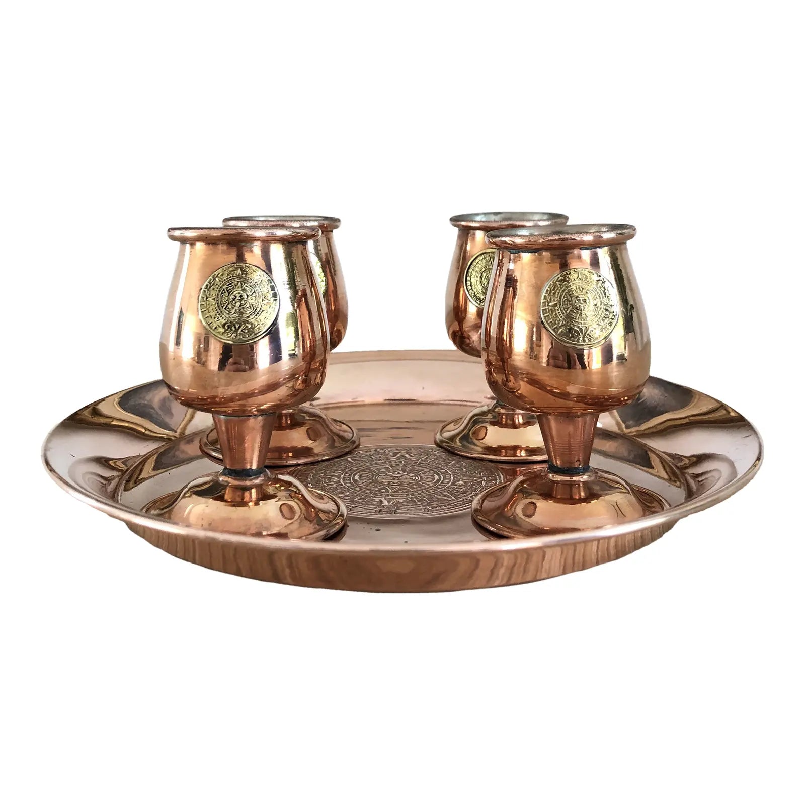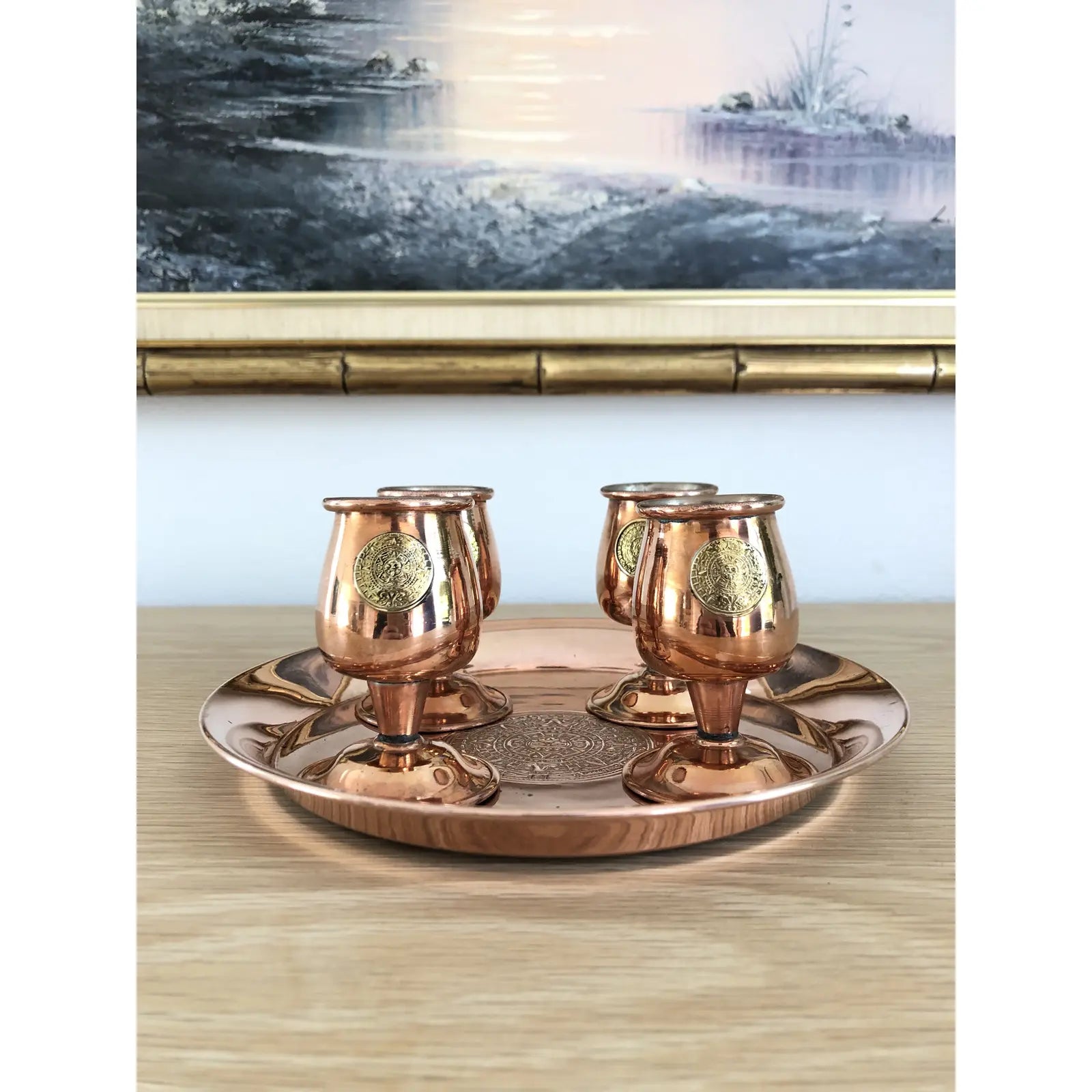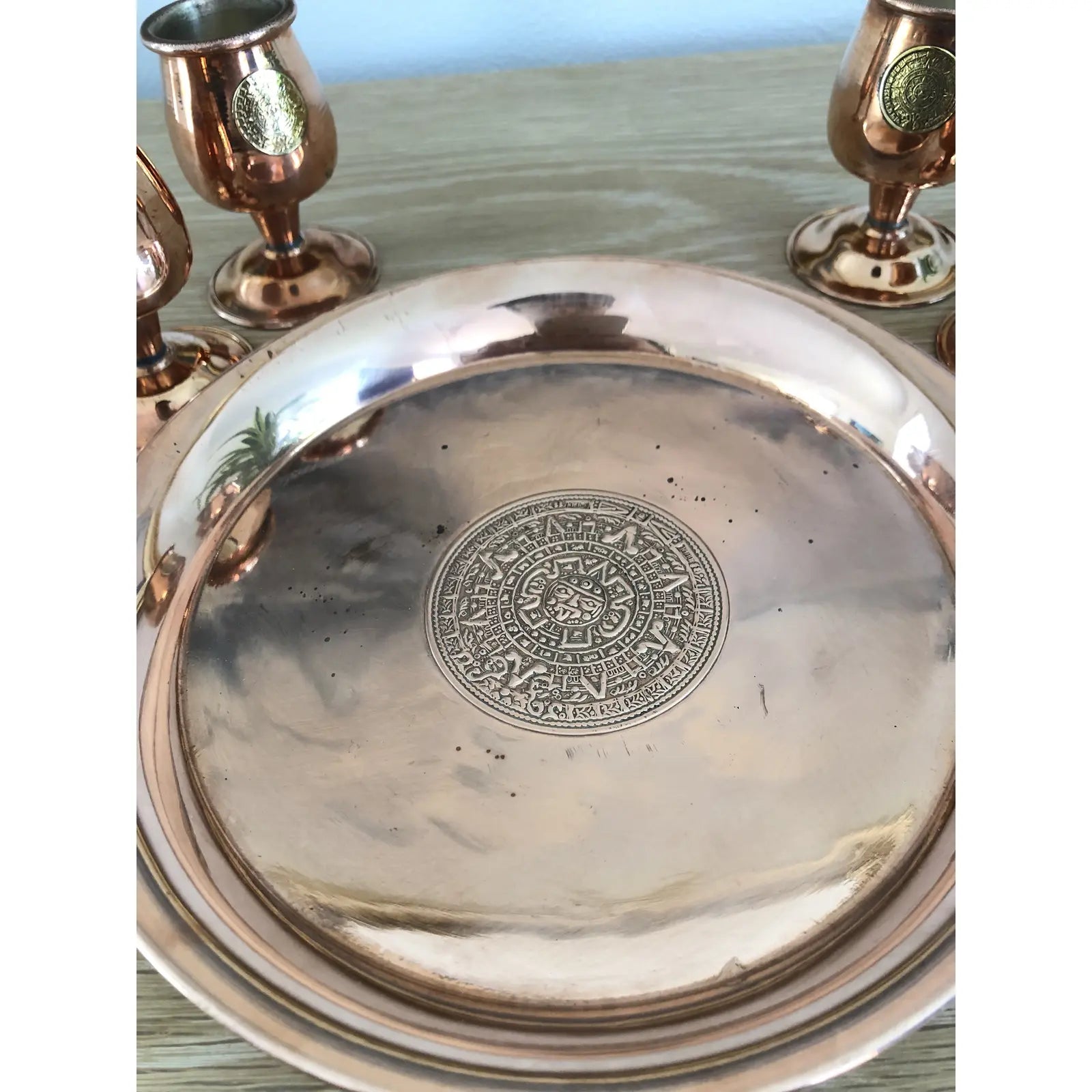 Vintage polished copper shot goblet set of 4 with tray with brass Mexican medallion on each piece. Fun eclectic barware for any get together.