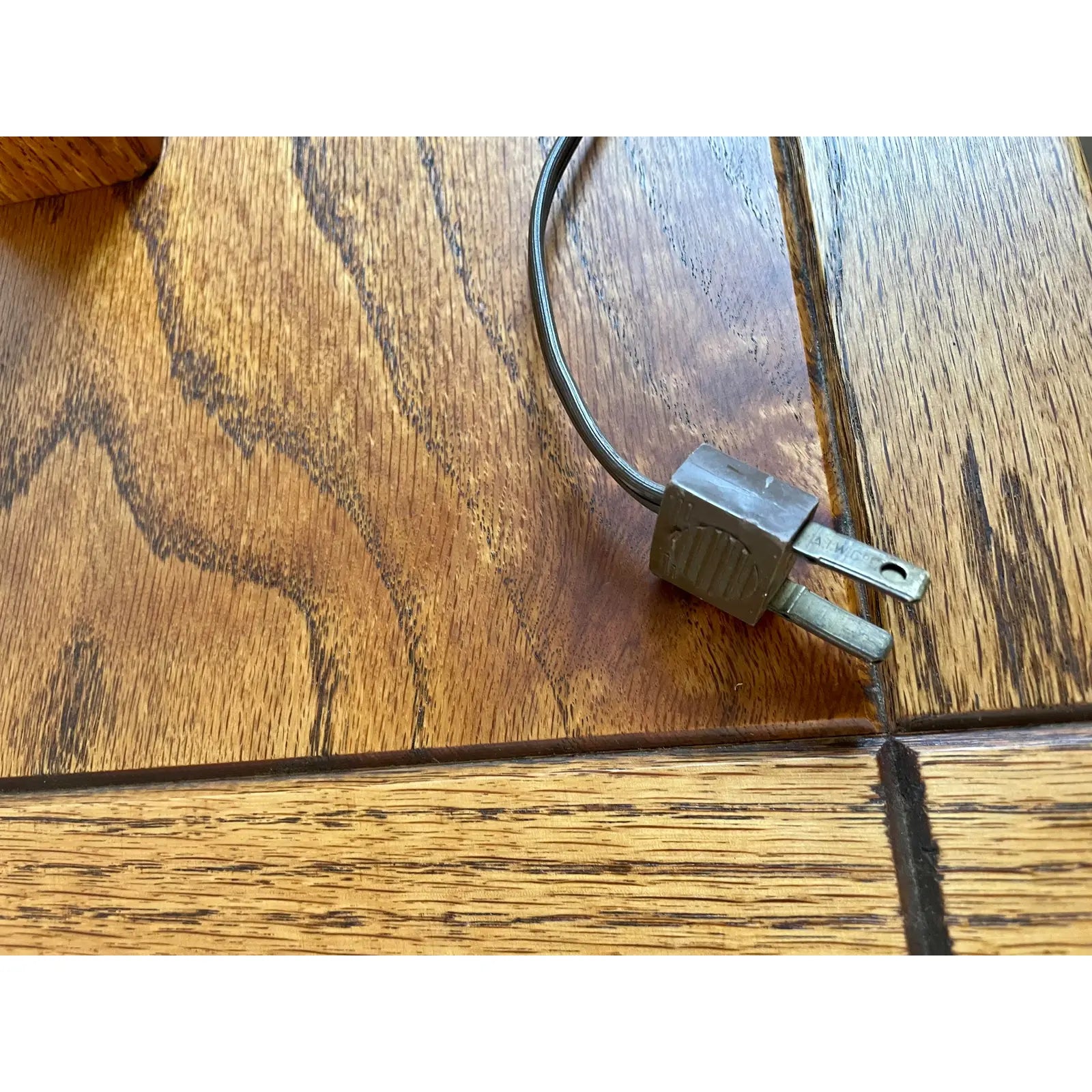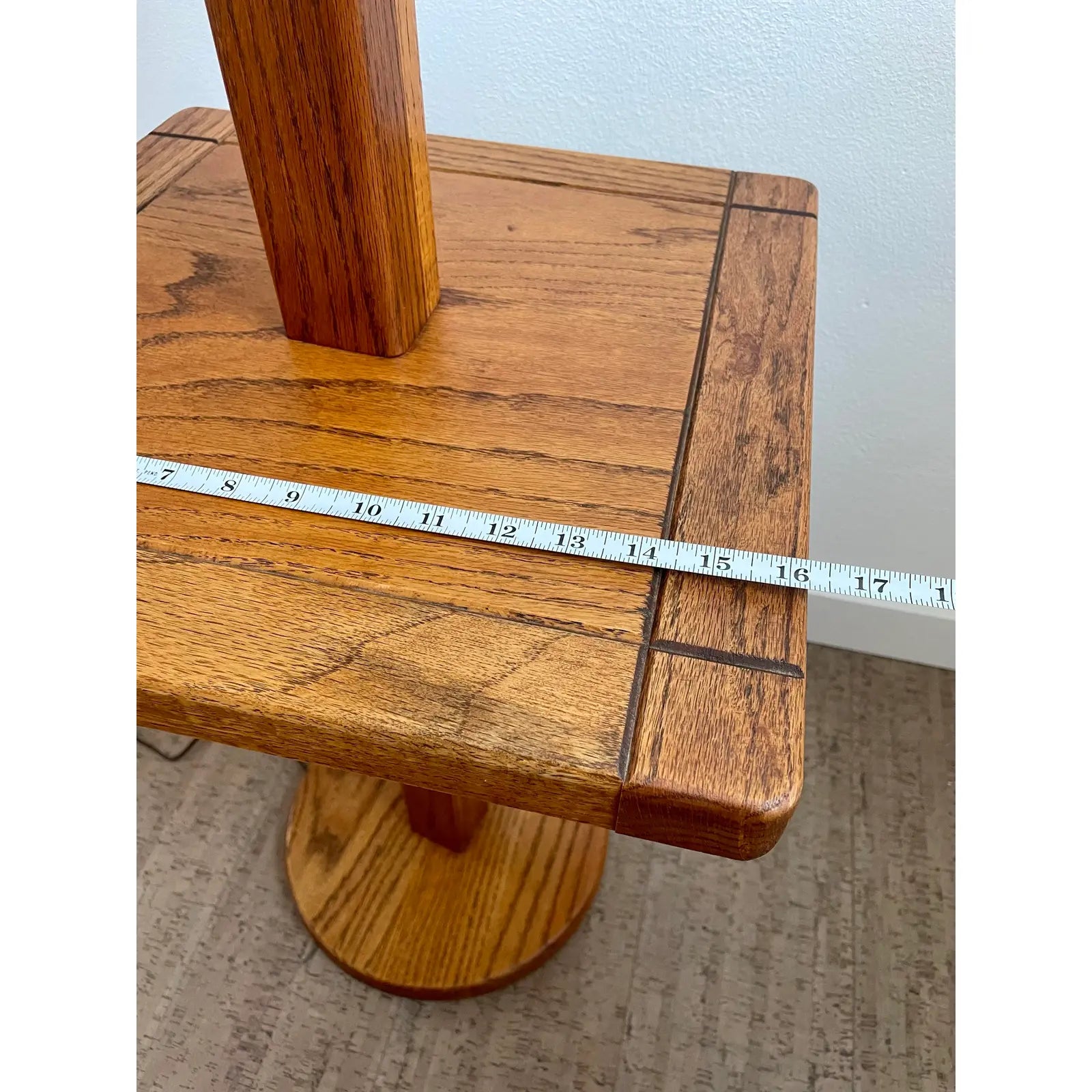 Wonderful vintage floor lamp by Stiffel with attached table comprised of solid oak, metal pole and lamp shade. Beautiful vintage condition. Wood has rich golden tones with beautiful patina. Has slender cylinder which extends upward and holds the lamp shade. In the center of the lamp, there is a functional square table held by a circular base. Perfect for a small space since no additional table is needed. Its simple rustic design gives it such versatility it could be placed in any room in your home, next to a lounge chair or in a sitting room. It would be wonderful in your western style cottage or traditional ranch home, but it could also add a softer touch to your industrial loft