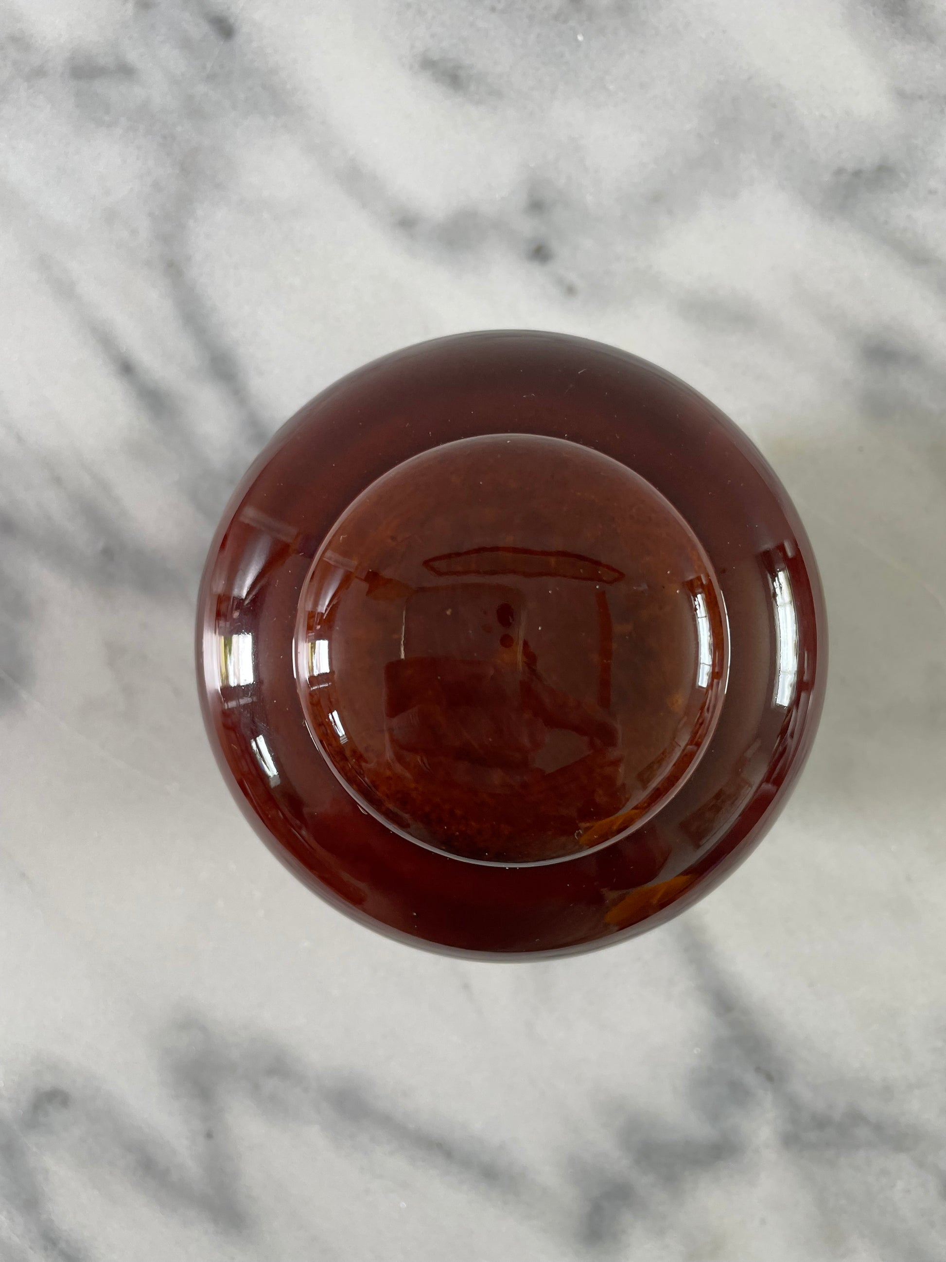 Beautifully glazed vintage mid-century modern Japanese lidded ginger jar in auburn browns and red accent. Perfect for any shelf or counter top. Elegant minimalist style storage easily assimilates into many different types of environments.