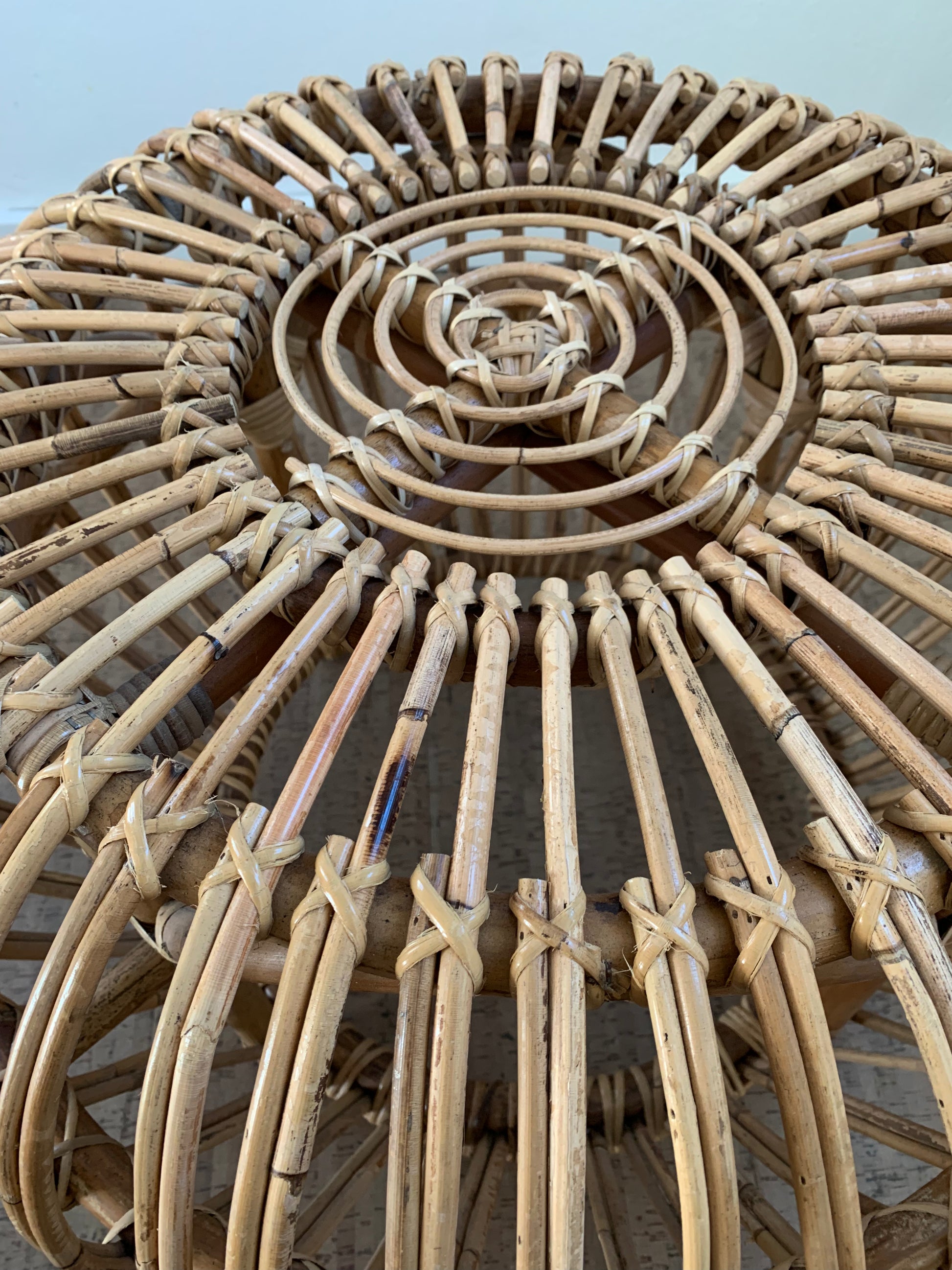 A vintage mid-century Franco Albini style lobster pot ottoman, featuring rounded handwoven rattan wicker. Perfect as a footstool or side table.
