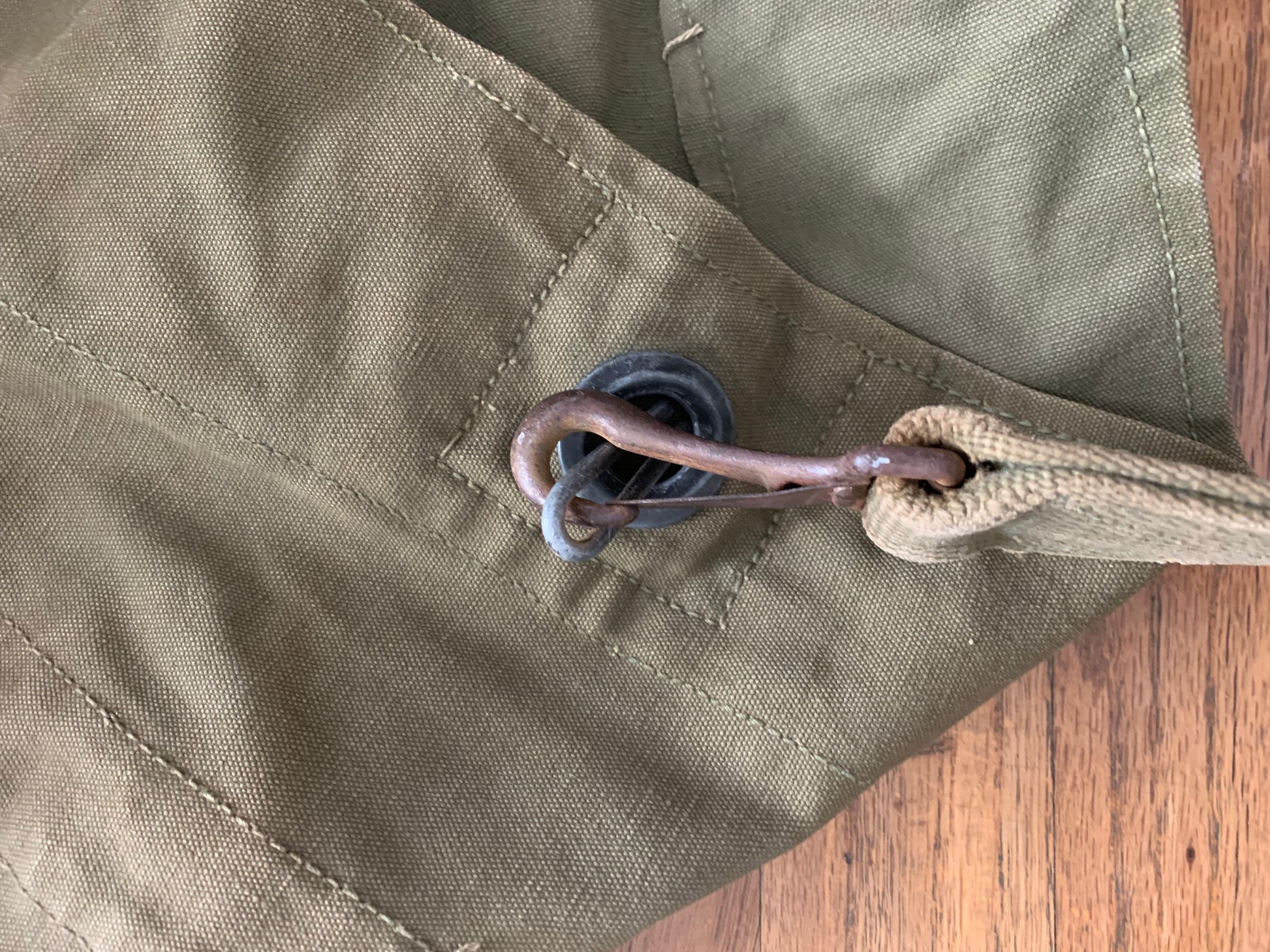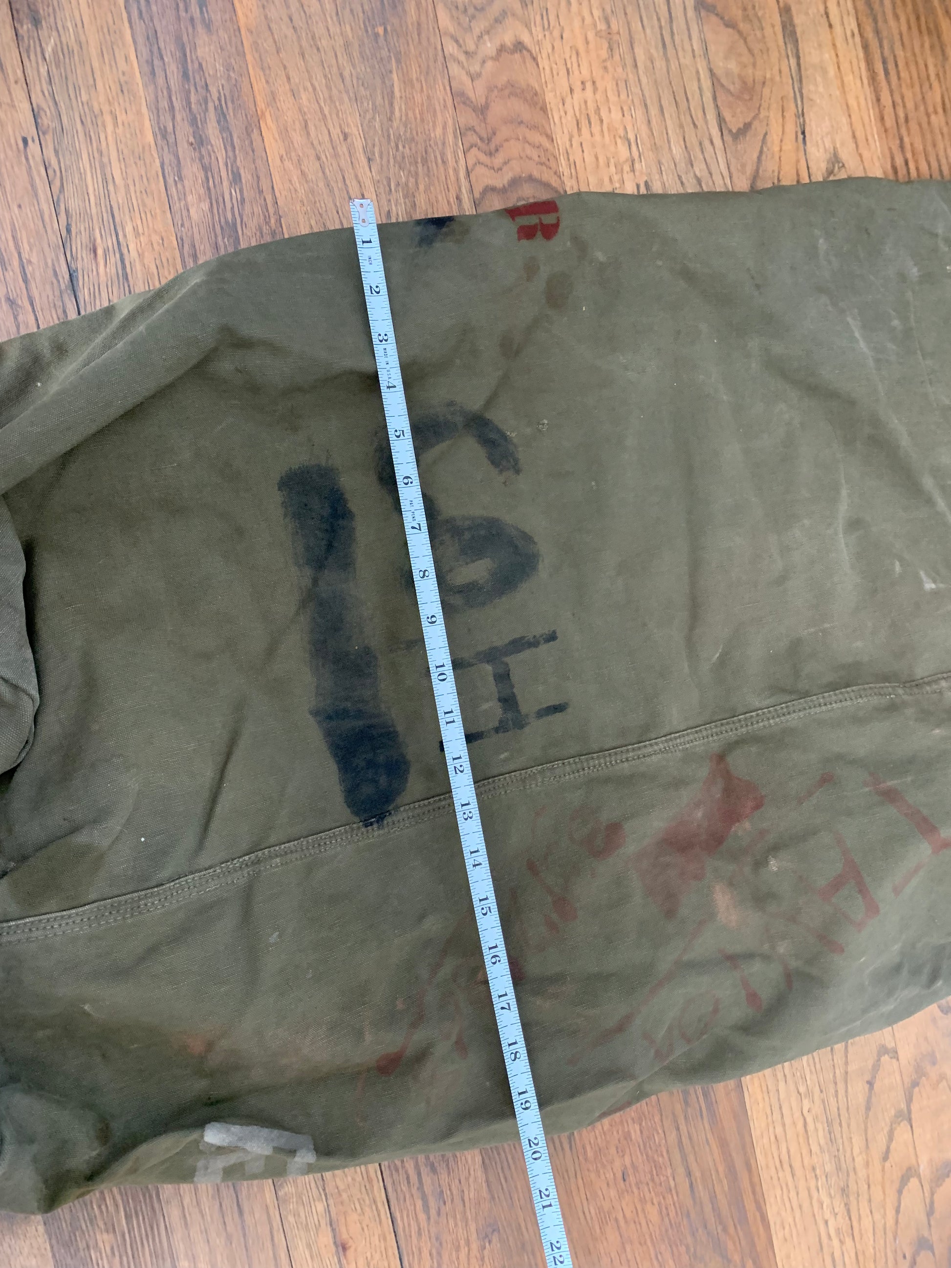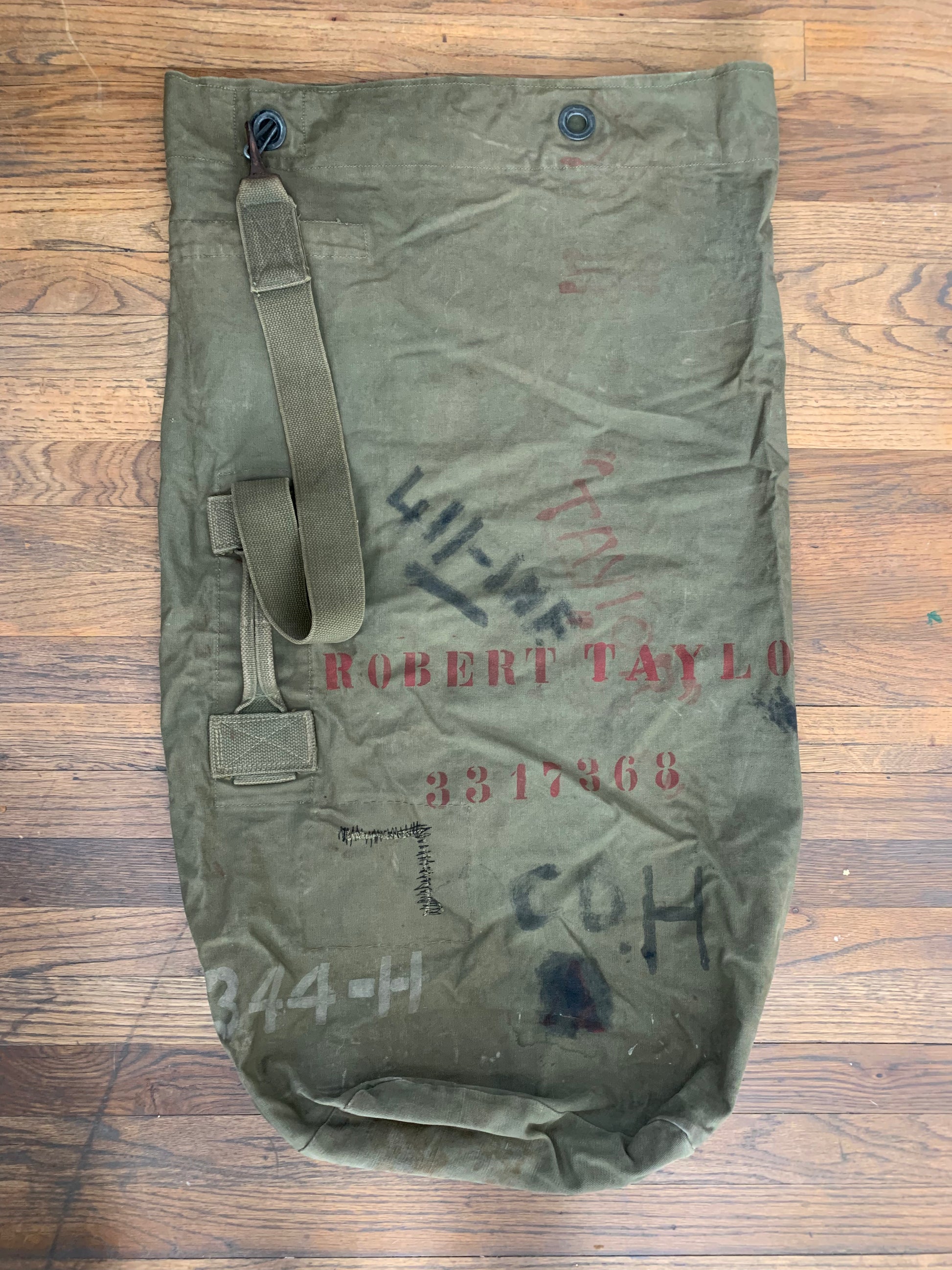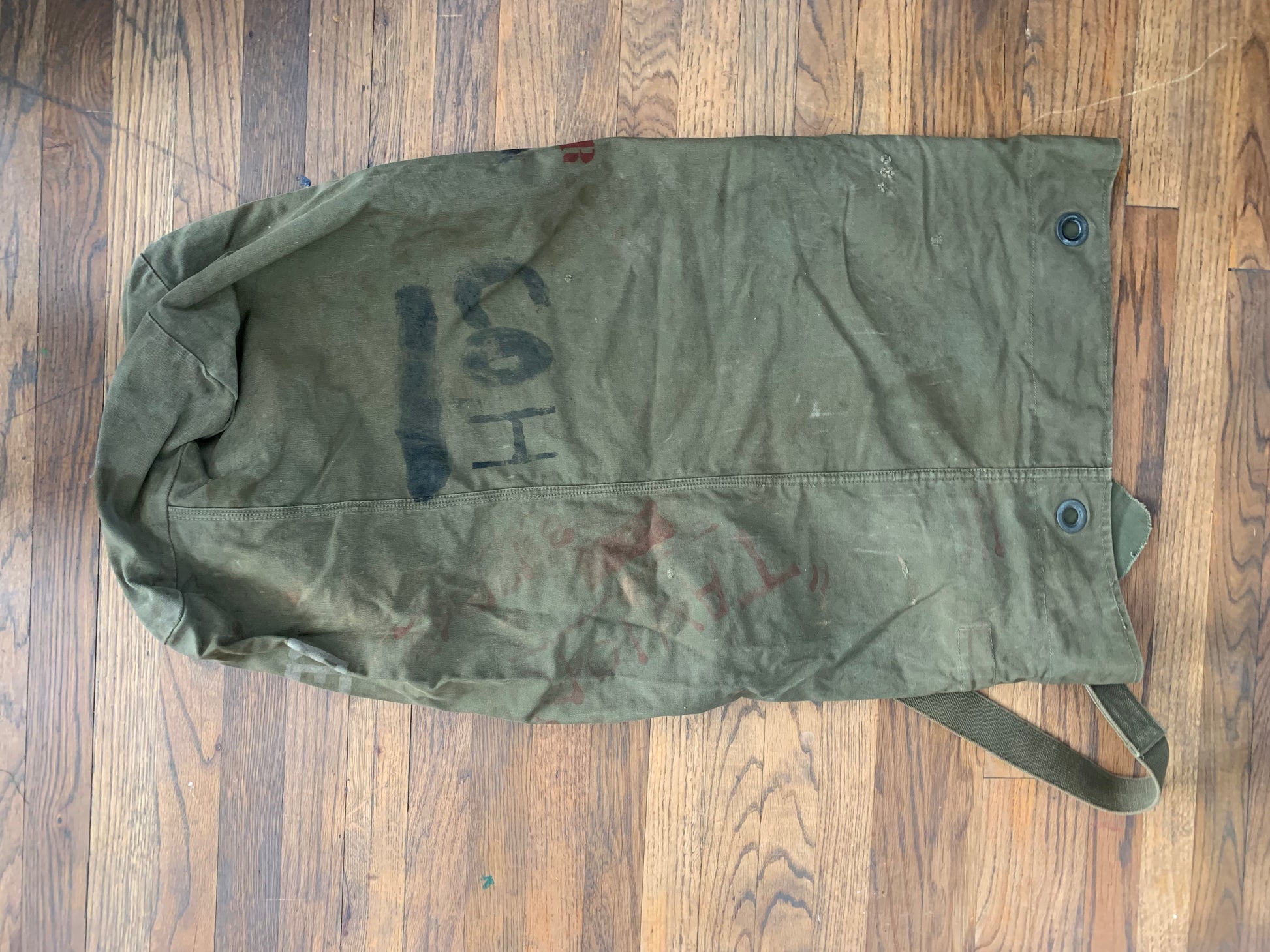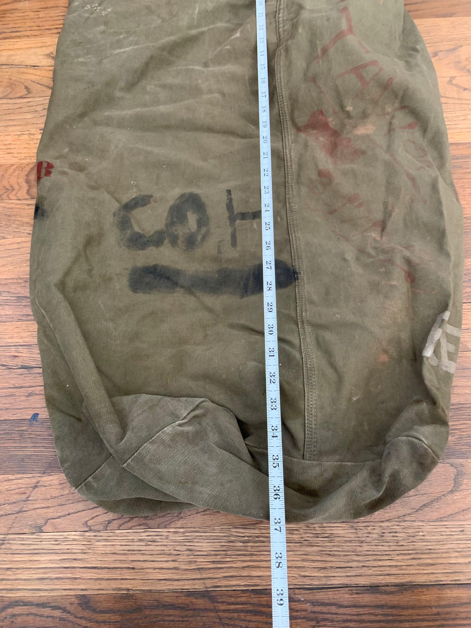 A vintage military duffel with stenciling, stitching and hand marked personalization.