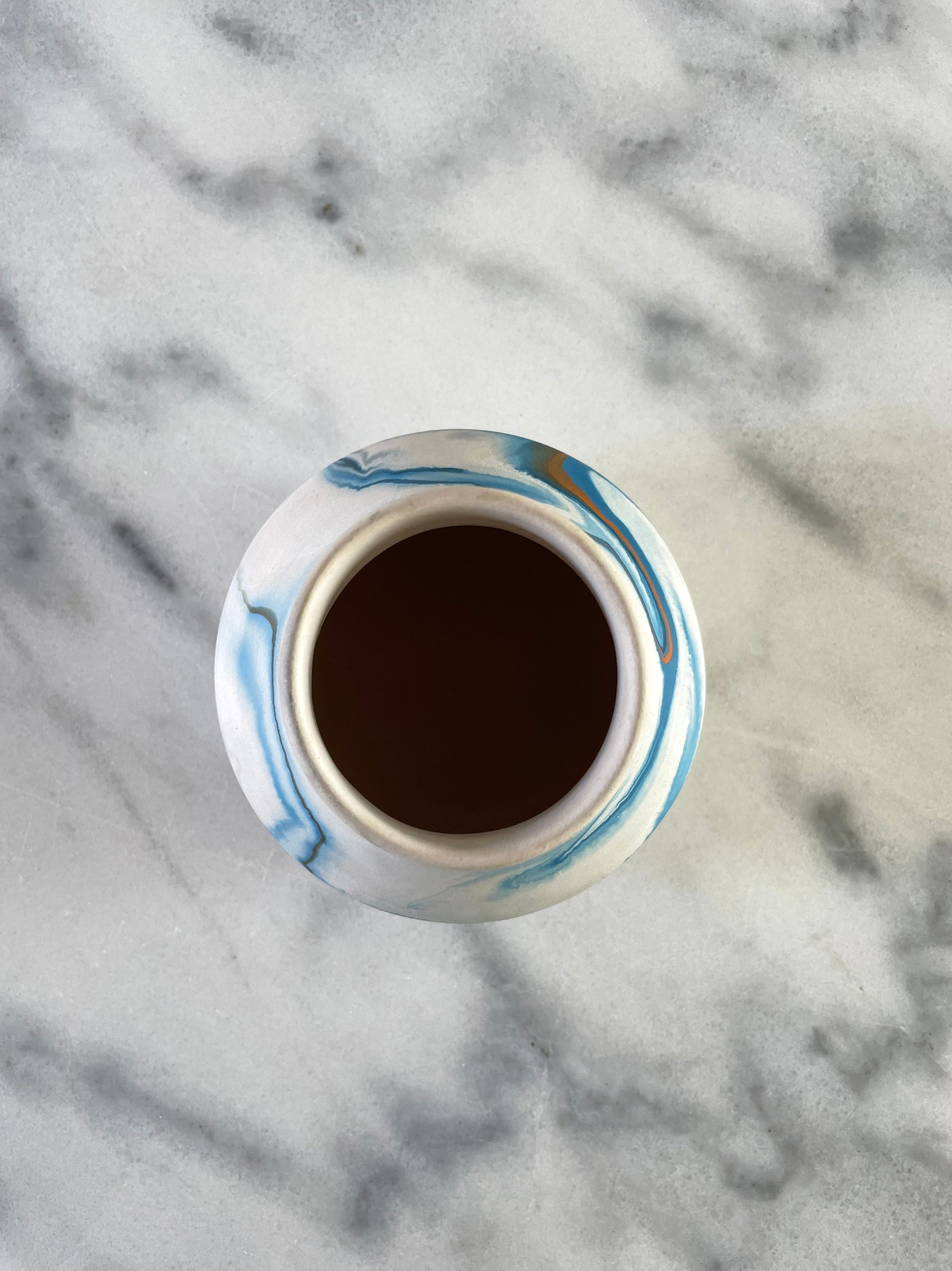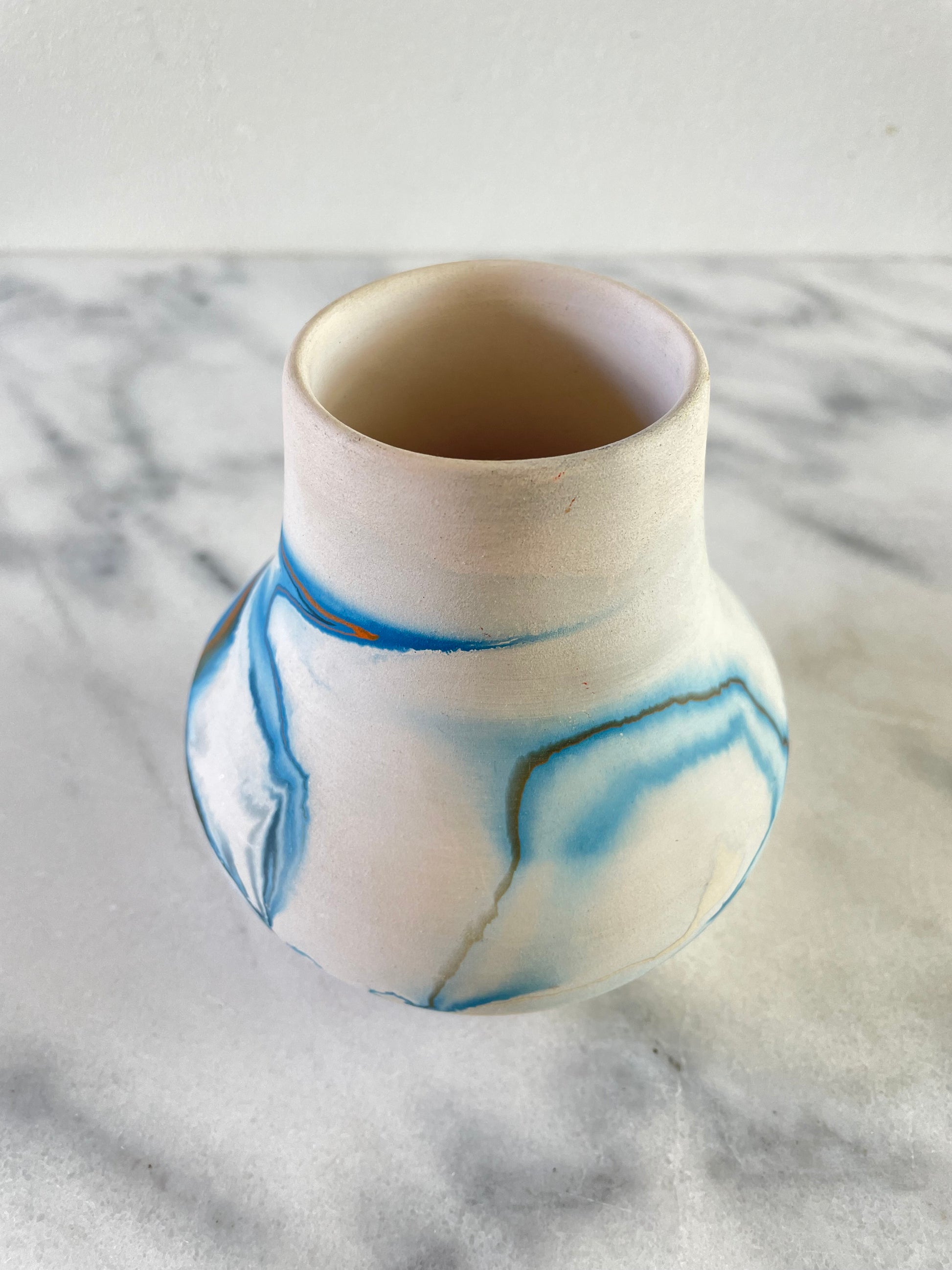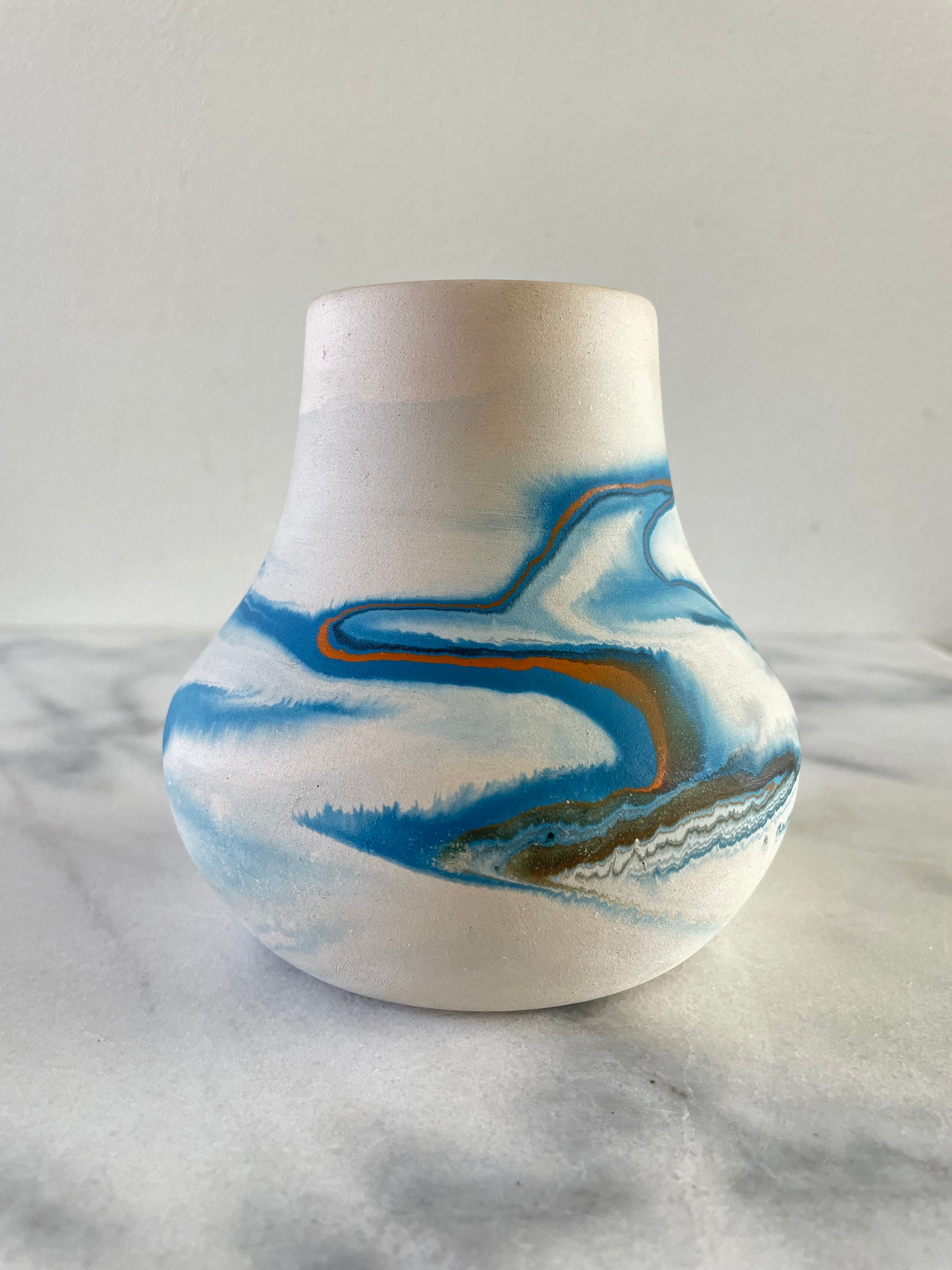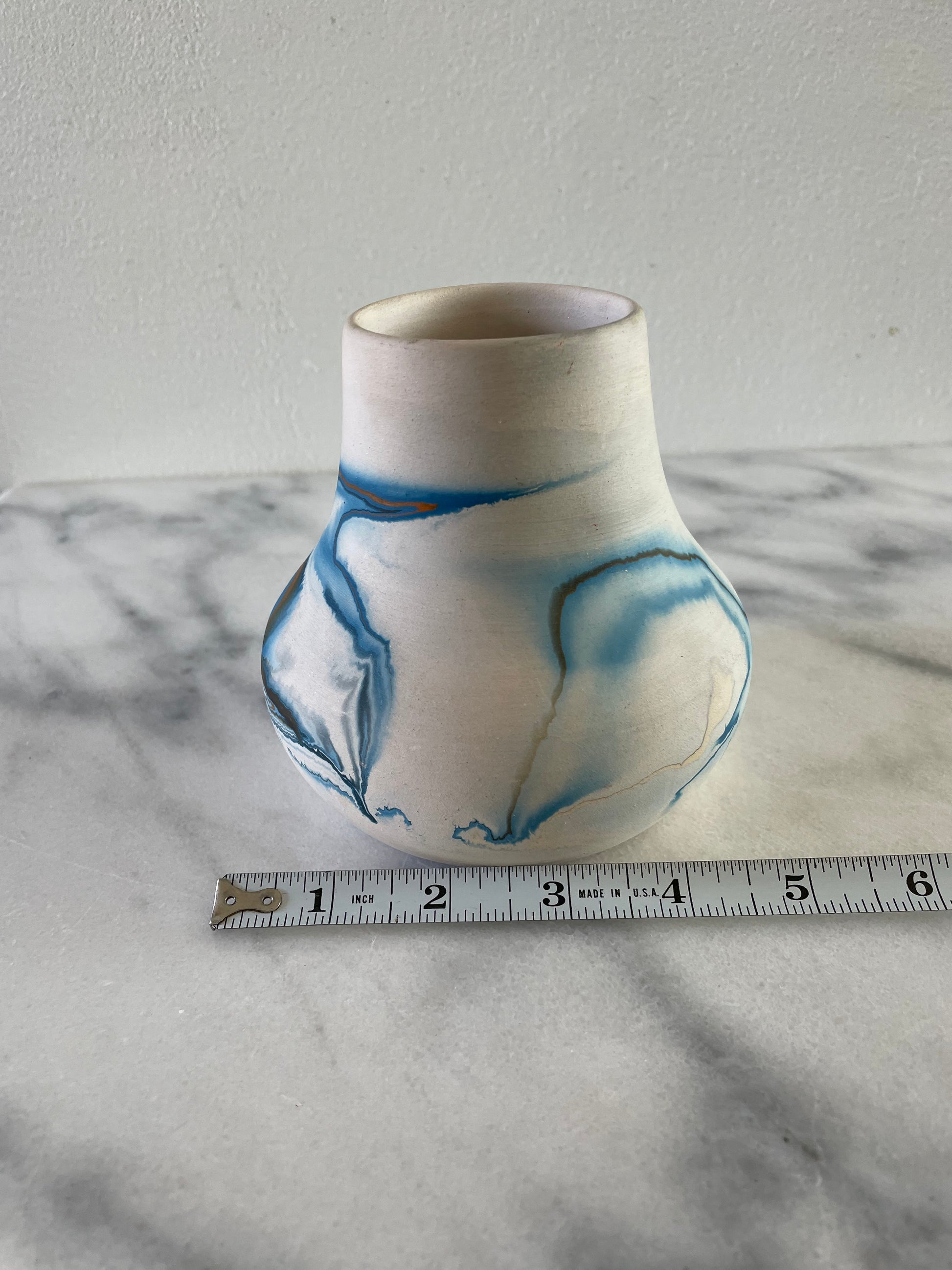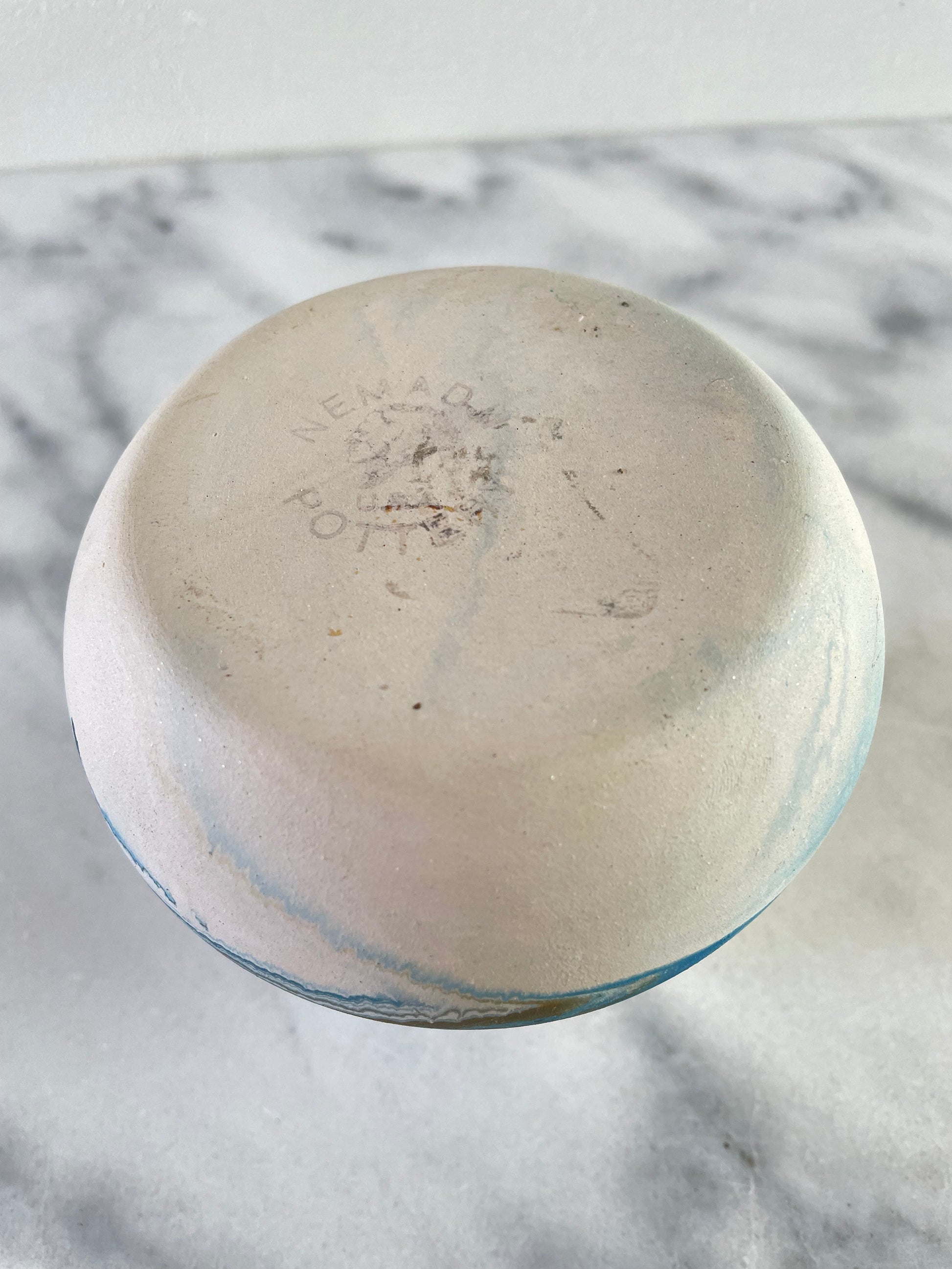 A vintage Nemadji ceramic pot with blue swirl over white body.