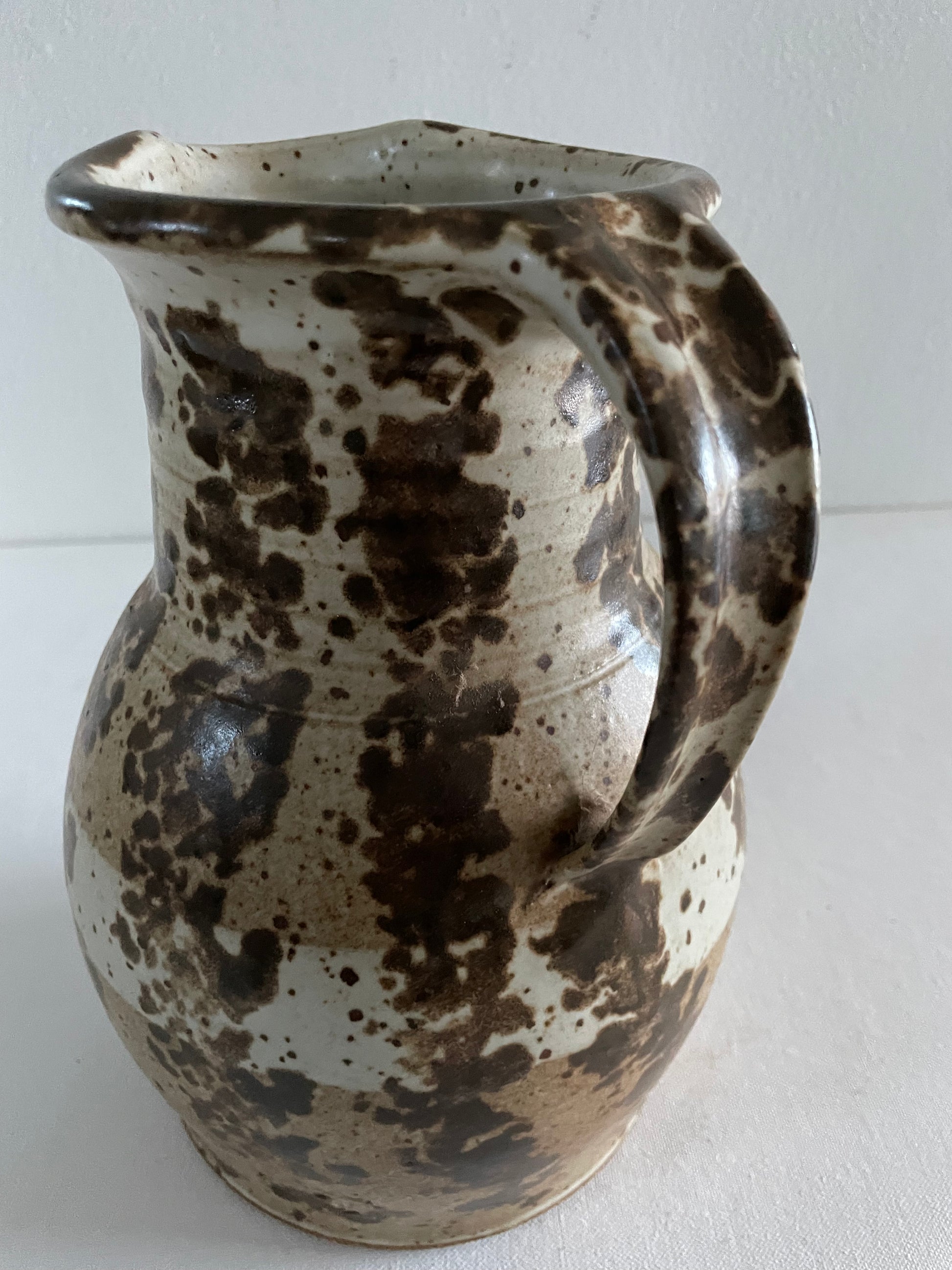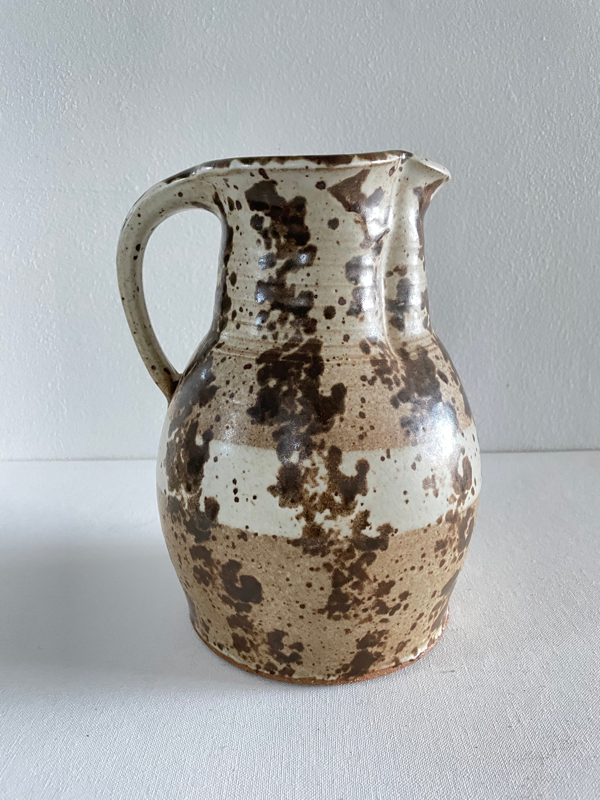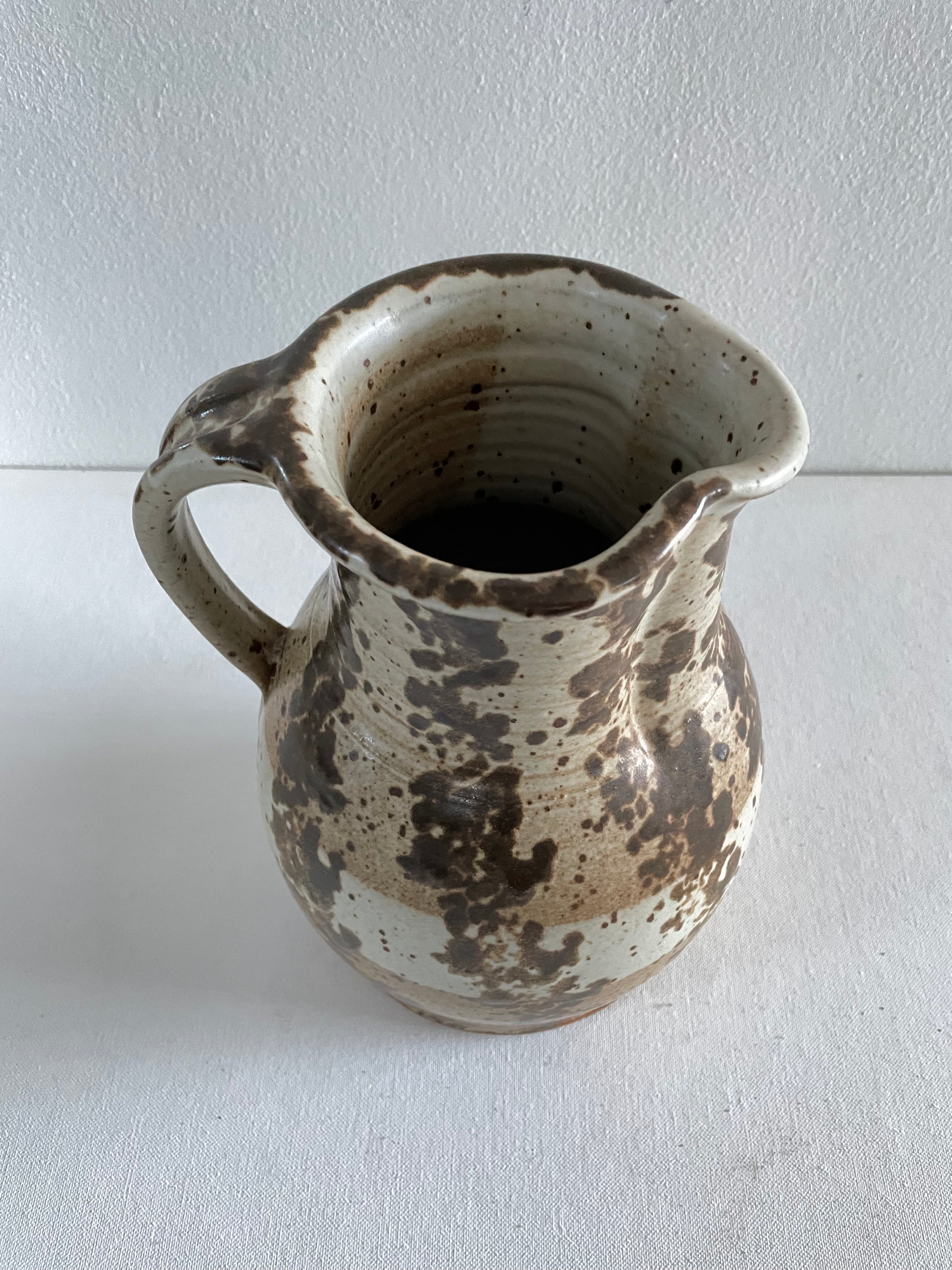Natural speckled clay brings a touch of earthen character to this statement pitcher. Handmade ceramic studio with its own distinct look. Ergonomic handle and pour lip make serving easy and clean.