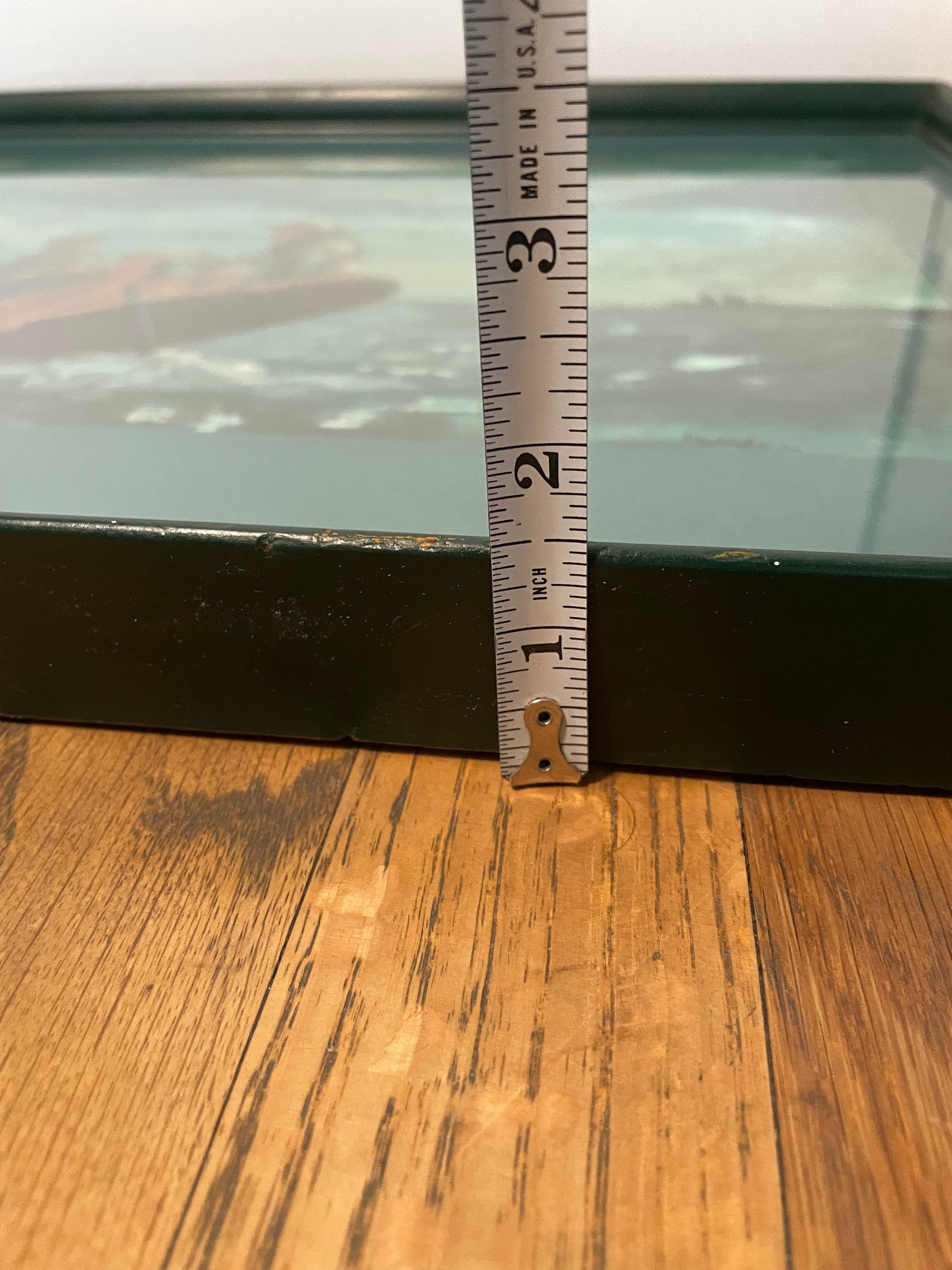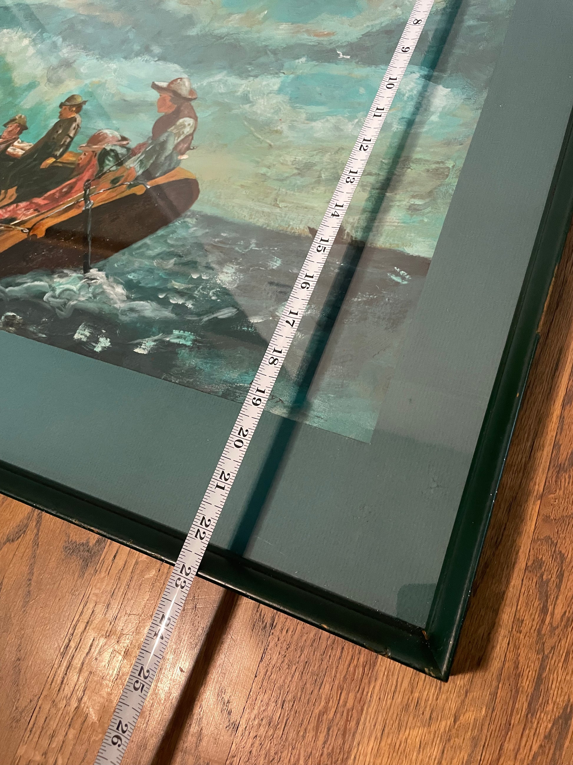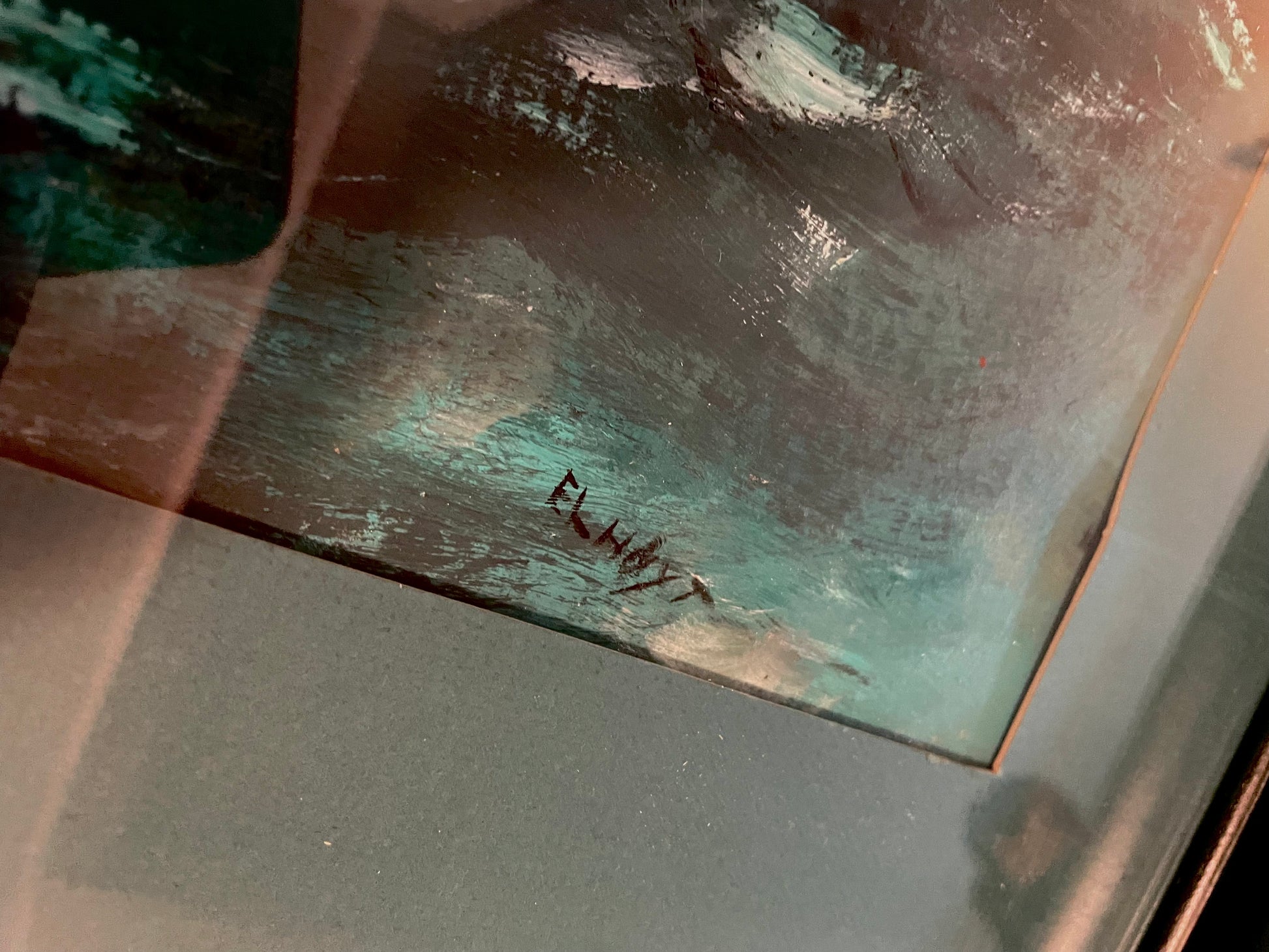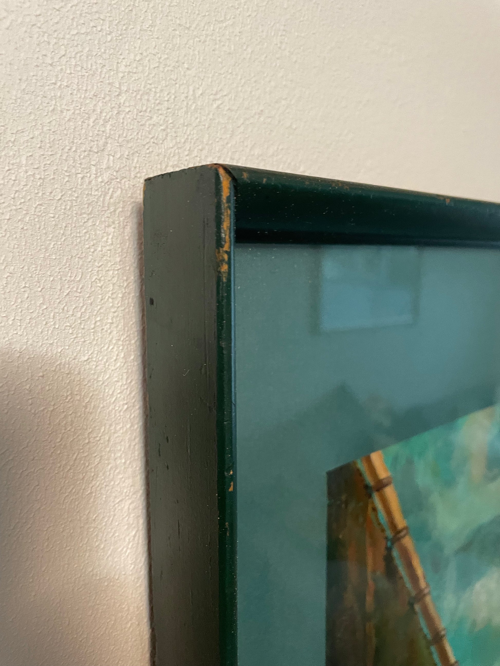 The painting is framed in a dark green frame with a coordinating green mat under glass. It is signed, but the signature is illegible.