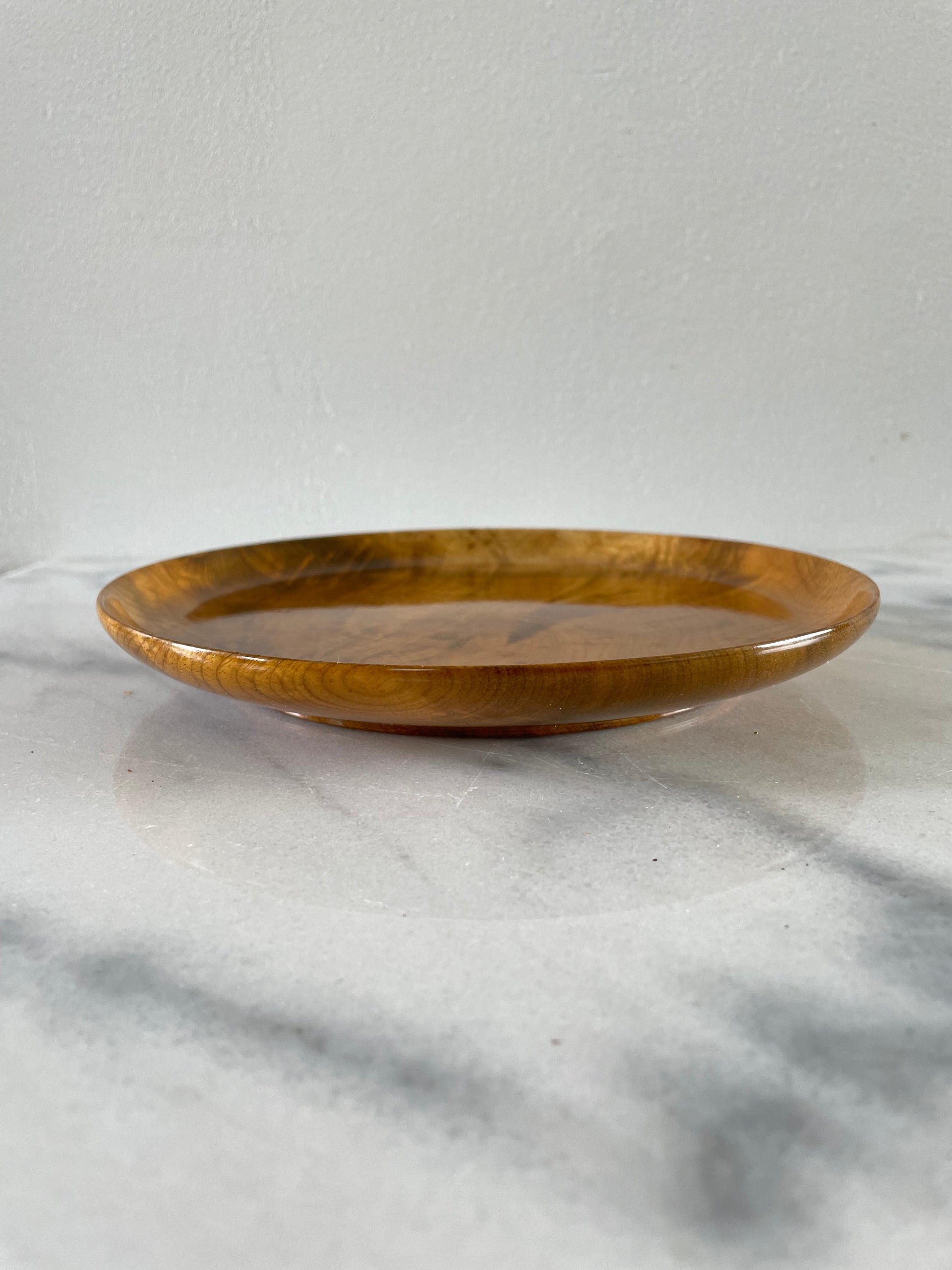 A vintage solid hardwood tray plate with rich golden coloring and a shiny finish.