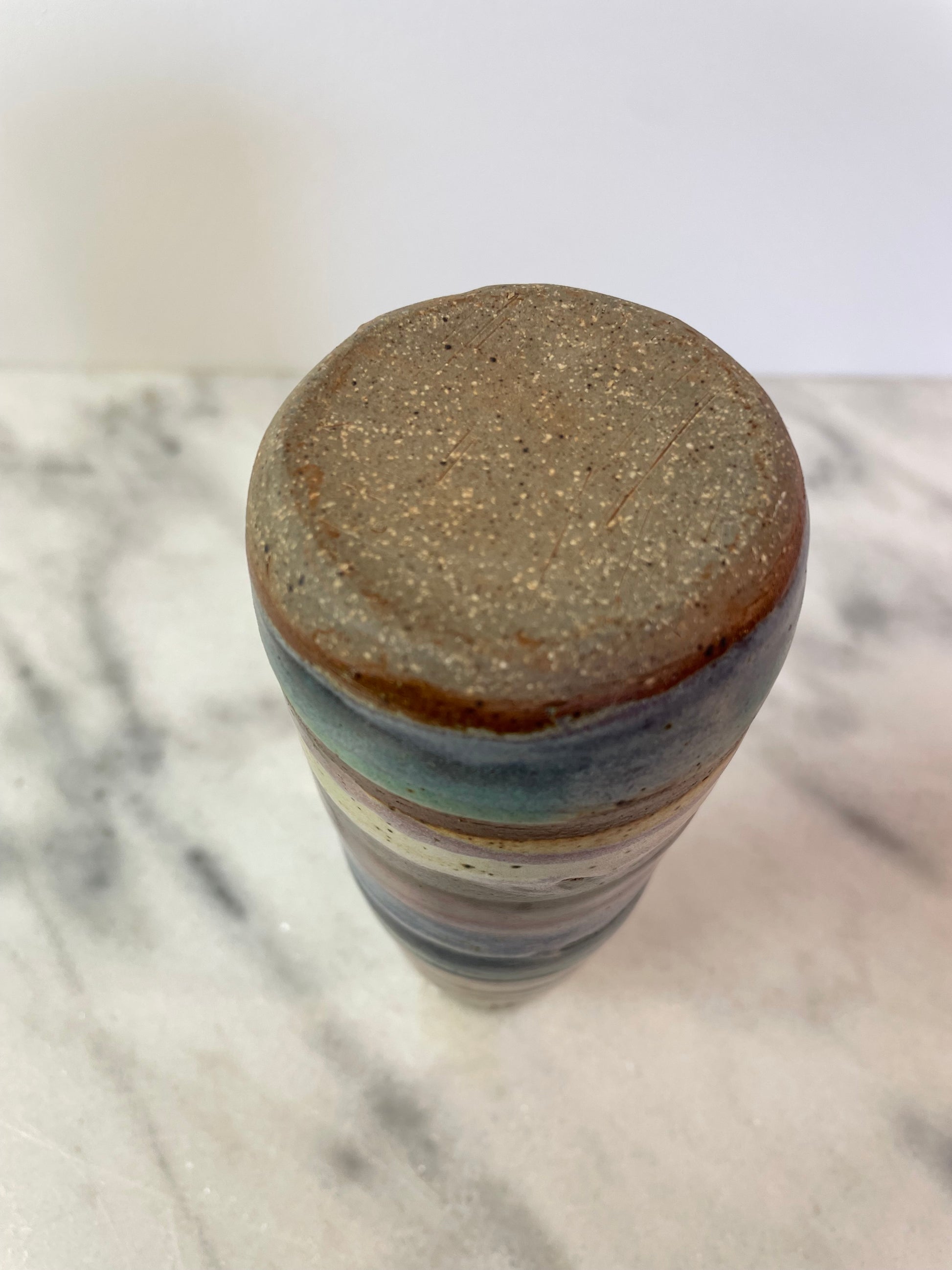 A vintage studio ceramic bottle form olive oil cruet with attractive purple and blue striated glaze decoration.