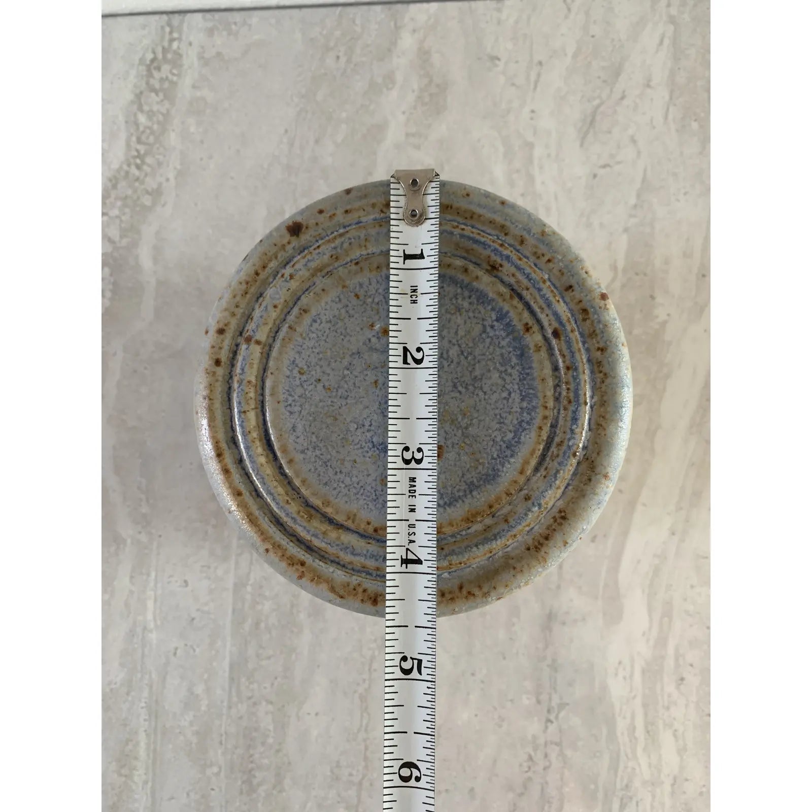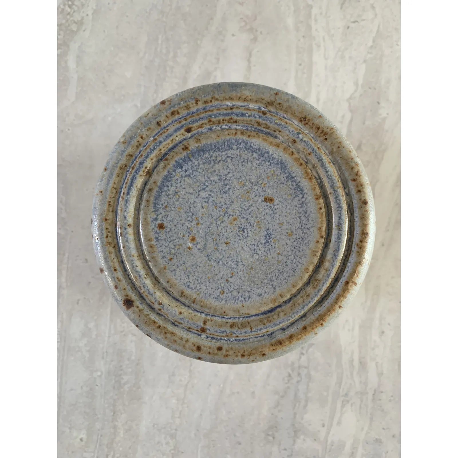 A vintage handmade studio ceramic signed butter crock. This piece features soft blue and gray coloring and with pleasing soft edges.