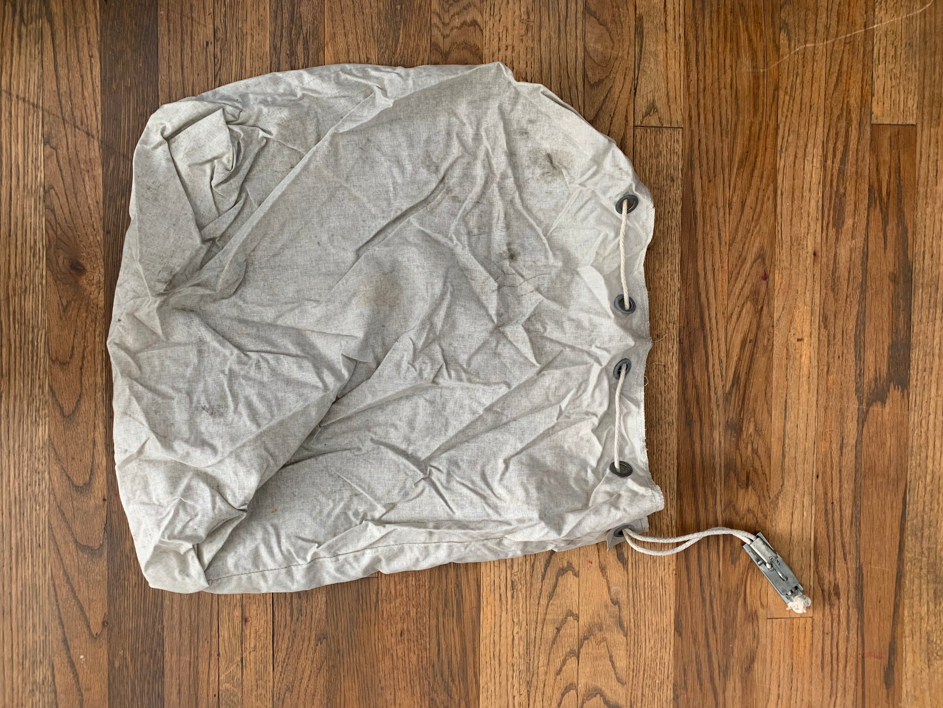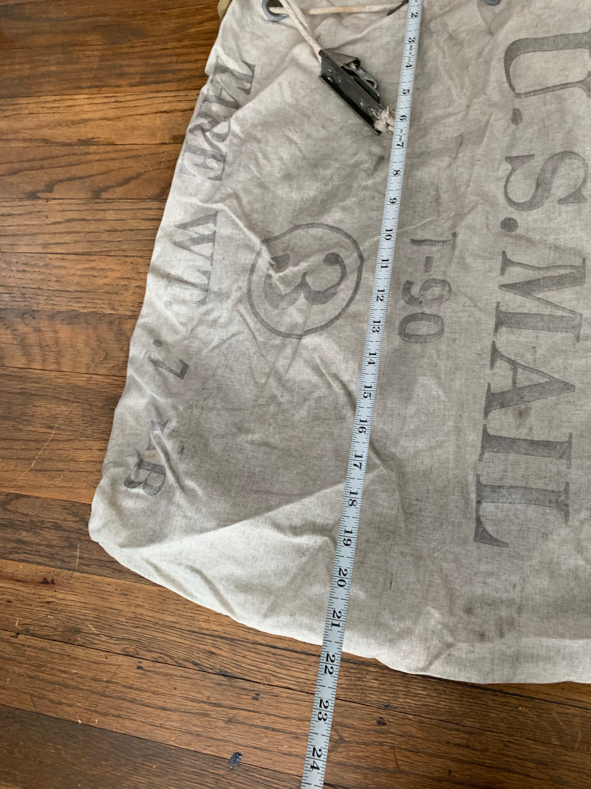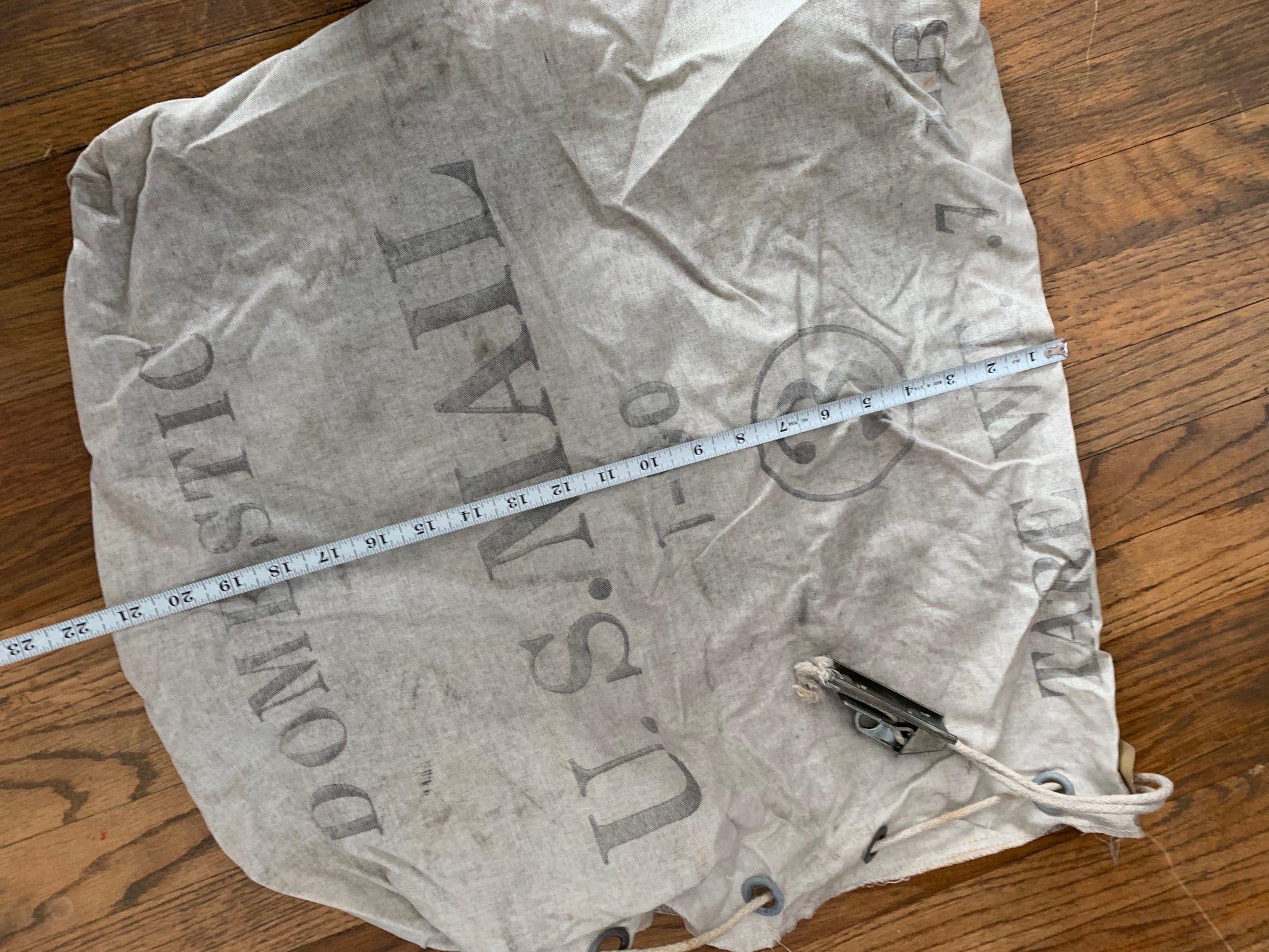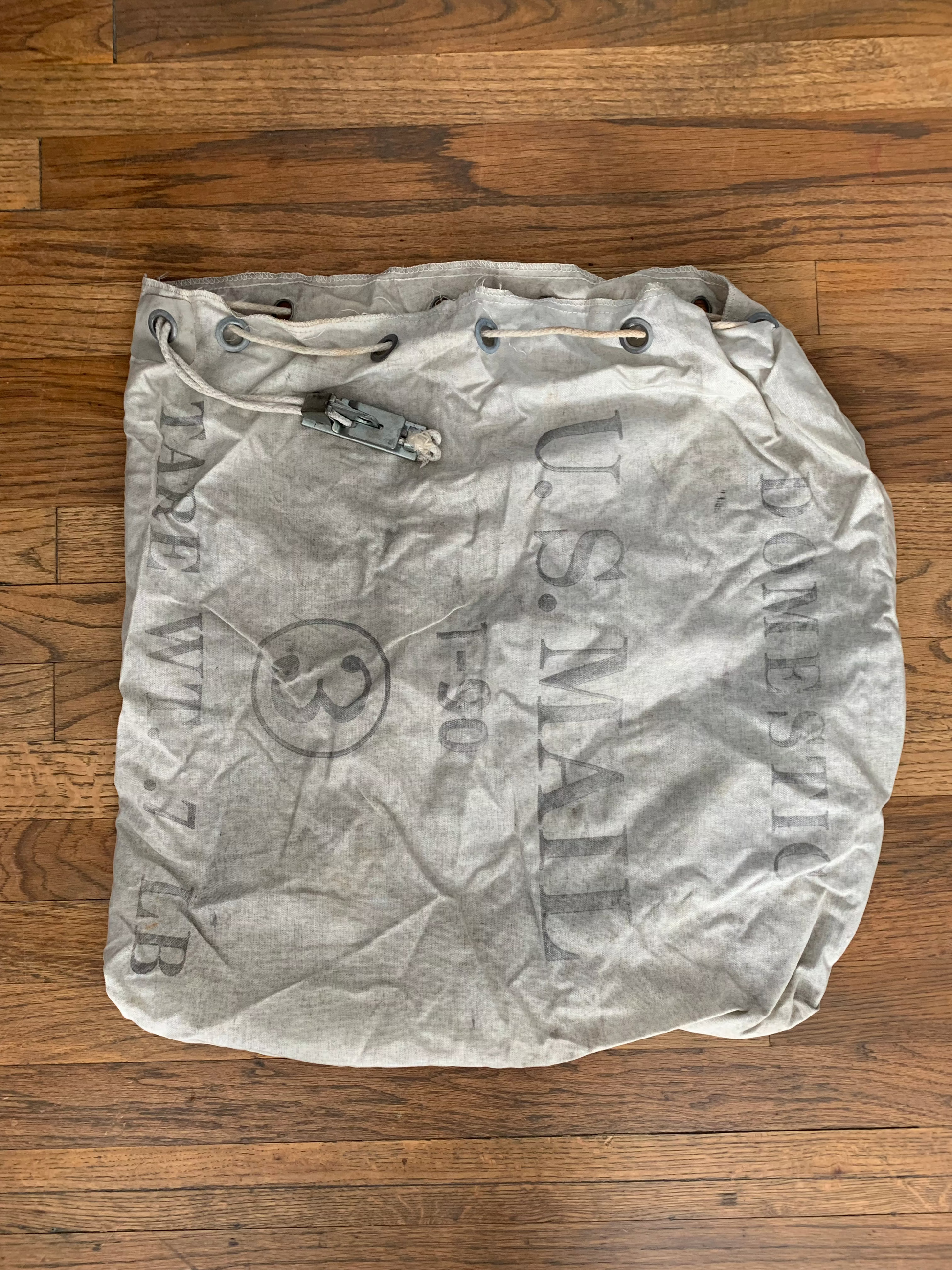 A vintage US Mail bag with stenciling detail, rope, and metal piece.