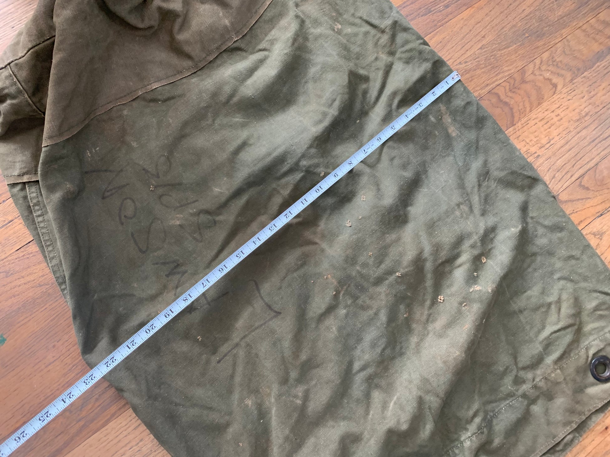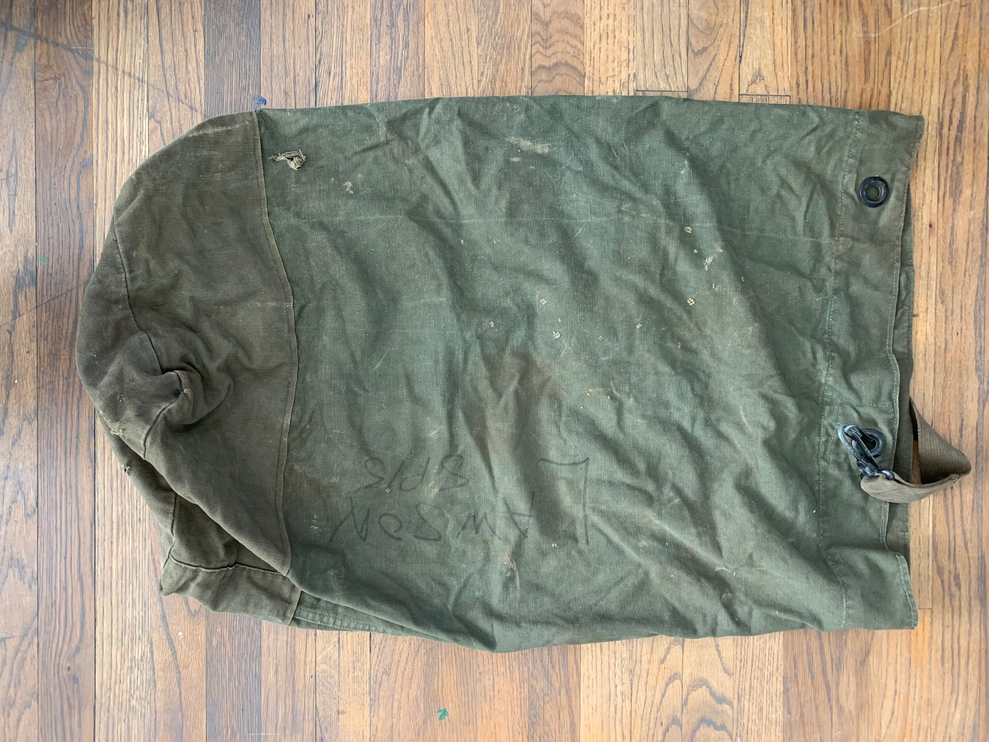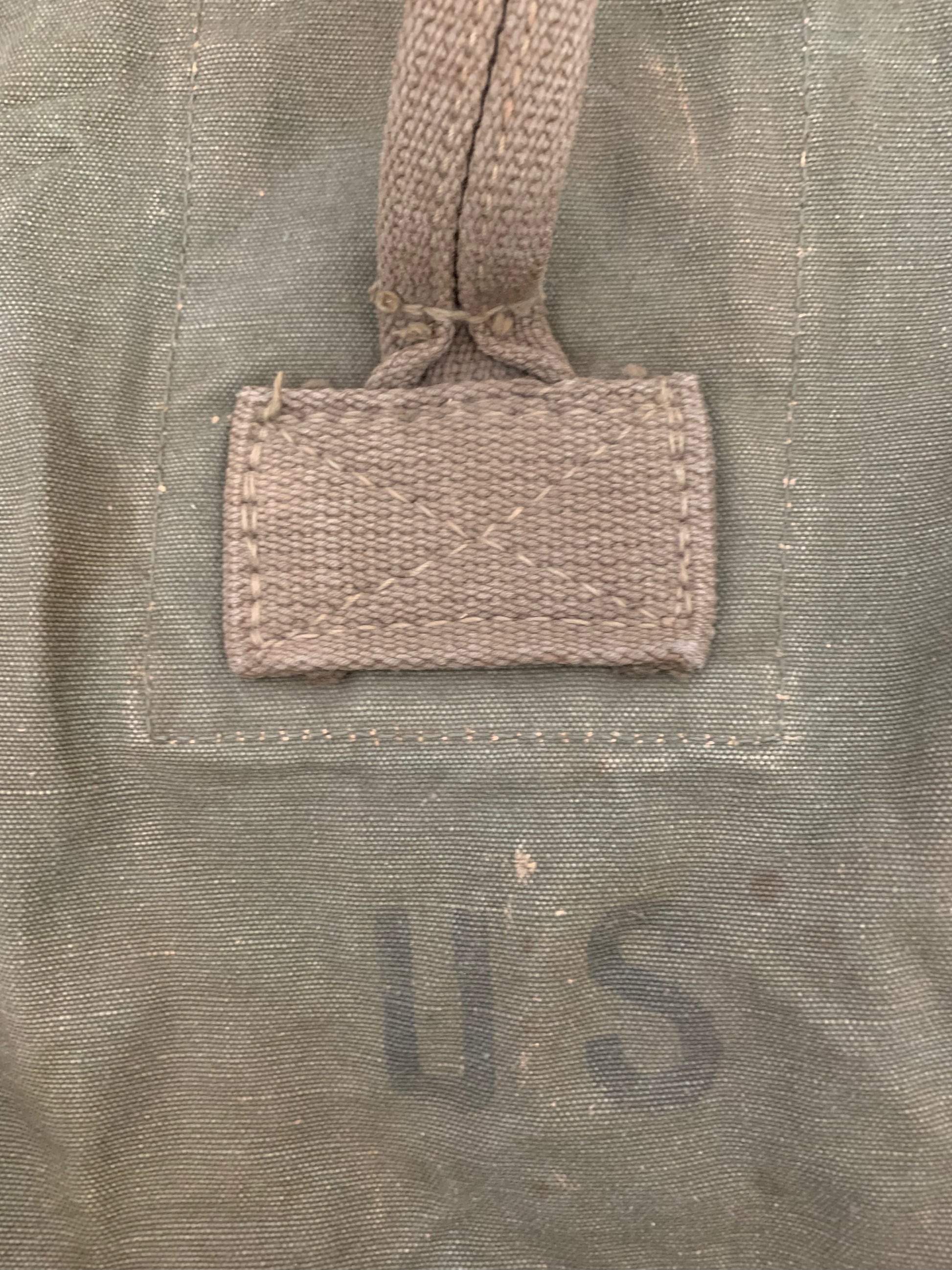 A vintage military duffel with personalization and US stamp.